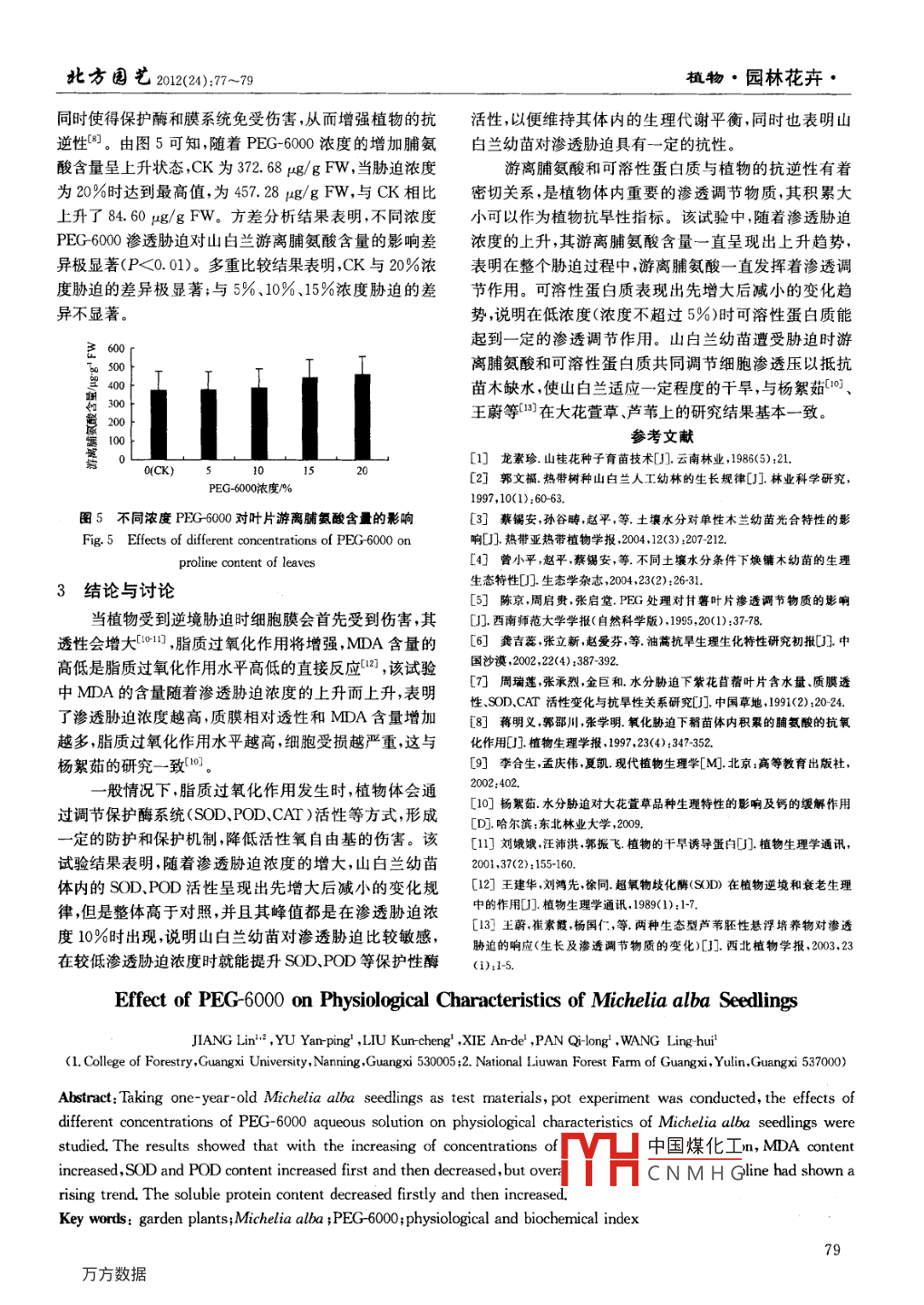 北方園藝2012(24):7~79植物·園林花卉聚乙二醇6000對山白蘭苗木生理特性的影響蔣林2,於艷萍,劉昆成1,謝安德l,潘啟龍,王凌暉(1.廣西大學(xué)林學(xué)院,廣西南寧530005;2.廣西國有六萬林場,廣西玉林537000摘要:選擇1a生山白蘭苗木為試驗材料,采用盆栽土培法以不冋濃度PFG6000水溶液對山白蘭進行處理,研究PEG6000對山白蘭幼苗生理特性的影響。結(jié)果表明:隨著PFG6000濃度的增大,MDA含量增加,SOD和POD都呈現(xiàn)先升后降的變化趨勢,游離脯氨酸一直呈上升的變化趨勢,可溶性蛋白質(zhì)呈先升后降再上升的變化趨勢關(guān)鍵詞:園林植物;山白蘭;PEG6000;生理生化指標中圖分類號:S792文獻標識碼:A文章編號:1001-009(2012)24-0077-03山白蘭( Paramichelia baillonii).木蘭科合果木屬1材料與方法高大喬木,其樹冠優(yōu)美、樹葉濃綠、花朵大具香氣等,是1.1試驗材料理想的觀賞綠化樹種,是熱帶、亞熱帶珍貴速生用材試驗材料為廣西國營高峰林場優(yōu)良苗木山白蘭,選樹種之一。其天然生長于云南熱帶、亞熱帶雨林中由擇長勢良好、無病蟲害、健壯均勻的苗木,2010年3月2于過去亂砍濫伐嚴重,目前已處于瀕危狀態(tài),為我國重日移至廣西大學(xué)林學(xué)院苗圃試驗地(試驗地為室外搭建點保護的稀有珍貴樹種之一。在植物生理上細胞失水的塑料遮雨薄膜棚,同時在試驗地外側(cè)加蓋擋水設(shè)備,造成滲透脅迫這是干早鹽堿和冷害3種脅追引起的減小外界環(huán)境對試驗的影響),并栽植于口徑為20cm,共同結(jié)果。而在全球農(nóng)林業(yè)中,干早目前是最主要的脅深18cm的塑料花盆中,每盆栽植1株。盆內(nèi)的生長基迫,其損失量估計超過其它逆境造成損失的總和。因此質(zhì)為園土和細沙,按照3:1的比例均勻混合。對山白蘭進行滲透脅迫研究具有重大意義。以往有關(guān)1.2試驗方法山白蘭研究的報道中,郭文福等對山白蘭苗木移植密試驗選用PEG6000溶液模擬干旱脅迫,采用盆栽度遺傳育種和生理生長等方面進行了研究蔡錫安土培法,將PG600以水溶液的形式澆到基質(zhì)中,濃等3、曾小平等對木蘭科植物在水分脅迫方面進行度為:0K)、5%、10%、15%、20%,對山白蘭的苗期抗了研究,但對山白蘭的干旱脅迫方面卻鮮見報道。該旱性進行鑒定和比較。上盆1個月后進行滲透脅迫處理,試驗以1a生山白蘭苗木為試材,采用盆栽土培法以不每隔7d澆灌1次PEG6000溶液,每次每盆200mL,共進同濃度聚乙二醇(PEG-6000水溶液對山白蘭進行處行3次。盆栽試驗期間進行統(tǒng)一的常規(guī)苗木管理。理,研究PEG6000對山白蘭幼苗生理特性的影響。2結(jié)果與分析2.1滲透脅迫對山白蘭苗木丙二醛(MDA)含量的影響第一作者簡介:蔣林(1970),男,碩士,工程師,現(xiàn)主要從事林業(yè)生產(chǎn)和科研管理工作丙二醛(MDA)作為脂質(zhì)過氧化作用的主要產(chǎn)物之責任作者:王凌暉(1965-),男,博士,教役,現(xiàn)主要從事園林植物栽其含量的多少可以代表膜損傷程度的大小6。由圖培及森林培育研究工作。E-mail:wanglinghui97@163.com1可知,隨著PEG6000濃度的增加,山白蘭MDA含量基金項目:廣西林業(yè)廳科學(xué)基金資助項目(桂林科字[200第22越來越高。在濃度5%時,MDA含量為CK的1.13倍;在濃度20%時,為CK的299倍。這表明PEG滲透脅收稿日期:2012-08-27迫濃度越高,山白蘭脂質(zhì)過氧化作用越強,導(dǎo)致丙二some black, brown or white eye spots at the base of the ray flowers. The seed appearance of the morphological of twelvevarieties were different among each other. The seed protein of twelve varieticL1,,me protelbut there existed some specific bands could clearly reflect the differences中國煤化工possibility toinvestigate the genetic relationship between the different varieties were proyCNMHGKey words: Gazania rigens L; seed; physiological indicators; SDS-PAGE77園林花卉·植物北方園藝2012:7~7醛含量增加,對膜的損傷程度越大。方差分析結(jié)果表為CK的1.33倍。在整個滲透脅迫中POD的含量都大明,不同濃度PEG6000滲透脅迫對山白蘭丙二醛含量于CK。說明山白蘭產(chǎn)生較多POD來抵抗?jié)B透脅迫,以的影響差異極顯著(P<0.01)。多重比較結(jié)果表明,CK維持山白蘭的正常生理過程。方差分析結(jié)果表明,不同與5%10%濃度脅迫的差異不顯著,與15%、20%濃度濃度PEG60滲透脅追對山白蘭過氧化物酶活性的影脅迫的差異極顯著。響差異極顯著(P<0.01)。多重比較結(jié)果表明,CK與5%濃度脅迫的結(jié)果相比差異不顯著,與10%、15%205020%濃度脅迫的結(jié)果相比差異極顯著。600050001000圖1不同濃度PEG6000對葉片丙二醛含量的影響Fig. 1 Effects of different concentrations of PEG-6000 onPEG6000濃度%ADA content of leaves圖3不同濃度PEG6000對葉片POD活性的影響2.2滲透脅迫對山白蘭苗木超氧化物歧化酶(SD活Fig. 3 Effects of different concentrations of PEG-6000 or性的影響POD activity of leavesSOD是植物處于逆境中最主要的一種抗氧化酶,它2.4滲透脅迫對山白蘭苗木可溶性蛋白質(zhì)含量的影響能及時清除自由基和活性氧提高植物組織的抗氧化能可溶性蛋白質(zhì)是細胞內(nèi)的滲透調(diào)節(jié)物質(zhì)之一,當植力,其活性的大小與植物體的抗性是密切相關(guān)。由圖2物受到干旱脅迫時,可以通過提高可溶性蛋白的濃度來可知,當PEG6濃度為5%10%的脅迫時,D活性迅保護細胞免受傷害維持正常的生理代謝。由圖4可速上升在10%濃度時達到最高值為89U·g1·h,知,山白蘭幼苗葉片中細胞內(nèi)的可