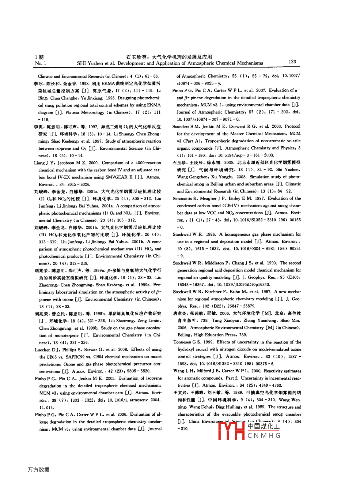 第17卷第1期氣候與環(huán)境研究Vol 17 No. 12012年1月Climatic and Environmental researchJan.2012石玉珍,徐永福,賈龍2012.大氣化學(xué)機(jī)理的發(fā)展及應(yīng)用[.氣候與環(huán)境研究,17(1):112-124,doi;10.3878/ J. Issn.1006-95852011. 10061. Shi Yuzhen, Xu yongfu, Jia Long. 2012. Development and application of atmospheric chemical mechanisms []. Climatic andEnvironmental Research (in Chinese), 17(1): 112-124大氣化學(xué)機(jī)理的發(fā)展及應(yīng)用石玉珍徐永福賈龍中國(guó)科學(xué)院大氣物理研究所大氣邊界層物理和大氣化學(xué)國(guó)家重點(diǎn)實(shí)驗(yàn)室,北京100029摘要大氣化學(xué)機(jī)理是研究大氣化學(xué)過(guò)程的重要手段和方法之一,也是發(fā)展空氣質(zhì)量模式必不可少的重要部分。作者綜述了幾種應(yīng)用廣泛的簡(jiǎn)化機(jī)理——碳鍵機(jī)理( Carbon bond mechanism,CBM)、加州大氣污染研究中心機(jī)理( Statewide Air Pollution Research Center mechanism, SAPRO)、區(qū)域酸沉降機(jī)理( RegionalAcid Deposition Mechanism,RADM)、區(qū)域大氣化學(xué)機(jī)理( Regional Atmospheric Chemical MechanismRACM)以及詳細(xì)化學(xué)機(jī)理—主要大氣化學(xué)機(jī)理( Master Chemical Mechanism,MCM)和共同代表性中間體機(jī)理( Common Representative Intermediates,CRI)的發(fā)展及應(yīng)用。對(duì)上述大氣化學(xué)機(jī)理的產(chǎn)生、發(fā)展、包含的物種類(lèi)型、集總方式等方面進(jìn)行了對(duì)比分析,總結(jié)了采用煙霧箱數(shù)據(jù)評(píng)價(jià)大氣化學(xué)機(jī)理的研究成果以及大氣化學(xué)機(jī)理在模式發(fā)展方面的應(yīng)用,并對(duì)大氣化學(xué)機(jī)理的進(jìn)一步發(fā)展與完善提出了需求。關(guān)鍵詞化學(xué)機(jī)理碳鍵機(jī)理區(qū)域大氣化學(xué)機(jī)理區(qū)域酸沉降機(jī)理主要化學(xué)機(jī)理文章編號(hào)1006-9585(2012)01-0112-13中圖分類(lèi)號(hào)X515文獻(xiàn)標(biāo)識(shí)碼Adoi:10.3878/issn1006-9585.2011.10061Development and Application of Atmospheric Chemical MechanismsSHI Yuzhen, XU Yongfu, and JIA Longtate Key Laboratory of Atmos pheric Boundary Layer Physics and Atmospheric Chemistry, Institute of Atmospheric Physics, Chinese Academy of Sciences, Beijing 100029AbstractAtmospheric chemical mechanism is one of the most important components to study photochemicalprocesses and develop air quality models. The development and application of several atmospheric chemical mechanisms were summarized. The simplified chemical mechanisms include Carbon Bond Mechanism(CBM),StatewideAir Pollution Research Center mechanism (SAPRC), Regional Acid Deposition Mechanism(RADM), and regionalAtmospheric Chemical Mechanism(RACM) which have been widely used in the past decades and the explicit chencal mechanisms contain Master Chemical Mechanism(MCM) and Common Representative Intermediates(CRIwhich were developed rapidly in the past few years. The history, species, and lump styles of these mechanisms werecompared. Meanwhile, the research of the evaluation to chemical mechanism by using chamber experiment data andthe application of these chemical mechanisms in model development also summarized. Besides, the further demand tothe development and improvement of chemical mechanisms was put forward.Key words chemical mechanism, Carbon Bond Mechanism, Regional Atmospheric Chemical Mechanism,Re-gional Acid Deposition Mechanism, Master Chemical Mechanism收稿日期2010-05-04收到,2011-12-11收到修定稿資助項(xiàng)目中國(guó)科學(xué)院知識(shí)創(chuàng)新工程方向性項(xiàng)目KCX2SWH8作者簡(jiǎn)介石玉珍,女,1980年出生,博士,助研,主要研究方向?yàn)榇髿饣瘜W(xué)。 E-mail: churI通訊作者徐永福, E-mail:xyf@ gmail iap. ac a中國(guó)煤化工CNMHG石玉珍等:大氣化學(xué)機(jī)理的發(fā)展及應(yīng)用No. 1SHI Yuzhen et al. Development and Application of Atmospheric Chemical Mechanisms113上述化學(xué)機(jī)理經(jīng)過(guò)美國(guó)北卡羅來(lái)納大學(xué)( Univer1引言sity of North Carolina,UNC)、加州大學(xué)濱河分E (University of California at Riverside, UCR)O2作為光化學(xué)過(guò)程的主要產(chǎn)物,由于環(huán)境健田納西州河谷管理局( Tennessee Valley Authori康等多重效應(yīng)越來(lái)越受到關(guān)注(孔琴心等,1999;ty,TVA)、美國(guó)環(huán)保署( Environmental protec.Barletta et al.,2002; Beaney and gough,2002), tion agency,EPA)煙霧箱體系、澳大利亞聯(lián)邦近地面豐富的揮發(fā)性有機(jī)化合物(VOCs)和氮氧科學(xué)與工業(yè)研究組織( Commonwealth Scientific化物(NO2)源為O的產(chǎn)生提供了條件,O3自身 and Industrial Research Organization, CSIRO)的氧化性對(duì)非均相化學(xué)過(guò)程有明顯的促進(jìn)作用,煙霧箱以及歐洲光反應(yīng)( EUropean PHOtoREac-與二次氣溶膠、氣候變暖等問(wèn)題也密切相關(guān)(Ja-tor, EUPHORE)等煙霧箱實(shí)驗(yàn)數(shù)據(jù)的評(píng)估、修cob,2000。準(zhǔn)確客觀(guān)地描述復(fù)雜的大氣化學(xué)過(guò)程正已日趨完善( Dodge,2000)。對(duì)了解污染原理、制定污染控制策略以及解決環(huán)本文綜述了上述大氣化學(xué)機(jī)理的最新研究進(jìn)境問(wèn)題至關(guān)重要。大氣化學(xué)機(jī)理作為空氣質(zhì)量模展,詳細(xì)介紹了各機(jī)理的集總方式、所包含的物式的重要組成部分,它不僅描述了一次污染物種類(lèi)型以及同一機(jī)理不同版本的明顯更新與改進(jìn),VOCs和NO生成二次污染物O3以及其他氧化物總結(jié)了利用煙霧箱數(shù)據(jù)評(píng)估大