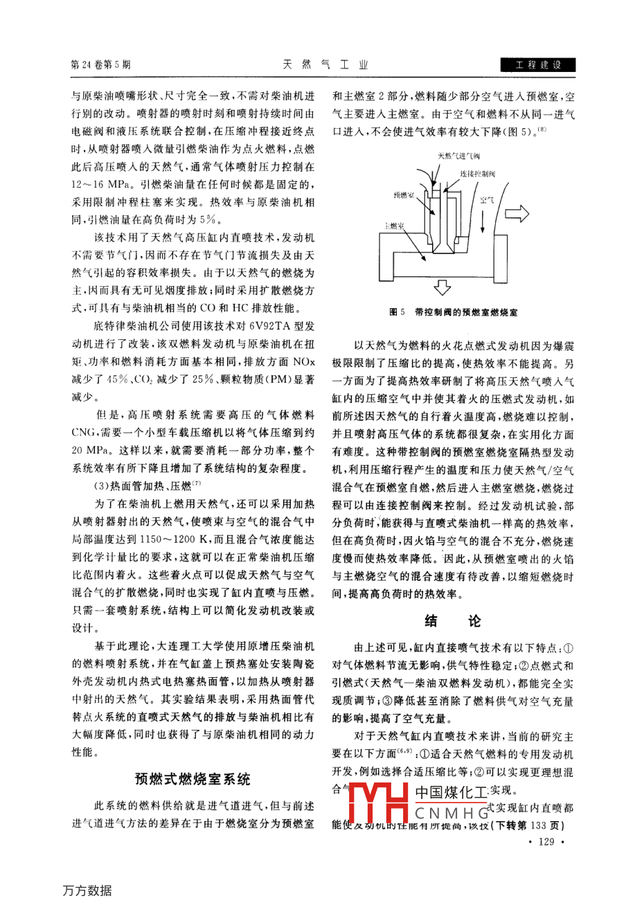 第24卷第5期天然氣工業(yè)工程建設(shè)天然氣發(fā)動機(jī)燃料供給系統(tǒng)李書澤張武高黃震(上海交通大學(xué)機(jī)械與動力工程學(xué)院)李書澤等.天然氣發(fā)動機(jī)燃料供給系統(tǒng).天然氣工業(yè),2004;24(5):127~12摘要為了降低發(fā)動機(jī)排放對大氣環(huán)境造成的污染,在其燃料本身和燃料供給系統(tǒng)方面都已進(jìn)行了很多改進(jìn),并且有很多新的嘗試正在進(jìn)行。在燃料方面,天然氣作為發(fā)動機(jī)一種重要的“清潔燃料”,日益受到人們的重視,也使天然氣發(fā)動機(jī)在國內(nèi)外均獲得了較快的發(fā)展。相應(yīng)的,對發(fā)動機(jī)系統(tǒng)也需要進(jìn)行改進(jìn)以適應(yīng)天然氣的燃料特性。天然氣發(fā)動機(jī)的燃料供給系統(tǒng)有:缸外進(jìn)氣道噴射、缸內(nèi)直噴。其中缸內(nèi)直噴又可細(xì)分為氣體燃料缸內(nèi)直接低壓噴射,燃油調(diào)制噴射、缸內(nèi)髙壓直接噴射,油氣共用噴射器、缸內(nèi)高壓直接噴射,熱面管加熱、缸內(nèi)高壓直接噴射,預(yù)燃窒燃燒室等各種不同的系統(tǒng)。首先介紹了各種供給系統(tǒng)的結(jié)構(gòu)和工作原理,然后在充氣效率以及動力性和排放方面詳細(xì)比較分析了各種方式的優(yōu)劣,提出今后的研究方向主要應(yīng)是專用天然氣發(fā)動機(jī)的研究、新型進(jìn)氣噴射器的設(shè)計(jì)和稀薄燃燒的實(shí)現(xiàn)主題詞天然氣燃料發(fā)動機(jī)供應(yīng)動力分析天然氣作為車用燃料是最重要的應(yīng)用領(lǐng)域之率下降。而充氣效率則是反映發(fā)動機(jī)換氣過程完善,但是并不是簡單地在發(fā)動機(jī)上改用天然氣作為程度的指標(biāo),發(fā)動機(jī)充氣效率下降即相當(dāng)于輸入發(fā)燃料就能完全解決排放問題,還須對各個系統(tǒng)進(jìn)行動機(jī)缸內(nèi)的總能量下降。因此為了降低充氣損失,優(yōu)化后才能獲得良好的排放特性。為此,分析了天采用缸內(nèi)噴射將是一種很好的解決辦法。然氣發(fā)動機(jī)幾種不同進(jìn)氣系統(tǒng)的優(yōu)缺點(diǎn)。低壓噴射天然氣發(fā)動機(jī)是在進(jìn)氣閥關(guān)閉后,將缸外進(jìn)氣道噴射缸內(nèi)直接噴射天然氣在缸外和空氣預(yù)先形成了混合氣,噴氣1.低壓噴射示意如圖1低壓噴射供氣方式主要用在壓縮比低的點(diǎn)燃式發(fā)動機(jī)轉(zhuǎn)速天然氣調(diào)節(jié)控制氣體燃料發(fā)動機(jī)上(,如圖2所示動機(jī)轉(zhuǎn)速電控噴射溫度排氣控制系統(tǒng)空氣流轍節(jié)氣門氧傳感器排氣火花塞電控氣體噴射器圖1缸外進(jìn)氣道噴射系統(tǒng)簡圖控制信號由于天然氣是氣體燃料,所以缸外進(jìn)氣道進(jìn)氣時(shí)無論是混合器還是電控噴射,天然氣本身在混合氣中都占有相當(dāng)?shù)捏w積比,這樣會使發(fā)動機(jī)充氣效圖2發(fā)動機(jī)缸內(nèi)低壓直噴系統(tǒng)示意圖本成果受上海市科技發(fā)展基金項(xiàng)目(023012006)的資助中國煤化工作者簡介:李書澤,上海交通大學(xué)機(jī)械與動力學(xué)院博士研究生,主地址:(200030)上海市番禺路951號上海交通大學(xué)內(nèi)燃機(jī)研究所。電CNMHG制系統(tǒng)的開發(fā)研究·12工程建設(shè)天然氣工業(yè)004年5月天然氣噴入氣缸,在著火之前形成均質(zhì)的預(yù)混合氣,著壓器壓力調(diào)節(jié)器采用電火花點(diǎn)火或噴入少量引燃油使混合氣燃燒。于天然氣是在進(jìn)氣閥關(guān)閉后才噴射,因而噴射壓加速電磁閥力比較低(0.2~1MPa)。這種方式避免了由于天然氣是氣體燃料而在進(jìn)氣混合時(shí)就占有一定體積的缺陷,使進(jìn)氣充量提高。但是,這種發(fā)動機(jī)的壓縮比噴油器比較低,限制了熱效率的進(jìn)一步提高。另外,由于仍儲油器然需要采用節(jié)氣門通過節(jié)流作用調(diào)節(jié)發(fā)動機(jī)的充圖3RAM調(diào)制噴射系統(tǒng)的燃油回路量,所以在中小負(fù)荷時(shí)節(jié)流損失大2.高壓噴射尼器、加速管、電磁閥和噴油器組成。RAM調(diào)制噴高壓噴射主要在壓縮比比較高和在壓縮終點(diǎn)噴射系統(tǒng)只要在共軌中有4~5MPa的恒定初始壓力射的發(fā)動機(jī)上得以應(yīng)用。在這類發(fā)動機(jī)中,天然氣該系統(tǒng)就能在每個噴油器的入口處利用流體沖擊效燃料不是在進(jìn)氣道與空氣預(yù)先混合,而是在接近上應(yīng)產(chǎn)生一個比它高10~15倍且與噴射持續(xù)期相適止點(diǎn)時(shí)直接以很高的壓力噴射入氣缸內(nèi)的空氣中,應(yīng)的高壓波,以得到很高的燃油噴射壓力5)。借助所以必須以很高的壓力才可以進(jìn)入缸內(nèi)。燃料氣流電磁閥對高壓波直接電控,能使噴油規(guī)律及其初始和氣缸中的空氣充量的混合速度由燃料的噴射過程狀態(tài)適應(yīng)發(fā)動機(jī)參數(shù)及燃燒來進(jìn)行控制。由于壓縮過程中不存在燃料和該系統(tǒng)中,氣體燃料采用缸內(nèi)直噴技術(shù),引燃柴空氣的預(yù)混合故消除了爆震的可能性,但是這也使油量極小(為全負(fù)荷燃燒量的1%~3%),因而需要得控制NOx排放比預(yù)混合充量雙燃料發(fā)動機(jī)更困對柴油噴射系統(tǒng)進(jìn)行精確的調(diào)節(jié),準(zhǔn)確的控制噴油難3。從充氣效率的角度來看,對于空氣充量幾乎量。試驗(yàn)結(jié)果表明,RAM調(diào)制系統(tǒng)對氣體燃料
