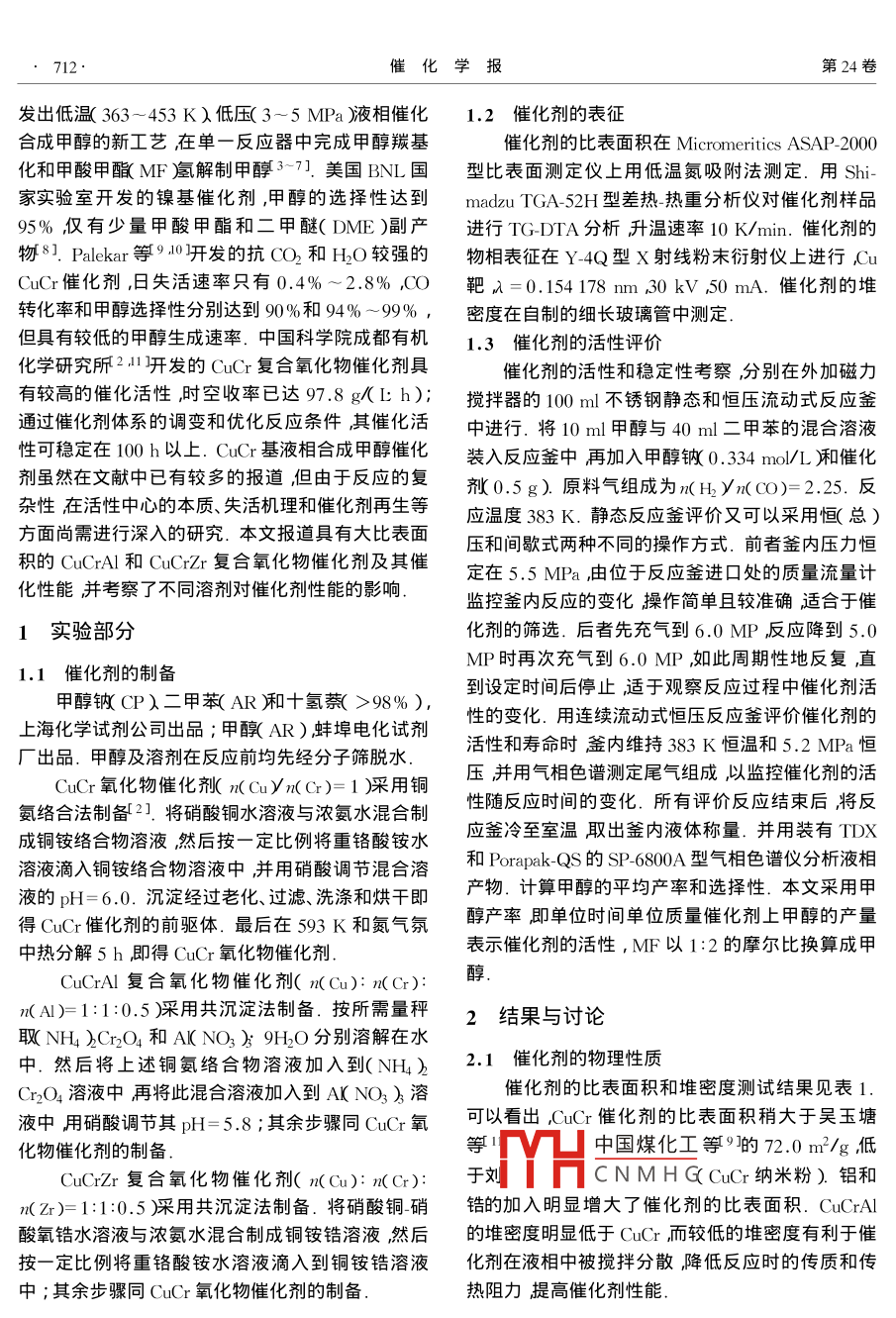 第24卷第9期催化學(xué)報(bào)2003年9月Vol. 24 No. gChinese Journal of CatalysisSeptember 2003文章編號(hào):0253-983X2003)9.0711-05研究論文:711~71:CucrAl和 CuCrzr低溫液相合成甲醇催化劑的研究郝立慶1,單紹純,田瑞芬,丁延偉2,陳根發(fā)1,莊叔賢11中國(guó)科學(xué)技術(shù)大學(xué)生物質(zhì)潔凈能源實(shí)驗(yàn)室,安徽合肥230026;2中國(guó)科學(xué)技術(shù)大學(xué)理化分析中心,安徽合肥23006)摘要:用絡(luò)合共沉淀法制備了 CuCrAl和CCr復(fù)合氧化物液相合成甲醇催化劑其比表面分別達(dá)到119和116m3/g,在5.0~5.5MPa和383K條件下分別用間歇式和流動(dòng)式反應(yīng)笠考察了催化劑的活性和穩(wěn)定性.結(jié)果表明: CuRa和 CuCrzr的活性均明顯高于(r;(u(rA的活性略高于 CuCrzr但甲酸甲暾MF〕的選擇性明顯低于 CuCrzr;兩者在12h內(nèi)未見(jiàn)活性明顯下降.甲醇鈉在反應(yīng)過(guò)程中部分轉(zhuǎn)化為甲酸鈉和NaOH. CuCrAl和CCr/r有較高的氫解活性可抑制甲醇鈉與MF生成甲酸鈉從而有較低的甲酸鈉濃度.但是A2O3和ZO的酸性有利于甲醇脫水引起甲醇鈉水解生成NaOH.溶劑對(duì)Cur基催化劑的活性和選擇性有明顯影響.對(duì)反應(yīng)機(jī)理進(jìn)行了討論關(guān)鍵詞∶甲醇,液相合成,銅,鉻,鋁,鋯,復(fù)合氧化物中圖分文獻(xiàn)標(biāo)識(shí)碼:AStudy on Cu CrAl and Cu Crzr Oxides as Catalysts for Low-Temperature Slurry Phase Methanol SynthesisHAO Liqing, SHAN Shaochun', TIAN Ruifen', DING YanweiCHEN Genfa, ZHUANG Shuxian(I Laboratory of Biomass Clean Energy University of Science and Technology of China, Anhui 230026, Hefei, China2 Structure Research Laboratory, University of Science and Technology of China Anhui 230026, Hefei, ChinaAbstract: CuCrAl and CuCrZr composite oxide catalysts, with high surface area of 119 and 116 m/g respectively were prepared by coprecipitation and complex precipitation. The catalytic activity selectivity and stability othe catalysts for slurry phase methanol synthesis at low temperature were evaluated in a stainless steel autoclaven a semi-batch-semicontinuous manner at 5.0-5.5 MPa and 383 K. It was found that the activity of cucrAland CuCrZr catalysts was much higher than that of CuCr catalyst. The catalytic activity of CucrAl catalyst wasa little higher than that of CuCrZr but the methyl formate( MF )selectivity of Cu crZr was significantly higherthan that of cucrAl. Both the Cucr al and cuCrzr catalysts demonstrated high stability. The sodium methoxidewas partly converted to sodium formate and Naoh. the higher activity of cucral and cucrzr catalysts for hydrogenation of MF suppresses the reaction between MF and sodium methoxide to form sodium formate, whichincreases the catalyst life. However the acidity of al O3 and ZrO may benefit the dehydration of methanol toform water to further induce the hydrolysis of sodium methoxide. The influence of solvent on the performance ofcatalytic system was apparent. The reaction mechanism was also discussedKey words: methanol slurry phase synthesis copper chromium aluminum zirconium composite oxide甲醇是一種重要的化工原料,又是一種潛在的C中國(guó)煤化正IC公司生產(chǎn)甲醇的車(chē)用燃料和燃料電池的燃料121.目前工業(yè)上由合工藝HCNMHG氣分離及凈化成本高成氣生產(chǎn)甲醇主要使用II公司開(kāi)發(fā)的高溫高壓等缺點(diǎn).經(jīng)20世紀(jì)70年代以來(lái)的大量研究已開(kāi)收稿日期:2003-0104.第一作者:郝立慶,男,1977年生,碩士研究生聯(lián)系人:莊叔賢.Tel:(0551)606613,3606745; E-mail: zhuang@uste. edu. ct基金項(xiàng)目:科技部基礎(chǔ)研究專(zhuān)項(xiàng)基金資助重大項(xiàng)目和中國(guó)科學(xué)院知識(shí)創(chuàng)新工程基金資助項(xiàng)目催化學(xué)報(bào)第24卷發(fā)出低溫(363-453K)低壓(3~5MPa)液相催化1.2催化劑的表征合成甲醇的新工藝在單一反應(yīng)器中完成甲醇羰基催化劑的比表面積在 Micromeritics ASAP2000化和甲酸甲醵MF嵐解制甲醇37.美國(guó)BNL國(guó)型比表面測(cè)定儀上用低溫氮吸附法測(cè)定.用Shi-家實(shí)驗(yàn)室開(kāi)發(fā)的鎳基催化劑,甲醇的選擇性達(dá)到 mazu tga52H型差熱熱重分析儀對(duì)催化劑樣品95%僅有少量甲酸甲酯和二甲醚(DME)副產(chǎn)進(jìn)行TGDA分析升溫速率10K/min.催化劑的物81. Palekar等10開(kāi)發(fā)的抗CO2和HO較強(qiáng)的物相表征在Y4Q型ⅹ射線粉末衍射儀上進(jìn)行CCu(r催化劑,日失活速率只有0.4%~2.8%ACO靶=0.154178m30kV50mA.催化劑的堆轉(zhuǎn)化率和甲醇選擇性分別達(dá)到90%和94%~99%,密度在自制的細(xì)長(zhǎng)玻璃管中測(cè)定但具有較低的甲醇生成速率.中國(guó)科學(xué)院成都有機(jī)1.3催化劑的活性評(píng)價(jià)化學(xué)研究所21開(kāi)發(fā)的CuCr復(fù)合氧化物催化劑具催化劑的活性和穩(wěn)定性考察分別在外加磁力有較高的催化活性時(shí)空收率已達(dá)97.8gLh);攪拌器的100ml不銹鋼靜態(tài)和恒壓流動(dòng)式反應(yīng)釜通過(guò)催化劑體系的調(diào)變和優(yōu)化反應(yīng)條件其催化活中進(jìn)行,將10m甲醇與40ml二甲苯的混合溶液性可穩(wěn)定在100h以上.CuCr基液相合成甲醇催化裝入反應(yīng)釜中再加入甲醇鈉0.334mo/L廂催化劑雖然在文獻(xiàn)中已有較多的報(bào)道但由于反應(yīng)的復(fù)劑0.5g)原料氣組成為n(壓yn(CO)=225.反雜性在活性中心的本質(zhì)失活機(jī)理和催化劑再生等應(yīng)溫度383K.靜態(tài)反應(yīng)釜評(píng)價(jià)又可以采用恒(總)方面尚需進(jìn)行深入的研究.本文報(bào)道具有大比表面壓和間歇式兩種不同的