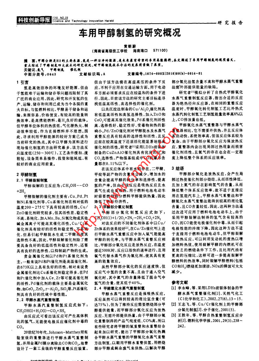 科技創(chuàng)新導(dǎo)報(bào)|210 NO.23Scrence and Tachnology Inovation Herald研究報(bào)告車(chē)用甲醇制氫的研究概況黃朝蔚(海南省高級(jí)技工學(xué)校海南???571100)摘要:甲醇分解是H2的主要來(lái)源,點(diǎn)是一種潔凈的能源,是未來(lái)最有希塑的車(chē)用高能燃料。本文用述了車(chē)用甲酵 制復(fù)的現(xiàn)實(shí)$義,重點(diǎn)綜述了甲醇制氫四大技術(shù)的研究狀況,對(duì)甲酵制氫技術(shù)今后的發(fā)展前景做了展望。關(guān)鍵詞:氬氣甲醇制氫 催化劑中圖分類(lèi)號(hào):0643文獻(xiàn)標(biāo)識(shí)碼:A文章編號(hào):1674-098X(2010)08(b)-0014-01.1引言但由于該方法需在高溫高壓的條件下反部分氧化法氫含 量不高和甲醇水蒸氣重整氫是高效潔凈的環(huán)境友好能源,但由應(yīng),不利于應(yīng)用在交通運(yùn)輸方面。用于電動(dòng)法需外部提供能最的缺陷。于氫能難于運(yùn)輸和儲(chǔ)存等問(wèn)題而限制了其車(chē) 方面必須要求反應(yīng)在較溫和的條件下進(jìn)研究者|)模擬分析了自熱式甲醇氧化廣泛的商業(yè)應(yīng)用,因此,研究和開(kāi)發(fā)氫的生行, 因此,目前該方法的研究主要目標(biāo)是尋水 蒸氣重整制氫反應(yīng)器,指出合適的反應(yīng)產(chǎn)、運(yùn)輸.儲(chǔ)存和利用已成為當(dāng)今各國(guó)的重找低溫 高活性、高選擇性的催化劑。器為絕熱徑向反應(yīng)器。在相同的重整反應(yīng).大目標(biāo)。與氫燃料相比,甲醇易于儲(chǔ)備和運(yùn)以共沉淀法制備的Cu/ Al,O,催化劑具溫度時(shí),甲醇氧化轉(zhuǎn)化制氫工藝比外熱式輸,來(lái)源容易,價(jià)格便宜,有較高的能量轉(zhuǎn)有 低溫高活性和高氫選擇性,加入ZnO和水蒸汽轉(zhuǎn)化 制氫工藝制氫能量效率高8%以換效率,是高攜能燃料,是H,良好的載體。CeO,可提 高其催化效果。Pd系催化劑活性上,CO排放量也低,但甲醇單位體積的熱值低,氣化潛熱大,制高,選擇性好,穩(wěn)定性好,受毒物和熱的影甲醇氧化水燕氣重整器與甲醇水蒸氣動(dòng)效率較低,作為直接燃料并不理想。因響小。Pd/ ZnO催化劑對(duì)甲醇脫水及水蒸氣重整器相比,它不需要外供熱,并且反應(yīng)體此,尋求利用甲醇能源的較好方案已成為重整 反應(yīng)具有較高的選擇性和活性,且反系啟動(dòng)快,系統(tǒng)效率高,但該反應(yīng)體系較為當(dāng)前研究的熱點(diǎn)。其中以甲醇為原料進(jìn)行應(yīng)前 在較高溫度下還原括化能顯著地提高復(fù)雜,由于甲醇部分氧化反應(yīng)為強(qiáng)放熱反現(xiàn)場(chǎng)催化制氫的方法研究最多,該方法反催化劑的話(huà) 性.研究者0采用LDHs前驅(qū)體應(yīng),重整器內(nèi)會(huì)出現(xiàn)局部過(guò)熱現(xiàn)象而損害應(yīng)溫度低(250~ 300C),工藝條件緩和,流制備 的CuZnAlO催化劑具有優(yōu)異的H,和催化劑活性 ,且氮?dú)獾拇嬖谝矔?huì)在一定程程短,設(shè)備簡(jiǎn)單易操作,投資和能耗低,有CO,選擇性,產(chǎn) 物溫基組成中CO的摩爾含度上降低整個(gè)體系的反應(yīng)效率.較好的商業(yè)應(yīng)用前景。量都在0.11%以下。在該反應(yīng)體系中有水的存在,二甲醚、3 結(jié)語(yǔ)2甲醇制氫甲烷等副產(chǎn)物的含量將會(huì)減少,增加水的甲醇部分氧化是放熱反應(yīng),會(huì)產(chǎn)生局2.1甲醇裂解制氫含量會(huì)提高甲醇的轉(zhuǎn)化率和選擇性,提高部過(guò)熱使催化劑部分燒結(jié),從而活性降低,甲醇裂解的主反應(yīng)為:CH,0H--CO氫的產(chǎn)率。 但由于該反應(yīng)是吸熱反應(yīng)且水且加上氮?dú)獾拇嬖谟绊憵錃獾暮?,從?2H,蒸氣生成也要吸熱,用于燃料電池電動(dòng)車(chē)降低整個(gè)體系反應(yīng)效串, 故不適于直接應(yīng).甲醇裂解的催化劑主要有:Cu.Pd.Pt時(shí) 需要燃燒部分燃料甲醇提供熱量,因此用在氫能汽車(chē)上。甲醇水蒸氣重整法和甲和Ni系催化劑等, Cu系催化劑在相對(duì)低的降低 了燃料經(jīng)濟(jì)性。醇氧化水蒸氣重整祛能得到較高的理論氫溫度200~275C下具有較高的活性。Cu/ 2.3 甲醇部分氧化制氫含量,且CO含量較低,因此,這兩種方法通ZnO催化劑研究較多,但其活性差.穩(wěn)定性甲醇部分氧化制氫反應(yīng)式如下:過(guò)改進(jìn)可應(yīng)用于燃料電池電動(dòng)車(chē)上.由于不高,易鈍化,加入Mn. Ba.Si氧化物或其他CH,OH(1)+1/20:+2N. -2H,+CO,+2N2采用甲醇裂解法制得的氫氣含有較高的堿金屬離子可提高其催化活性。Cu/Cr系對(duì)該反應(yīng)的不同催化劑體系中以Cu/co,而CO能使電極催化劑中毒,從而引起催化劑具有較好的活性和穩(wěn)定性,不易鈍Zn體 系的效果較好川。在Cu/ Zn催化制上進(jìn)電 極性能的持續(xù)下降.因此這種方法不適化,但易引起甲醇脫水生成二甲醚而使其行甲醇 水蒸氣重整反應(yīng)中加人氟氣能提高于直接用于燃料電池電動(dòng)車(chē)。但甲醇裂解選擇性不高。因此,甲醇裂解催化劑除了需甲醇的轉(zhuǎn)化率。與甲醇水蒸氣重整反應(yīng)相是吸熱反應(yīng),可以利用發(fā)動(dòng)機(jī)的廢熱以增要具備良好的低溫活性和穩(wěn)定性外,還要比, 甲醇部分氧化反應(yīng)是放熱反應(yīng),在溫度加燃料熱值.使用裂解甲醇的內(nèi)燃機(jī)可在具有良好的選擇性.以抑制副產(chǎn)物的生成。接近500K時(shí), 反應(yīng)以很快的速率進(jìn)行,且用更貧乏的燃燒條件下工作,且比用汽油有費(fèi)金屬催化劑