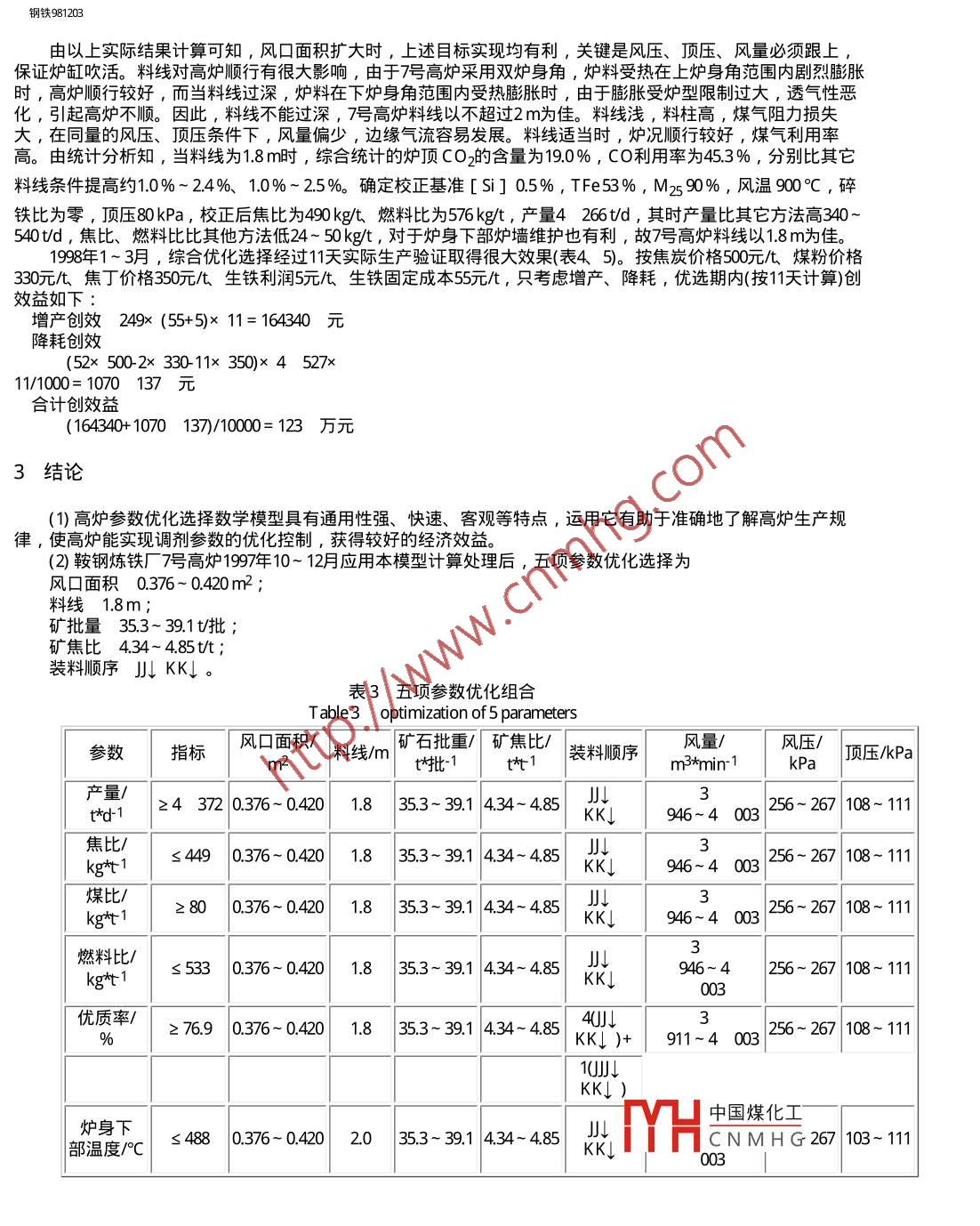 鋼鐵981203hinanto岡鐵科技期刊WANFANG DATAIRON STEEL1998年第33卷第12期高爐操作參數(shù)的優(yōu)化經(jīng)文波王國娟魏順(鞍山鋼鐵( 集團(tuán))公司)王文忠(東北大學(xué))摘要建立了高爐操作參數(shù)優(yōu)化選擇數(shù)學(xué)模型,計(jì)算了-些參數(shù)的變化對生產(chǎn)的影響,通過參數(shù)組合計(jì)算的目標(biāo)分析,可使參數(shù)優(yōu)化組合,以獲得較好的經(jīng)濟(jì)效益。關(guān)鍵詞高爐參數(shù)優(yōu)化OPTIMIZATION OF BLAST FURNACE OPERATING PARAMETERSJING Wenbo WANG Guojuan WEI Shun(Anshan Iron and Steel (Group) Co.)WANG W enzhong(Northeastern University)ABSTRACT The blast furnace mathematical model of operating parameters optimization and choice has been etablished.T he effects of some parameters variations on production are calculated.Through parameter combination calculation andobjective analysis a combination of the optimized parameters can be gained to obtain better economic effects.KEY WORDS blast furnace,parameter,optimization生產(chǎn)中常會遇到--些問題影響高爐生產(chǎn),這-方面需要提高操作者技術(shù)水平,采取各種措施解決出現(xiàn)的問題,另一方面也要不斷優(yōu)化生產(chǎn),減少問題的發(fā)生。其中操作者的決策對生產(chǎn)目標(biāo)的實(shí)現(xiàn)有決定性的影響。生產(chǎn)本身既是實(shí)踐也是實(shí)驗(yàn),操作者對以往的生產(chǎn)數(shù)據(jù)應(yīng)充分利用。不僅要合理、系統(tǒng)地歸納、計(jì)算,尋求高爐生產(chǎn)規(guī)律,明確各種調(diào)劑參數(shù)對高爐的影響,并根據(jù)實(shí)際情況和目標(biāo)做出正確的決策;而且要在今后的實(shí)踐中,不斷發(fā)現(xiàn)新方法,分析評價(jià)新結(jié)果,進(jìn)一步 優(yōu)化調(diào)劑,促進(jìn)生產(chǎn)的良性循環(huán)。實(shí)踐中如何客觀地協(xié)調(diào)好各種參數(shù)極為重要,本文利用計(jì)算機(jī)和人工神經(jīng)網(wǎng)絡(luò)技術(shù), 建立了高爐參數(shù)優(yōu)化選擇數(shù)學(xué)模型,便于高爐操作者在短時間內(nèi)通過對以往大量數(shù)據(jù)進(jìn)行統(tǒng)計(jì)計(jì)算,迅速準(zhǔn)確、客觀地優(yōu)化操作參數(shù),從宏觀上調(diào)控指導(dǎo)生產(chǎn),把短期目標(biāo)和長遠(yuǎn)目標(biāo)結(jié)合起來,獲取最大經(jīng)濟(jì)效益。1建立高爐參數(shù)優(yōu)化模型(1)設(shè)計(jì)原理本模型采用高爐信息前饋神經(jīng)網(wǎng)絡(luò)控制技術(shù)。人工神經(jīng)網(wǎng)絡(luò)是由決定單元組成的廣泛并行互聯(lián)的網(wǎng)絡(luò),它的組織能夠模擬生物神經(jīng)系統(tǒng)所作出的交互反應(yīng)并運(yùn)用光信息處理生物分子計(jì)算機(jī)等高新技術(shù),創(chuàng)造性地對人腦及其特定性進(jìn)行仿真。其特點(diǎn)是計(jì)算過程建立在大規(guī)模并行結(jié)構(gòu)和并行處理的基礎(chǔ)上,具有較強(qiáng)的容錯性和聯(lián)想能力;善于類比、推理、概括、綜合,具有較強(qiáng)的自組織性和自適應(yīng)性[1~3]。高爐信息前饋神經(jīng)網(wǎng)絡(luò)(圖1)為四層神經(jīng)網(wǎng)絡(luò)模型,輸入層有k個神經(jīng)元,中間層有i個神經(jīng)元,隱含輸出層有j個神經(jīng)元,選擇控制層有p個神經(jīng)元。輸入層、中間層、隱含層為線性神經(jīng)元, W k;為輸入層和中間神經(jīng)元間的連接權(quán)重, W為輸出層和中間層神經(jīng)元之間的連接權(quán)重。中國煤化工MHCNM HGfle//E vqk/g098126.Om(第1/ 6頁) 2010-322 20:32:48.鋼鐵981203|輸入信息輸入層.(x)輸入神經(jīng)單元W,中間層山) M3中間神經(jīng)單元Wj隱含層輸出神經(jīng)單元|輸出信息選擇控制層選擇控制單元圖1高爐信 息反饋神經(jīng)網(wǎng)絡(luò)模型Fig.1 Neural networks model of BF information feedback神經(jīng)網(wǎng)絡(luò)的輸入層X= {X,X2,.. ,Xk}X1,X2, .... , Xr為高爐監(jiān)測生產(chǎn)數(shù)據(jù)。M= {Mq, M2... , M;}Mg= [Z (XpWp)]g g=1,2,. i;p=1 ,2.,... ,k; h=1,2,... ,i。輸出層N= {N1,N2,... ,Nj}Nf= [z (MgWg)]f f=1,2,.. ,j;g=1 ,2,... ,i; q=1,2,... ,j。選擇層Y= {Y1,Y2... ,Yp}Y1, Y2,..,Y。為高爐優(yōu)化目標(biāo)數(shù)據(jù)。高爐優(yōu)化后實(shí)際生產(chǎn)結(jié)果Ys= {Ys, 1Ys,2,... ,Ys,p}。中國煤化工MHCNM HGYs1, Ys2...,Ysp為高爐優(yōu)化后生產(chǎn)數(shù)據(jù)。為使誤差Ep=z (Ye- YsJ)2<εfl/// vqkg98123..(第21 6頁) 2010222.32.28鋼鐵981203e=1,2... ,P對Y的調(diào)整,可通過Wki、W ;調(diào)節(jié)來實(shí)現(xiàn),一般取加權(quán)平均來實(shí)現(xiàn)。參數(shù)優(yōu)化模型以正交實(shí)驗(yàn)、統(tǒng)計(jì)規(guī)律為基礎(chǔ),為簡化計(jì)算,方便比較,采用適當(dāng)模糊控制,各種因素水平出現(xiàn)的概率相同;另外又采用正反向混合推理,即先由數(shù)據(jù)庫中原始數(shù)據(jù)通過正向推理提出假設(shè),再用反向推理檢驗(yàn)。方法是利用高爐以往大量有效信息,設(shè)置-定的置信開、閉區(qū)間,求出一系列目標(biāo)值,運(yùn)用求最大、最小值理論,根據(jù)需要選出最佳結(jié)果,然后在實(shí)際中檢驗(yàn),從而得出正確結(jié)論。(2)高爐優(yōu)化目標(biāo)產(chǎn)量、焦比、煤比、燃料比、一級品率、爐身下部溫度、厚度。(3)優(yōu)化參數(shù)風(fēng)口面積、料線、批重、礦焦比等。.(4)其它數(shù)據(jù)時間、利用系數(shù)、焦比、煤比、焦丁比、風(fēng)溫、風(fēng)量、風(fēng)壓、頂壓、TFe、 焦炭M25