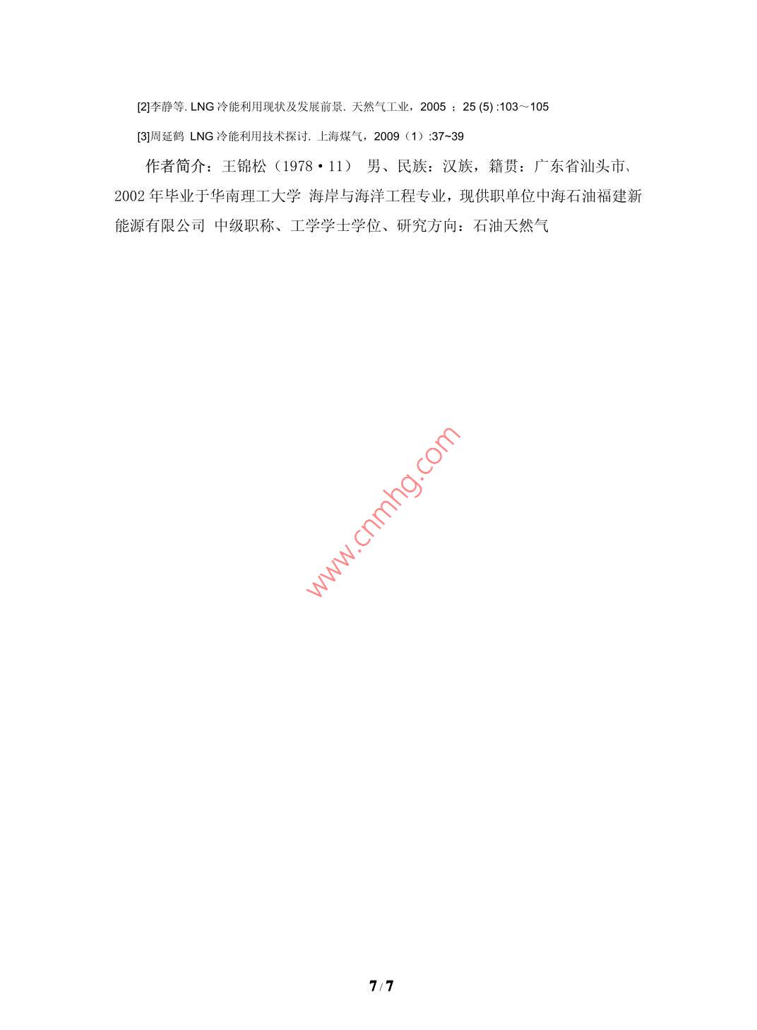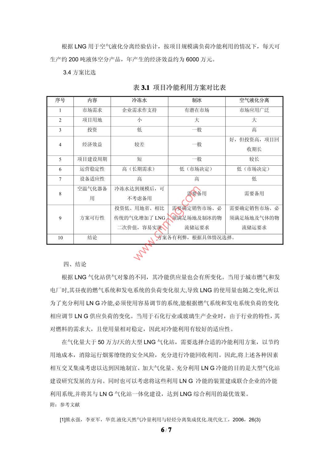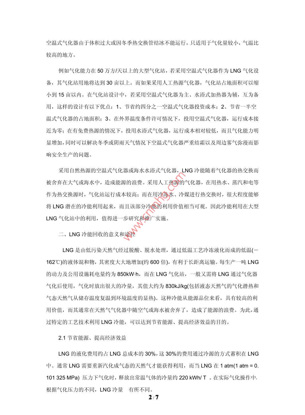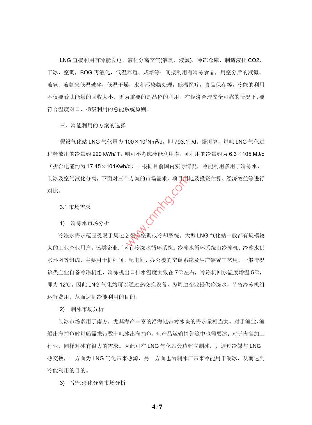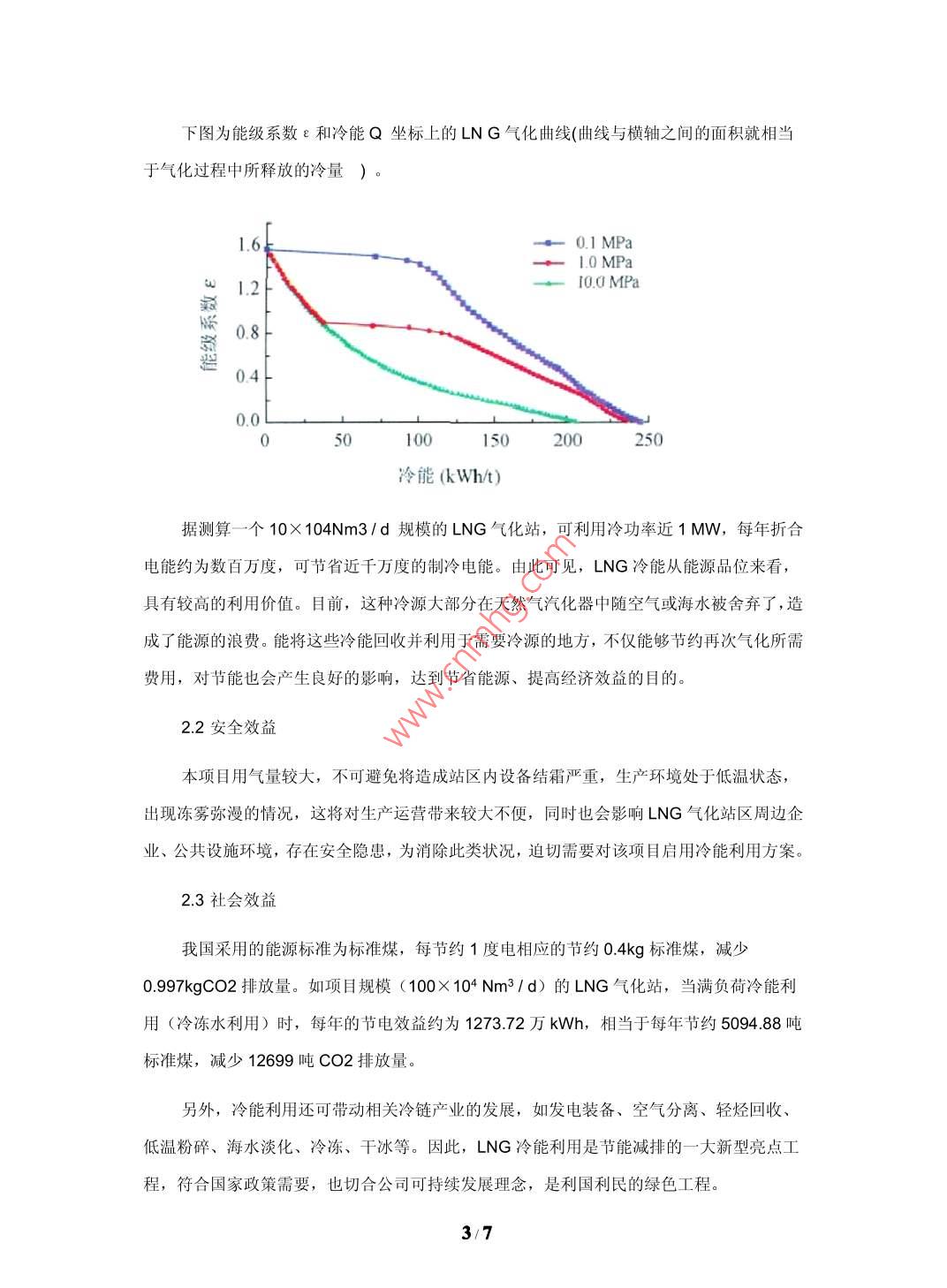 大型LNG氣化站氣化工藝及冷能利用的探討中海石油福建新能源有限公司福建廈門(mén) 361008中圖分類(lèi)號(hào): P744.4文獻(xiàn)標(biāo)識(shí)碼: A文章編號(hào):摘要:天然氣是一-種燃燒熱值高、潔凈、污染小的重要能源資源,深受各國(guó)的關(guān)注和歡迎。為了解決長(zhǎng)距離運(yùn)輸問(wèn)題,原產(chǎn)地的業(yè)主均要花費(fèi)大量的投資和能耗,把天然氣液化為L(zhǎng)NG再進(jìn)行運(yùn)輸,所以我們?cè)谝M(jìn)LNG時(shí),不僅引進(jìn)了清潔、高熱值的天然氣,同時(shí)也引進(jìn)了潛在于其中來(lái)之不易的冷能。通常LNG需要重新氣化成氣態(tài)的天然氣才能獲得利用,國(guó)內(nèi)LNG氣化站普遍采用空溫式氣化器對(duì)LNG進(jìn)行氣化,其好處是不用耗能可以完成LNG的氣化過(guò)程,但因空溫式氣化器占地面積大、投資金額大、生產(chǎn)過(guò)程霧氣彌漫等問(wèn)題而限制LNG氣化站的規(guī)模,同時(shí)LNG冷能隨著空溫式氣化器的熱交換而被舍棄在大氣中,造成能源的浪費(fèi)。本文介紹了大型LNG氣化站氣化工藝選擇的優(yōu)劣,闡述各種不同氣化工藝對(duì)氣化站建設(shè)以及冷能利用的影響,重點(diǎn)探討冷能在冷凍水、制冰及空氣液化分離等方面的利用的分析對(duì)比,得出冷能利用方案的優(yōu)劣性,有利于LNG氣化站項(xiàng)目合理研究選擇氣化工藝并充分進(jìn)行冷能的利用。關(guān)鍵詞: LNG氣化站氣化器冷能利用一、氣化工藝選擇以及對(duì)氣化站建設(shè)的影響氣化器熱源有自然熱源(空氣、海水)與人工熱源(熱水、蒸汽、電、冷凍水、冷媒)。利用自然熱源的氣化器體積較大,投資較大,運(yùn)行成本接近為零;利用人工熱源的氣化器體積較小,投資較小,運(yùn)行成本偏高。空溫式氣化器的連續(xù)工作時(shí)間一般為6~8小時(shí),如若超過(guò)8小時(shí),則出氣溫度會(huì)降低,長(zhǎng)時(shí)間使用,會(huì)導(dǎo)致氣化器結(jié)霜嚴(yán)重氣化效率降低,出口溫度達(dá)不到要求,需要另外備用一套切換使用,讓工作后氣化器進(jìn)行自然化霜。在夏季,熱交換充分,運(yùn)行情況良好;在冬季或雨季,由于環(huán)境溫度或濕度的影響,氣化器氣化效果大大降低,影響氣化量和出站氣溫度,同時(shí)氣化過(guò)程造成霧氣彌漫的情況,影響安全操作。1/7空溫式氣化器由于體積過(guò)大或因冬季熱交換管結(jié)冰不能運(yùn)行,只適用于氣化量較小,氣溫比較高的地方。例如氣化能力在50萬(wàn)方天以上的大型氣化站,若采用空溫式氣化器作為L(zhǎng)NG氣化設(shè)備,其氣化站用地將達(dá)到30畝以上。而如果采用人工熱源氣化器,氣化站占地面積可以縮小到15畝以?xún)?nèi)。在氣化站設(shè)計(jì)中,若采用空溫式氣化器為主、水浴式加熱器為輔,互為備用,這樣的設(shè)計(jì)有以下優(yōu)點(diǎn): 1、節(jié)省約四分之- -空溫式氣化器投資成本: 2、節(jié)省- - 半空溫式氣化器的占地面積; 3、 在外界溫度條件許可情況下,投用空溫式氣化器,運(yùn)行成本接近為零;在有免費(fèi)熱源的情況下,投用水浴式氣化器,運(yùn)行成本相對(duì)較低,而且氣化能力明顯增加,同時(shí)可以解決冬季或陰雨天氣情況下空溫式氣化器嚴(yán)重結(jié)霜以及周邊霧氣彌漫而影響安全生產(chǎn)的問(wèn)題。采用自然熱源的空溫式氣化器或海水水浴式氣化器,LNG冷能隨著氣化器的熱交換而被舍棄在大氣或海水中,造成能源的浪費(fèi)。采用人工熱源的氣化器,在用熱水、蒸汽和電等作為熱交換源時(shí),氣化站運(yùn)行成本較高;而在用冷凍水、冷媒進(jìn)行熱交換時(shí),很大程度能夠?qū)NG潛在的冷能利用起來(lái),而且該部分冷能的利用價(jià)值相當(dāng)可觀。因此冷能利用在大型LNG氣化站中的利用,值得進(jìn)一步研究和推廣實(shí)施。二、LNG冷能回收的意義和途徑LNG是由低污染天然氣經(jīng)過(guò)脫酸、脫水處理,通過(guò)低溫工藝?yán)鋬鲆夯傻牡蜏?一162"C)的液體混和物,其密度大大地增加(約600倍),有利于長(zhǎng)距離運(yùn)輸。每生產(chǎn)--噸LNG的動(dòng)力及公用設(shè)施耗電量約為850kW.h,而在LNG氣化站,一般又需將LNG通過(guò)氣化器氣化后使用,氣化時(shí)放出很大的冷量,其值大約為830kJlkg(包括液態(tài)天然氣的氣化潛熱和氣態(tài)天然氣從儲(chǔ)存溫度復(fù)溫到環(huán)境溫度的顯熱)。這種冷能從能源品位來(lái)看,具有較高的利用價(jià)值,而其通常在天然氣氣化器中隨空氣或海水被舍棄了,造成了能源的浪費(fèi)。為此,通過(guò)特定的工藝技術(shù)利用LNG冷能,可以達(dá)到節(jié)省能源、提高經(jīng)濟(jì)效益的目的。2.1節(jié)省能源、提高經(jīng)濟(jì)效益LNG的液化費(fèi)用約占LNG總成本的30%,這30%的費(fèi)用通過(guò)冷源的方式蓄積在LNG中。通常LNG需要重新汽化成氣態(tài)的天然氣才能獲得利用,而當(dāng)LNG在1atm(1atm=0.101 325 MPa)壓力下氣化時(shí),釋放出常溫氣體的冷量約220 kWh/T。在實(shí)際氣化操作中,根據(jù)氣化壓力的不同,LNG冷量有所不同 。2/7下圖為能級(jí)系數(shù)e和冷能Q坐標(biāo)上的LNG氣化曲線(曲線與橫軸之間的面積就相當(dāng)于氣化過(guò)程中所釋放的冷量) 。1. 620.1 MPa+ 1.0 MPai 1.2-一100MPa愛(ài)0.8煎0.40.0050100150200250冷能(kWh/t)據(jù)測(cè)算-一個(gè)10X 104Nm3/d規(guī)模的LNG氣化站,可利用冷功