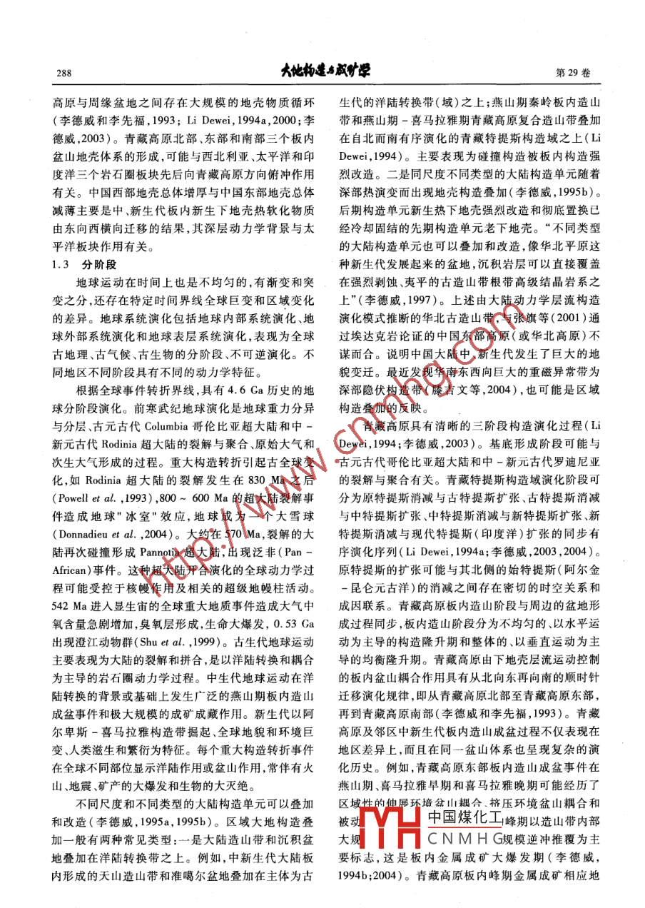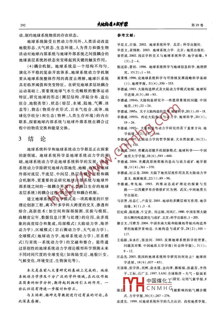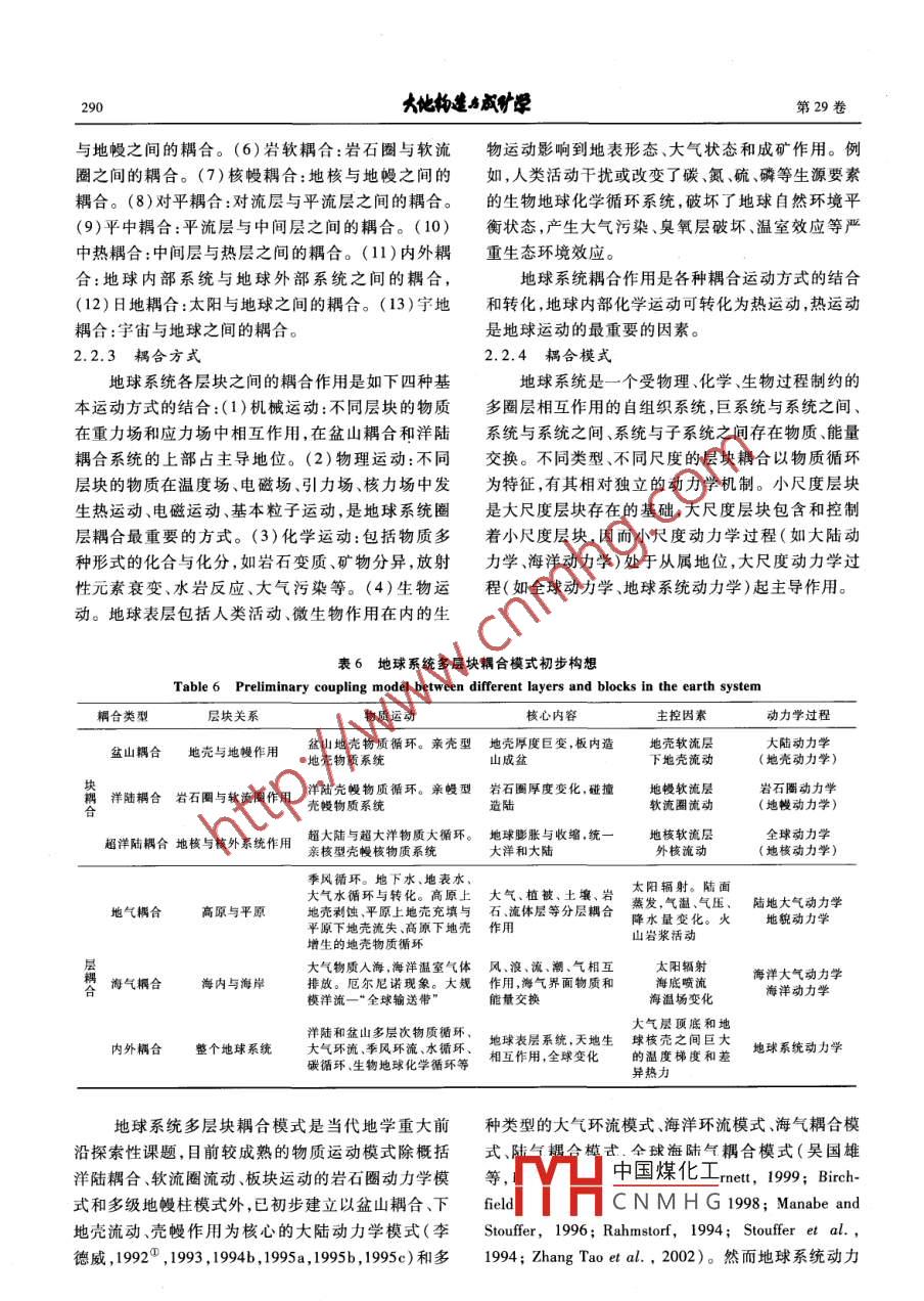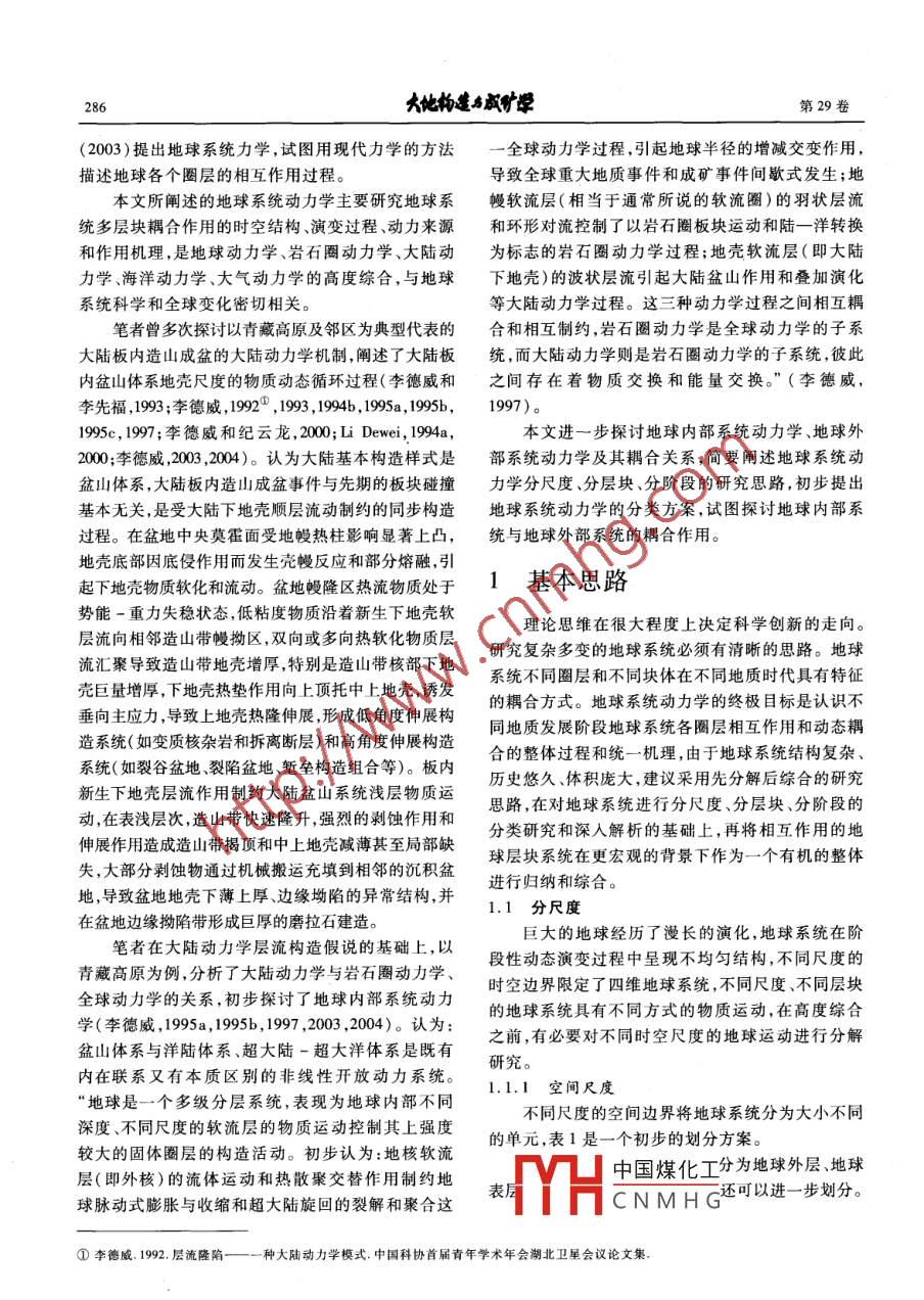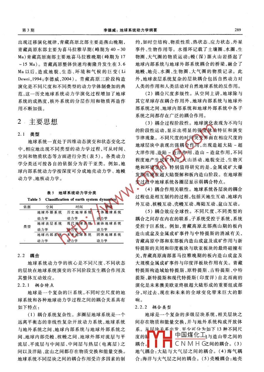卷( Volume)29,期( Number)3,總(SUM)106頁( Pages)285-294,2005,8( August,2005)大地構(gòu)造與成礦學(xué)Geotectonica et Metallogenia地球系統(tǒng)動力學(xué)綱要李德威(中國地質(zhì)大學(xué)地球科學(xué)學(xué)院和青藏高原研究中心,湖北武漢430074)摘要:與地球系統(tǒng)科學(xué)和全球變化密切相關(guān)的地球系統(tǒng)動力學(xué)研究地球系統(tǒng)多層塊耦合作用的結(jié)構(gòu)、過程、機理和效應(yīng),是地球動力學(xué)、巖石圈動力學(xué)、大陸動力學(xué)海洋動力學(xué)、大氣動力學(xué)的高度綜合。本文采用分尺度、分層塊、分階段的思路研究復(fù)雜的地球系統(tǒng),將地球系統(tǒng)動力學(xué)按空間、時間和物質(zhì)分為地球內(nèi)部系統(tǒng)動力學(xué)、地球表層系統(tǒng)動力學(xué)、地球外部系統(tǒng)動力學(xué),歷史地球系統(tǒng)動力學(xué)、現(xiàn)代地球系統(tǒng)動力學(xué)、未來地球系統(tǒng)動力學(xué),氣體地球系統(tǒng)動力學(xué)、液體地球系統(tǒng)動力學(xué)、固體地球系統(tǒng)動力學(xué),分析了地球系統(tǒng)的耦合特征、耦合類型和耦合方式,初步探討地球內(nèi)部系統(tǒng)與地球外部系統(tǒng)耦合作用的耦合邊界、物質(zhì)運動、動力來源和耦合機制。最終將地球系統(tǒng)相互作用的各層塊作為一個有機的整體進行綜合,認為地球內(nèi)部放射性衰變生熱和地球外部太陽輻射生熱是驅(qū)動地球復(fù)雜開放系統(tǒng)層塊耦合的主要動力源關(guān)鍵詞:地球系統(tǒng)科學(xué);地球系統(tǒng)動力學(xué);地球表層系統(tǒng);全球變化;耦合中圖分類號:P541獻標(biāo)識碼:A文章編號:1001-1552(2005)030285-100引言學(xué)科作為一個有機的整體進行大跨度的系統(tǒng)研究,是以美國國家航空與宇航管理局地球系統(tǒng)科學(xué)委員大陸動力學(xué)是當(dāng)代地球科學(xué)的重大前沿領(lǐng)域,會出版的《地球系統(tǒng)科學(xué)》(NASA,1988)一書作為然而大陸是地球系統(tǒng)中的一個組成部分,地球系統(tǒng)里程碑,提出了地球系統(tǒng)科學(xué)的概念,將相互作用的具有長期的演化歷史和復(fù)雜的層塊結(jié)構(gòu),包含陸洋、大氣圈、水圈、生物圈、土壤圈、巖石圈作為統(tǒng)一的整核幔、殼幔、陸氣、海氣等多重耦合作用,涉及大氣體進行研究。圈、水圈、生物圈、巖石圈的時空演變、物質(zhì)運動和相1983年錢學(xué)森院士首先倡導(dǎo)“地球表層學(xué)”?;プ饔?影響全球變化的物理過程、化學(xué)過程和生物近十年來,中國學(xué)者從不同角度論述了地球系統(tǒng)科過程,制約陸地生態(tài)系統(tǒng)和人類生存環(huán)境,這些重大學(xué)(任紀(jì)舜等,1990;陳述彭和曾杉,1996;黃秉維,問題是地球系統(tǒng)科學(xué)和地球系統(tǒng)動力學(xué)的核心,因1996;袁道先,1999}張志強等,1999}馬宗晉等而地球系統(tǒng)科學(xué)和地球系統(tǒng)動力學(xué)是當(dāng)代地球科學(xué)2001;畢思文和許強,2002;柴育成,2002;汪品先,的最大前沿領(lǐng)域,對自然科學(xué)和人類社會的發(fā)展也2003;王焰新等,2003;翟裕生,2004),推動了地球系具有十分重要的意義統(tǒng)科學(xué)的發(fā)展。地球系統(tǒng)多圈層耦合具有開放的體盡管許多學(xué)者早已注意到地質(zhì)學(xué)、地理學(xué)、氣象系、復(fù)雜的過程、關(guān)聯(lián)的機制,因此,必須從地球系統(tǒng)學(xué)、海洋學(xué)、生態(tài)學(xué)、災(zāi)害學(xué)、地球物理學(xué)、地球化學(xué)動力學(xué)的高度研究地球系統(tǒng)中不同類型的物質(zhì)循環(huán)等學(xué)科中某些學(xué)科之間的交叉和滲透,但是將這些的內(nèi)在規(guī)律和驅(qū)動營力。最近,畢思文和黃潤秋收稿日期:20040927;改回日期:2005402-14中國煤化工基金項目:中國地質(zhì)調(diào)查局“1:25萬定結(jié)縣幅、陳塘區(qū)幅區(qū)域地質(zhì)調(diào)查”(項目編號屬、不凍泉幅區(qū)域地質(zhì)調(diào)查”(項目編號:20013000和“雅魯藏布江成礦區(qū)中段銅多金屬礦CNMHG作者簡介:李德威(1962-),男,博士,教授,博士生導(dǎo)師,本刊常務(wù)編委,構(gòu)造地質(zhì)學(xué)專業(yè),主要從事大陸動力學(xué)和成礦動力學(xué)的研究及教Email:dewei89@sina.com286第29卷(2003)提出地球系統(tǒng)力學(xué),試圖用現(xiàn)代力學(xué)的方法全球動力學(xué)過程,引起地球半徑的增減交變作用,描述地球各個圈層的相互作用過程。導(dǎo)致全球重大地質(zhì)事件和成礦事件間歇式發(fā)生;地本文所闡述的地球系統(tǒng)動力學(xué)主要研究地球系幔軟流層(相當(dāng)于通常所說的軟流圈)的羽狀層流統(tǒng)多層塊耦合作用的時空結(jié)構(gòu)、演變過程、動力來源和環(huán)形對流控制了以巖石圈板塊運動和陸一洋轉(zhuǎn)換和作用機理,是地球動力學(xué)、巖石圈動力學(xué)、大陸動為標(biāo)志的巖石圈動力學(xué)過程;地殼軟流層(即大陸力學(xué)、海洋動力學(xué)、大氣動力學(xué)的高度綜合,與地球下地殼)的波狀層流引起大陸盆山作用和疊加演化系統(tǒng)科學(xué)和全球變化密切相關(guān)。等大陸動力學(xué)過程。這三種動力學(xué)過程之間相互耦筆者曾多次探討以青藏高原及鄰區(qū)為典型代表的合和相互制約,巖石圈動力學(xué)是全球動力學(xué)的子系大陸板內(nèi)造山成盆的大陸動力學(x