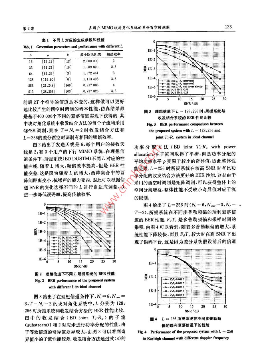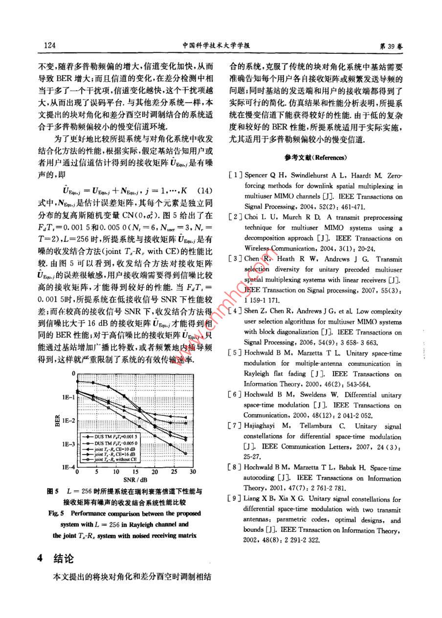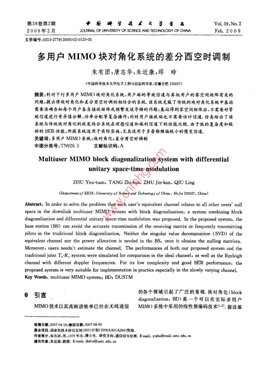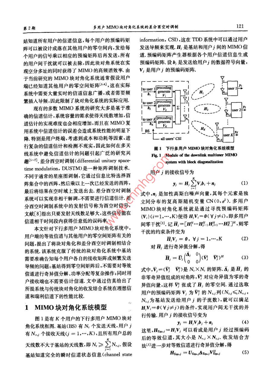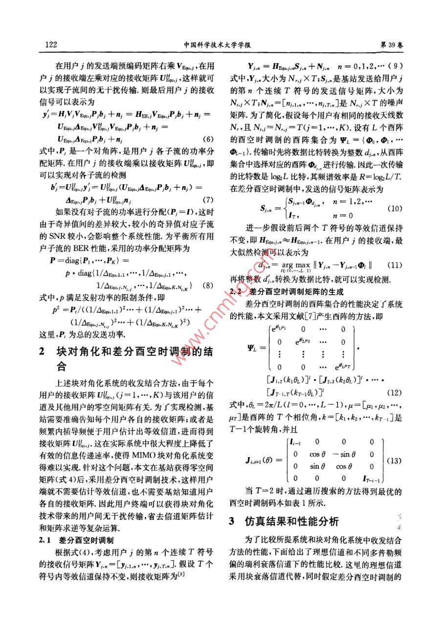 第39卷第2期中閭苧孜術(shù)大每學(xué)旗Vol 39, No. 22009年2月 TY OF SCIENCE AND TECHNOLOGY OF CHINA"Feb.2009文章編號(hào):0253-2778(2009)02012005多用戶MIMO塊對(duì)角化系統(tǒng)的差分酉空時(shí)調(diào)制朱有團(tuán),唐志華,朱近康,邱玲(中國(guó)科學(xué)技術(shù)大學(xué)電子工程與信息科學(xué)系,安徽合肥23002摘要:針對(duì)下行多用戶MIMO塊對(duì)角化系統(tǒng),用戶端的等效信道與其他用戶的零空間矩陣有關(guān)的問題,提出將塊對(duì)角化和差分酉空時(shí)調(diào)制相結(jié)合的系統(tǒng),該系統(tǒng)克服了傳統(tǒng)的塊對(duì)角化系統(tǒng)中基站需要準(zhǔn)確告知每個(gè)用戶各自接收矩陣或頻繁發(fā)送導(dǎo)頻的問題;基站得到零空間矩陣后,不需要對(duì)等效信道進(jìn)行奇異值分解、功率分配等復(fù)雜操作;同時(shí)用戶接收端也不需要估計(jì)信道.仿真給出了該系統(tǒng)與傳統(tǒng)塊對(duì)角化的收發(fā)結(jié)合系統(tǒng)在理想信道和瑞利信道下的性能比較.由于低的復(fù)雜度和較好的BER性能,所提系統(tǒng)適用于實(shí)際實(shí)施,尤其適用于多普勒頻偏較小的慢變信道關(guān)鍵詞:多用戶MIMO系統(tǒng);塊對(duì)角化;差分酉空時(shí)調(diào)制中圖分類號(hào):TN929.5文獻(xiàn)標(biāo)識(shí)碼:AMultiuser MiMo block diagonalization system with differentialunitary space-time modulationZHU You-tuan, TANG Zhi-hua, ZHU Jin-kan, QIU Ling(Department of EEIS, University of Science and Technology of China, Hefei 230027, China)Abstract: In order to solve the problem that each user's equivalent channel relates to all other users'nullspace in the downlink multiuser MIMO system with block diagonalization, a system combining blockdiagonalization and differential unitary space-time modulation was proposed. In the proposed system, thebase station(BS) can avoid the accurate transmission of the receiving matrix or frequently transmittinglots in the traditional block diagonalization. Neither the singular value decomposition(SVD )of theequivalent channel nor the power allocation is needed in the bS, once it obtains the nulling matricesMoreover, users neednt estimate the channel. The performances of both our proposed system and thetraditional joint T:R system were simulated for comparison in the ideal channel, as well as the rayleighchannel with different doppler frequencies. For its low complexity and good BER performance, theproposed system is very suitable for implementation in practice especially in the slowly varying channel.Key Words: multiuser MIMO system; BD; DUSTM0引言的各個(gè)領(lǐng)域引起了廣泛的重視,塊對(duì)角化( blockdiagonalization,BD)是一個(gè)可以在實(shí)際多用戶MMO技術(shù)以其高頻譜效率已經(jīng)在無(wú)線通信MIM系統(tǒng)中采用的線性預(yù)編碼技術(shù)2.假設(shè)基收稿日期:200704-16;修回日期:2007-0830基金項(xiàng)目:國(guó)家高技術(shù)研究發(fā)展(863)計(jì)劃(2006AA01A266)資助作者簡(jiǎn)介:朱有團(tuán)男,1979年生,博土生。研究方向:通信信號(hào)處理.E-mail;ythu@mail.ustc.edu.cn通訊作者:朱近康教投, E-mailt jkzhut@ use. edu c第2期多用戶MM塊對(duì)角化系統(tǒng)的差分酉空時(shí)調(diào)制121站知道所有用戶的信道信息,每個(gè)用戶的預(yù)編碼矩 information,CSI,這在TDD系統(tǒng)中可以通過(guò)用戶陣可以被設(shè)計(jì)成落在其他用戶的零空間內(nèi)發(fā)給每發(fā)送導(dǎo)頻來(lái)實(shí)現(xiàn)H是基站和用戶j間的MIMO信個(gè)用戶的信號(hào)乘以相應(yīng)的預(yù)編矩陣后再發(fā)送,所有道預(yù)編碼矩陣產(chǎn)生器根據(jù)各個(gè)用戶信道信息生成的用戶間干擾就可以被去除,因此塊對(duì)角系統(tǒng)在實(shí)預(yù)編碼矩陣設(shè)b是發(fā)送給用戶j的數(shù)據(jù)符號(hào)向量,現(xiàn)空分多址的同時(shí)獲得了MIMO的高頻譜效率由V,是用戶j的預(yù)編碼矩陣于當(dāng)前研究的MMo塊對(duì)角化系統(tǒng)通常假設(shè)用戶端已經(jīng)知道其他用戶的零空間矩陣,這在實(shí)際系統(tǒng)中需要大量實(shí)時(shí)的信道信息廣播或者需要頻ou繁插入導(dǎo)頻因此限制了塊對(duì)角化系統(tǒng)的實(shí)際應(yīng)用現(xiàn)有的多數(shù)MMO系統(tǒng)的研究大多是基于準(zhǔn)2∞片、確的信道估計(jì),系統(tǒng)容量的需求使得天線數(shù)增加,信道估計(jì)的實(shí)現(xiàn)難度也會(huì)相應(yīng)增加,而且在MMO復(fù)用系統(tǒng)中信道估計(jì)的誤差會(huì)造成系統(tǒng)性能的明顯下B↑一降.特別是用戶終端,考慮到成本和功耗等因素,進(jìn)行復(fù)雜的信道估計(jì)和檢測(cè)不現(xiàn)實(shí),因此如何在多天圖1下行多用戶MMO塊對(duì)角化系統(tǒng)模型線系統(tǒng)中避免信道估計(jì)的問題引起廣泛的研究興Fig 1 Module of the downlink multiuser MIMO趣.差分酉空時(shí)調(diào)制( differential unitary space-system with block diagonalizationtime modulation, DUSTM)是一種矩陣調(diào)制技術(shù)不同于通常的星座圖調(diào)制,它通過(guò)信息比特選擇西用戶j的接收信號(hào)為陣集合中的酉陣,然后乘以上一次已經(jīng)發(fā)送的酉陣,y=H∑vb;+n(1)最后將結(jié)果在空時(shí)域上發(fā)送出去.差分酉空時(shí)調(diào)制系統(tǒng)可以實(shí)現(xiàn)非相干解調(diào)不需要進(jìn)行信道估計(jì).差i計(jì)差式中,m是加性高斯白噪聲向量其每個(gè)元素是獨(dú)復(fù)高斯隨機(jī)變量分酉空時(shí)調(diào)制系統(tǒng)中的發(fā)射