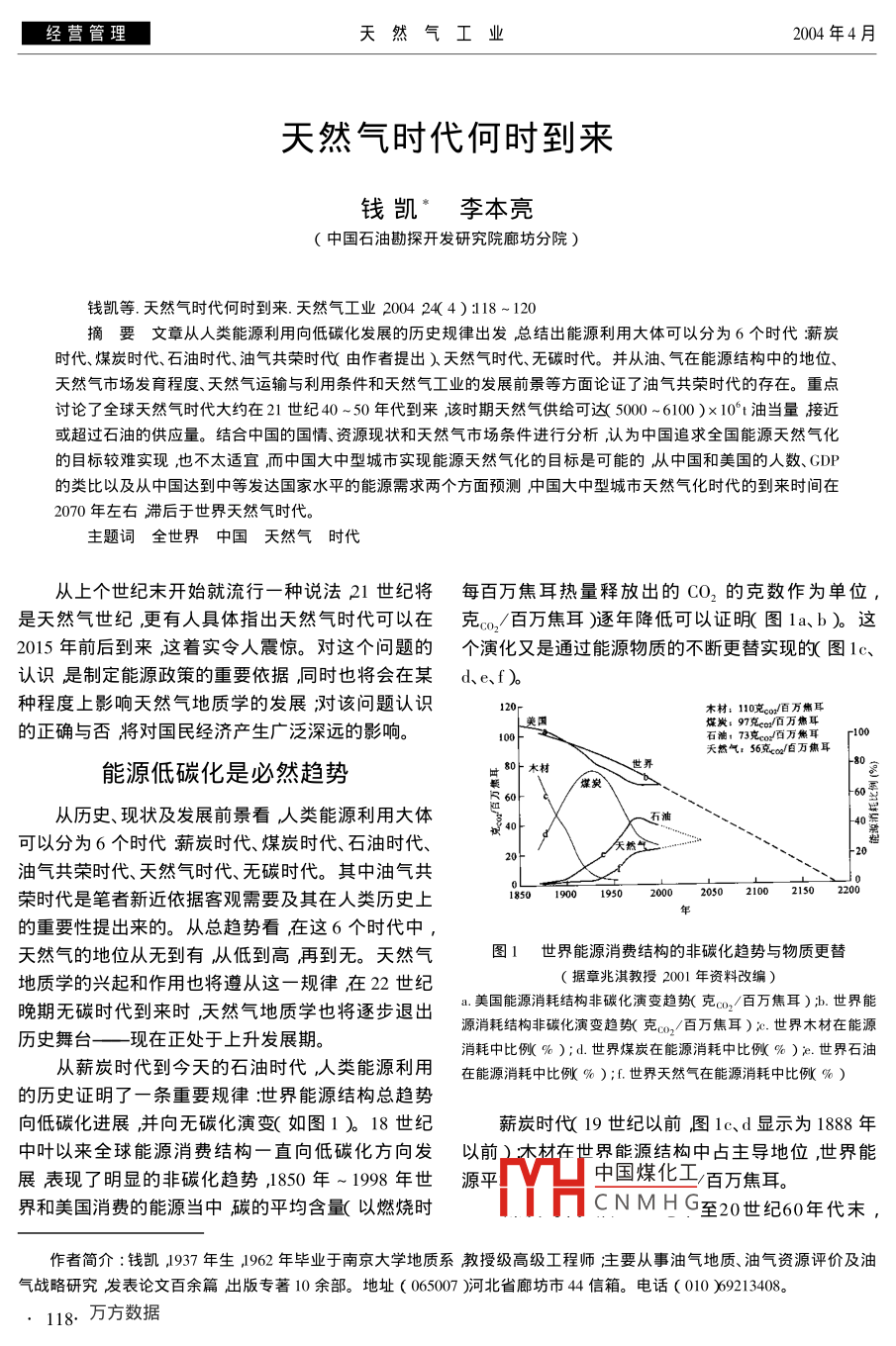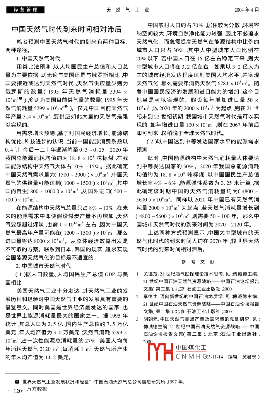 經營管理天然氣工業(yè)004年4月天然氣時代何時到來錢凱李本亮中國石油勘探開發(fā)研究院廊坊分院)錢凱等.天然氣時代何時到來天然氣工業(yè)2004244)118-120摘要文章從人類能源利用向低碳化發(fā)展的歷史規(guī)律出發(fā)總結出能源利用大體可以分為6個時代薪炭時代、煤炭時代、石油時代、油氣共榮時代由作者提出)天然氣時代、無碳時代。并從油、氣在能源結構中的地位、天然氣市場發(fā)育程度、天然氣運輸與利用條件和天然氣工業(yè)的發(fā)展前景等方面論證了油氣共榮時代的存在。重點討論了全球天然氣時代大約在21世紀40~50年代到來該時期天然氣供給可達(5000-6100)×10°t油當量接近或超過石油的供應量。結合中國的國情、資源現狀和天然氣市場條件進行分析,認為中國追求全國能源天然氣化的目標較難實現也不太適宜而中國大中型城市實現能源天然氣化的目標是可能的從中國和美國的人數、GDP的類比以及從中國達到中等發(fā)達國家水平的能源需求兩個方面預測中國大中型城市天然氣化時代的到來時間在2070年左右滯后于世界天然氣時代。主題詞全世界中國天然氣時代從上個世紀末開始就流行一種說法21世紀將每百萬焦耳熱量釋放出的CO,的克數作為單位是天然氣世紀更有人具體指出天然氣時代可以在克,/百萬焦耳)逐年降低可以證眼圖1a、b)這2015年前后到來這著實令人震驚。對這個問題的個演化又是通過能源物質的不斷更替實現的圖1c、認識是制定能源政策的重要依據同時也將會在某d、c、f)種程度上影響天然氣地質學的發(fā)展,對該問題認識木材;110克。o/百萬癌耳的正確與否將對國民經濟產生廣泛深遠的影響。e/佰百萬焦耳石油,73克0百萬焦耳天然氣:56克。/百萬焦耳能源低碳化是必然趨勢從歷史、現狀及發(fā)展前景看人類能源利用大體可以分為6個時代薪炭時代、煤炭時代、石油時代、矢然二油氣共榮時代、天然氣時代、無碳時代。其中油氣共榮時代是筆者新近依據客觀需要及其在人類歷史上185019001950200020502121502200的重要性提出來的。從總趨勢看在這6個時代中,天然氣的地位從無到有從低到高再到無。天然氣圖1世界能源消費結構的非碳化趨勢與物質更替地質學的興起和作用也將遵從這一規(guī)律在22世紀據章兆淇教授2001年資料改編)晩期無碳時代到來時,天然氣地質學也將逐步退出美國能源消耗結構非碳化演變趨勢(克,/百萬焦耳)世界能歷史舞臺——現在正處于上升發(fā)展期。源消耗結構非碳化演變趨克。2/百萬焦耳)c世界木材在能源消耗中比倣%);d.世界煤炭在能源消耗中比傚%)世界石油從薪炭時代到今天的石油時代人類能源利用在能源消耗中比例%);江世界天然氣在能源消耗中比例%的歷史證明了一條重要規(guī)律:世界能源結構總趨勢向低碳化進展并向無碳化演變(如圖1)18世紀薪炭時代19世紀以前圖1c、d顯示為1888年中葉以來全球能源消費結構一直向低碳化方向發(fā)以前〕木材在世界能源結構中占主導地位,世界能展表現了明顯的非碳化趨勢,1850年~1998年世源平中國煤化工百萬焦耳。界和美國消費的能源當中碳的平均含量(以燃燒時CNMHG至20世紀60年代末作者簡介:錢凱1937年生』962年畢業(yè)于南京大學地質系教授級高級工程師莊要從事油氣地質、油氣資源評價及油氣戰(zhàn)略研究發(fā)表論文百余篇出版專著10余部。地址(065007)河北省廊坊市44信箱。電話(010)9213408。新藻!C8II第24卷第4期天然氣工業(yè)經營管理煤炭在能源結構中的比例逐漸升高而后降低,但—到來還需要穩(wěn)定的國際政治環(huán)境并妥善解決產氣直占主導地位,世界能源平均含碳量由97.9克國和消費國的利益分配形成廣泛的國際合作。洲百萬焦耳降至75克。/百萬焦耳。際天然氣管道的建設和運作,以及全球天然氣市場石油時代:968年石油在一次能源消費中的比的形成都具有風險性,需要政治家和決策者的遠例達到40%隨之超過煤炭而成為主要能源能源消見、勇氣和智慧。但不管怎樣這個總趨勢是不會變費結構中平均含碳量由1970年的75克/百萬焦的耳降至1998年的67.1克/百萬焦耳°。全球天然氣時代何時到來氣共榮時代石油時代中我們建議分出個油氣共榮時代,從20世紀末就流行一種說法21人類能源利用的歷史性規(guī)律為預測天然氣時代世紀將是天然氣的世紀對比圖1、表1可以發(fā)現這的到來提供了有力的科學依據。根據這一規(guī)律預測個說法不是很確切的。我們認為目前仍然是石油時全球天然氣時代將在本世紀40-50年代到來如圖代從全球看有可能在本世紀20~30年代進入油1所示推測將在本世紀40年代初期(2043年)到氣共榮時代。依據有四條來。世界一次性能源供需預測也為這個認識提供了(1)目前石油仍占主導地位。從圖1看出石油旁證(表1)據表1到2050年世界天然氣供給可在一次性消耗的能源結構中約占40%而天然氣只達(50006100×10°油當量基本接近或超過石占23%左右煤炭所占的比例在25%左右木材的油的供應量(5400~5800×10°t比例更低,占3%左右所以主要還是以消耗石油為主其次為天然氣和煤炭表1世界一次性能源供應需求預測10°t油當量)(2)20世紀六、七十年代,世界大氣田相繼發(fā)和CO2排放10°t碳)現天然氣儲量、產量快速增長產氣國政府開始對年份1991200天然氣的價格和使用范圍放寬控制天然氣生產者能源需求80458570-9300900-1160:800-100
