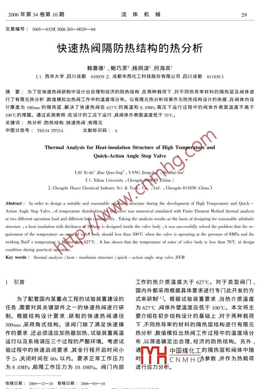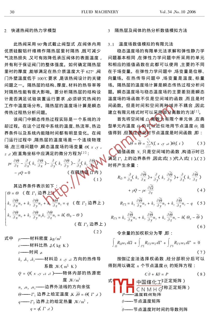 2006年第34卷第10期流體機(jī)械29文章編號(hào):1005-03292006)0-0029—04快速熱閥隔防熱結(jié)構(gòu)的熱分析賴喜德,鮑巧靈?楊炯波2何海賓(1.西華大學(xué)四川成都6100392.成都華西化工科技股份有限公司四川成都611830)摘要:為了在快速熱閥硏制中設(shè)計(jì)岀合理和經(jīng)濟(jì)旳防熱結(jié)構(gòu)在兩種載荷下對(duì)不同熱導(dǎo)率材料的隔熱層及閥體進(jìn)行了有限元熱分析數(shù)值模擬岀熱閥工作中的溫度場分布。以有限元熱分析結(jié)果作為防熱結(jié)構(gòu)設(shè)計(jì)的依據(jù)在閥體內(nèi)設(shè)計(jì)厚度為100mm的隔熱層解決了快速熱閥在627℃的高溫和8.0MPa高壓下運(yùn)行過程中的閥體外表面溫度不高于00℃的難題。通過實(shí)測表明在設(shè)計(jì)的工況下運(yùn)行其閥體外表面溫度低于70℃。關(guān)鍵詞:熱分析泐防熱結(jié)構(gòu)快速熱閥有限元中圖分類號(hào):TH134P214文獻(xiàn)標(biāo)識(shí)碼:AThermal Analysis for Heat-insulation Structure of High Temperature andQuick-Action Angle Stop ValveLAI Xi-de, Bao Qiao-ling, YANG Jiong-bo2,He Hai-bin'(1. Xihua University Chengdu 610039 China2. Chengdu Huaxi Chemical Industry Sci. Tech. Co. Ltd. Chengdu 611830 ChinaAbstract: In order to design a suitable and reasonable adiabatic structure during the development of High Temperature and QuickAction Angle Stop Valve of temperature distribution for the valve was numerical simulated with Finite Element Method thermal analysisat two different operation load and different heat conductivity. Taking the analysis results as the basis of designing for reasonable adiabaticstructure, a heat insulation with thickness of 100mm is designed inside the valve body it was successfully solved the problem that the requirement of the temperature on outer of valve body should less than 100C when the valve is operating at the pressure of 8MPa andworking fluid s temperature is higher than 627C. It has shown that the temperature of outer of valve body is less than 70'C at desiondition during practical operationKey words: thermal analysis i heat insulation structure i quick-action angle stop valve FFEM1引言工作的熱介質(zhì)溫度大于627℃。對(duì)于類型閥門國內(nèi)外都采用根據(jù)具體要求進(jìn)行專門此開發(fā)的方為了配套國內(nèi)某重點(diǎn)工程的試驗(yàn)裝置建設(shè)的式來研制1根據(jù)試驗(yàn)裝置要求,當(dāng)熱介質(zhì)溫度任務(wù)需要對(duì)其關(guān)鍵部件之一的快速熱閥進(jìn)行研為627℃閥體外壁溫度應(yīng)低于100℃。本文將主制。根據(jù)結(jié)構(gòu)設(shè)計(jì)要求,研制的快速熱閥通徑要介紹在初步結(jié)構(gòu)設(shè)計(jì)的基礎(chǔ)上,對(duì)于兩種載荷300mm采用角式結(jié)構(gòu)。該閥門除了滿足快速操下不同熱導(dǎo)率的材料的隔熱層結(jié)構(gòu)進(jìn)行有限元作的要求還必須適應(yīng)加熱器加熱、試驗(yàn)裝置高溫?zé)岱治鰯?shù)值模擬出熱閥工作過程中的溫度場分運(yùn)行以及系統(tǒng)調(diào)壓三個(gè)過程的嚴(yán)酷環(huán)境??紤]試布以篩選確定岀合理、經(jīng)濟(jì)的防熱結(jié)構(gòu)。另外驗(yàn)過程中的快速啟閉要求其全行程開啟時(shí)間小通rV凵中國煤化工的隔熱層和閥體中隨于2s關(guān)閉時(shí)間在60s以內(nèi)。要求正常工作壓力時(shí)CNMH(參數(shù),并作為熱載荷為8.0MPa極限工作壓力為10.0MPa。閥門內(nèi)部進(jìn)行應(yīng)力分析。收稿日期:2005-12-20修稿日期:2006-03-10基金項(xiàng)目片數(shù)搪廳自然科學(xué)重點(diǎn)項(xiàng)(x04013四川省重點(diǎn)學(xué)科建設(shè)項(xiàng)目(2)30FLUID MACHINERYⅤol.34No.1020062快速熱閥的熱力學(xué)模型3隔熱層及閥體的熱分析數(shù)值模擬方法此熱閥采用90°角式截止閥型式在閥體內(nèi)用3.1溫度場數(shù)值模擬的有限元法優(yōu)質(zhì)硅酸鋁纖維棉作隔熱層里襯隔熱,既可減少穩(wěn)態(tài)溫度場的有限單元法求解和彈性靜力學(xué)氣流熱損失又可有效降低承壓閥體的表面溫度,問題基本相同在彈性力學(xué)問題中所采用的單元并有利于保證閥門的整體強(qiáng)度。如何確定隔熱層和相應(yīng)的插值函數(shù)在此都可以使用,主要的不同里襯的厚度能夠滿足在熱介質(zhì)溫度大于627°,閥在于場變量。在彈性力學(xué)問題中場變量是位移、門外壁溫度低于100℃要求是該熱閥設(shè)計(jì)的關(guān)鍵向量場。在熱傳導(dǎo)問題中,場變量是溫度、標(biāo)量問題之一。隔熱層的結(jié)構(gòu)、厚度、材料的熱導(dǎo)率等場。隔熱層的溫度場計(jì)算是瞬態(tài)傳熱過程分析問對(duì)隔熱性能有很大影響。要分析隔熱層的結(jié)枃設(shè)題。瞬態(tài)溫度場與穩(wěn)態(tài)溫度場的主要差別是瞬態(tài)計(jì)是否滿足試驗(yàn)裝置運(yùn)行要求,必須研究熱閥的溫度場的場函數(shù)不僅是空間域的函數(shù)而且是時(shí)工作中溫度場分布。隔熱層的溫度場計(jì)算是瞬態(tài)間函數(shù)。但是時(shí)間和空間兩種域并不耦合因此傳熱過程熱分析問題。建立有限元格式時(shí)可以采用部分離散的方法2該閥門中瞬態(tài)傳熱過程實(shí)際是一個(gè)系統(tǒng)的冷首先將空間域Ω離散為有限個(gè)單元體在典卻過程。在這個(gè)過程中系統(tǒng)的溫度、熱流率、熱邊型單元內(nèi)溫度θ仍可以近似地用節(jié)點(diǎn)溫度θ,插界條件以及系統(tǒng)內(nèi)能隨時(shí)間都有明顯變化。在閥值得到但要注意