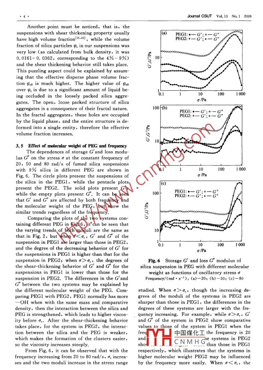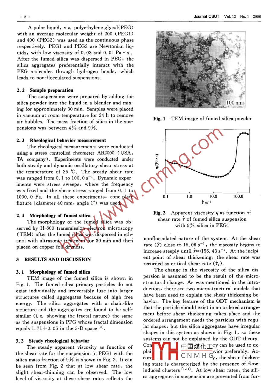 Vol.13 No. 1J. CENT. SOUTH UNIV. TECHNOL.Feb. 2006Article ID: 1005 - 9784(2006)01 - 0001 - 05Rheological behavior of fumed silica suspension in polyethylene glycolWU Qiu-mei(伍秋美) , RUAN Jian-ming(阮建明) ,HUANG Bai-yun(黃伯云),ZHOU Zhong -cheng(周忠誠), ZOU Jian- peng(鄒儉鵬)(State Key Laboratory of Powder Metallurgy, Central South University, Changsha 410083, China)Abstract: The rheological behavior of fumed silica suspensions in polyethylene glycol(PEGand oscillatory shear stress using AR 2000 stress controlled rheometer. The systems show reversible shear thicken-ing behavior and the shear-thickening behavior can be explained by the clustering mechanism. The viscosity and thedegree of shear thickening of the systems strongly depend on the mass fraction of the silica, the molecular weigh ofPEG and the frequency used in the rheological measurement. The silica volume fraction of the systems is 1. 16%-3. 62%, corresponding to the mass fraction of 4%- 9%. The shear thickening taking place in the low volume frac-tion may contribute to the fractal nature of the silica. At oscillatory shear stress, when the shear stress is less thanthe critical stress, the storage modulus decreases significantly, meanwhile the loss modulus and the complex viscosi-ty almost remain unchanged; when the shear stress is larger than the critical stress, the storage modulus, the lossmodulus and the complex viscosity increase with the increase of shear stress. The loss modulus is larger than thestorage modulus in the range of stress studied and both moduli depend on frequency.Key words : fumed silica suspension; polyethylene glycol; shear thickening; storage modulus; loss modulusCLC number: O648Document code: A1 INTRODUCTIONring is a more accurate and generalized model, withthe ODT being a possible concomitant effect inFumed silica is an extremely versatile materialmany cases C8;9].that can be used to modify the rheological behaviorSome researchers in USA and Singapore haveof systems. It can function as an effective thicken-used the shear thickening properties of silica sus-ing and thixotropic agent in low molecular weightpensions in ethylene glycol, polyethylene glycolsolvent. Several novel applications are being found(PEG) and water to make advanced body armorfor these suspensions, for example, gels of fumedmaterials[10-12]. These materials can offer equiva-silica in mineral or silicone oils are used as fillinglent ballistic performance of existing body armorcompounds in fiber-optic cables. Suspensions ofmaterials, but with significantly more compactnessfumed silica are being used as polymer electrolytesand flexibility. However, there is little informa-in rechargeable lithium batteries[2].tion on the rheological behavior of the silica sus-The rheological behavior of the silica suspen-pensions in PEG. In this paper, the controlledsion in different continuous fluid has been studiedstress rheometer was used to study the steady andbecause of their practical importance. Raghavan etoscillatory rheological behavior of the fumed silicaal[3], Leet al4], Maranzano et a1[5] did some re-suspensions in PEG.searches on the silica suspensions in polypropyleneglycol(PPG), water and tetrahydrofurfuryl alcohol2 EXPERIMENTAL(THFFA) by steady and oscillatory shear, andfound that the suspensions showed shear-thicken-2. 1 Materialsing behavior. Although two microstructure modelsThe fumed silica was Aerosil A200 (Degussahave been offered to explained the phenomena: oneCorporation). The fumed silica was prepared byis the order disorder transition(ODT) theory pres-the flame hydrolysis of silicon tetrachloride (SiCl)ented by Hoffmanl6, the other is clustering theoryin a flame of H2 and Oz. The particle diameter andbased on Stokesian dynamics simulations, thesurface area are respectively about 12 nm and 200shear-thicken state is due to the clustering of parti-m2/g. These particles fuse to irreversibly aggre-cles7],the microstructure mechanism for thegates because of high free energy and these aggre-shear-thickening still remains unresolved. Howev-gates are hydrophilic due to the presence of hy-er, there is an increasing indication that the clustedrox中國煤化工e sufacela.YHCNMHG①Foundation item: Project (50174059) supported by the National Natural Science Foundation of ChinaReceived date: 2005 -07- 20; Accepted date: 2005-10 -10Correspondence : WU Qiu mei, Doctoral candidate; Tel: + 86-731-8876644; E mail: wuqiumei20073@ sina. com. cnJournal CSUT Vol.13 No. 12006A polar liquid, viz. polyethylene glycol(PEG)with an average molecular weight of 200 (PEG1)and 400 (PEG2) was used as the continuous phaserespectively. PEG1 and PEG2 are Newtonian liq-uids, with low viscosity of 0. 03 and 0.01 Pa. s。After the fumed silica was dispersed in PEG,thesilica aggregates preferentially interact with thePEG molecules through hydrogen bonds, whichleads to non-flocculated suspensions.2.2 Sample preparationThe suspensions were prepared by adding thesilica powder into the liquid in a blender and mix-100 nming for approximately 30 min. Samples were placedin vacuum at room temperature for 24 h to removeFig. 1 TEM image of fumed silica powderair bubbles. The mass fraction of silica in the sus-pensions was between 4% and 9%.2.3 Rheological behavior measurement1The rheological measurements were conductedusing a stress controlled rheometer AR2000 ( USA:TA company). Experiments were conducted underboth steady and dynamic oscillatory shear stress atthe temperature of 25 C. The steady shear ratewas ranged from0. 1 to 100. 0s-'. Dynamic exper-iments were stress sweeps, where the frequencywas fixed and the shear stress ranged from 0. 1 to1000. 0 Pa. In all these experiments, cone plate0.11.00.0100.0fixture (diameter 40 mm, angle 1°) was used.i/s!Fig.2 Apparent viscosity η as function of2.4 Morphology of fumed silicashear rate i of fumed silica suspensionThe morphology of the fumed silica was ob-with 9% silica in PEG1served by H-800 transmission el