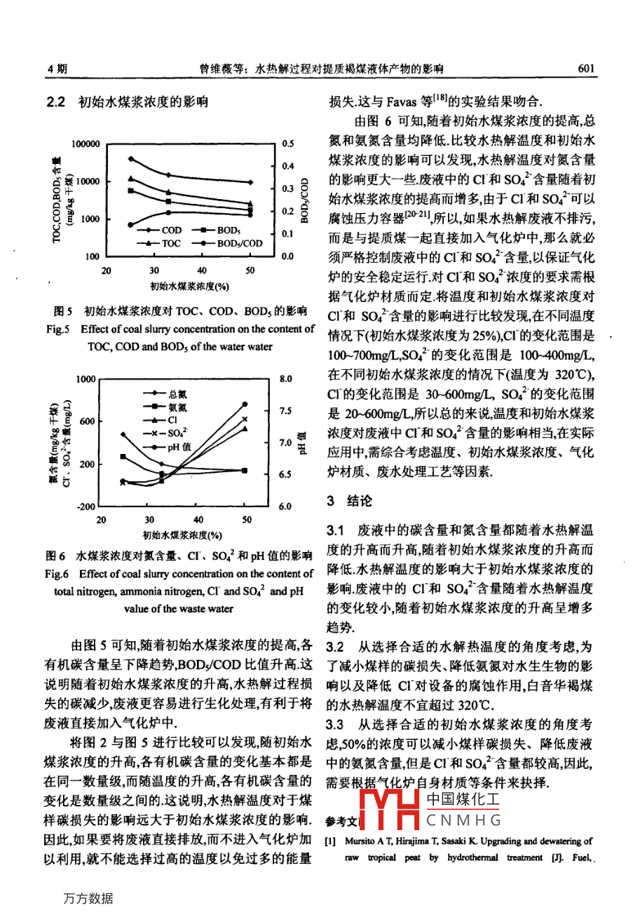 中國環(huán)境科學2012.32(4):598602China Environmeental Science水熱解過程對提質(zhì)褐煤液體產(chǎn)物的影響曾維薇,張建勝;趙勇(清華大學熱能工程系熱科學與動力工程教育部重點實驗室北京10008搞要:對來自內(nèi)蒙古的白音華褐煤進行了一系列水熱解實驗分析不同溫度和初始水煤漿濃度對水熱解產(chǎn)物過濾出的液體的影響分析了液體中TOC、cOD、BOD3、總氮、氨氮、C1、SO2的含量以及溶液的pH值結(jié)果顯示水熱解溫度對于廢液中的碳和氮含量彩響較大水熱解溫度從200℃增加到350℃時水熱解溫度的升高碳和氮分別增加了20多倍和30多倍;初始水煤漿濃度對C和SO42的含量影響較大隨著初始水煤漿濃度的升高C1和SO42逐漸增多水熱解溫度應(yīng)低于350℃,初始水煤漿濃度應(yīng)綜合考慮設(shè)備材質(zhì)來選擇關(guān)鍵詞:水熱解;褐煤;提質(zhì);廢液中田分類號:X705文獻標識碼:A文章編號:10006923(2012)04-05980Effect of processing conditions on organics and inorganics in wastewater during hydrothermal treatment of alow-rank coal. ZENG Wei-wei, ZHANG Jian-sheng, ZHAO Yong(Key Laboratory for Thermal Science and PowerEngineering of Ministry of Education, Department of Thermal Engineering, Tsinghua University, Beijing 100084, China).China Environmental Science, 2012, 32(4): 598-602Abstract: A series of hydrothermal treatment experiments for Bai-lnhua lignite from inner Mongolia were conducted inthis article. The effect of processing temperature and coal slurry concentration were studied by measuring TOC, COD,BOD, total nitrogen, ammonia nitrogen, Cl, So and ph value of the waste water after hydrothermal treatment. Theprocessing temperature had a significant effect on the carbon and nitrogen content in the wastewater, as the processingtemperature increases from 200C to 350C, the carbon and the nitrogen content increase more than 20 times and 30 timesseparately. The slurry concentration had a significant effect on the Cr and So. content in the wastewater, whichincreased with the increasing coal slurry concentration. The processing temperature shall be lower than 350 C, and thecoal slurry concentration shall be identified with the consideration of the equipment materialKey words: hydrothermal dewatering: low-rank coal; upgrading: wastewater低階煤水熱解過程不僅可以去掉煤中大量TOC、COD、CI、SO42、BOD和pH值旨在的水分而且可以改變煤的化學組成和化學結(jié)構(gòu),充分認清廢水的污染情況從而為廢水的利用方將煤提升為煤化程度更高的煤但在水熱解過式(排污處理或直接制漿)提供理論依據(jù)并對非程中,少量的煤會分解會有少量有機物和無機物蒸發(fā)干燥脫水工藝做出合理評價進入到溶液中,充分認清廢水中物質(zhì)的成分和濃度對于評價各類脫水工藝非常必要.小試規(guī)模的1材料與方法維多利亞褐煤水熱解干燥工藝廢水中總有機碳1.1材料(TOC)含量為0307g,中試規(guī)模的廢水中實驗煤樣來為自內(nèi)蒙古的白音華褐煤煤的TOC含量為1.32g,而且隨著水熱解溫度的升工業(yè)分析和元素分析如表1所示由表1可以看高廢水中有機物濃度升高出,白音華褐煤的水分、灰分、揮發(fā)分以及氧含關(guān)于水熱解液體產(chǎn)物中有機物的分析大多量都中國煤化工局限于TOC6,而對于COD和BOD5以及水體12中的氮含量研究甚少本研究對來自內(nèi)蒙古的白CNMHG收稿日音華褐煤進行了不同溫度和不同初始水煤漿濃蕃金項目:國家“863″項目(209A05216度的水熱解實驗研究分析了廢液中總氮、氨氮、·責任作者,教投,hanish@tsinghua.edu.cn4期曾維嶶等:水熱解過程對提質(zhì)褐煤液體產(chǎn)物的影響表1原煤工業(yè)分析和發(fā)熱量分析Table 1 Raw coal proximate analysis and ultimate analysisM(wt%, dbA(wt%, d b)V(wt%, d, b)FC(wt%, d b)HHⅤ( MJ/kg, db)工業(yè)分析o(wt%, db)元素分析H(wt%, d b)N(wt%, d b) S(wt%, d b)57.74注:M為水分;A為灰分;V為揮發(fā)分;FC為固定碳江HⅣ為高位熱值;db為干基實驗系統(tǒng)如圖1所示包括3L的不銹鋼反應(yīng)析其TOC、COD、BOD5、總氮、氨氮、CI、釜(TFCF3-20)、控制器和N2氣瓶反應(yīng)釜攪拌器SO2的含量和pH值的冷卻水來自循環(huán)冷卻水系統(tǒng)水熱解實驗在3L實驗工況如表2所示當溫度高于150℃時,的不銹鋼反應(yīng)釜中進行反應(yīng)釜最高壓力為煤中親水的含氧官能團開始發(fā)生分解,所以褐20MPa最高溫度450℃反應(yīng)釜裝有一支熱電偶,煤脫水提質(zhì)過程所選溫度一般為200400c為了保證攪拌器正常運行不至于過熱在整個實本實驗所選溫度為200,250,280,300,320,350℃,驗過程中循環(huán)水箱連續(xù)工作直至反應(yīng)釜冷卻至壓力均略高于對應(yīng)溫度下的飽和蒸汽壓在進行室溫冷卻水系統(tǒng)只在反應(yīng)結(jié)束后反應(yīng)釜冷卻階不同溫度實驗時加入的水煤漿濃度為25%(煤水段啟動比1:3),干煤量200g由于氣化所用的水煤漿濃度大約為50%70%如果選用煤水比1:3進行脫水處理,那么煤漿在經(jīng)過脫水處理之后還需要除掉HO出Ho進部分水分才能加入到氣化爐中氣化所以本實驗考慮增大煤漿濃度,測試不同初始水煤漿濃度對廢液的影響因此選用了初始水煤漿濃度為1:11:2、1:3共3個工況來研究初始水煤漿濃度與液體產(chǎn)物的關(guān)系表2實驗工況壓力、鬣下出料Table 2 Experimental conditions反應(yīng)董溫度(℃)壓力MPa)裝料量(干煤+水)氣氛圖1實驗系統(tǒng)示意20000g+60mLFig 1 Schematic drawing of the experimental system200g+600mLn2200g+600mLN2為使煤樣粒徑分布均勻,首先將原煤研磨至200g+600mLN2粒徑小于0