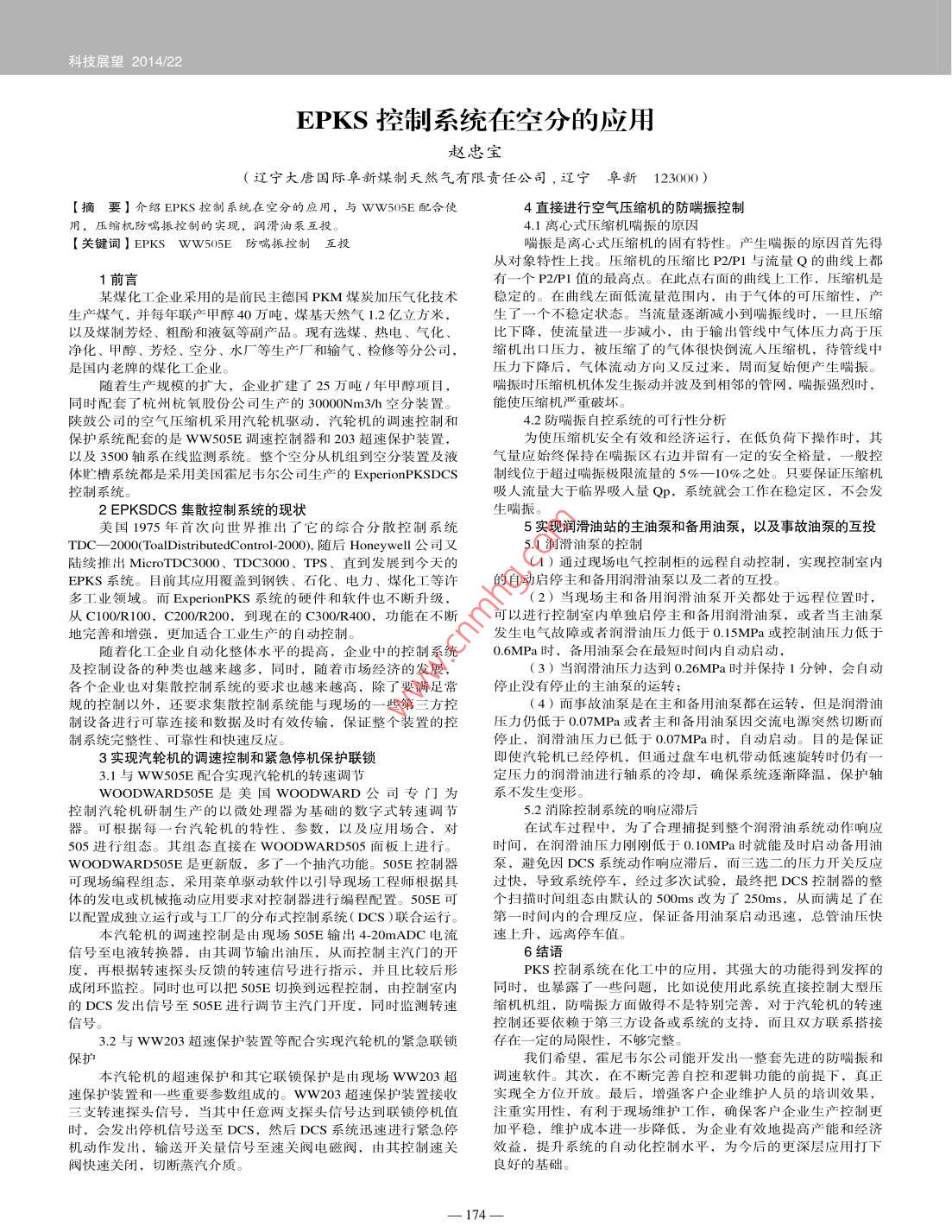 科技展望2014/22EPKS控制系統(tǒng)在空分的應(yīng)用趙忠寶(遼寧大唐國(guó)際阜新煤制天然氣有限責(zé)任公司,遼寧阜新123000)【摘要】介紹EPKS控制系統(tǒng)在空分的應(yīng)用,與WW505E配合使4直接進(jìn)行空氣壓縮機(jī)的防喘振控制用,壓縮機(jī)防喘振控制的實(shí)現(xiàn),潤(rùn)滑油泵互投4.1離心式壓縮機(jī)喘振的原因【關(guān)鍵詞】 EPKS WW55E防喘振控制互投喘振是離心式壓縮機(jī)的固有特性。產(chǎn)生喘振的原因首先得從對(duì)象特性上找。壓縮機(jī)的壓縮比P2/P1與流量Q的曲線上都1前言有一個(gè)P2/P1值的最高點(diǎn)。在此點(diǎn)右面的曲線上工作,壓縮機(jī)是某煤化工企業(yè)采用的是前民主德國(guó)PKM煤炭加壓氣化技術(shù)穩(wěn)定的。在曲線左面低流量范圍內(nèi),由于氣體的可壓縮性,產(chǎn)上產(chǎn)煤氣,并每年聯(lián)產(chǎn)甲醇40萬(wàn)噸,煤基天然氣1.2億立方米生了一個(gè)不穩(wěn)定狀態(tài)。當(dāng)流量逐漸減小到喘振線時(shí),一旦壓縮以及煤制芳烴、粗酚和液氨等副產(chǎn)品?,F(xiàn)有選煤、熱電、氣化比下降,使流量進(jìn)一步減小,由于輸出管線中氣體壓力高于壓凈化、甲醇、芳烴、空分、水廠等生產(chǎn)廠和輸氣、檢修等分公司,縮機(jī)出口壓力,被壓縮了的氣體很快倒流入壓縮機(jī),待管線中是國(guó)內(nèi)老牌的煤化工企業(yè)。壓力下降后,氣體流動(dòng)方向又反過(guò)來(lái),周而復(fù)始便產(chǎn)生喘振隨著生產(chǎn)規(guī)模的擴(kuò)大,企業(yè)擴(kuò)建了25萬(wàn)噸/年甲醇項(xiàng)目喘振時(shí)壓縮機(jī)機(jī)體發(fā)生振動(dòng)并波及到相鄰的管網(wǎng),喘振強(qiáng)烈時(shí),同時(shí)配套了杭州杭氧股份公司生產(chǎn)的30000Nm3/h空分裝置能使壓縮機(jī)嚴(yán)重破壞。陜鼓公司的空氣壓縮機(jī)采用汽輪機(jī)驅(qū)動(dòng),汽輪機(jī)的調(diào)速控制和4.2防喘振自控系統(tǒng)的可行性分析保護(hù)系統(tǒng)配套的是wW505E調(diào)速控制器和203超速保護(hù)裝置,為使壓縮機(jī)安全有效和經(jīng)濟(jì)運(yùn)行,在低負(fù)荷下操作時(shí),其以及3500軸系在線監(jiān)測(cè)系統(tǒng)。整個(gè)空分從機(jī)組到空分裝置及液氣量應(yīng)始終保持在喘振區(qū)右邊并留有一定的安全裕量,一般扌體貯槽系統(tǒng)都是采用美國(guó)霍尼韋爾公司生產(chǎn)的 ExperionPKSDCS制線位于超過(guò)喘振極限流量的5%—10%之處。只要保證壓縮機(jī)控制系統(tǒng)吸人流量大于臨界吸人量p,系統(tǒng)就會(huì)工作在穩(wěn)定區(qū),不會(huì)發(fā)2 EPKSDCS集散控制系統(tǒng)的現(xiàn)狀生喘振。美國(guó)1975年首次向世界推出了它的綜合分散控制系統(tǒng)5實(shí)現(xiàn)潤(rùn)滑油站的主油泵和備用油泵,以及事故油泵的互投TDC-2000 oalDistributedControl-2000,隨后 Honeywell公司又5.1潤(rùn)滑油泵的控制陸續(xù)推出 MiCrotEc3000、TDC3000、TPS、直到發(fā)展到今天的(1)通過(guò)現(xiàn)場(chǎng)電氣控制柜的遠(yuǎn)程自動(dòng)控制,實(shí)現(xiàn)控制室內(nèi)EPKS系統(tǒng)。目前其應(yīng)用覆蓋到鋼鐵、石化、電力、煤化工等許的自動(dòng)啟停主和備用潤(rùn)滑油泵以及二者的互投多工業(yè)領(lǐng)域。而 ExperionPKS系統(tǒng)的硬件和軟件也不斷升級(jí)(2)當(dāng)現(xiàn)場(chǎng)主和備用潤(rùn)滑油泵開(kāi)關(guān)都處于遠(yuǎn)程位置時(shí)從C100R100,C200/R200,到現(xiàn)在的C30/R400,功能在不斷可以進(jìn)行控制室內(nèi)單獨(dú)啟停主和備用潤(rùn)滑油泵,或者當(dāng)主油泵地完善和增強(qiáng),更加適合工業(yè)生產(chǎn)的自動(dòng)控制。發(fā)生電氣故障或者潤(rùn)滑油壓力低于0.I5MPa或控制油壓力低于隨著化工企業(yè)自動(dòng)化整體水平的提高,企業(yè)中的控制系統(tǒng)06MPa時(shí),備用油泵會(huì)在最短時(shí)間內(nèi)自動(dòng)啟動(dòng)及控制設(shè)備的種類(lèi)也越來(lái)越多,同時(shí),隨著市場(chǎng)經(jīng)濟(jì)的發(fā)展(3)當(dāng)潤(rùn)滑油壓力達(dá)到0.26MPa時(shí)并保持1分鐘,會(huì)自動(dòng)各個(gè)企業(yè)也對(duì)集散控制系統(tǒng)的要求也越來(lái)越高,除了要滿足常停止沒(méi)有停止的主油泵的運(yùn)轉(zhuǎn)規(guī)的控制以外,還要求集散控制系統(tǒng)能與現(xiàn)場(chǎng)的一些第三方控4)而事故油泵是在主和備用油泵都在運(yùn)轉(zhuǎn),但是潤(rùn)滑油制設(shè)備進(jìn)行可靠連接和數(shù)據(jù)及時(shí)有效傳輸,保證整個(gè)裝置的控壓力仍低于007MPa或者主和備用油泵因交流電源突然切斷而制系統(tǒng)完整性、可靠性和快速反應(yīng)停止,潤(rùn)滑油壓力已低于0.07MPa時(shí),自動(dòng)啟動(dòng)。目的是保證3實(shí)現(xiàn)汽輪機(jī)的調(diào)速控制和緊急停機(jī)保護(hù)聯(lián)鎖即使汽輪機(jī)已經(jīng)停機(jī),但通過(guò)盤(pán)車(chē)電機(jī)帶動(dòng)低速旋轉(zhuǎn)時(shí)仍有3.1與Ww505E配合實(shí)現(xiàn)汽輪機(jī)的轉(zhuǎn)速調(diào)節(jié)定壓力的潤(rùn)滑油進(jìn)行軸系的冷卻,確保系統(tǒng)逐漸降溫,保護(hù)軸WOODWARD505E是美國(guó) WOODWARD公司專(zhuān)系不發(fā)生變形控制汽輪機(jī)硏制生產(chǎn)的以微處理器為基礎(chǔ)的數(shù)宇式轉(zhuǎn)速調(diào)節(jié)52消除控制系統(tǒng)的響應(yīng)滯后器??筛鶕?jù)每一臺(tái)汽輪機(j