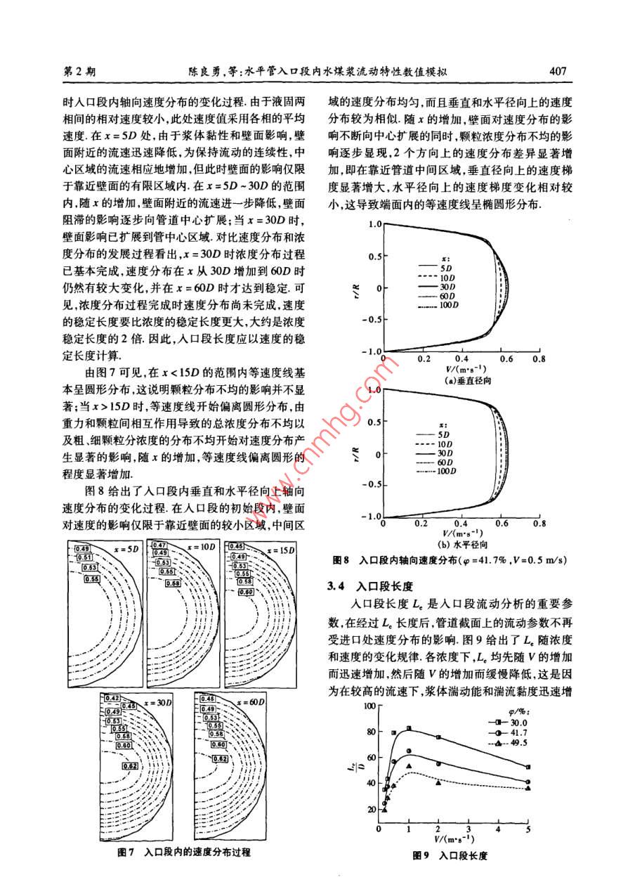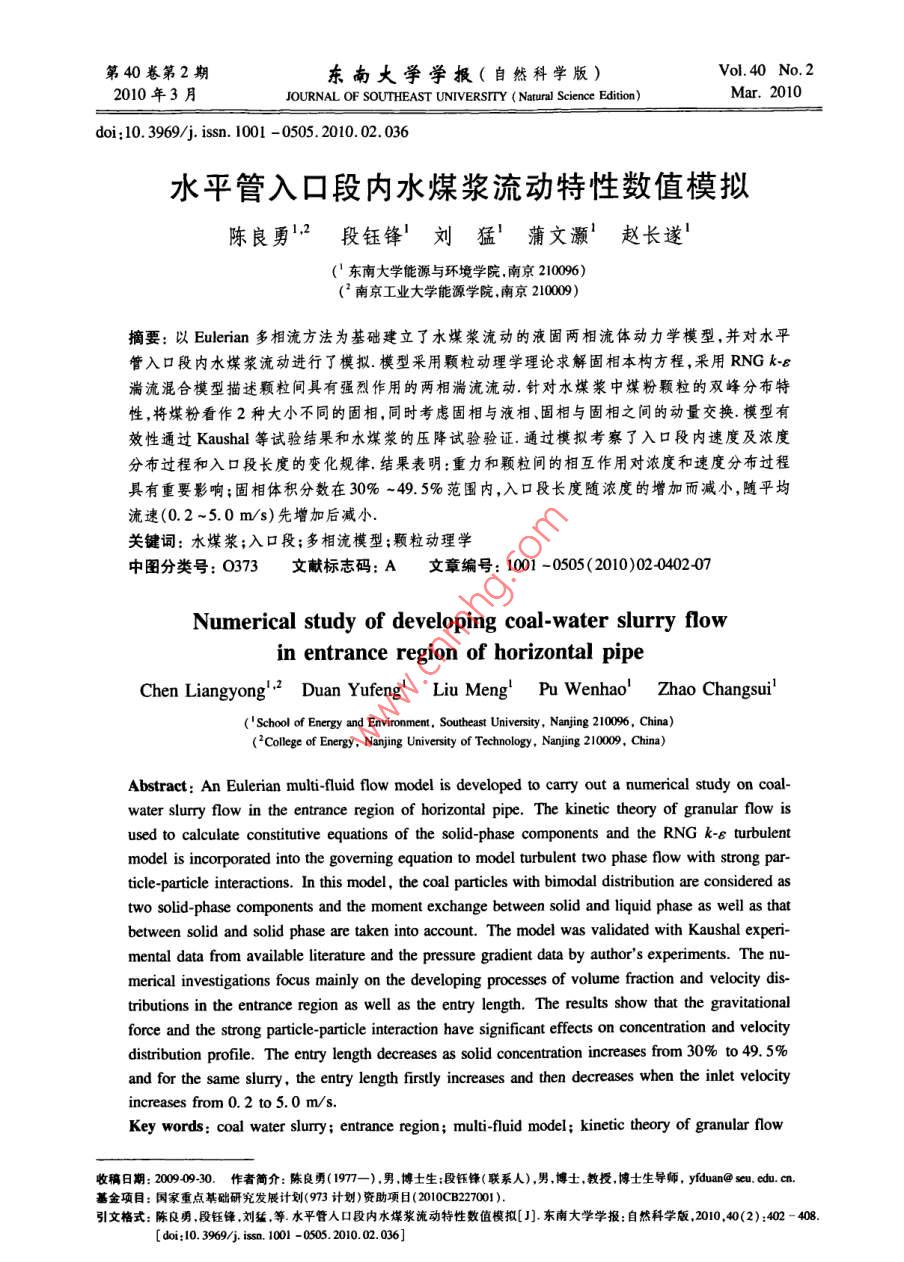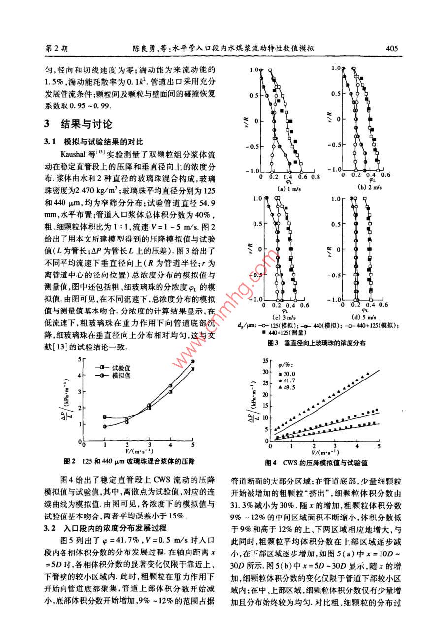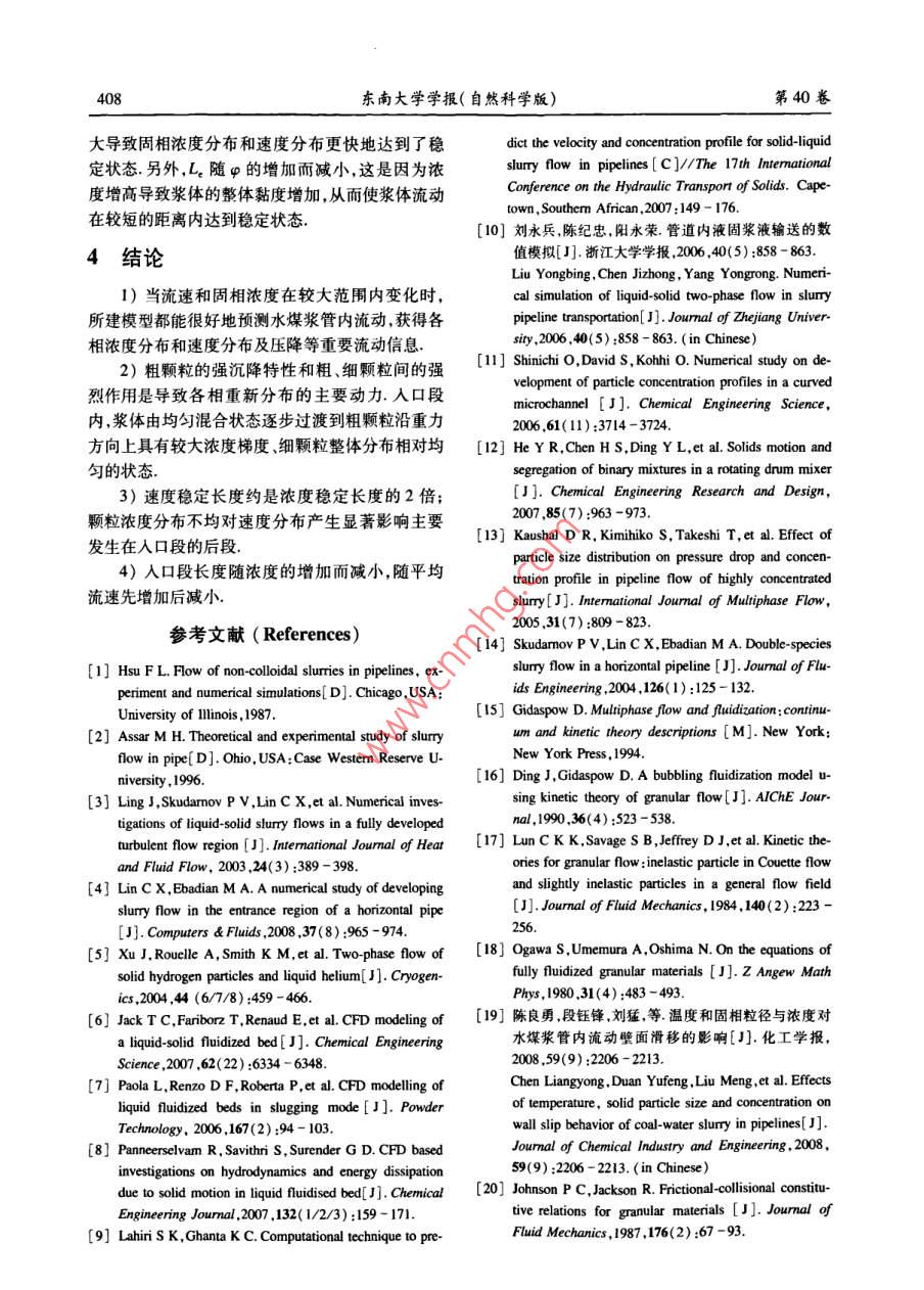 第40卷第2期東南大學(xué)學(xué)報(自然科學(xué)版)Vol 40 No. 22010年3月JOURNAL OF SOUTHEAST UNIVERSITY( Natural Science Edition)Mar.2010doi;10.3969/ 1. Issn.l001-0505.2010.02.036水平管入口段內(nèi)水煤漿流動特性數(shù)值模擬陳良勇12段鈺鋒!劉猛!蒲文灝!趙長遂(東南大學(xué)能源與環(huán)境學(xué)院南京210096)(2南京工業(yè)大學(xué)能源學(xué)院南京2100摘要:以 Eulerian多相流方法為基礎(chǔ)建立了水煤漿流動的液圊兩相流體動力學(xué)模型,并對水平管入口段內(nèi)水煤漿流動進(jìn)行了模擬.模型采用顆粒動理學(xué)理論求解固相本枃方程,釆用RNGk-ε湍流混合模型描述顆粒間具有強烈作用的兩相湍流流動.針對水煤漿中煤粉顆粒的雙峰分布特性,將煤粉看作2種大小不同的固相,同時考慮固相與液相、固相與固相之間的動量交換模型有效性通過 Kaushal等試驗結(jié)果和水煤漿的壓降試驗驗證,通過模擬考察了入口段內(nèi)速度及濃度分布過程和入口段長度的變化規(guī)律,結(jié)果表明:重力和顆粒間的相互作用對濃度和速度分布過程具有重要影響;固相體積分?jǐn)?shù)在30%-49.5%范圍內(nèi),入口段長度隨濃度的增加而減小,隨平均流速(0.2~5.0m/s)先增加后減小關(guān)鍵詞:水煤漿;入口段;多相流模型;顆粒動理學(xué)中圖分類號:O373文獻(xiàn)標(biāo)志碼:A文章編號:1001-0505(2010)02040207Numerical study of developing coal-water slurry flown entrance region of horizontal pipeChen Liangyong", 2 Duan Yufeng Liu Meng Pu Wenhao Zhao Changsui(School of Energ(College of Energy, Nanjing University of Technology, Nanjing 210009, China)Abstract: An Eulerian multi- fluid flow model is developed to carry out a numerical study on coalwater slurry flow in the entrance region of horizontal pipe. The kinetic theory of granular flow isused to calculate constitutive equations of the solid-phase components and the rng - turbulentmodel is incorporated into the governing equation to model turbulent two phase flow with strong par-ticle-particle interactions. In this model, the coal particles with bimodal distribution are consideredtwo solid-phase components and the moment exchange between solid and liquid phase as well as thatbetween solid and solid phase are taken into account. The model was validated with Kaushal experi-mental data from available literature and the pressure gradient data by author's experiments. The nu-merical investigations focus mainly on the developing processes of volume fraction and velocity dis-tributions in the entrance region as well as the entry length. The results show that the gravitationalforce and the strong particle-particle interaction have significant effects on concentration and velocitydistribution profile. The entry length decreases as solid concentration increases from 30% to 49.5%and for the same slurry, the entry length firstly increases and then decreases when the inlet velocityincreases from 0. 2 to 5.0 msKey words: coal water slurry: entrance region; multi-fluid model; kinetic theory of granular flow收稿日期:2000930.作者簡介:陳良勇(1977-)男博士生:段鈺鋒(聯(lián)系人)男博士教授博士生導(dǎo)師, yidun@seu.cd.cm基金項目:國家重點基礎(chǔ)研究發(fā)展計劃(973計劃)資助項日(2010CB227001)引文格式:陳良勇段鈺鋒劉猛,等水平管人口段內(nèi)水煤漿流動特性數(shù)值模擬[J]東南大學(xué)學(xué)報:自然科學(xué)版,2010,40(2):402-408[doi:0.3969/j,isn.1001-0505第2期良勇,等:水平管入口段內(nèi)水煤漿流動特性數(shù)值模擬水煤漿(CwS)管道輸送技術(shù)是實現(xiàn)大規(guī)模高雙顆粒組分漿體流動的試驗結(jié)果1,但所提供效煤氣化技術(shù)或CwS燃燒技術(shù)集成的關(guān)鍵組成的流動信息僅限于管道阻力損失,另外,尚無文獻(xiàn)部分之一.目前,由于測量技術(shù)的限制和液-固兩相報道雙顆粒成分漿體在管道入口段內(nèi)流動規(guī)律基流動的復(fù)雜性,除阻力損失外,對CwS這類高濃于以上分析,本文以 Eulerian方法和KTGF理論為度漿體的流動測量十分困難流體動力學(xué)建模方法基礎(chǔ)建立cws流動的液-固兩相流體動力學(xué)模是獲得漿體內(nèi)部全面流動信息的有效替代方法,可型,采用RNGkε湍流模型描述液-固兩相湍流流為管道輸送系統(tǒng)的設(shè)計和運行參數(shù)的優(yōu)化提供動;將煤粉(雙峰分布)看作大小不同的2種固相參考同時考慮固相與液相、固相與固相之間的動量交在高濃度漿體流動的研究中, Eulerian方法為換模型的有效性通過文獻(xiàn)[13]的測量數(shù)據(jù)和描述液-固兩相流動特性提供了合理的框架,不但Cws壓降試驗數(shù)據(jù)驗證;基于CwS實際流動工況可以全面地考慮液相顆粒相和壁面之間的相互作進(jìn)行模擬,重點考察入口段內(nèi)速度及濃度分布過程用,而且可以在動力學(xué)規(guī)律上描述各相內(nèi)部的動力和入口段長度的變化規(guī)律學(xué)性質(zhì),固相還可以考慮碰撞與摩擦,基于 Euleri-an方法Hsu"建立了適用于非膠體特性漿體的多1數(shù)學(xué)模型相流模型,其中考慮了固相對液相湍流的影響As1.1基本守恒方程sar(2基于各相的動量守恒方程和濃度的對流擴散連續(xù)方程方程,建立了高濃度液固兩相流動模型作為Eulev·(apr)=0rian模型的簡化形式,混合模型( mixture model)廣1,2(1b)泛用于預(yù)測漿體流動壓降濃度和速度分布3動量方程其中引入代數(shù)滑移方程描述液固兩相的相對運動·(apHr·)=-arVp+V模擬計算只需求解混合相的連續(xù)方程、動量方程以及顆粒相的體積分?jǐn)?shù)方程,可直接引入湍流模