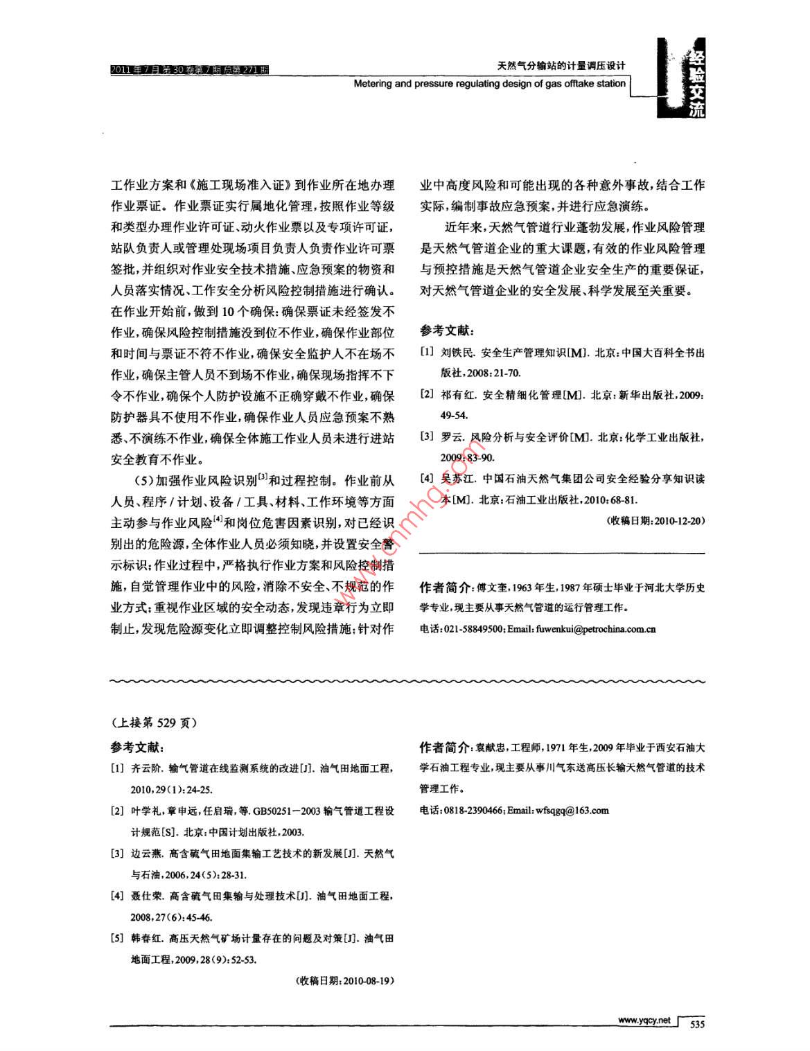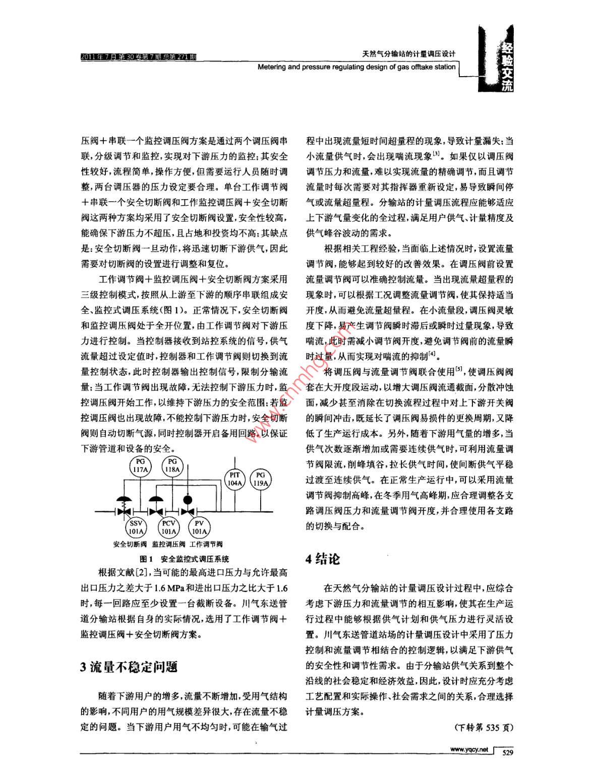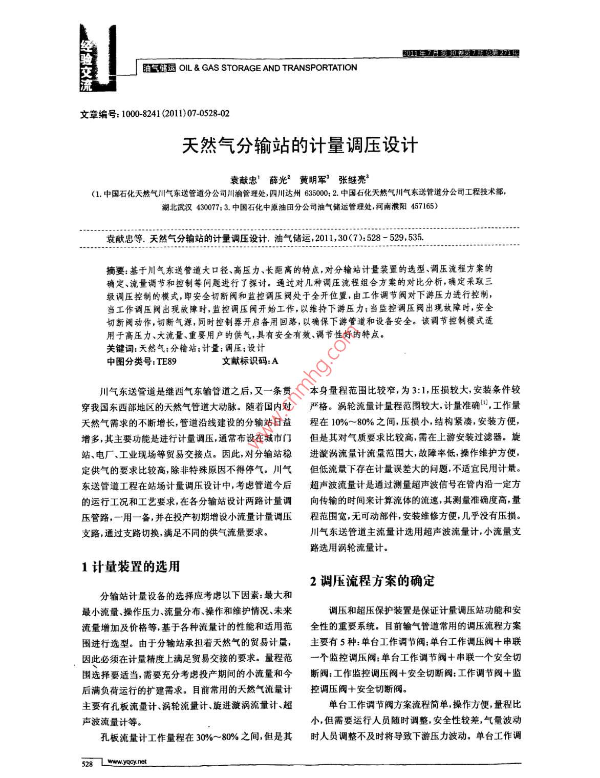 01年7第罰成2交迪氣儲(chǔ)運(yùn)OL& GAS STORAGE AND TRANSPORTATION文章編號(hào):10008241(2011)07-0528-02天然氣分輸站的計(jì)量調(diào)壓設(shè)計(jì)袁獻(xiàn)忠'薛光2黃明軍3張繼亮(1.中國(guó)石化天然氣川氣東送管道分公司川渝管理處四川達(dá)州635002中國(guó)石化天然氣川氣東送管道分公司工程技術(shù)部湖北武漢430077:3.中國(guó)石化中原油田分公司油氣儲(chǔ)運(yùn)管理處河南濮陽457165)+袁獻(xiàn)忠等.天然氣分輸站的計(jì)量調(diào)壓設(shè)計(jì).油氣儲(chǔ)運(yùn),2011,30(7):528-529,535摘要:基于川氣東送管道大口徑、高壓力、長(zhǎng)距離的特點(diǎn),對(duì)分輸站計(jì)量裝置的選型、調(diào)壓流程方案的確定、流量調(diào)節(jié)和控制等問題進(jìn)行了探討。通過對(duì)幾種調(diào)壓流程組合方案的對(duì)比分析,確定釆取三級(jí)調(diào)壓控制的模式,即安全切斷閥和監(jiān)控調(diào)壓閥處于全開位置,由工作調(diào)節(jié)閥對(duì)下游壓力進(jìn)行控制當(dāng)工作調(diào)壓閥出現(xiàn)故障時(shí),監(jiān)控調(diào)壓閥開始工作,以維持下游壓力;當(dāng)監(jiān)控調(diào)壓閥出現(xiàn)故障時(shí),安全切斷閥動(dòng)作,切斷氣源,同時(shí)控制器開啟備用回路,以確保下游管道和設(shè)備安全。該調(diào)節(jié)控制模式適用于高壓力、大流量、重要用戶的供氣,具有安全有效、調(diào)節(jié)性好的特點(diǎn)。關(guān)鍵詞:天然氣;分輸站;計(jì)量:調(diào)壓:設(shè)計(jì)中圖分類號(hào):TE89文獻(xiàn)標(biāo)識(shí)碼:A川氣東送管道是繼西氣東輸管道之后又一條貫本身量程范圍比較窄,為3:1,壓損較大,安裝條件較穿我國(guó)東西部地區(qū)的天然氣管道大動(dòng)脈。隨著國(guó)內(nèi)對(duì)嚴(yán)格。渦輪流量計(jì)量程范圍較大,計(jì)量準(zhǔn)確,工作量夭然氣需求的不斷增長(zhǎng),管道沿線建設(shè)的分輸站日益程在10%~80%之間,壓損小結(jié)構(gòu)緊湊,安裝方便,增多,其主要功能是進(jìn)行計(jì)量調(diào)壓通常布設(shè)在城市門但是其對(duì)氣質(zhì)要求比較高需在上游安裝過濾器。旋站、電廠、工業(yè)現(xiàn)場(chǎng)等貿(mào)易交接點(diǎn)。因此,對(duì)分輸站穩(wěn)進(jìn)漩渦流量計(jì)流量范圍大,故障率低操作維護(hù)方便,定供氣的要求比較高除非特殊原因不得停氣。川氣但低流量下存在計(jì)量誤差大的問題不適宜民用計(jì)量。東送管道工程在站場(chǎng)計(jì)量調(diào)壓設(shè)計(jì)中,考慮管道今后超聲波流量計(jì)是通過測(cè)量超聲波信號(hào)在管內(nèi)沿一定方的運(yùn)行工況和工藝要求在各分輸站設(shè)計(jì)兩路計(jì)量調(diào)向傳輸?shù)臅r(shí)間來計(jì)算流體的流速其測(cè)量準(zhǔn)確度高量壓管路,一用一備,并在投產(chǎn)初期增設(shè)小流量計(jì)量調(diào)壓程范圍寬無可動(dòng)部件,安裝維修方便,幾乎沒有壓損支路,通過支路切換滿足不同的供氣流量要求。川氣東送管道主流量計(jì)選用超聲波流量計(jì),小流量支路選用渦輪流量計(jì)1計(jì)量裝置的選用2調(diào)壓流程方案的確定分輸站計(jì)量設(shè)備的選擇應(yīng)考慮以下因素:最大和最小流量操作壓力流量分布操作和維護(hù)情況、未來調(diào)壓和超壓保護(hù)裝置是保證計(jì)量調(diào)壓站功能和安流量增加及價(jià)格等,基于各種流量計(jì)的性能和適用范全性的重要系統(tǒng)。目前輸氣管道常用的調(diào)壓流程方案圍進(jìn)行選型。由于分輸站承擔(dān)著天然氣的貿(mào)易計(jì)量,主要有5種:單臺(tái)工作調(diào)節(jié)閥;單臺(tái)工作調(diào)壓閥+串聯(lián)因此必須在計(jì)量精度上滿足貿(mào)易交接的要求。量程范個(gè)監(jiān)控調(diào)壓閥:單臺(tái)工作調(diào)節(jié)閥+串聯(lián)一個(gè)安全切圍選擇要適當(dāng),需要充分考慮投產(chǎn)期間的小流量和今斷閥:工作監(jiān)控調(diào)壓閥十安全切斷閥:工作調(diào)節(jié)閥十監(jiān)后滿負(fù)荷運(yùn)行的擴(kuò)建需求。目前常用的天然氣流量計(jì)控調(diào)壓閥+安全切斷閥主要有孔板流量計(jì)、渦輪流量計(jì)、旋進(jìn)漩渦流量計(jì)、超單臺(tái)工作調(diào)節(jié)閥方案流程簡(jiǎn)單操作方便,量程比聲波流量計(jì)等。小,但需要運(yùn)行人員隨時(shí)調(diào)整,安全性較差,氣量波動(dòng)孔板流量計(jì)工作量程在30%~80%之間,但是其時(shí)人員調(diào)整不及時(shí)將導(dǎo)致下游壓力波動(dòng)。單臺(tái)工作調(diào)28lwww.yqcy.ne201年7月307期2刀1睚天然氣分輸站的計(jì)量調(diào)壓設(shè)計(jì)Metering and pressure regulating design of gas offtake station交流壓閥+串聯(lián)一個(gè)監(jiān)控調(diào)壓閥方案是通過兩個(gè)調(diào)壓閥串程中出現(xiàn)流量短時(shí)間超量程的現(xiàn)象,導(dǎo)致計(jì)量漏失;當(dāng)聯(lián),分級(jí)調(diào)節(jié)和監(jiān)控,實(shí)現(xiàn)對(duì)下游壓力的監(jiān)控;其安全小流量供氣時(shí),會(huì)出現(xiàn)喘流現(xiàn)象國(guó)。如果僅以調(diào)壓閥性較好,流程簡(jiǎn)單,操作方便,但需要運(yùn)行人員隨時(shí)調(diào)調(diào)節(jié)壓力和流量難以實(shí)現(xiàn)流量的精確調(diào)節(jié),而且調(diào)節(jié)整,兩臺(tái)調(diào)壓器的壓力設(shè)定要合理。單臺(tái)工作調(diào)節(jié)閥流量