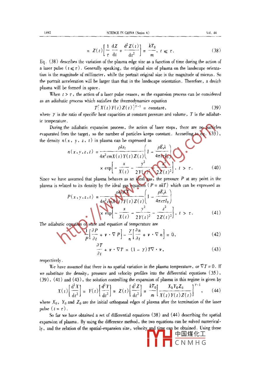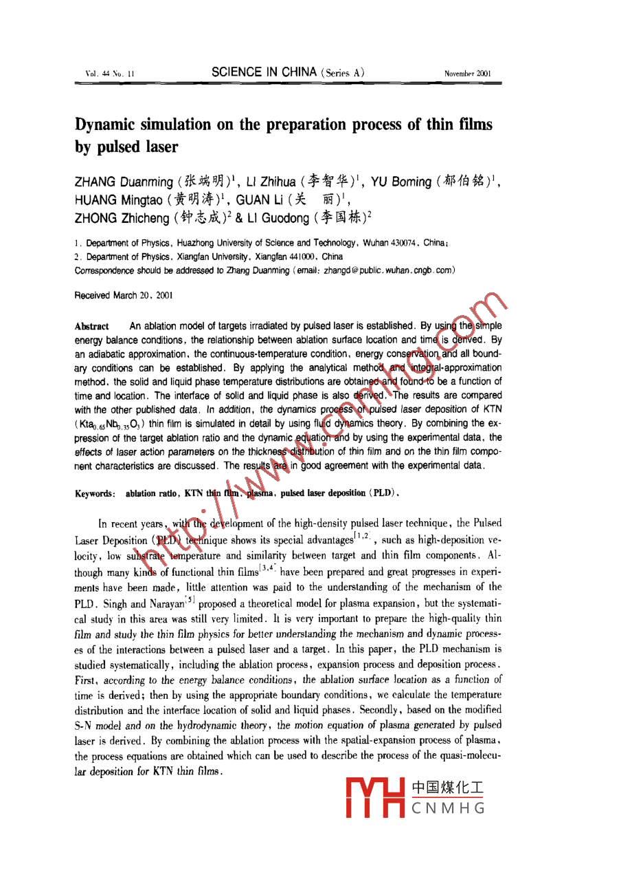 Vvol. 44 Sio. 11 .SCIENCE IN CHINA (Series A)Novenber 2001Dynamic simulation on the preparation process of thin filmsby pulsed laserZHANG Duanming (張端明), LI Zhihua (李智華)', YU Boming (郁伯銘)',HUANG Mingtao (黃明濤)', GUANLi(關(guān)麗)',ZHONG Zhicheng (鐘志成)2 & L Guodong (李國棟)=1. Depatment of Physics, Huazhong University of Science and Technology, Wuhan 430074. China;2. Departnent of Physics. Xiangfan Universily. Xiangfan 410000 ChinaCorespondence should be adresed to Zhang Duanming ( email: zhangd @ public. wuhan. cngb. com)Received March 20, 2001AbstractAn ablation model of targets iradiated by pulsed laser is established. By using the simpleenergy balance conditins, the relationship between ablation surface location and time is derived. Byan adiabatic approximation, the continuous-temperature condition, energy conservation and all bound-ary conditions can be established. By applying the analytical method and integral-. approximationmethod, the solid and liquid phase temperature distributions are obtained and found to be a function oftime and location. The interface of solid and liquid phase is also derived. The results are comparedwith the other published data. In additin, the dynamics process of pulsed laser deposition of KTN(Kta. sNb, xsO,) thin fim is simulated in detail by using fluid dynamics theory. By combining the ex-pression of the target ablation ratio and the dynamic equation and by using the experimental data, theeffects of laser action parameters on the thickness distrbution of thin film and on the thin film compo-nent characterstics are discussed. The results are in good agreement with the experimental data.Keywords: ablation ratio, KTN thin flm, plasma. pulsed laser deposition (PLD).In recent years,with the development of the high-density pulsed laser technique, the PulsedLaser Deposition (PLD) technigue shows its special advantages,2. ,such as high-deposition ve-locity, low substrate temperature and similarity between target and thin flm components. Although many kinds of functional thin flms'. . have been prepared and great progresses in experi-menls have been made, lttle attention was paid to the understanding of the mechanism of thePLD. Singh and Narayan'SI proposed a theoretical model for plasma expansion, but the systemati-cal study in this area was still very limited. lIt is very important 10 prepare the high-quality thinfilm and study the thin flm physics for better understanding the mechanism and dynamie process-es of the interactions between a pulsed laser and a target. In this paper, the PLD mechanism isstudied systematically ,including the ablation process , expansion process and deposition process .First, according to the energy balance conditions, the ablation surface Jocation as a function oftime is derived; then by using the appropriate boundary conditions , we calculate the temperaturedistribution and the interface location of solid and liquid phases . Secondly, based on the modifiedS-N model and on the hydrodynamie theory, the motion equation of plasma generated by pulsedlaser is derived. By combining the ablation process with the spatial-expansion process of plasma,the process equations are obtained which can be used to describe the process of the quasi- molecu-lar deposition for KTN thin films .中國煤化工MYHCNMHG1486SCIENCE IN CHINA (Series A)Vol. 441 Theoretical modelThe process of PLD is generally casified into three separate regimes: (i) the high densityand high lemperature existing on the larget surface iluminated by pulsed laser; (ii) the plasmaexpanding into the vacuum space; (ii) then the plasma depositing on the substrate. We now de-scribe the three processes in the fllowing.1.1 Pulsed-laser ablation modelWhen a high-powered laser beam iradiates on a target surface, the target will absorb thelaser energy and sputter out high-lemperalure and high pressure plasma, and meanwhile, a pantof the target will be liquated. A sketch of the laser- solid interaction is shown infig. I.Fig.1 shows that during the incidence of alaser pulse, three separate purts can be distin-Laser beams guished. (a) High-temperature and high-pressureplasma cloud which can be divided into two re-gions: corona region and conduction region6 ( seec) (b) (a)regions A and B in fig. 1). Ninety-eight percentFig. 1. A sketch of the laser-solid interacin.of laser energy is deposited in corona by the in-verse bremsstrahlung absorption process, and thena part of the absorbed energy will transfer into the ablation surface because of existence of temper-ature gradient. (b) Liquid phase region generated by the liquated target. (c) Solid phase regionabsorbing the conducting energy。In addition, the heating and meling processes of pulsed laserirrudiation on material constitute a three-dimensional heat flow problem. But in the mlliecondprocess, the short thermal difusion distance and the large dimension of the laser beam comparedto the melt depth limit the thermal gradient parallel to the interface to several orders of magnitudeless than the gradient perpendicular to0 the interface. Thus, the problem can be simplified into aone-dimensional heat flow problem . The solid and liquid phase temperatures , ablation surface po-sition and the dynamic interface are discussed in detail in the next seetion.1.1.1 Ablation ratio and the ablaion process of pulsed laser.The ablation ratio for a tar-get for pulsed laser can be expressed asN = pd/(tm),(1)where N is the evaporating ratio of particles for a unit dimension,τ is the duration of time of laserpulse, P represents the target density, d is the depth of ablated target, and m is the ablatedAssuming that the power densily of ineident laser pulse is lo, the absorbing coficient is b,the power density 1(x) at the location x satisfiesd/(x)/dx =- 61(x),(2)with the boundary condition: x=0,1(0)= lo, then1(x) = lge~,(3)When a beam of laser transmits to the location x,,中國煤化工reasesto 1,. thelaser cannot evaporale p