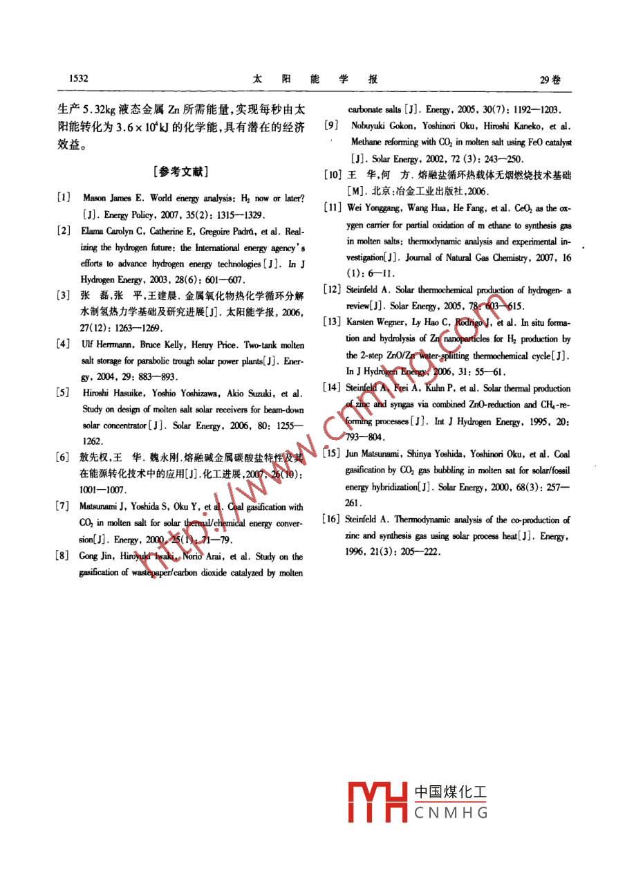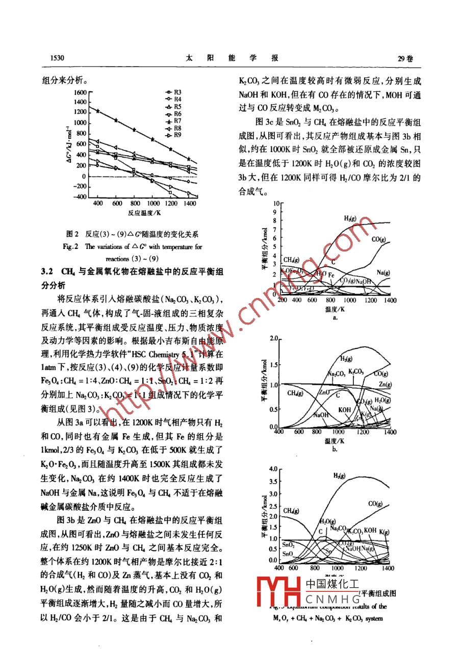 第29卷第12期太陽(yáng)能學(xué)報(bào)Vol 29. No. 122008年12月ACTA ENERGIAE SOLARIS SINICA文章編號(hào):02540096(200)12152806太陽(yáng)能熔融鹽熱化學(xué)循環(huán)制氫和合成氣反應(yīng)體系研究敖先權(quán)2,王華,魏永剛(1.昆明理工大學(xué)材料冶金工程學(xué)院昆明6003:2貴州大學(xué)化學(xué)工程學(xué)院貴陽(yáng)5000摘要:提出了一種新型的太陽(yáng)能加熱熔融鹽化學(xué)循環(huán)反應(yīng)體系,整個(gè)過(guò)程分兩步:第一步,利用熔融堿金屬碳酸鹽吸收、儲(chǔ)備傳輸太陽(yáng)能在熔融鹽介質(zhì)中H與金屬氧化物MO,反應(yīng)生成相應(yīng)的金屬和合成氣;第二步,金屬分解水產(chǎn)生氫氣和相應(yīng)MO,從而MO,又循環(huán)到第一步再利用。根據(jù)最小吉布斯自由能原理采用化學(xué)熱力學(xué)計(jì)算軟件 HSC Chemistry51,對(duì)CH與幾種MO,氣固相反應(yīng)的△C進(jìn)行了計(jì)算和分析進(jìn)一步分析了在熔融堿金屬碳酸鹽(摩爾比為1:l的Na2CO和K2C)體系中溫度對(duì)反應(yīng)產(chǎn)物平衡組分的影響。結(jié)果表明理論上只有Zo和SnO適合該反應(yīng)體系,其反應(yīng)氣體產(chǎn)物中合成氣的量隨反應(yīng)溫度的增加而增加比較適宜的反應(yīng)溫度在1200K左右。計(jì)算結(jié)果表明100Mw的太陽(yáng)能能量系統(tǒng)至少可以提供每秒生產(chǎn)532kg液態(tài)金屬n所需能量,實(shí)現(xiàn)每秒將36×10k的太陽(yáng)能轉(zhuǎn)化為化學(xué)能。關(guān)鍵詞:太陽(yáng)能;熔融鹽;氫;合成氣;熱化學(xué)循環(huán)中圖分類(lèi)號(hào):TK1文獻(xiàn)標(biāo)識(shí)碼:A引言不向環(huán)境排放有害氣體(如CO2、SO2及NO2等);③將金屬氧化物的還原和CH的部分氧化相結(jié)合,利氫能是人類(lèi)未來(lái)的理想能源,但目前利用非用氧化物中的晶格氧作氧源制合成氣,避免了傳統(tǒng)化石原料制備氫的方法成本都很高,規(guī)?;芾щy世界上約95%的氫氣是通過(guò)含碳化石燃料轉(zhuǎn)化制工藝中必須利用純氧的缺點(diǎn);④可利用反應(yīng)(1)的吸備2。近年來(lái)利用金屬氧化物分解或還原制備出金熱效應(yīng)將太陽(yáng)能轉(zhuǎn)化為化學(xué)能以便于能量的儲(chǔ)備、輸送和利用,而利用熔融鹽雙罐儲(chǔ)備太陽(yáng)能是大規(guī)屬單質(zhì)再用金屬分解水制備氫氣的兩步化學(xué)循環(huán)模儲(chǔ)備和利用太陽(yáng)能的有效途徑“。法引起了科學(xué)界的廣泛興趣。CH資源豐富,用本文提出了利用太陽(yáng)能作熱源在熔融鹽反應(yīng)介作還原劑還原金屬氧化物制備金屬無(wú)CO2排放,其質(zhì)中用CH作還原劑還原金屬氧化物同時(shí)制備金屬副產(chǎn)物合成氣是重要的化工中間產(chǎn)品,因而作為化單質(zhì)和合成氣的新工藝通過(guò)熱力學(xué)分析優(yōu)化選擇學(xué)循環(huán)制氫的還原劑具有很好的發(fā)展前景,其化學(xué)最佳的反應(yīng)體系。循環(huán)步驟如下:第一步M.O,+ycH→xM+y(C0+2H)(1)1太陽(yáng)能熔融鹽反應(yīng)體系的工藝流程第二步xM+yH2O→M,O,+yH(2)該系統(tǒng)主要由一個(gè)熔融鹽反應(yīng)器、一個(gè)金屬分其中,M代表金屬。離器、一個(gè)水分解反應(yīng)器、兩個(gè)熔融鹽儲(chǔ)罐及一套太第二步再生的金屬氧化物(M,O,)可返回第一陽(yáng)能熔融鹽加熱系統(tǒng)構(gòu)成,其工藝流程見(jiàn)圖步循環(huán)利用。該方法具有以下優(yōu)點(diǎn):①在不使用催M(jìn)O,從頂部加入與熔融鹽混合后噴入反應(yīng)器,CH化劑的條件下,同時(shí)可制得H2和H2/CO摩爾比為2/從底部鼓入與其接觸反應(yīng),反應(yīng)過(guò)后的產(chǎn)物合成氣1的合成氣該比例的合成氣最適宜甲醇的制備:②通過(guò)中國(guó)煤化工加工廠;金屬單收稿日期:2000724CNMHG基金項(xiàng)目:國(guó)家自然科學(xué)基金(50574086:5014038);國(guó)家自然科學(xué)基金重大研究計(jì)劃(906005通訊作者:王華(1%5-),男,博士、教授,主要從事能源與環(huán)保新技術(shù)方面的研究12期敖先權(quán)等:太陽(yáng)能熔融鹽熱化學(xué)循環(huán)制氫和合成氣反應(yīng)體系研究質(zhì)被吸收富集在熔融鹽中并沉向底部把熔融鹽反到傳熱傳質(zhì)的作用等優(yōu)點(diǎn)0。應(yīng)器底部的反應(yīng)產(chǎn)物及熔融鹽導(dǎo)入金屬分離器進(jìn)行Matsunami等、jn等分別利用不同比例組合金屬和熔融鹽的分離分離后的金屬經(jīng)水分解反應(yīng)的熔融堿金屬碳酸鹽對(duì)煤和廢紙與CO2及水蒸汽氣器分解H2O產(chǎn)生H和相應(yīng)的MO,(反應(yīng)式(2),化作了研究。 Gokon等進(jìn)行了模擬太陽(yáng)能加熱,在MO,再循環(huán)到熔融鹽反應(yīng)器利用熔融碳酸鹽中對(duì)CH和CO2催化重整反應(yīng)的實(shí)驗(yàn)研除霧器雙曲面鏡究;王華等提出了在熔融碳酸鹽中利用氧載體∠倉(cāng)成氣進(jìn)行CH的無(wú)煙燃燒技術(shù);魏永剛等在熔融碳酸金屬氧化物鹽中進(jìn)行了利用CeO2晶格氧部分氧化CH制合成氣的實(shí)驗(yàn),在這些研究中熔融鹽也起到了反應(yīng)介質(zhì)熱熔融鹽儲(chǔ)罐‰檻鹽和儲(chǔ)熱的功能,所以熔融堿金屬碳酸鹽作為氣固反太陽(yáng)能熔融鹽加熱器應(yīng)的反應(yīng)介質(zhì),同時(shí)充當(dāng)熱載體是非常有效的。1:1鹽始鹽日叛反的№aCO3和K2CO3混合熔融碳酸鹽對(duì)本體系是一射裝置個(gè)很好的選擇,其共晶混合物具有較低的熔點(diǎn)和粘甲烷冷