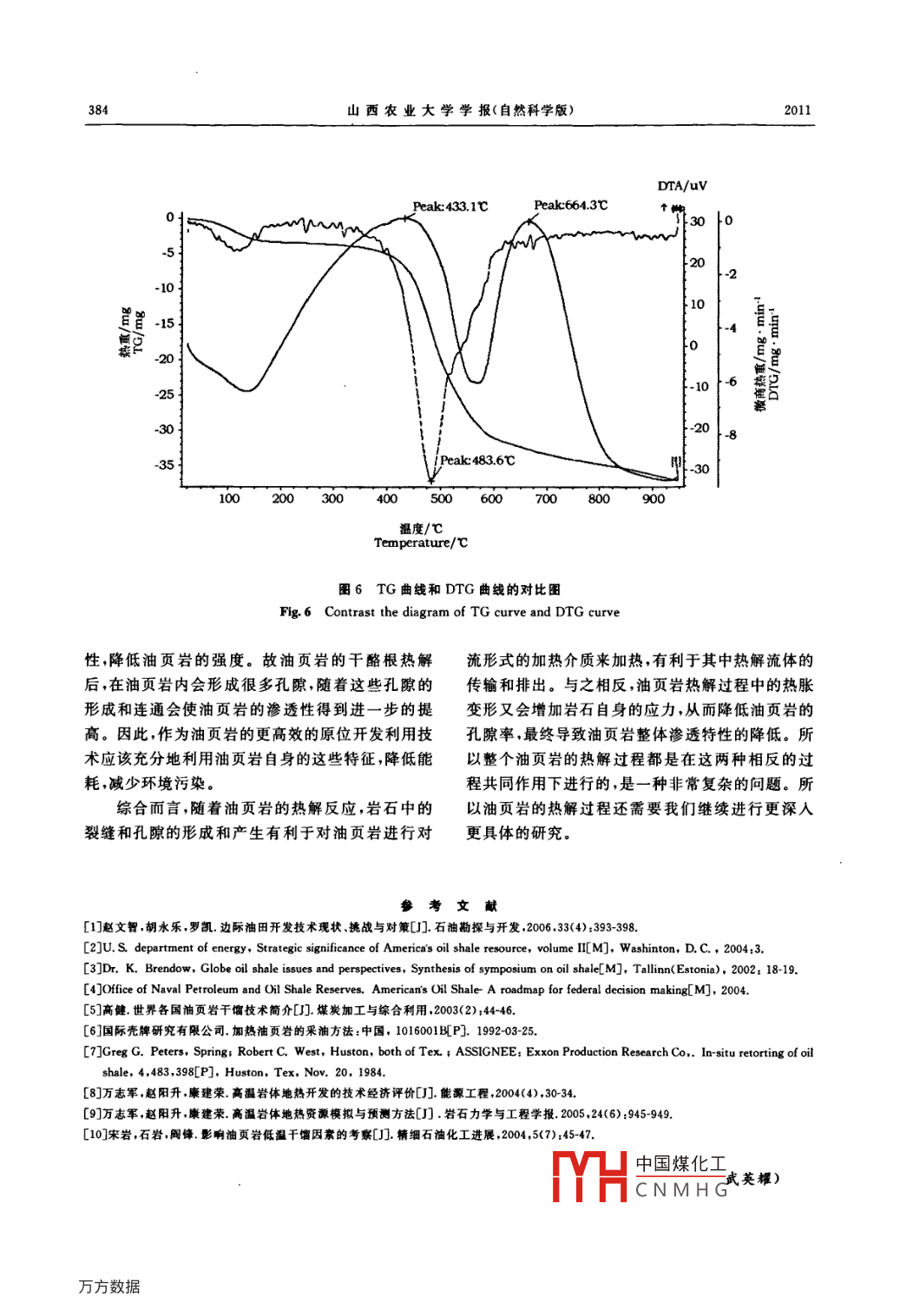 J. SHANXI AGRIC. UNIV (Natural Science Edition)西術(shù)大學(xué)學(xué)報(bào)(自然科學(xué)版)201314002814油頁巖的熱解特性試驗(yàn)研究薛晉霞1,劉中華(1.山西農(nóng)業(yè)大學(xué)工學(xué)院山西太谷030801;2.太原理工大學(xué)采礦工藝研究所,山西太原030024)摘要:通過實(shí)驗(yàn)測(cè)誠與分析,揭示了油頁巖的熱解特性。對(duì)撫順油頁巖進(jìn)行了高溫?zé)峤馐е貙?shí)驗(yàn),并且得到了油頁巖在20~100℃范圍內(nèi)的TG和DTG曲線,揭示了撫順油頁巖在330~480℃范圍內(nèi)具有集中熱解的特性,失重約占總質(zhì)量的15%。從而為油頁巖的地下原位開采技術(shù)提供可靠的理論依據(jù)關(guān)鍵詞:油頁巖;熱解;原位;熱破裂中圖分類號(hào):P618.12文獻(xiàn)標(biāo)識(shí)碼:A文章編號(hào):1671-8151(2011)040381-04The Experimental Research on the Characteristics of Oil Shale PyrolysisXUE Jin-Xia, LIU Zhong-Hua(1. College of Engineering, Shanxi Agricultural University, Taigu Shanri 030801, China; 2. Institute of MiningTechnology, Taiyuan University of Technology, Taiyuan Shanxi 030024, China)Abstract: By experimental test and analysis, the pyrobysis characteristics of the oil shale were illustrated. Based on thethermogravimetry tests of the Fushun oil shale, TG and DTG curves within the range of 20-1000 C were obtained.The curves showed that Fushun oil shale has the characteristics of centralized pyrolysis within the range of 330-4C, the weightlessness accounts for 15% of total quality. The results provided the reliable theoretical basis for oil shaleinsitu pyrolysisKey words: Oil shale; Pyrolysis: Insitu, Thermal cracking油頁巖是一種有機(jī)礦物(亦稱油母)的礦石,因目前國內(nèi)外的油頁巖利用技術(shù)主要是地面干含油量高稱油頁巖,是國際公認(rèn)的傳統(tǒng)石油資源的餾制取頁巖油技術(shù)和地下原位干餾技術(shù)兩種,但就重要替代資源之一。在已知的所有化石燃料中油未來發(fā)展趨勢(shì)而言應(yīng)是地下原位干餾技術(shù)-10更頁巖的儲(chǔ)量折算為發(fā)熱量僅次于煤,列第二位。若具有廣闊前景。而地下原位干餾開采頁巖油能否是折算成頁巖油,世界上的油頁巖儲(chǔ)量約為4750成功的關(guān)鍵在于是否可以有效地加熱巖石產(chǎn)生頁億噸相當(dāng)于目前世界天然原油探明可采儲(chǔ)量的巖油。那么加熱后的油頁巖會(huì)具有什么重要的物5.4倍。我國已探明的油頁巖儲(chǔ)量為315.67億理力學(xué)特性就需要深入研究。故本文就這方面做噸,儲(chǔ)量僅次于美國、巴西和原蘇聯(lián),居世界第四了如下研究。位[~5。雖然經(jīng)過多年不懈的努力,國內(nèi)的石油工業(yè)得到了快速的發(fā)展。然而受資源因素的限制,石1油頁巖熱解特性試驗(yàn)概述油開采的增長量遠(yuǎn)遠(yuǎn)低于我國石油消費(fèi)的增長量。1.1試驗(yàn)材料與裝置特別是當(dāng)今世界國際油價(jià)急劇動(dòng)蕩,以及中東和利試驗(yàn)的油頁巖樣品采自中國遼寧撫順西露天比亞局勢(shì)惡化等等不利因素的影響都給我國的石礦,在現(xiàn)場(chǎng)樣品用瀝青進(jìn)行封裹,再運(yùn)回室內(nèi)進(jìn)行油供給敲響了警鐘。因此,在這種形勢(shì)下尋求油頁試驗(yàn)。先利用太原理工大學(xué)自己研制的高溫高壓巖的高效大規(guī)模開采利用技術(shù),具有極為重要的戰(zhàn)干餾試驗(yàn)裝置對(duì)油頁巖進(jìn)行高溫干餾試驗(yàn),以了解略意義。油頁巖的物理性質(zhì),然后再采用熱分析儀來測(cè)試油中國煤化工收稿日期:2011-04-19修回日期:2011-07-18作者簡介:薛晉霞(1979-),女(漢),山西太谷人,講師,碩士,主要從事工程力學(xué)方面的研CNMHG基金項(xiàng)目:山西農(nóng)業(yè)大學(xué)青年科技創(chuàng)新基金(2009010)山西農(nóng)業(yè)大學(xué)學(xué)報(bào)(自然科學(xué)版)頁巖的化學(xué)性質(zhì)。具體試驗(yàn)及分析過程如下:1.2油頁巖的物理性質(zhì)試驗(yàn)及分析油頁巖是一種含有固體可燃有機(jī)質(zhì)的沉積巖,其可燃有機(jī)質(zhì)一般稱為油母或干酪根,表面常常呈現(xiàn)灰棕色或黑色色澤,如圖1所示。再利用太原理工大學(xué)自己研制的高溫高壓干餾釜進(jìn)行干餾試驗(yàn),可以發(fā)現(xiàn)自然狀態(tài)下,天然的油頁巖是一種滲透性和孔隙率極低的泥質(zhì)頁巖。其中的干酪根以固態(tài)圖2油頁巖250倍原始片子的形式賦存于油頁巖中并與其融為一體,而油頁巖Fig2 25000%original films of the oil shale內(nèi)部的微小層理,在地下原位情況下完全處于閉合狀態(tài)。但同時(shí)油頁巖又是一種熱破裂特征非常顯.3油頁巖的化學(xué)性質(zhì)試驗(yàn)及分析著的巖石,它閉合的層理會(huì)在熱作用下張開,如圖為了了解油頁巖熱解過程的化學(xué)性質(zhì)變化,采2所示,油頁巖的干酪根熱解后,在油頁巖內(nèi)會(huì)形用熱分析方法對(duì)油頁巖的熱解特性進(jìn)行了研究,同成很多孔隙,而這些孔隙的形成和連通會(huì)繼續(xù)提高時(shí)也可以對(duì)油頁巖的熱解產(chǎn)油和直接燃燒利用提油頁巖的滲透性。供一定的參考作用。實(shí)驗(yàn)樣品采用撫順西露天礦的油頁巖,外觀為深褐色,有油脂光澤,裂縫不發(fā)育。實(shí)驗(yàn)試樣經(jīng)磨煤機(jī)研磨后,再經(jīng)過瑪瑙研缽研磨而成。此外特別需要保證在實(shí)驗(yàn)期間不對(duì)樣品進(jìn)行任何篩分處理,以確保實(shí)驗(yàn)數(shù)據(jù)能真實(shí)準(zhǔn)
