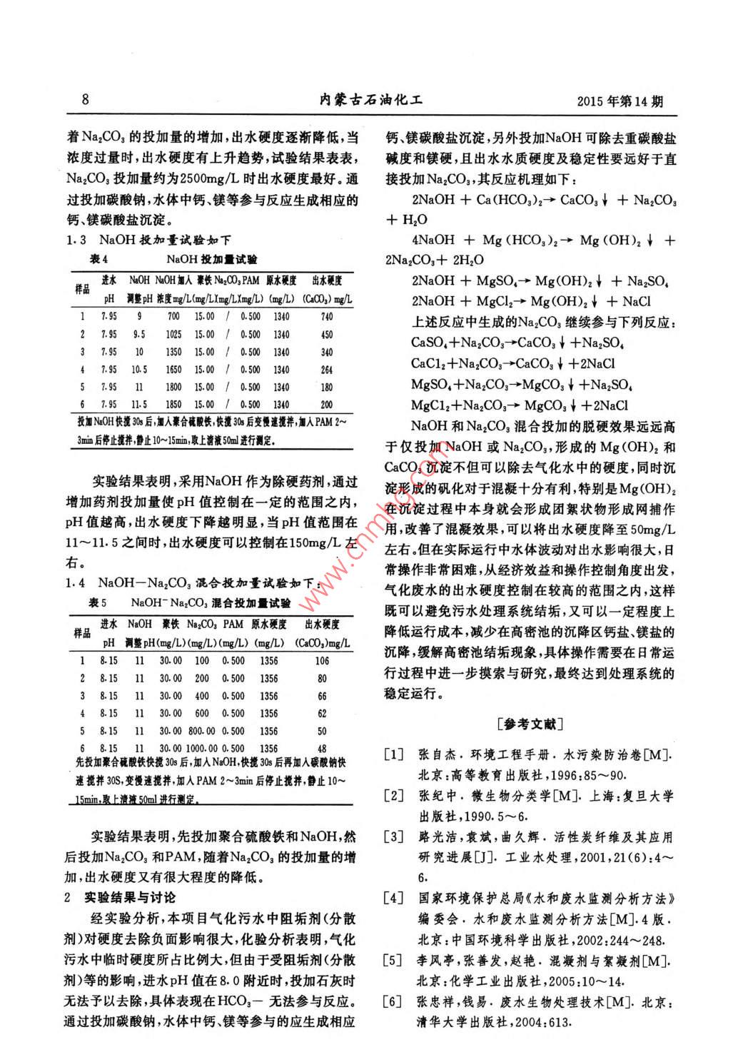 2015年第14期內(nèi)蒙古石油化工煤制烯烴氣化廢水中硬度的處理研究張永勝,崔恒玲(神華包頭煤化工有限責(zé)任公司,內(nèi)蒙古包頭014010)摘要:由于煤制烯烴氣化廢水的硬度較高,導(dǎo)致污水處理系統(tǒng)結(jié)垢嚴(yán)重,污水處理難度大。通過燒杯試驗(yàn),由于氣化廢水暫時(shí)硬度比例大,且受廢水中分散劑影響,傳統(tǒng)的石灰軟化法無法去除氣化廢水中的硬度,反而硬度使上升;Na2CO,和NaOH軟化法都可以將硬度從1400mg/L降至200mg/L左右;同時(shí)投加NaOH和Na2COz,可以進(jìn)一步降低硬度至50mg/L左右。關(guān)鍵詞:硬度;石灰;軟化;Na2COg;NaOH中圖分類號(hào):TQ784文獻(xiàn)標(biāo)識(shí)碼:A文章編號(hào):1006- -7981(2015)14- -0007- -02近年來煤化工行業(yè)發(fā)展迅速,該行業(yè)崛起所銜止10~ 15min,取上清液50ml進(jìn)行測定。生的環(huán)保問題日益突出。煤制烯烴項(xiàng)目氣化裝置采表2石灰投加試驗(yàn)用水煤漿加壓氣化技術(shù),其產(chǎn)生廢水具有硬度高、濁進(jìn)水石碳聚鐵加石灰后PAM原水硬度出水硬度度高,難處理等特點(diǎn),具體見表1。該污水進(jìn)人污水處pH (mg/L)(mg/L) pH(mg/L)_ (mg/L)(CacCO,) mg/L1 7.9162.5 8.120.62514611491理裝置導(dǎo)致污水處理系統(tǒng)結(jié)垢嚴(yán)重,尤為突出的是27.91 43 62.5, 8.250. 6251461,15010池曝氣管結(jié)垢嚴(yán)重.為緩解污水處理系統(tǒng)的壓力,3 7.91 85 62.5 8.4115014 7.91 170 62.5 8.671591保證外排廢水環(huán)保達(dá)標(biāo),增加了除硬度系統(tǒng)去除來340 62.5 9.011731$ 7.91 510 62.5 9.271831水硬度,從根本上解決污水處理系統(tǒng)存在的問題,實(shí)現(xiàn)污水處理系統(tǒng)長周期、高負(fù)荷、安全運(yùn)行。除硬系7 7.91 1875 62.5 11.64 0.625236287.91 225062.5 11.920. 625 _2692統(tǒng)由緩沖池、高密池、中和池、污泥貯池及污泥壓濾實(shí)驗(yàn)結(jié)果表明,采用石灰做為除硬藥劑,隨著石系統(tǒng)五個(gè)部分組成。氣化裝置來水從緩沖池通過高灰投加量的增加,出水硬度持續(xù)上升,對水中的硬度密池進(jìn)水泵的提升從底部進(jìn)人高密池的前混合區(qū),無法去除。通過理論計(jì)算表明,此過程中HCO:-大在前混合區(qū)投加藥劑和混凝劑進(jìn)行軟化和混凝,在部分仍在水中。此時(shí)表現(xiàn)為上清液顏色深,且清液中絮凝區(qū)投加藥劑和絮凝劑進(jìn)行進(jìn)-步的軟化和絮凝未能沉降的細(xì)小顆粒多,獨(dú)度高。作用,從而降低水中的硬度,保證污水處理裝置的穩(wěn)1.2 Na2CO3 投加量試驗(yàn)如下定運(yùn)行。表3Na2CO,投加試驗(yàn)表1煤制烯烴氣化廢水的水質(zhì)特點(diǎn)洋品進(jìn)水碳酸鈉聚鐵加碳酸鈉PAM原水硬度出水硬度項(xiàng)更度(以Ca CO,)計(jì)(mg/L堿度(mg/L)獨(dú)度(NTU) pHpH (mg/L) (mg/L) 后pH_ (ng/L) (g/L) (CaCO)mg/L指標(biāo)1200~1500800~100030~50 7~8, 7.950.0 62.57.95 0.625 142114517.95 200.0 62.5 9.00 0.625 1421351具體試驗(yàn)過程7.95 2125.0 62.5 9.08 0.625 142134去除水中硬度通常采用石灰軟化法,Na2CO3軟7.95 2250.0 62.5 9.10 0.625 1421化法和NaOH軟化法;為提高氣化廢水出水脫硬效7.95 2375.0. 62.5 9.16 0.625 1421187.95 2500.0 62.5 9.19 0.625 142115果,降低脫硬的成本和混凝劑的投加量?,F(xiàn)在實(shí)驗(yàn)室7.952625.0 62.5 9.21 0.625 142116取氣化廢水,進(jìn)行燒杯實(shí)驗(yàn),考察了以上三種藥劑對7.95 2750.0 62.5 9.30 0.625 1421219 7.95 2875.0 62.5 9.34 0.625 1421200于氣化廢水中硬度的去除效果,藥劑投加量。具體實(shí)10 7.95 300.0 62.5 9.36 0.625 142122驗(yàn)結(jié)果及分析如下:投加聚合硫酸鐵快攪30s后,加人碳酸鈉快攪30s后變慢速攪并,加人1.1 石灰投加量試驗(yàn)如下PAM 2~3min后停止攪拌,靜止10~15min,取上清液50ml進(jìn)行測定,投加聚合硫酸鐵快攪30s后,加入石灰快攪30s后變慢速攪拌,加人PAM 2~ 3min后停止攪拌,靜實(shí)驗(yàn)結(jié)果表明,采用Na2CO3作為除硬藥劑,隨收稿日期:2015-04- 258內(nèi)蒙古石油化工2015年第14期著Na2CO3的投加量的增加,出水硬度逐漸降低,當(dāng)鈣、鎂碳酸鹽沉淀,另外投加NaOH可除去重碳酸鹽濃度過量時(shí),出水硬度有上升趨勢,試驗(yàn)結(jié)果表表,堿度和鎂硬,且出水水質(zhì)硬度及穩(wěn)定性要遠(yuǎn)好于直Na2COz投加量約為2500mg/L時(shí)出水硬度最好。通接投加Na2CO3 ,其反應(yīng)機(jī)理如下:過投加碳酸鈉,水體中鈣、鎂等參與反應(yīng)生成相應(yīng)的2NaOH + Ca(HCO3)r→CaCO3↓+ Na2CO,鈣、鎂碳酸鹽沉淀。+ H2O1.3 NaOH 投加量試驗(yàn)如下4NaOH + Mg (HCO3)2→Mg (OH)2↓+表4NaOH投加試驗(yàn)2Na2CO3+ 2H2O樣品進(jìn)水 NaOH NaOH加人秦鐵NaCOsPAM 原水硬度 出水硬度2NaOH + MgSO, Mg(OH)2↓ +NazSO,pH調(diào)整pH 濃度ng/L(mg/LXmg/LXmg/L) (mg/L) (CaCO3) mg/L2NaOH十MgCl2→Mg(OH)2↓+ NaCl17.95 9 700 15.00 / 0.500 134074上述反應(yīng)中生成的Na2CO3繼續(xù)參與下列反應(yīng):7.951025 15.00 / 0.500 13445CaSO,+Na2CO3-→CaCO?!?Na2SO,7.95 10 1350 15.00 / 0.500 1340347.95 10.5 1650 15.00 1 0.500 134026CaCl2+Na2CO.- >CaCO3↓+2NaCl7.95 11 1800 15.00 / 0.500 134018MgSO.+Na2CO3-→MgCOz↓+Na2SO,7.95 11.5 1850 15.00/ 0.500 134020MgC12+Na2CO3-→MgCOs↓+ 2NaCl投加NeOH快攪30s后,加人秦合硫酸鐵,快攪303s后變慢速攪摔,加入PAM2~NaOH和Na2CO3混合投加的脫硬效果遠(yuǎn)遠(yuǎn)高3min 后停止攪掉,靜止10~15mi,敷上濟(jì)液50ml進(jìn)行測定。于僅投加NaOH或Na2CO,形成的Mg(OH)2和CaCO3沉淀不但可以除去氣化水中的硬度,同時(shí)沉實(shí)驗(yàn)結(jié)果表明,采用NaOH作為除