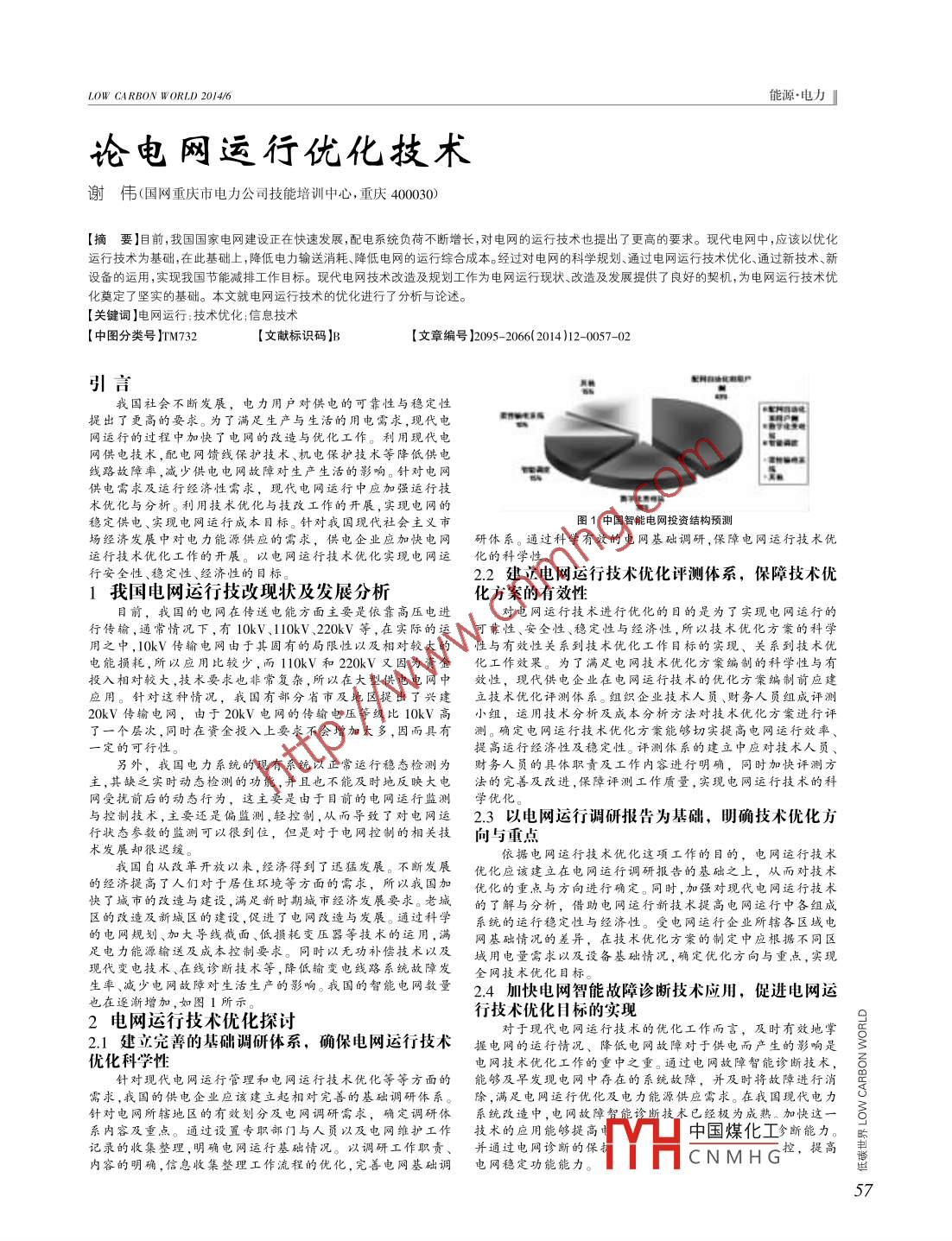 LOW CARBON WORLD 2014/6能源.電力」論電網(wǎng)運(yùn)行優(yōu)化技術(shù)射偉{國網(wǎng)重慶市電力公司技能培訓(xùn)中心,重慶400030)[摘要]目前,我國國家電網(wǎng)建設(shè)正在快速發(fā)展,配電系統(tǒng)負(fù)荷不斷增長,對電網(wǎng)的運(yùn)行技術(shù)也提出了更高的要求?,F(xiàn)代電網(wǎng)中,應(yīng)該以優(yōu)化運(yùn)行技術(shù)為基礎(chǔ),在此基礎(chǔ).上,降低電力輸送消耗、降低電網(wǎng)的運(yùn)行綜合成本。經(jīng)過對電網(wǎng)的科學(xué)規(guī)劃、通過電網(wǎng)運(yùn)行技術(shù)優(yōu)化、通過新技術(shù)、新設(shè)備的運(yùn)用,實(shí)現(xiàn)我國節(jié)能減排工作目標(biāo)?,F(xiàn)代電網(wǎng)技術(shù)改造及規(guī)劃工作為電網(wǎng)運(yùn)行現(xiàn)狀、改造及發(fā)展提供了良好的契機(jī),為電網(wǎng)運(yùn)行技術(shù)優(yōu)化奠定了堅(jiān)實(shí)的基礎(chǔ)。本文就電網(wǎng)運(yùn)行技術(shù)的優(yōu)化進(jìn)行了分析與論述。[關(guān)鍵詞]電網(wǎng)運(yùn)行;技術(shù)優(yōu)化;信息技術(shù)[中圖分類號]TM732[文獻(xiàn)標(biāo)識碼]B .[文章編號)2095- 2066(2014)12-0057-02引言我國社會不斷發(fā)展,電力用戶對供電的可靠性與穩(wěn)定性提出了更高的要求。為了滿足生產(chǎn)與生活的用電需求,現(xiàn)代電網(wǎng)運(yùn)行的過程中加快了電網(wǎng)的改造與優(yōu)化工作。利用現(xiàn)代電網(wǎng)供電技術(shù),配電網(wǎng)饋線保護(hù)技術(shù)、機(jī)電保護(hù)技術(shù)等降低供電線路故障率,減少供電電網(wǎng)故障對生產(chǎn)生活的影響。針對電網(wǎng)供電需求及運(yùn)行經(jīng)濟(jì)性需求,現(xiàn)代電網(wǎng)運(yùn)行中應(yīng)加強(qiáng)運(yùn)行技.術(shù)優(yōu)化與分析。利用技術(shù)優(yōu)化與技改工作的開展,實(shí)現(xiàn)電網(wǎng)的穩(wěn)定供電、實(shí)現(xiàn)電網(wǎng)運(yùn)行成本目標(biāo)。針對我國現(xiàn)代社會主義市圖1中國智能電網(wǎng)投資結(jié)構(gòu)預(yù)測場經(jīng)濟(jì)發(fā)展中對電力能源供應(yīng)的需求,供電企業(yè)應(yīng)加快電網(wǎng)研體系。 通過科學(xué)有效的電網(wǎng)基礎(chǔ)調(diào)研,保障電網(wǎng)運(yùn)行技術(shù)優(yōu)運(yùn)行技術(shù)優(yōu)化工作的開展。以電網(wǎng)運(yùn)行技術(shù)優(yōu)化實(shí)現(xiàn)電網(wǎng)運(yùn)化 的科學(xué)性。行安全性、穩(wěn)定性、經(jīng)濟(jì)性的目標(biāo)。2.2建立電網(wǎng)運(yùn)行技術(shù)優(yōu)化評測體系,保障技術(shù)優(yōu)1我國電網(wǎng)運(yùn)行技改現(xiàn)狀及發(fā)展分析化方案的有效性目前,我國的電網(wǎng)在傳送電能方面主要是依靠高壓電進(jìn)對電網(wǎng)運(yùn)行技術(shù)進(jìn)行優(yōu)化的目的是為了實(shí)現(xiàn)電網(wǎng)運(yùn)行的行傳輸,通常情況下,有10kV、110kV、220kV等,在實(shí)際的運(yùn)可靠性、 安全性、穩(wěn)定性與經(jīng)濟(jì)性,所以技術(shù)優(yōu)化方案的科學(xué)用之中,10kV傳輸電網(wǎng)由于其固有的局限性以及相對較大的性 與有效性關(guān)系到技術(shù)優(yōu)化工作目標(biāo)的實(shí)現(xiàn)、關(guān)系到技術(shù)優(yōu)電能損耗,所以應(yīng)用比較少,而110kV 和220kV又因?yàn)橘Y金化工作效果。 為了滿足電網(wǎng)技術(shù)優(yōu)化方案編制的科學(xué)性與有投入相對較大,技術(shù)要求也非常復(fù)雜,所以在大型供電電網(wǎng)中效性, 現(xiàn)代供電企業(yè)在電網(wǎng)運(yùn)行技術(shù)的優(yōu)化方案編制前應(yīng)建應(yīng)用。針對這種情況,我國有部分省市及地區(qū)提出了興建立技 術(shù)優(yōu)化評測體系。組織企業(yè)技術(shù)人員、財(cái)務(wù)人員組成評測20kV傳輸電網(wǎng),由于20kV電網(wǎng)的傳輸電壓等級比10kV高小組, 運(yùn)用技術(shù)分析及成本分析方法對技術(shù)優(yōu)化方案進(jìn)行評了一個層次,同時在資金投入。上要求不會增加太多,因而具有測。 確定電網(wǎng)運(yùn)行技術(shù)優(yōu)化方案能夠切實(shí)提高電網(wǎng)運(yùn)行效率、定的可提高運(yùn)行經(jīng)濟(jì)性及穩(wěn)定性。評測體系的建立中應(yīng)對技術(shù)人員、另外, 我國電力系統(tǒng)的現(xiàn)有系統(tǒng)以正常運(yùn)行穩(wěn)態(tài)檢測為財(cái)務(wù)人員的具體職責(zé)及工作內(nèi)容進(jìn)行明確, 同時加快評測方主,其缺乏實(shí)時動態(tài)檢測的功能,并且也不能及時地反映大電法的完善及改進(jìn) ,保障評測工作質(zhì)量,實(shí)現(xiàn)電網(wǎng)運(yùn)行技術(shù)的科網(wǎng)受擾前后的動態(tài)行為,這主要是由于目前的電網(wǎng)運(yùn)行監(jiān)測與控制技術(shù),主要還是偏監(jiān)測,輕控制,從而導(dǎo)致了對電網(wǎng)運(yùn)2.3 以電網(wǎng)運(yùn)行調(diào)研報(bào)告為基礎(chǔ),明確技術(shù)優(yōu)化方行狀態(tài)參數(shù)的監(jiān)測可以很到位,但是對于電網(wǎng)控制的相關(guān)技向 與重點(diǎn)術(shù)發(fā)展卻很遲緩。我國自從改革開放以來,經(jīng)濟(jì)得到了迅猛發(fā)展。 不斷發(fā)展依據(jù)電網(wǎng)運(yùn)行技術(shù)優(yōu)化這項(xiàng) 工作的目的,電網(wǎng)運(yùn)行技術(shù)的經(jīng)濟(jì)提高了人們對于居住環(huán)境等方面的需求,所以我國加優(yōu)化應(yīng)該建立在電網(wǎng)運