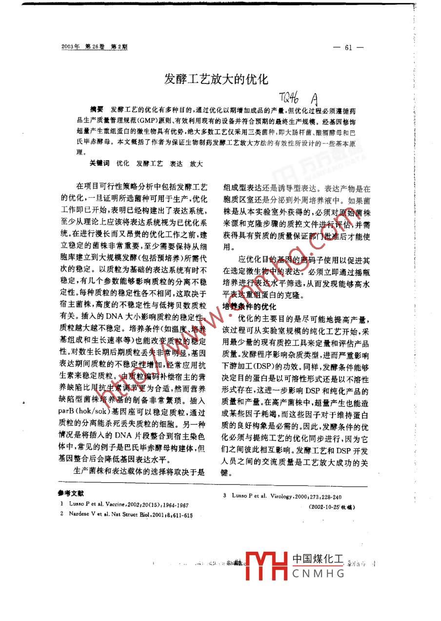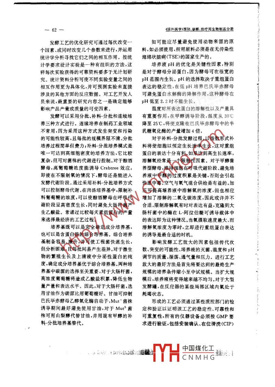 2003年第26卷第2期發(fā)酵工藝放大的優(yōu)化T46瘸要發(fā)醇工藝的優(yōu)化有多種目的,通過優(yōu)化以期增加成品的產量,但優(yōu)化過程必須蓬循藥品生產質量管理規(guī)范GMP)原則、有效利用現(xiàn)有的設備并符合預期的最終生產規(guī)模。經基因修飾超量產生重組蛋白的徽生物具有優(yōu)勢,絕大多數(shù)工藝僅采用三類菌種,即大腸桿菌、釀酒酵母和巴氏畢赤酵母。本文概括了作者為保證生物制藥發(fā)酵工藝放大方法的有效性所設計的一些基本原關鍵詞優(yōu)化發(fā)酵工藝表達放大在項目可行性策略分析中包括發(fā)酵工藝組成型表達還是誘導型表達。表達產物是在的優(yōu)化,一旦證明所選菌種可用于生產,優(yōu)化胞質區(qū)室還是分泌到外周培養(yǎng)液中。如果菌工作即已開始,表明已經構建出了表達系統(tǒng),株是從本實驗室外獲得的,必須對原始菌株至少從理論上應該將表達系統(tǒng)枧為已優(yōu)化系來源和克隆步驟的質控文件進行評估,并需統(tǒng)在進行漫長而又昂貴的優(yōu)化工作之前,建獲得具有資質的質量保證部門批準后才能使立穩(wěn)定的菌株非常重要,至少需要保持從細用。胞庫建立到大規(guī)模發(fā)酵(包括預培養(yǎng))所需代應優(yōu)化目的基因的密碼子使用以促進其次的穩(wěn)定。以質粒為基礎的表達系統(tǒng)有時不在選定微生物中的表達。必須立即通過播瓶穩(wěn)定,有幾個參數(shù)能夠影響質粒的分離不穩(wěn)培養(yǎng)進行表達水平篩選,從而發(fā)現(xiàn)能夠高水定性。每種質粒的穩(wěn)定性各不相同,這取決于平表達重組蛋白的克隆宿主菌株,高度的不穩(wěn)定性與低拷貝數(shù)質粒培養(yǎng)條件的優(yōu)化有關。插入的DNA大小影響質粒的穩(wěn)定性:優(yōu)化的主要目的是盡可能地提高產量質粒越大越不穩(wěn)定。培養(yǎng)條件(如溫度、培養(yǎng)該過程可從實驗室規(guī)模的純化工藝開始,采基組成和生長速率等)也能改變質粒的穩(wěn)定用最少量的現(xiàn)有質控工具來定量和評估產品性。對數(shù)生長期后期質粒丟失非常明顯,基因質量。發(fā)酵程序彩響雜質類型,進而嚴重影響表達期間質粒的不穩(wěn)定性增加,經常應用抗下游加工(DSP的功效。同樣,發(fā)酵條件能夠生素來穩(wěn)定質粒。由質粒編碼補償宿主的營決定目的蛋白是以可溶性形式還是以不溶性養(yǎng)缺陷比用抗生素調節(jié)更為合適,然而營養(yǎng)形式存在,這進一步影響DSP和純化產品的缺陷型菌株培養(yǎng)基的制備非常繁瑣。插入質量和產量。在高產菌株中,超量產生也能遺parB(hok/sok)基因座可以穩(wěn)定質粒,通過成某些因子耗竭,而這些因子對于維持蛋白質粒的分離能殺死丟失質粒的細胞。另一種質的良好構象是必需的。因此,發(fā)酵條件的優(yōu)情況是將插入的DNA片段整合到宿主染色化必須與提純工藝的優(yōu)化同步進行,因為它體中,常見的例子是巴氏畢赤酵母構建體,但們之間彼此相互彩響。發(fā)酵工藝和DSP開發(fā)基因整合后會降低基因表達水平人員之間的交流質量是工藝放大成功的關生產菌株和表達載體的選擇將取決于是鍵。參考文款3 Lusso P et al. Virology 2000, 273, 228-2401 Lusso p et a]. Vaccine,2002:20(15);1964-1967(2002-10-25收稿)2 Nardese V et al. Nat Struct Biol. 20011 81611-615中國煤化工CNMHG《國外醫(yī)學》預防診斷治療用生物制品分冊發(fā)酵工藝的優(yōu)化研究可通過每次改變如可能應盡量避免使用動物來源的原個因素、或同時改變幾個參數(shù)來進行,并運用料,如必須使用,所用原料必須是在無傳染性統(tǒng)計學分析尋找它們之間的相互作用。按統(tǒng)海綿狀腦病(TSE)的國家生產的。計學要求設計實驗是一種有組織的方法這培養(yǎng)液pH的優(yōu)化是關鍵性因素,特別樣每次實驗獲得的可靠資料要多于無計劃研是對于酵母分泌蛋白,因為酵母可在很寬的究。統(tǒng)計資料分析可使不同實驗變量之間的pH范圍內生長。PH的選擇取決于重組蛋白相互作用更為具體化,并可預測實驗未直接表達的穩(wěn)定性,在低pH培養(yǎng)巴氏畢赤酵母涉及的其他方面的反應數(shù)據(jù)。對工藝開發(fā)人可避免蛋白水解酶的降解作用,這種酵母在員來說,最重要的研究內容之一是確定能夠pH低至2.2時不能生長影響產品產量或質量的可變因素溫度對所表達蛋白的溶解性以及產量具發(fā)酵可以采用分批、補料-分批和連續(xù)培有重要作用,在甲醇誘導階段,溫度從30℃養(yǎng)三種方式進行。連續(xù)培養(yǎng)在制藥工業(yè)領域降至25℃,將使克隆在巴氏畢赤酵母中的半不常用,因為采用這種方式發(fā)生突變和污染乳糖氧化酶的產量增加4倍的可能性較高,且每批的規(guī)模界限不清分批對于補料分批發(fā)酵過程,以指數(shù)形式補培養(yǎng)過程簡單但費力;補料分批培養(yǎng)模式是料將使細胞以恒定生長速率生長,這對重組唯一可達到高細胞密度的培養(yǎng)方法,它比較蛋白的表達十分有利。如果達到高生長速率復雜,但可對菌株的代謝進行控制。對于釀酒溶解氧經常是一個限制性因素。對于甲醇營酵母,高葡萄糖濃度能誘導 Crabtree效應:養(yǎng)型酵母,維持細胞在呼吸代謝階段避免培即使在不限制氧的情況下,酵母還是能進入養(yǎng)液中甲醇的過度積累是關鍵,否則會引起發(fā)酵代謝階段。通過采用補料分批