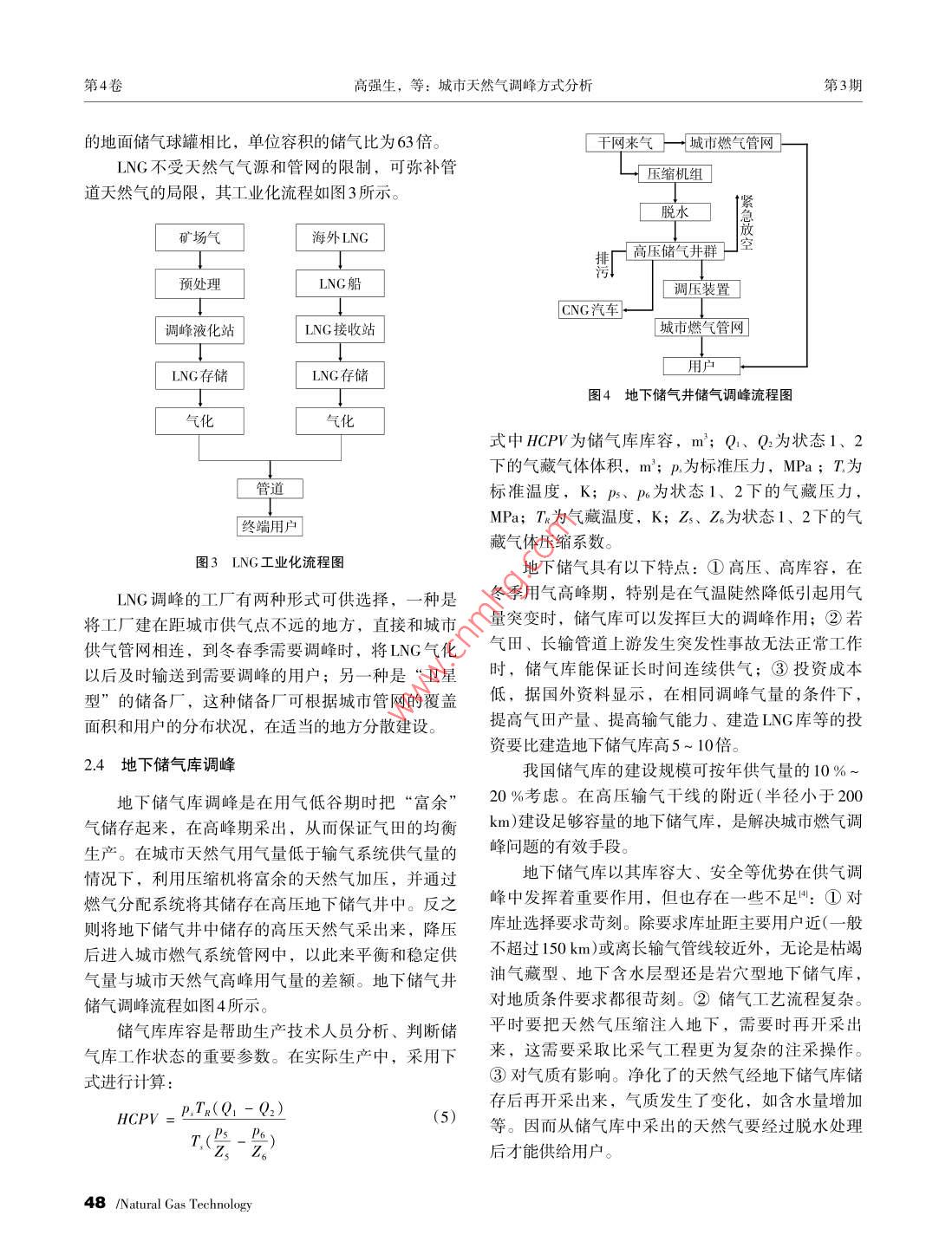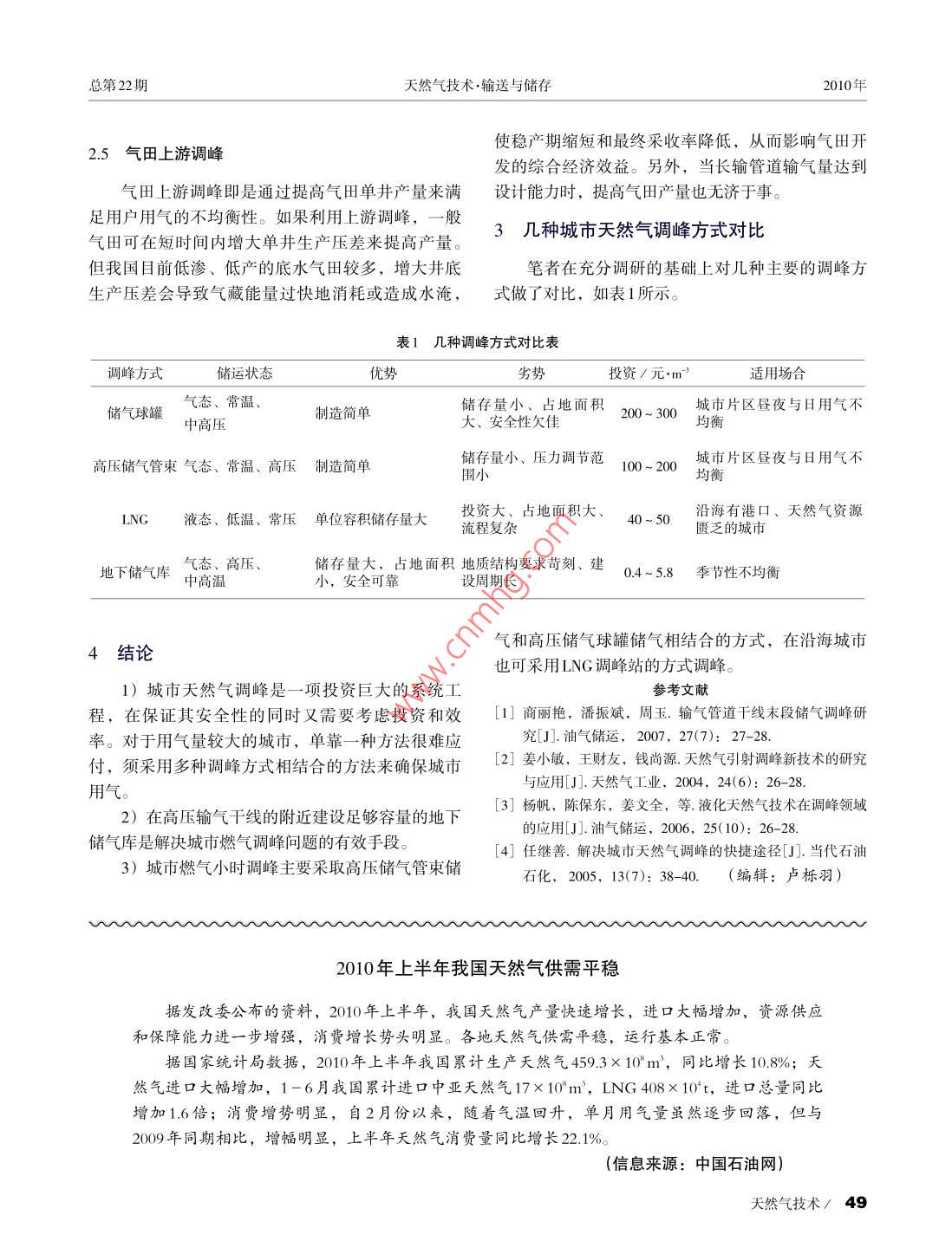 2010年天然氣技術(shù)Vol4,No.4第4卷.第4期Natural Gas TechnologyAug:2010文章編號(hào):1673- -9035(2010)04- -0046- 04城市天然氣調(diào)峰方式分析高強(qiáng)生袁英(中國(guó)石油西南油氣田公司川中油氣礦南充燃?xì)夤?,四川南?37000)摘要城市管道天然氣的穩(wěn)定供應(yīng)直接關(guān)系到市民的正常生活。城市用氣由于其月、日、小時(shí)用氣量的不均衡性,以及用氣需求的快速增長(zhǎng),使天然氣調(diào)峰問(wèn)題日益突出。對(duì)天然氣主要調(diào)峰方法如儲(chǔ)氣球罐調(diào)峰、高壓儲(chǔ)氣管束調(diào)峰、液化天然氣調(diào)峰、地下儲(chǔ)氣庫(kù)調(diào)峰、氣田上游調(diào)峰的工作原理、特點(diǎn)與工藝計(jì)算進(jìn)行了分析,指出了每種調(diào)峰方式的適用條件與場(chǎng)合。關(guān)鍵詞城市天然氣 調(diào)峰方式調(diào)峰量?jī)?chǔ)氣球罐中圖分類號(hào): TE72文獻(xiàn)標(biāo)識(shí)碼: A周六和周日休息,商業(yè)用戶及飲食業(yè)周末用氣量增0引言加。因此,根據(jù)月、周用氣量來(lái)確定儲(chǔ)氣量更為合由居民生活引起的城市日用氣的不均衡性和在-年中由于季節(jié)氣溫的變化引起的年用氣的不均衡1.2季節(jié)調(diào)峰量的確定性使得用氣在每月、每日均會(huì)出現(xiàn)高峰和低谷,如北京冬夏季用氣量的峰谷差可達(dá)6倍之多,天然氣調(diào)季節(jié)調(diào)峰是指將季節(jié)性供大于求時(shí)的余氣量?jī)?chǔ)峰正是針對(duì)這一問(wèn)題提出的。保障天然氣居民用氣存起來(lái),并將該儲(chǔ)存量作為補(bǔ)充量,在季節(jié)性供不和企業(yè)用氣顯得十分緊迫,但國(guó)內(nèi)還沒(méi)有一套較為應(yīng)求時(shí)使用,以達(dá)到總的供需平衡。季節(jié)調(diào)峰儲(chǔ)氣科學(xué)的理論體系和相應(yīng)的分析方法對(duì)現(xiàn)有調(diào)峰方式容積系數(shù)A的計(jì)算公式為:進(jìn)行技術(shù)與經(jīng)濟(jì)分析。因此,筆者擬研究各種調(diào)峰A= 0.52(K- K)100%(1)方式的原理,并對(duì)其安全性和經(jīng)濟(jì)性進(jìn)行綜合分析以指出其適用的條件與場(chǎng)合。式中K、K分別為大于1、小于1的月不均勻系數(shù)。1調(diào)峰 量的確定1.3事故調(diào)峰城市用氣量"是隨季節(jié)、生活時(shí)段變化而變化天然氣由上游向下游供氣時(shí),因管道、設(shè)備損的,同時(shí)它還與城市的人均生活水平等有著密切聯(lián)壞以及不可抗力的因素而引起的非正常停氣,都將系。為了滿足供氣平衡,適應(yīng)不同時(shí)期的消耗量,直接影響下游的供氣可靠性,因此,必須考慮氣源首先必須對(duì)用氣量進(jìn)行大致的預(yù)測(cè)。的事故調(diào)峰。1.1日、 時(shí)調(diào)峰量的確定2調(diào)峰方法由于城市居民的生活習(xí)慣,商業(yè)和- -般工業(yè)企為了保證向用戶不間斷地供氣,必須考慮供、業(yè)用戶的用氣規(guī)律以周為周期的變化更為明顯,絕用氣的不平衡問(wèn)題。因此,有必要研究目前各種調(diào)大多數(shù)居民用戶和一.般工業(yè)用戶周一至周五工作,峰 方式的特點(diǎn)和運(yùn)行規(guī)律。收稿日期: 2010-05-24修訂日期: 2010-06-24中本文受四川省科技攻 關(guān)計(jì)劃(中俄合作)項(xiàng)目(編號(hào): 05G0021-021 )資助.作者簡(jiǎn)介:高強(qiáng)生(1963-), 工程師,從事天然氣管道設(shè)計(jì)工作。E-mail: wein808 1@ 163.com46 /Natural Gas Technology總第22期天然氣技術(shù).輸送與儲(chǔ)存2010年2.1儲(chǔ)氣球罐調(diào)峰高壓儲(chǔ)氣球罐天然氣輸配系統(tǒng)常用的調(diào)峰方式是建造一些大型高壓儲(chǔ)氣球罐,在用氣低谷時(shí),把多余的天然氣充人儲(chǔ)氣球罐儲(chǔ)存起來(lái),到用氣高峰時(shí),又將其中超音速射流器儲(chǔ)存的天然氣釋放出來(lái)以彌補(bǔ)供氣量的不足。天然進(jìn)氣管道出氣管道.調(diào)壓器氣地面儲(chǔ)存一一 般采用金屬儲(chǔ)氣球罐,其工作流程如圖2改進(jìn)后的高壓儲(chǔ)氣球罐 工作流程圖圖I所示。其儲(chǔ)氣量可按下式進(jìn)行計(jì)算:Q=10330(Z -會(huì))量大大增加。高壓管道儲(chǔ)氣方式一般有兩種:一.種是在城市式中Q為儲(chǔ)氣球罐儲(chǔ)氣量,m; V.為儲(chǔ)氣球罐容積,周圍人口密度較小的地段設(shè)置繞城高壓環(huán)網(wǎng)進(jìn)行儲(chǔ)m'; T。為標(biāo)態(tài)下的溫度,K; p.為儲(chǔ)氣球罐壓力,氣,其既可以用作儲(chǔ)氣,又能向城市多點(diǎn)供氣,優(yōu)MPa; Z為pr下的壓縮因子; pr 為輸氣管道壓力,化供氣工況。另一種為門站內(nèi)的管束儲(chǔ)氣,它是由MPa; Z為p2下的壓縮因子。若干組管道組成管束,管道直徑從DN400 ~ DN1500不等,管道長(zhǎng)度從幾十米到數(shù)百米不等。雖然高壓儲(chǔ)氣管束調(diào)峰優(yōu)勢(shì)明顯,但其占地面積巨大,這對(duì)調(diào)壓器于用地緊張的城市而言,是不容忽視的問(wèn)題。高壓儲(chǔ)氣管束的儲(chǔ)氣能力可按下式進(jìn)行計(jì)算:圖1 常規(guī)高壓儲(chǔ)氣球罐工作流程圖常規(guī)高壓儲(chǔ)氣球罐工作流程已應(yīng)用多年,但其p.TZ,- z?問(wèn)題在于:儲(chǔ)氣球罐的壓力最多只能降低至出站管式中V為高壓儲(chǔ)氣管束儲(chǔ)氣量,m'; V.為高壓儲(chǔ)氣管網(wǎng)壓力,儲(chǔ)存在儲(chǔ)罐內(nèi)的殘余天然氣不能夠被全部束容積,m'; T為工況下的溫度,K ; ps為高壓儲(chǔ)氣釋放出來(lái),因而儲(chǔ)氣球罐