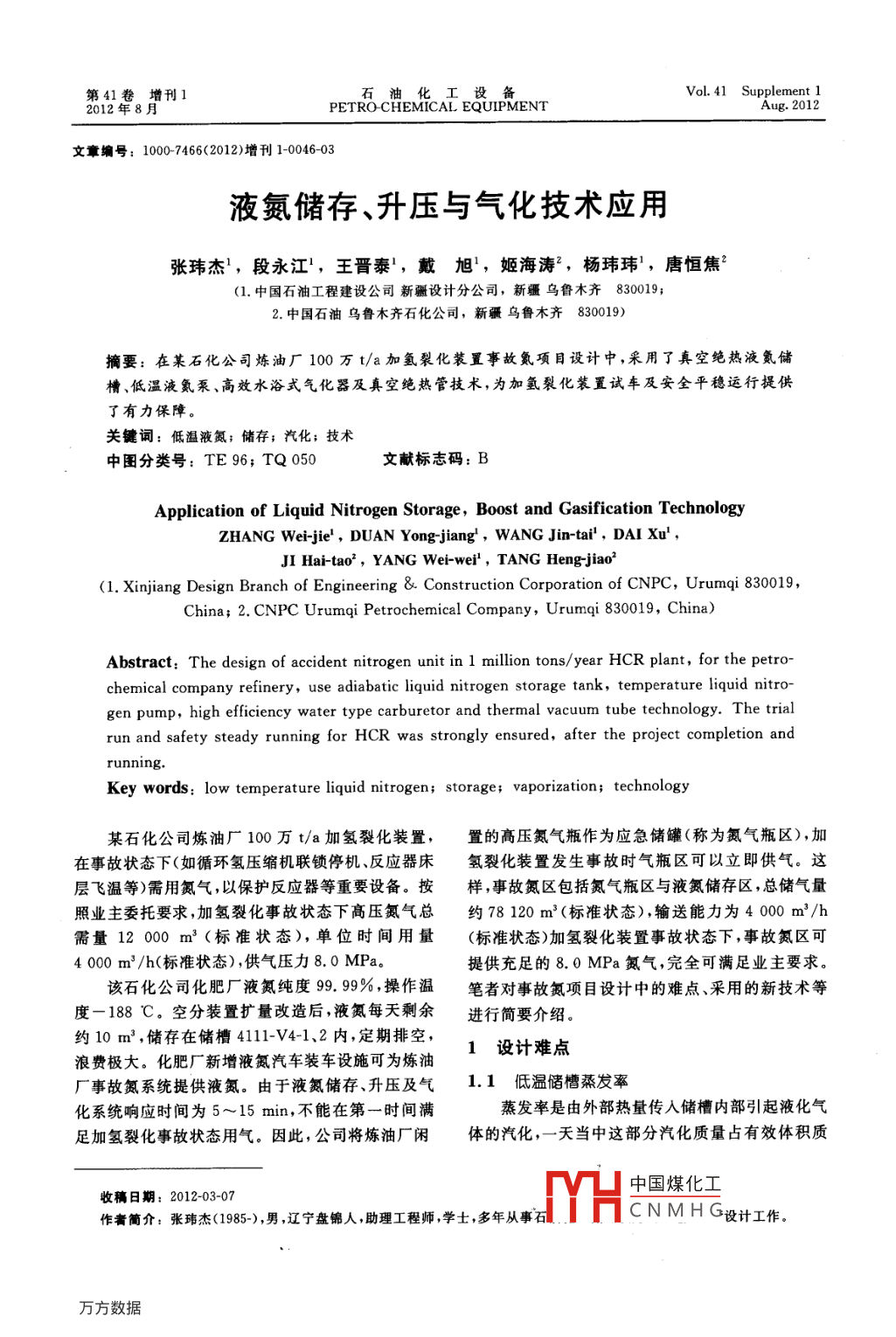 第41卷增刊1石油化工設(shè)備Vol 41 Supplement 12012年8月PETRO-CHEMICAL EQUIPMENTAug.2012文章編號:10007466(2012)增刊1-0046-03液氮儲存、升壓與氣化技術(shù)應(yīng)用張瑋杰,段永江,王晉泰,戴旭,姬海濤2,楊瑋瑋,唐恒焦(1.中國石油工程建設(shè)公司新疆設(shè)計分公司,新疆烏魯木齊830019;2中國石油烏魯木齊石化公司,新疆烏魯木齊830019)摘要:在某石化公司煉油廠100萬t/a加氫裂化裝置事故氮項目設(shè)計中,采用了真空絕熱液氪儲槽、低溫液氮泵、高效水浴式氣化器及真空絕熱管技術(shù),為加氫裂化裝置試車及安全平穩(wěn)運行提供了有力保障關(guān)鍵詞:低溫液氮;儲存;汽化;技術(shù)中圖分類號:TE96;TQ050文獻(xiàn)標(biāo)志碼:BApplication of Liquid Nitrogen Storage, Boost and Gasification TechnologyZHANG Wei-jie, DUAN Yong-jiang, WANG Jin-tai", DAI XuJI Hai-tao, YANG Wei-wei, TANG Heng-jiao(1. Xinjiang Design Branch of Engineering Construction Corporation of CNPC, Urumqi 830019China: 2. CNPC Urumqi Petrochemical Company, Urumqi 830019, China)Abstract: The design of accident nitrogen unit in 1 million tons/year HCR plant, for the petrochemical company refinery, use adiabatic liquid nitrogen storage tank, temperature liquid nitrogen pump, high efficiency water type carburetor and thermal vacuum tube technology. The trialrun and safety steady running for HCR was strongly ensured, after the project completion andKey words: low temperature liquid nitrogen; storage; vaporization; technology某石化公司煉油廠100萬t/a加氫裂化裝置,置的高壓氮氣瓶作為應(yīng)急儲罐(稱為氮氣瓶區(qū)),加在事故狀態(tài)下(如循環(huán)氫壓縮機(jī)聯(lián)鎖停機(jī)、反應(yīng)器床氫裂化裝置發(fā)生事故時氣瓶區(qū)可以立即供氣。這層飛溫等)需用氮氣,以保護(hù)反應(yīng)器等重要設(shè)備。按樣,事故氮區(qū)包括氮氣瓶區(qū)與液氮儲存區(qū),總儲氣量照業(yè)主委托要求,加氫裂化事故狀態(tài)下高壓氮氣總約78120m3(標(biāo)準(zhǔn)狀態(tài))輸送能力為4000m3/h需量12000m3(標(biāo)準(zhǔn)狀態(tài)),單位時間用量(標(biāo)準(zhǔn)狀態(tài))加氫裂化裝置事故狀態(tài)下,事故氮區(qū)可4000m3/h(標(biāo)準(zhǔn)狀態(tài)),供氣壓力8.0MPa。提供充足的8.0MPa氮氣,完全可滿足業(yè)主要求該石化公司化肥廠液氮純度9.99%,操作溫筆者對事故氮項目設(shè)計中的難點、采用的新技術(shù)等度-188℃??辗盅b置擴(kuò)量改造后,液氮每天剩余進(jìn)行簡要介紹。約10m3,儲存在儲槽4111V4-1、2內(nèi),定期排空,浪費極大?;蕪S新增液氮汽車裝車設(shè)施可為煉油1設(shè)計難點廠事故氮系統(tǒng)提供液氮。由于液氮儲存、升壓及氣1.1低溫儲槽桑發(fā)率化系統(tǒng)響應(yīng)時間為5~15min,不能在第一時間滿蒸發(fā)率是由外部熱量傳入儲槽內(nèi)部引起液化氣足加氫裂化事故狀態(tài)用氣。因此,公司將煉油廠閑體的汽化,一天當(dāng)中這部分汽化質(zhì)量占有效體積質(zhì)dhA中國煤化工收稿日期:201203-07作者簡介:張瑋杰(1985-),男,遼寧盤錦人,助理工程師學(xué)士,多年從事CNMHG設(shè)計工作增刊1張瑋杰,等:液氮儲存、升壓與氣化技術(shù)應(yīng)用量的比例。儲槽內(nèi)部的熱量主要由夾層絕熱材料、槽,主要由以下3部分組成內(nèi)筒與外筒之間的固定座、各種從內(nèi)筒到外筒的管(1)筒體儲槽為雙層圓筒形結(jié)構(gòu),外封頭選用路以及其它設(shè)計構(gòu)件傳入。絕熱材料的選擇對蒸發(fā)碟形封頭,內(nèi)筒及其配管均用奧氏體不銹鋼制造,外率有很大的影響筒用16MnR制造,夾層充滿絕熱珠光砂并抽真空,1.2低溫液氮泵出口壓力同時設(shè)置了經(jīng)過特殊處理的吸附劑,以延長儲槽的液氮經(jīng)低溫液氮泵升壓至8.0MPa后進(jìn)入氣壽命?;?1,方可得到該壓力下的氣體(2)安全裝置及控制系統(tǒng)儲槽內(nèi)外筒均設(shè)有1.3低溫液氨管道保冷性能安全裝置,內(nèi)筒有2組安全閥和內(nèi)筒防爆裝置,外筒液氮與環(huán)境有約200℃的溫差,常用的保溫方有防爆裝置。內(nèi)筒安全裝置主要由2套安全閥爆法在低溫液體輸送過程中冷量損失很大,尤其泵破片組成,一用一備,用以防止因真空失效、增壓過人口容易產(chǎn)生氣蝕快引起內(nèi)筒升壓超過使用限度造成強(qiáng)度破壞、泄漏。用戶在使用前應(yīng)按《壓力容器安全監(jiān)察規(guī)程》要求進(jìn)2設(shè)計內(nèi)容行校驗方可使用。外筒防爆裝置用以防止因意外事故造成真空失效、內(nèi)筒泄漏造成夾層內(nèi)部壓力上2.1工藝方案升。將煉油廠閑置的高壓氮氣瓶作為應(yīng)急儲罐,加(3)操作系統(tǒng)儲槽上設(shè)置有各種閥門,閥門布?xì)淞鸦鹿薁顟B(tài)時氣瓶區(qū)可以立即供氣,但供氣量置于儲槽底部周圍。①充裝口。充裝口設(shè)置有液體不足。由于氣瓶占地過大,為節(jié)省土地,利用液氮氣進(jìn)、出口閥及快速接頭,便于向儲槽內(nèi)進(jìn)液、卸液液相壓縮比高的特點,新建了液氮儲槽、液氮泵、氣②增壓器及壓力調(diào)節(jié)裝置。增壓器布置在儲槽外下化器液氮槽車以及相應(yīng)設(shè)施,以彌補(bǔ)氣瓶供氣量不部。壓力調(diào)節(jié)裝置由增壓閥、減壓閥、安全閥、增壓足的問題,液氮升壓、氣化后供應(yīng)到加氫裂化裝置器、進(jìn)液閥及回氣閥組成,用戶根據(jù)需求調(diào)節(jié)相應(yīng)閥使用的液氮來自該石化公司化肥廠,通過液氮槽車門,儲槽即可排出需求壓力