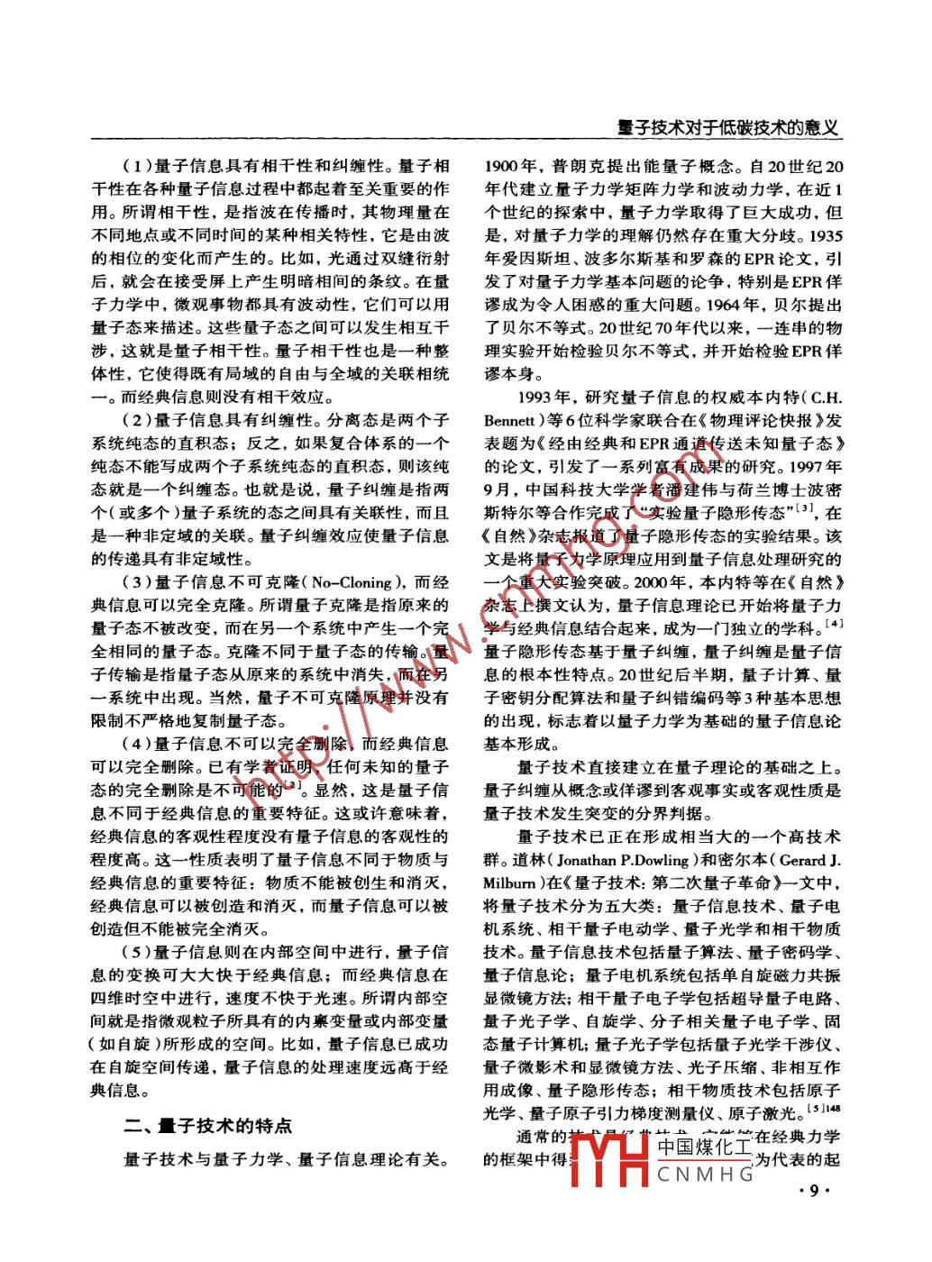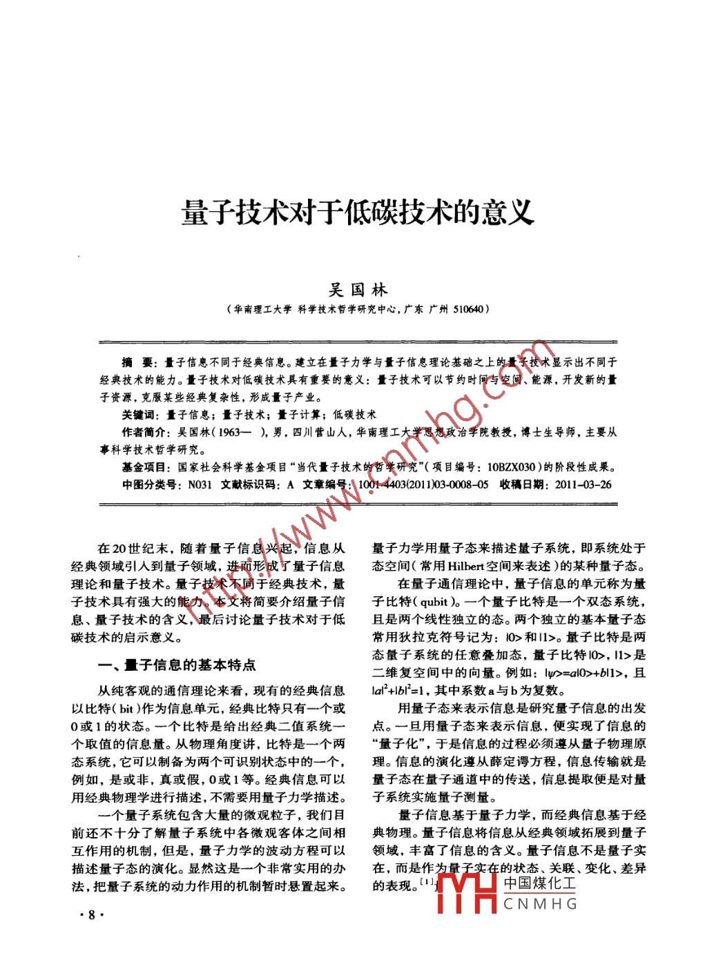 量子技術(shù)對(duì)于低碳技術(shù)的意義吳國(guó)林(華南理工大學(xué)科學(xué)技術(shù)哲學(xué)研究中心,廣東廣州510640)摘要:量子信息不同于經(jīng)典信息。建立在量子力學(xué)與量子信息理論基礎(chǔ)之上的量子技術(shù)顯示出不同于經(jīng)典技術(shù)的能力。量子技術(shù)對(duì)低碳技術(shù)具有重要的意義:量子技術(shù)可以節(jié)約時(shí)間與空間、能源,開發(fā)新的量子資源,克服某些經(jīng)典復(fù)雜性,形成量子產(chǎn)業(yè)。關(guān)鍵詞:量子信息;量子技術(shù);量子計(jì)算;低碳技術(shù)作者簡(jiǎn)介:吳國(guó)林(1963- - ), 男,四川營(yíng)山人,華南理工大學(xué)思想政治學(xué)院教授,博士生導(dǎo)師,主要從事科學(xué)技術(shù)哲學(xué)研究?;痦?xiàng)目:國(guó)家社會(huì)科學(xué)基金項(xiàng)目“當(dāng)代量子技術(shù)的哲學(xué)研究”(項(xiàng)目編號(hào): 10BZX030)的階段性成果。中圖分類號(hào): N031文獻(xiàn)標(biāo)識(shí)碼: A文章編號(hào): 1001-4403(2011)03-0008 -05收稿日期: 2011-03-26在20世紀(jì)末,隨著量子信息興起,信息從量子力學(xué)用量子態(tài)來(lái)描述量子系統(tǒng),即系統(tǒng)處于經(jīng)典領(lǐng)域引人到量子領(lǐng)域,進(jìn)而形成了量子信息態(tài)空間(常用Hilbert空間來(lái)表述)的某種量子態(tài)。理論和量子技術(shù)。量子技術(shù)不同于經(jīng)典技術(shù),量在量子通信理論中,量子信息的單元稱為量子技術(shù)具有強(qiáng)大的能力。本文將簡(jiǎn)要介紹量子信子比特( qubit)。一個(gè)量子比特是-一個(gè)雙態(tài)系統(tǒng),息、量子技術(shù)的含義,最后討論量子技術(shù)對(duì)于低且是兩個(gè)線性獨(dú)立的態(tài)。兩個(gè)獨(dú)立的基本量子態(tài)碳技術(shù)的啟示意義。常用狄拉克符號(hào)記為: 10> 和1>。量子比特是兩態(tài)量子系統(tǒng)的任意疊加態(tài),量子比特10>, I1>是--.f子信息的基本特點(diǎn)二維復(fù)空間中的向量。例如: ly>= =al0>+bl1>,且從純客觀的通信理論來(lái)看,現(xiàn)有的經(jīng)典信息al+lb1=1,其中系數(shù)a與b為復(fù)數(shù)。以比特( bit )作為信息單元,經(jīng)典比特只有一個(gè)或用量子態(tài)來(lái)表示信息是研究量子信息的出發(fā)0或1的狀態(tài)。一個(gè)比特是給出經(jīng)典二值系統(tǒng)一點(diǎn)。一旦用量子態(tài)來(lái)表示信息,便實(shí)現(xiàn)了信息的個(gè)取值的信息量。從物理角度講,比特是-一個(gè)兩“量子化”,于是信息的過(guò)程必須遵從量子物理原態(tài)系統(tǒng),它可以制備為兩個(gè)可識(shí)別狀態(tài)中的一個(gè),理。信息的演化遵從薛定諤方程,信息傳輸就是例如,是或非,真或假, 0或1等。經(jīng)典信息可以量子態(tài)在量子通道中的傳送,信息提取便是對(duì)量用經(jīng)典物理學(xué)進(jìn)行描述,不需要用量子力學(xué)描述。子系統(tǒng)實(shí)施量子測(cè)量。-個(gè)量子系統(tǒng)包含大量的微觀粒子,我們目量子信息基于量子力學(xué),而經(jīng)典信息基于經(jīng)前還不十分了解量子系統(tǒng)中各微觀客體之間相典物理。量子信息將信息從經(jīng)典領(lǐng)域拓展到量子互作用的機(jī)制,但是,量子力學(xué)的波動(dòng)方程可以領(lǐng)域,豐富了信息的含義。量子信息不是量子實(shí)描述量子態(tài)的演化。顯然這是一一個(gè)非常實(shí)用的辦在,而是作為量子實(shí)在的狀態(tài)、關(guān)聯(lián)、變化、差異法,把量子系統(tǒng)的動(dòng)力作用的機(jī)制暫時(shí)懸置起來(lái)。的表現(xiàn)。中國(guó)煤化工fYHCNMH G .●8..量子技術(shù)對(duì)于低碳技術(shù)的意義(1 )量子信息具有相干性和糾纏性。量子相1900年,普朗克提出能量子概念。自20世紀(jì)20干性在各種量子信息過(guò)程中都起著至關(guān)重要的作年代建立量子力學(xué)矩陣力學(xué)和波動(dòng)力學(xué),在近1用。所謂相干性,是指波在傳播時(shí),其物理量在個(gè)世紀(jì)的探索中,量子力學(xué)取得了巨大成功,但不同地點(diǎn)或不同時(shí)間的某種相關(guān)特性,它是由波是,對(duì)量子力學(xué)的理解仍然存在重大分歧。1935的相位的變化而產(chǎn)生的。比如,光通過(guò)雙縫術(shù)射年愛因斯坦、波多爾斯基和羅森的EPR論文,引后,就會(huì)在接受屏上產(chǎn)生明暗相間的條紋。在量發(fā)了對(duì)量子力學(xué)基本問題的論爭(zhēng),特別是EPR佯子力學(xué)中,微觀事物都具有波動(dòng)性,它們可以用謬成為令人困惑的重大問題。1964年,貝爾提出量子態(tài)來(lái)描述。這些量子態(tài)之間可以發(fā)生相互千了貝爾不等式。20世紀(jì)70年代以來(lái),-連串的物涉,這就是量子相干性。量子相干性也是一種整理實(shí)驗(yàn)開始檢驗(yàn)貝爾不等式,并開始檢驗(yàn)EPR佯體性,它使得既有局域的自由與全域的關(guān)聯(lián)相統(tǒng)謬本身。一。而經(jīng)典信息則沒有相干效應(yīng)。1993年,研究量子信息的權(quán)威本內(nèi)特(C.H.(2)量子信息具有糾纏性。分離態(tài)是兩個(gè)子Bennett )等6位科學(xué)家聯(lián)合在《物理評(píng)論快報(bào)》發(fā)系統(tǒng)純態(tài)的直積態(tài);反之,如果復(fù)合體系的一個(gè)表題為《經(jīng)由經(jīng)典和EPR通道傳送未知量子態(tài)》純態(tài)不能寫成兩個(gè)子系統(tǒn