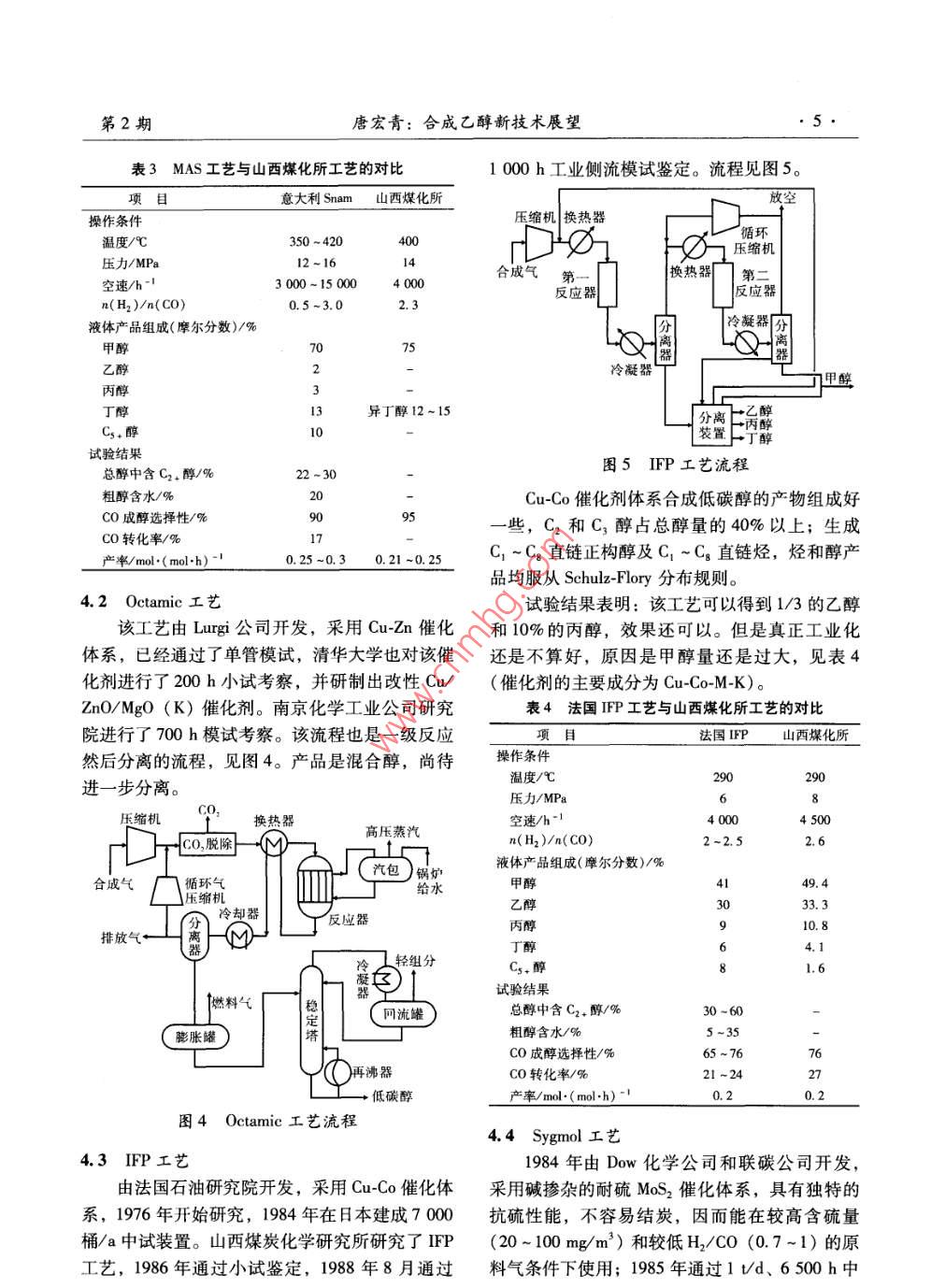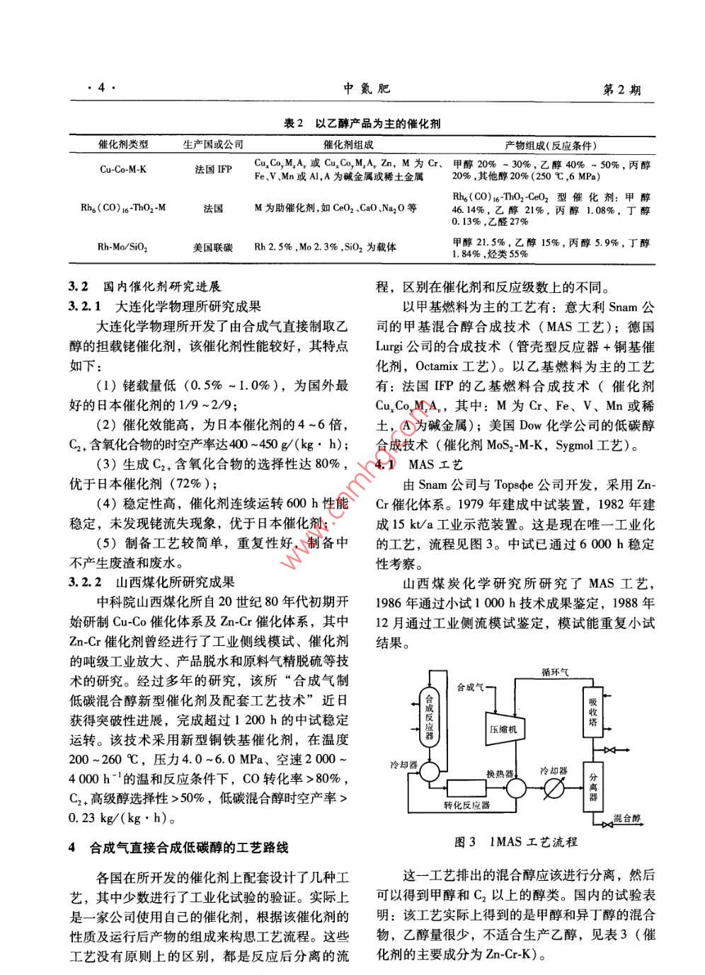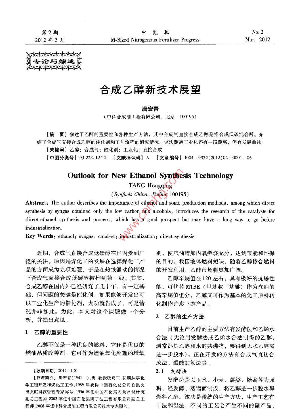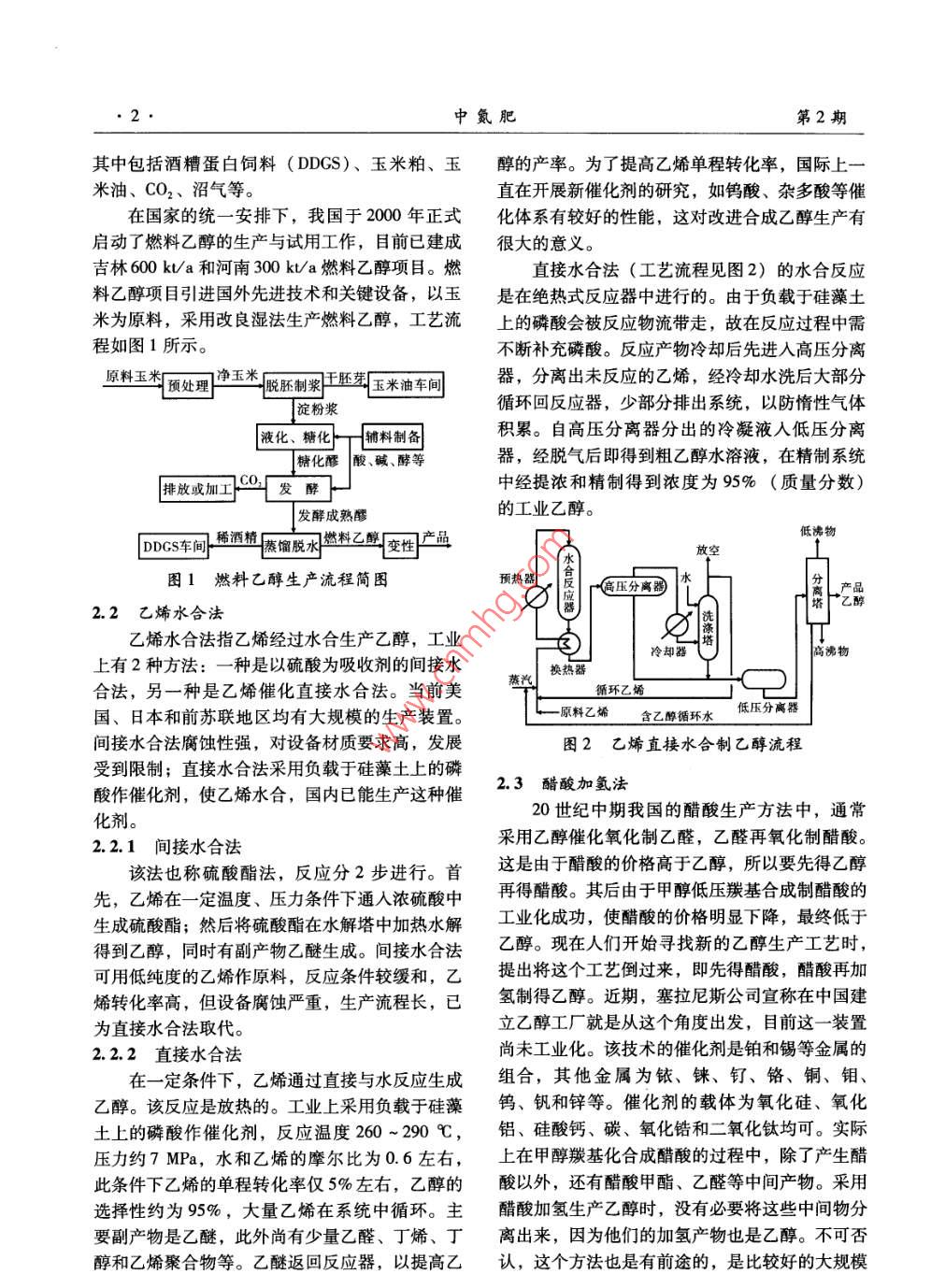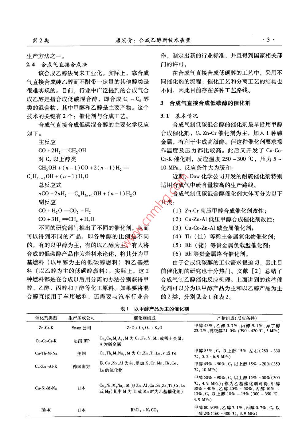第2期中氮肥 No.22012年3月 M-Sized Nitrogenous Fertilizer ProgressMar.2012 cakookolookgalGolookookay專論與綜述合成乙醇新技術(shù)展望唐宏青(中科合成油工程有限公司,北京100195)摘要]敘述了乙醇的重要性和各種生產(chǎn)方法,其中合成氣直接合成乙醇是指合成低碳混合醇。介紹了合成氣直接合成乙醇的催化劑和工藝流程的研究情況。該法距離工業(yè)化還有一段距離,但有發(fā)展前途。關(guān)鍵詞]乙醇;合成氣;催化劑;工業(yè)化;直接合成中圖分類號(hào)]TQ223.122[文獻(xiàn)標(biāo)識(shí)碼]A【文章編號(hào)】1004-9932(2012)02-0001-06 Outlook for New Ethanol Synthesis Technology TANG Hongqing (Synfuels China, Beijing 100195) Abstract: The author describes the importance of ethanol and some production methods, among which direct synthesis by syngas obtained only the low carbon mix alcohols, introduces the research of the catalysts for direct ethanol synthesis and process, which has a good prospect but may have a long way to go before industrialization. Key Words: ethanol; syngas; catalyst; industrialization; direct synthesis近期,合成氣直接合成低碳醇在國內(nèi)受到廣劑,使汽油增加內(nèi)氧燃燒充分,達(dá)到節(jié)能和環(huán)保泛的關(guān)注。原因是煤化工的發(fā)展在選擇煤化工產(chǎn)的目的。我國液體燃料短缺,隨著乙醇摻合燃料品的方面成為立項(xiàng)難題,于是在熱錢涌動(dòng)的情況的開發(fā)利用,乙醇市場將更加廣闊。下合成氣直接合成低碳醇被推到第一線。其實(shí),乙醇辛烷值在120左右,具有極好的抗爆性合成乙醇在國內(nèi)外已經(jīng)研究了幾十年,有一定基能,可代替MTBE(甲基叔丁基醚)作為汽油的礎(chǔ),但問題的關(guān)鍵是催化劑,如果能夠開發(fā)出可高辛烷值組分。乙醇又可作為基本的化工原料轉(zhuǎn)以工業(yè)化生產(chǎn)的催化劑,大功就告成了??墒乔榛谱髟S多下游產(chǎn)品。況并非如此。為此,本文對這個(gè)課題做一個(gè)分析,并提出意見。2乙醇的生產(chǎn)方法1乙醇的重要性目前生產(chǎn)乙醇的主要方法有發(fā)酵法和乙烯水合法(無論用發(fā)酵法或乙烯水合法制得的乙醇,乙醇不僅是一種優(yōu)良的燃料,它還是優(yōu)良的通常都是乙醇和水的共沸物,要得到無水乙醇需燃油品質(zhì)改善劑。它可作為燃油氧化處理的增氧進(jìn)一步脫水),正在開發(fā)的方法有合成氣直接合成法、醋酸加氫法等。收稿日期2011-1102.1發(fā)酵法[作者簡介唐宏青(1941一),男,教授級(jí)高工,長期從事化發(fā)酵法是以玉米、小麥、薯類、糖蜜等為原學(xué)工程開發(fā)和煤化工工作,1989年獲得中國石化總公司首批突出貢獻(xiàn)科技管理專家稱號(hào),1996年任中國石化集團(tuán)蘭州設(shè)計(jì)院料,經(jīng)發(fā)酵、蒸餾而制成,將乙醇進(jìn)一步脫水得副總工程師,2003年任中國石化集團(tuán)寧波工程有限公司副總工燃料乙醇。該法是傳統(tǒng)的生產(chǎn)方法,生產(chǎn)工藝有程師,2008年任中科合成油工程有限公司技術(shù)專家顧問。干法和濕法,不同的工藝會(huì)產(chǎn)生不同的副產(chǎn)品,2中氮肥第2期其中包括酒糟蛋白飼料(DDGS)、玉米粕、玉醇的產(chǎn)率。為了提高乙烯單程轉(zhuǎn)化率,國際上一米油、CO2、沼氣等。直在開展新催化劑的研究,如鎢酸、雜多酸等催在國家的統(tǒng)一安排下,我國于2000年正式化體系有較好的性能,這對改進(jìn)合成乙醇生產(chǎn)有啟動(dòng)了燃料乙醇的生產(chǎn)與試用工作,目前已建成很大的意義。吉林600ka和河南30kta燃料乙醇項(xiàng)目燃直接水合法(工藝流程見圖2)的水合反應(yīng)料乙醇項(xiàng)目引進(jìn)國外先進(jìn)技術(shù)和關(guān)鍵設(shè)備,以玉是在絕熱式反應(yīng)器中進(jìn)行的。由于負(fù)載于硅藻土米為原料,采用改良濕法生產(chǎn)燃料乙醇,工藝流上的磷酸會(huì)被反應(yīng)物流帶走,故在反應(yīng)過程中需程如圖1所示。不斷補(bǔ)充磷酸。反應(yīng)產(chǎn)物冷卻后先進(jìn)入高壓分離原料玉米預(yù)處理凈玉米脫胚制漿胚芽玉米油車間器,分離出未反應(yīng)的乙烯,經(jīng)冷卻水洗后大部分淀粉漿循環(huán)回反應(yīng)器,少部分排出系統(tǒng),以防惰性氣體液化、糖化輔料制備積累。自高壓分離器分出的冷凝液入低壓分離糖化醪酸、堿、酵等器,經(jīng)脫氣后即得到粗乙醇水溶液,在精制系統(tǒng)排放或加工發(fā)酵中經(jīng)提濃和精制得到濃度為95%(質(zhì)量分?jǐn)?shù))發(fā)酵成熟醪的工業(yè)乙醇。DDGS車間稀酒精蒸餾脫水燃料乙醇變性品低沸物放空圖1燃料乙醇生產(chǎn)流程簡圖預(yù)熱器食反高壓分離器2.2乙烯水合法乙醇乙烯水合法指乙烯經(jīng)過水合生產(chǎn)乙醇,工業(yè)冷卻器高沸物上有2種方法:一種是以硫酸為吸收劑的間接水換熱器合法,另一種是乙烯催化直接水合法。當(dāng)前美循環(huán)乙烯國、日本和前蘇聯(lián)地區(qū)均有大規(guī)模的生產(chǎn)裝置。一原料乙烯含乙醇循環(huán)水低分離器間接水合法腐蝕性強(qiáng),對設(shè)備材質(zhì)要求高,發(fā)展圖2乙烯直接水合制乙醇流程受到限制;直接水合法采用負(fù)載于硅藻土上的磷酸作催化劑,使乙烯水合,國內(nèi)已能生產(chǎn)這種催2.3醋酸加氫法化劑。20世紀(jì)中期我國的醋酸生產(chǎn)方法中,通常2.2.1間接水合法采用乙醇催化氧化制乙醛,乙醛再氧化制醋酸。該法也稱硫酸酯法,反