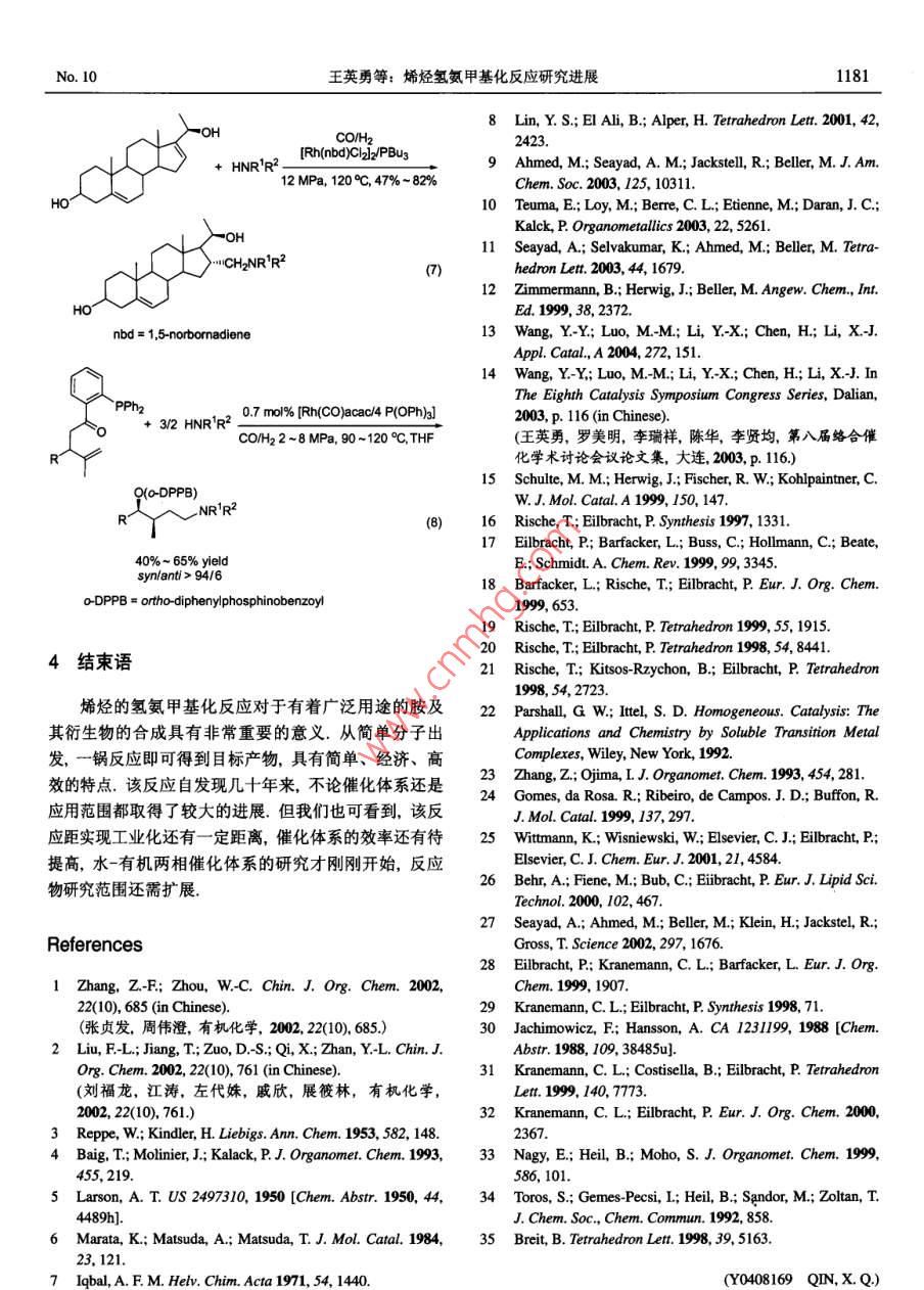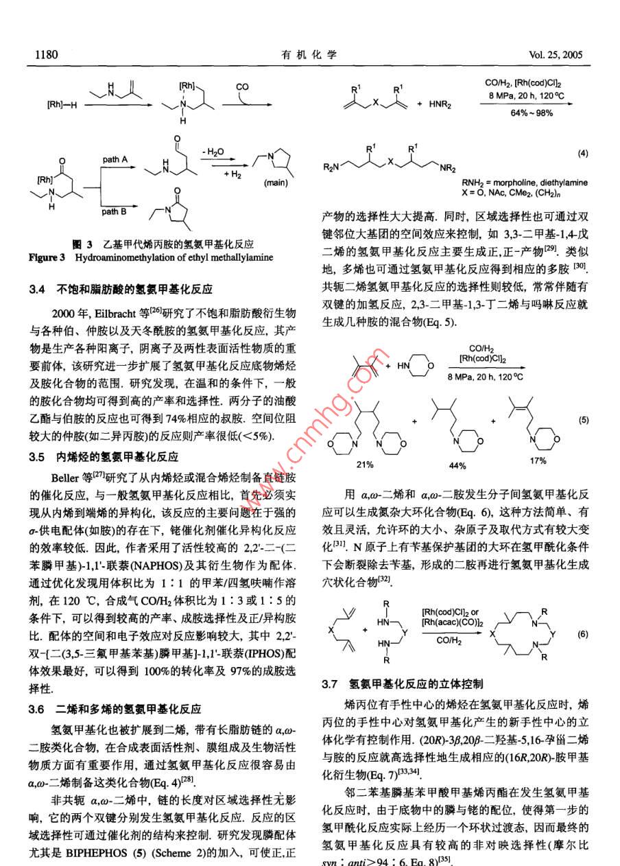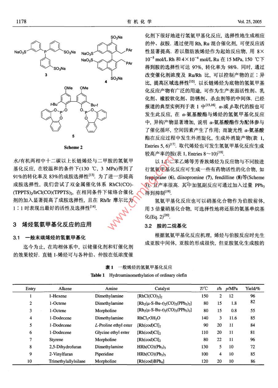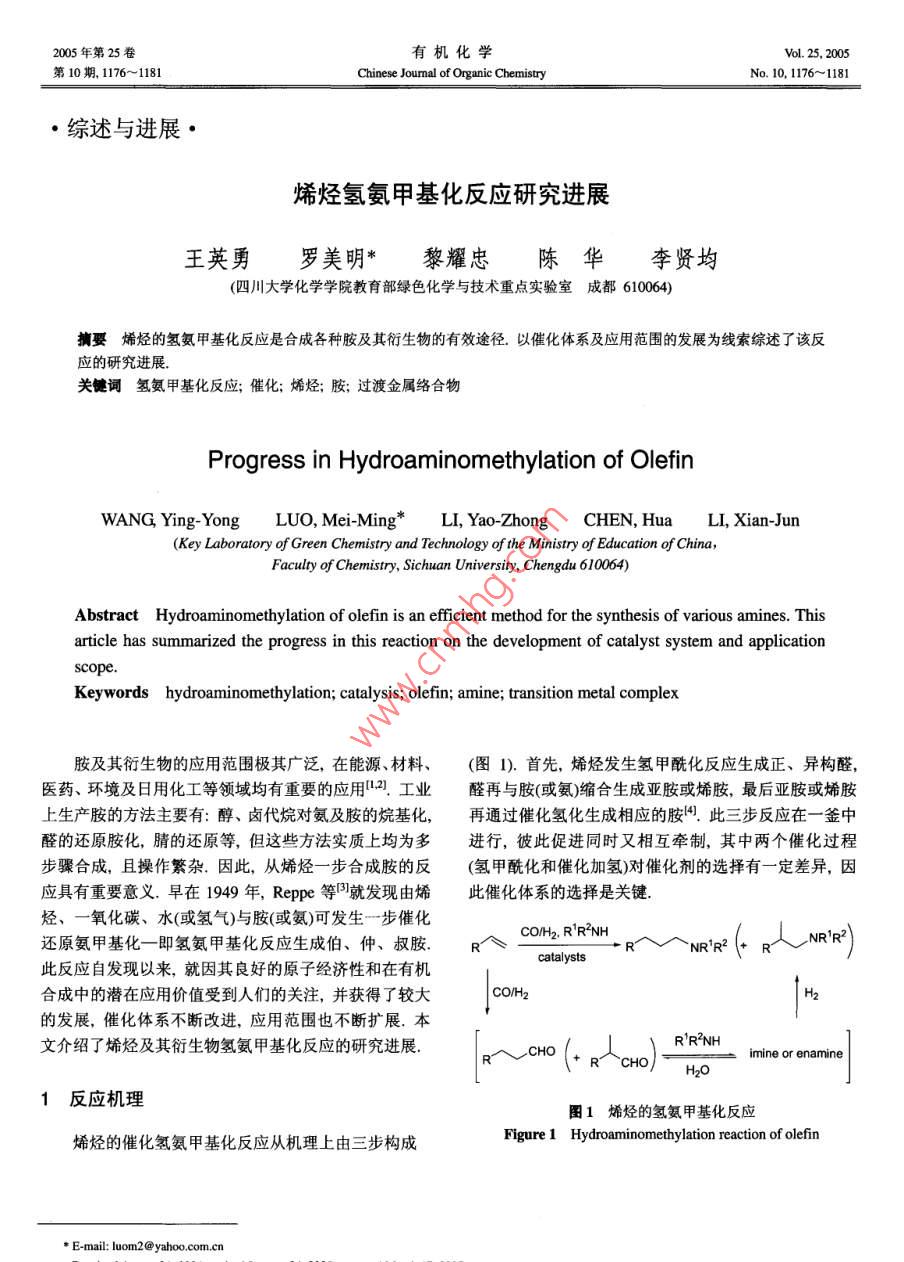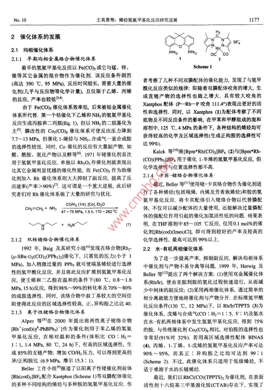 2005年第25卷有機化學(xué)Vol. 25, 2005第10期, 1176~1181Chin| of OrgarChemistryNo. 10, 1176~1181●綜述與進展●烯烴氫氨甲基化反.應(yīng)研究進展王英勇羅美明*黎耀忠陳華李賢均(四川大學(xué)化學(xué)學(xué)院教育部綠色化學(xué)與技術(shù)重點實驗室成都610064)摘娶烯烴的氫氨甲基化反應(yīng)是 合成各種胺及其衍生物的有效途徑.以催化體系及應(yīng)用范圍的發(fā)展為線索綜述了該反應(yīng)的研究進展.關(guān)鍵詞氫氨甲基化反應(yīng); 催化;烯烴;胺;過渡金屬絡(luò)合物Progress in Hydroaminomethylation of OlefinWANG, Ying- YongLUO, Mei-Ming*LI, Yao-ZhongCHEN, HuaLI, Xian-Jun(Key Laboratory of Green Chemistry and Technology of the Ministry of Education of China,Faculty of Chemistry, Sichuan Universit, Chengdu 610064)Abstract Hydroaminomethylation of olefin is an efficient method for the synthesis of various amines. Thisarticle has summarized the progress in this reaction on the development of catalyst system and applicationscope.Keywords hydroaminomethylation; catalysis; olefin; amine; transition metal complex胺及其衍生物的應(yīng)用范圍極其廣泛,在能源、材料、(圖1). 首先,烯烴發(fā)生氫甲?;磻?yīng)生成正、異構(gòu)醛,醫(yī)藥、環(huán)境及日用化工等領(lǐng)域均有重要的應(yīng)用121.工業(yè)醛再與胺(或氨)縮合生成亞胺或烯胺,最后亞胺或烯胺上生產(chǎn)胺的方法主要有:醇、鹵代烷對氨及胺的烷基化,再通過催化氫化生成相應(yīng)的胺用此三步反應(yīng)在一釜中醛的還原胺化,腈的還原等,但這些方法實質(zhì)上均為多進行,彼此促進同時又相互牽制,其中兩個催化過程步驟合成,且操作繁雜.因此,從烯烴一步合成胺的反(氫甲?;痛呋託?對催化劑的選擇有-定差異,因.應(yīng)具有重要意義.早在1949年, Reppe等)就發(fā)現(xiàn)由烯此催化體系的選擇是關(guān)鍵.烴、一氧化碳、水(或氫氣)與胺(或氨)可發(fā)生一步催化還原氨甲基化- -即氫氨甲基化反應(yīng)生成伯、仲、叔胺.R個CO/H2. R'R?NHNR'R2NR'R2)catalysts此反應(yīng)自發(fā)現(xiàn)以來,就因其良好的原子經(jīng)濟性和在有機合成中的潛在應(yīng)用價值受到人們的關(guān)注,并獲得了較大| COH2Hk的發(fā)展,催化體系不斷改進,應(yīng)用范圍也不斷擴展.本文介紹了烯烴及其衍生物氫氨甲基化反應(yīng)的研究進展.R'RNH(+ R個cHOH2Oimine or enamine1反應(yīng)機理圖1烯烴的氫氨甲基化反應(yīng)Figure 1 Hydroaminomethylation reaction of olefin烯烴的催化氫氨甲基化反應(yīng)從機理上由三步構(gòu)成* E-mail: luom2@yahoo.com.cnReccived August 31, 2004; revised January 24, 2005; accepted March 17, 2005.No. 10王英勇等:烯烴氫氨甲基化反應(yīng)研究進展11772催化體系的發(fā)展BF42.1 均相催化體系PPh2Ph22.1.1早期均相金屬絡(luò) 合物催化體系最早的氫氨甲基化反應(yīng)以Fe(CO)s或它與錳、鋅、Scheme 1鎳等其它金屬的混合物作為催化劑.該反應(yīng)條件劇烈者考察了幾種不同雙膦配體的催化能力,發(fā)現(xiàn)了與氫甲(高達390 C, 95 MPa),反應(yīng)時間較長,需要大量的催酰化反應(yīng)類似的規(guī)律:即隨著雙膦配體咬角的增大,生化劑(幾乎與反應(yīng)物等化學(xué)計量),且僅限于乙烯、丙烯成直鏈產(chǎn)物的選擇性也隨之增大.具有較大咬角的的反應(yīng),產(chǎn)率也較低B34.由于Fe(CO)s 催化體系效率低,后來被鈷金屬催化Xantphos配體(P -Rh- -P咬角11.49)表現(xiàn)出更好的活體系所代替.第一個鈷催化下乙烯和NH3的氫氨甲基化性和選擇性.同時,以Xantphos (1)為配體考察了不同反應(yīng)生成丙胺和二丙胺(Eg.1),但以NH3的二烷基化為底物及不同反應(yīng)條件的影響,在甲苯和甲醇組成的混和主SI.膦改性的Co2(CO); 催化體系可使反應(yīng)壓力降到溶劑中, 125 C, 4 MPa的條件下,各種結(jié)構(gòu)的烯烴均可7.7~ 13 MPa,但催化1-烯烴與NH3、合成氣- -釜合成胺獲得較高的化學(xué)及區(qū)域選擇性(生成正構(gòu)胺的選擇性可的選擇性較低.同時, Co催化的反應(yīng)有大量副產(chǎn)物,如達9%).Kalck等0]將[Bpm* Rh(CO)2]BF4 (2)與[Bpm*Rh-醛、酰胺、氫化產(chǎn)物以及醇等0.1971年銠催化劑首次(CO(PP;)BF4用于催化1-辛烯的氫氨甲基化反應(yīng),但用于氫氨甲基化反應(yīng),單獨以Rh2O3 作催化劑就表現(xiàn)出化學(xué)選擇性與位置選擇性都不高.比其它金屬明顯優(yōu)越的催化性能,而Fe(CO)s 作為助催2.1.4卡賓- 銠絡(luò)合物催化體系化劑加入Rh催化體系則大大抑制了副反應(yīng),提高了反應(yīng)速率(產(chǎn)率>90%)".這可謂是一個重大進展,此后研最近,Beller等"]使用銠-卡賓絡(luò)合物作為催化劑進究者們對Rh催化體系做了大量的研究與優(yōu)化.行了各種烯烴(包括端烯,內(nèi)烯及芳香族烯烴)和胺的氫氨甲基化反應(yīng).將卡賓配體引入銠絡(luò)合物以代替膦配CO/H2 (14). (Co], El2OCH2=CH2+ NH347~ 75 MPa, 1.5h, 170~ 262°C體,不僅可以減少配體的大量使用,還能解決過量膦配體的強配位作用引起的催化加氫活性低的問題.結(jié)果表+ HN^V明,在THF溶劑中85~105 C反應(yīng),僅用0.1 mol%的催化劑[Rh(cod)(Imes)CI],即可得到較好的產(chǎn)率及較高的2.1.2雙核銠絡(luò) 合物催化體系化學(xué)選擇性,最高可達到9%以上.1992年, Baig 及其研究小組4發(fā)現(xiàn)在絡(luò)合物[Rhx2.2水-有機兩相催化體系(4-SBu- t)2(CO)2(PPh3)2]催化下,只需低的壓力(小于1為了進一步提高產(chǎn)率,抑制副反應(yīng),解決均相體系MPa),加入稍微過量的PPhs 就可使