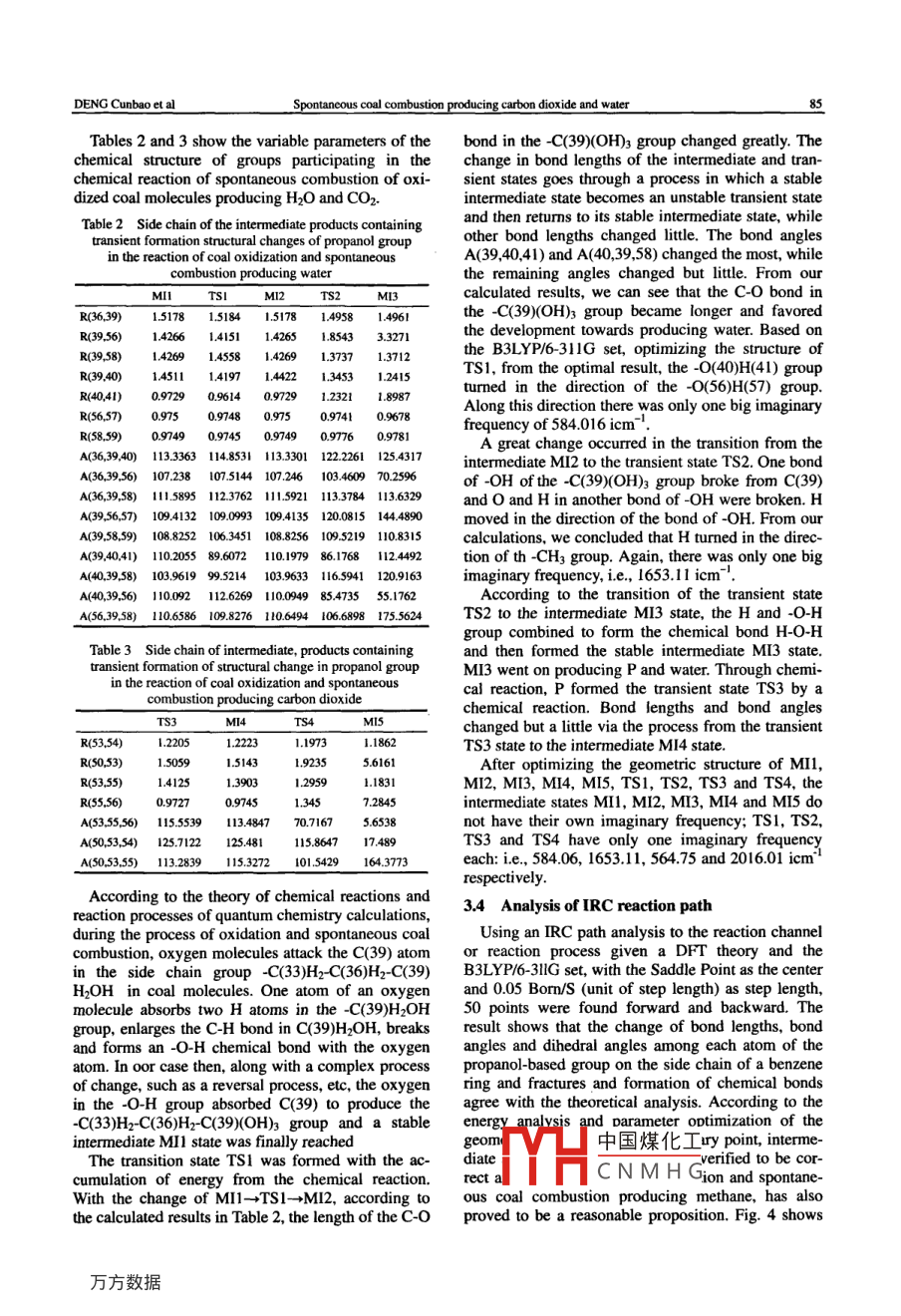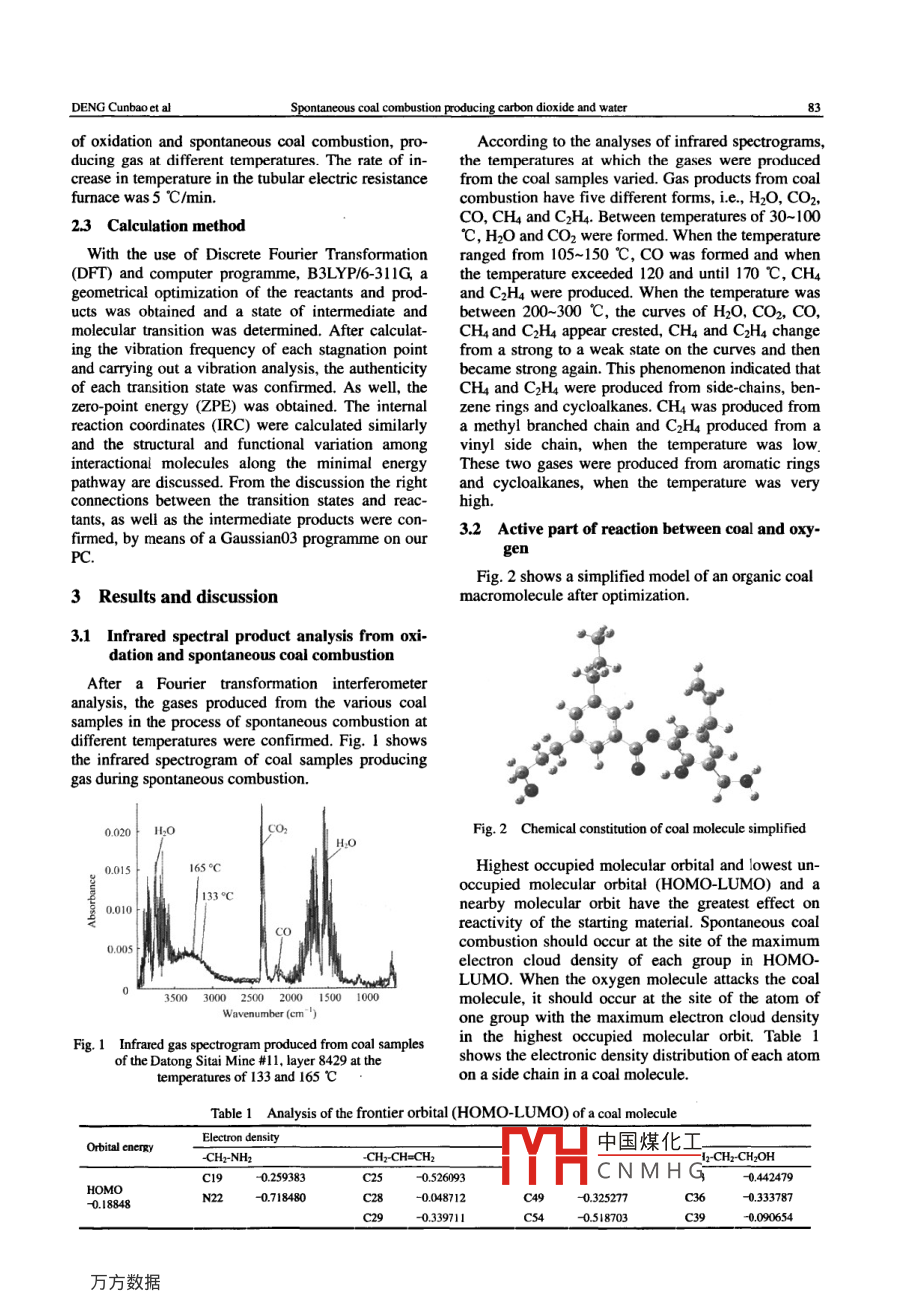 leonlineatwww.sciencedirect.comMININGScienceDirectSCIENCE ANDTECHNOLOGYELSEVIERMining Science and Technology 20(2010)0082-0087www.elsevier.com/locate/jcumtSpontaneous coal combustion producingcarbon dioxide and waterDENG Cunbao,, WANG Jiren, WANG Xuefeng, DENG HanzhongCollege of safety Science and Engineering, Liaoning Technical University Fuxin 123000, ChinaCollege of Materials Science and Engineering, Liaoning Technical University, Fuxin 123000, ChinaAbstract: Gas products from the process of coal oxidization and spontaneous combustion have been studied at different temperatures with FTI spectroscopic tests. With temperatures rising to about 30-100 C, water and carbon dioxide gas were formed andfrom about 105-150 C, carbon monoxide was produced Using the DFT B3LYP method with a 6-311G basis set, the reaction sys-tem, where spontaneous combustion between coal and oxygen occurs and produces water and monoxide, has been studied, with thegeometric configuration for all stagnation points on the potential reaction energy surface optimized. with a frequency analysis andan IRC method, transient formations were tested. Our results indicate that in the reaction of coal oxidization and spontaneous com-bustion producing carbon dioxide and water, oxygen molecules attack carbon atoms of the terminal of the propyl alcohol group onthe lateral chain of benzene rings, which causes this propyl alcohol group to produce the acid (-CH2-CH2-COOH)group and waterThis acid group continues its break up into carbon dioxide and the (-CHy-CH3)ethyl group. We have come to the conclusion thathis water-and-carbon dioxide-production reaction is spontaneous, based on the observation of the energy released by the reactionKeywords: spontaneous coal combustion; infrared spectrum; DFT; reaction mechanismIntroductionpanol group based on the side chain of a benzene ringcauses it to produce a(CH2-CH2-COOH) groupFire, as a result of spontaneous coal combustion, without water. In our empirical investigation andthreatens safety and production in coal mines. Acci- given theoretical methods, the process and mechadents, caused by spontaneous fire not only affectnism of chemical reactions of oxidation and sponta-production but also cause gas and dust explosions andneous coal combustion, producing carbon dioxide andresult in casualties!) of theor national coal water has been studied. This should lay a theoreticalmines in China 47.3% have hazardous conditions. foundation for establishing a theory of spontaneousthreatening spontaneous combustion. For small mines, coal combustionthe figure is 85.3%. Because of spontaneous coalcombustion, about 200 million tons of coal resources 2 Experiment and calculationswill be lost every year in China. The main reason fora lack of control of spontaneous combustion is that 2.1 Reagents and instrumentsthere is, fundamentally, no method to solve its me-chanical problems. Already for a long time, efforts 2.5-i3T and a Fourier transformation infrared specApplying a tubular electric resistance furnace, SKhave been made, both qualitatively and from a mac-roscopic point of view413), to solve the essential astroscope, TEN SOR27, 55 coal samples as the re-pects of spontaneous coal combustion. Due to its agents from coal mining districts such as Datong,complexity, these efforts did not quite manageTiefa, Shuangheshan and Hegang, were analyzedsolve all probles. More recently, spontaneous coal The coal samples were ground less than 50 paticlecombustion has been studied from a microscopicsize unit in the laboratory, dried for 24 hours in apoint of view", but given that in chemical reactionsvacuum and preserved in a drying vesseL.oxygen molecules attack C atoms at the end of a pro- 2.2 Experimental procedureReceived 13 May 2009: accepted 20 July 2009Corresponding author. Tel: 86418 3351708tube中國(guó)煤化工四1E-mailaddressdengcunbao323@163.comCN MHGgen in a proportiondoi:lo.lo6sl6745264(09)601654of 2ared spectrum mapDENG Cunbao et alcoal combustion producing carbon dioxide and wateof oxidation and spontaneous coal combustion,pro-According to the analyses of infrared spectrogramsdifferent temperatures. The rate of in- the temperatures at which the gases were producedcrease in temperature in the tubular electric resistance from the coal samples varied. Gas products from coalfurnace was5℃/min.combustion have five different forms, i. e H2O, CO2,2.3 Calculation methodCO, CH4 and C2H4. Between temperatures of 30-100C, H20 and CO2 were formed. When the temperaturewith the use of Discrete Fourier Transformation ranged from 105-150 C, co was formed and when(DFT) and computer programme, B3LYP/6-3llG a the temperature exceeded 120 and until 170 Cgeometrical optimization of the reactants and prod- and C2Ha were produced. when the temperature wasucts was obtained and a state of intermediate and between 200-300 C, the curves of H2o, co,, comolecular transition was determined. After calculat- CH and C2H4 appear crested, CH4 and C2H4 changeing the vibration frequency of each stagnation point from a strong to a weak state on the curves and thenand carrying out a vibration analysis, the authenticity became strong again. This phenomenon indicated thatof each transition state was confirmed. As well, the CH4 and C2H4 were produced from side-chains, benzero-point energy(ZPE)was obtained. The internal zene rings and cycloalkanes. CH4 was produced fromreaction coordinates (IRC) were calculated similarly a methyl branched chain and C2H4 produced from aand the structural and functional variation among vinyl side chain, when the temperature was lowinteractional molecules along the minimal energy These two gases were produced from aromatic ringspathway are discussed. From the discussion the right and cycloalkanes, when the temperature was veryconnections between the transition states and reac- hightants, as well as the intermediate products were confirmed, by means of a Gaussian03 programme on our 3.2 Active part of reaction between