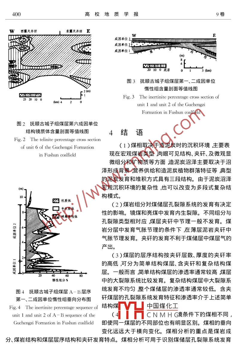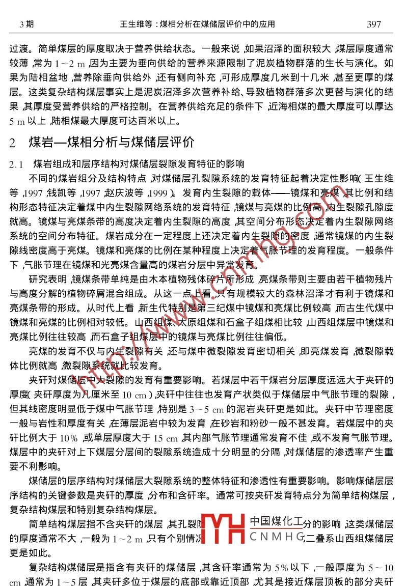 第9卷第3期高校地質(zhì)學(xué)報(bào)Vol.9 No.32003年9月Geological Journal of China UniversitiesSept. 2003煤相分析在煤儲層評價(jià)中的應(yīng)用王生維,陳鐘惠,張明,段連秀,羅善國(中國地質(zhì)大學(xué)(武漢)資源學(xué)院武漢430074 )摘要:煤儲層研究的重要內(nèi)容是孔裂隙系統(tǒng)發(fā)育特征、滲透性及其空間不均-性特征。煤儲層的孔裂隙特征決定煤儲層的滲透性而煤儲層的孔裂隙特征主要取決于煤巖成分和煤級。對一個特定的煤層氣田而言煤級變化不大或者規(guī)律明顯。煤巖成分往往成為控制煤儲層滲透率分布不均性的主導(dǎo)因素。煤巖成分包括有機(jī)顯微組分和礦物質(zhì)均受控于煤相??梢酝ㄟ^系統(tǒng)的煤相分析認(rèn)識煤儲層中煤巖成分、結(jié)構(gòu)、層序等的空間展布特征,為科學(xué)預(yù)測煤儲層的滲透率奠定基礎(chǔ)。煤相分析在注重橫向變化的同時更強(qiáng)調(diào)垂向?qū)有蚍治觥jP(guān)鍵詞:煤相分析;孔裂隙系統(tǒng);滲透率;煤層氣藏不均一性;評價(jià)預(yù)測中圖分類號:P618.11文獻(xiàn)標(biāo)識碼:A文章編號: 1006-7493( 2003 )03-396-061基本原理煤相是煤的原始成因類型,它取決于泥炭形成的環(huán)境( Stach ,1982 )煤相主要反映在煤巖組成方面的差別上包括顯微組分、礦物質(zhì)含量、煤中的肉眼和顯微鏡下可見結(jié)構(gòu)等。煤相或泥炭的形成主要取決于泥炭沼澤形成時的沉積環(huán)境、營養(yǎng)供給和成炭植物群落等條件。不同的泥炭沼澤沉積背景決定著植物群落持續(xù)生長的物質(zhì)總量及其泥炭堆積的厚度、結(jié).構(gòu)、煤巖組成等。例如,由于華北二疊系山西組煤與石炭系太原組煤形成于不同的沉積背景,導(dǎo)致兩者煤巖成分、煤層厚度與結(jié)構(gòu)產(chǎn)生明顯的差別;使得二疊系下石盒子組煤與山西組煤和太原組煤的差別更大集中表現(xiàn)在下石盒子組煤富含礦物質(zhì)、鏡煤與亮煤含量偏低且缺乏大的條帶狀結(jié)構(gòu)、煤巖組分中碎屑組分偏多等方面。即使是同一地區(qū)的同一層煤其內(nèi)部的差別特別是煤巖組成和結(jié)構(gòu)方面的差別也十分明顯。煤巖成分的不均一性極大地影響到煤儲層中孔、裂隙系統(tǒng)的特征及滲透率,而后者正是煤儲層地質(zhì)評價(jià)和研究所關(guān)心的核心內(nèi)容。應(yīng)用煤相分析技術(shù)的主要目的是識別同一煤層或不同煤層之間在煤層成分和結(jié)構(gòu)方面的差別按一定的煤儲層劃分要求從空間上將相近的煤巖成分與結(jié)構(gòu)的煤體區(qū)別開來利用煤相分析原理進(jìn)行合理的相帶識別與劃分。進(jìn)而可將不同煤巖成分和特定的煤體特別是煤中鏡煤與亮煤的含量與結(jié)構(gòu)進(jìn)行合理的劃分進(jìn)中國煤化工價(jià)與預(yù)測。泥炭的發(fā)育與堆積有其自身的規(guī)律其生YHCNMH快在煤層記錄中為典型的三段式結(jié)構(gòu)。底部為富含礦物質(zhì)層鏡煤和亮煤一般不大發(fā)育 ;中部至中.上部為中-低礦物質(zhì)層鏡煤與亮煤的比例較高;頂部一般為富含礦物質(zhì)層或以多個互層的方式與其它沉積環(huán)境基金項(xiàng)目:國家煤層氣973項(xiàng)目課題( 2002CB211702 )資助第一作者簡介:王生維男,1956年生,內(nèi)蒙呼和浩特市人博士教授煤層氣地質(zhì)煤田地質(zhì)。3期王生維等:煤相分析在煤儲層評價(jià)中的應(yīng)用397過渡。簡單煤層的厚度取決于營養(yǎng)供給狀態(tài)。- 般來說如果沼澤的面積較大煤層厚度通常較薄,常為1~2m,因?yàn)橹饕獮榇瓜蚬┙o的營養(yǎng)來源限制了泥炭植物群落的生長與演化。如果為陸相盆地,營養(yǎng)除垂向供給外還有側(cè)向補(bǔ)充,可形成厚度幾米到十幾米甚至更厚的煤層。這類復(fù)雜結(jié)構(gòu)煤層事實(shí)上是泥炭沼澤多次營養(yǎng)補(bǔ)給、導(dǎo)致植物群落多次更替與演化的結(jié)果其厚度受營養(yǎng)供給的嚴(yán)格控制。在營養(yǎng)供給充足的條件下近海相煤的最大厚度可以厚達(dá)5 m以上陸相煤最大厚度可達(dá)百米以上。2煤巖-煤相分析與煤儲層評價(jià)2.1煤巖 組成和層序結(jié)構(gòu)對煤儲層裂隙發(fā)育特征的影響不同的煤巖組分及結(jié)構(gòu)特點(diǎn),對煤儲層孔裂隙系統(tǒng)的發(fā)育特征起著決定性影響(王生維等,1997錢凱等,1997趙慶波等,1999)。發(fā)育內(nèi)生裂隙的載體一鏡煤和亮煤 其比例和結(jié)構(gòu)形態(tài)特征決定著煤中內(nèi)生裂隙網(wǎng)絡(luò)系統(tǒng)的發(fā)育特征鏡煤與亮煤的比例高,內(nèi)生裂隙孔隙度就高。鏡煤與亮煤條帶的高度決定著內(nèi)生裂隙的高度其空間分布形態(tài)決定著內(nèi)生裂隙網(wǎng)絡(luò)系統(tǒng)的空間分布特征。煤巖成分在-定程度上還決定著內(nèi)生裂隙的密度通常鏡煤的內(nèi)生裂隙線密度高于亮煤。鏡煤和亮煤的比例在某種程度.上決定著氣脹節(jié)理的發(fā)育程度。一般條件下氣脹節(jié)理在鏡煤和光亮煤含量高的煤巖分層中異常發(fā)育。研究表明鏡煤條帶單純是由木本植物殘?bào)w碎片所形成亮煤條帶則主要由若干植物殘片與高度分解的植物碎屑混合組成。從這一點(diǎn)上看只有規(guī)模較大的森林沼澤才有利于鏡煤和亮煤條帶的形成。從時代.上看新生代特別是第三紀(jì)煤中鏡煤和亮煤比例較高,而 古生代煤中鏡煤和亮