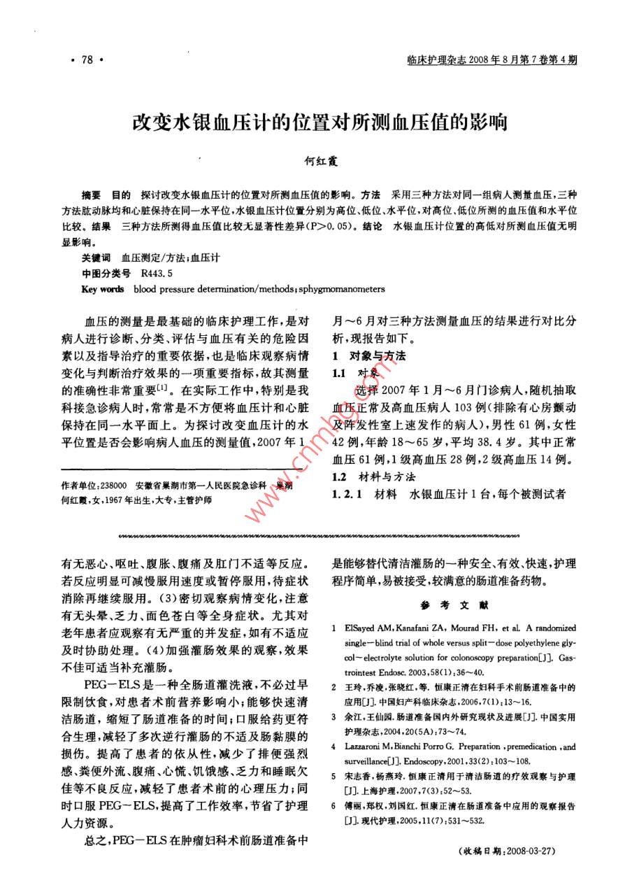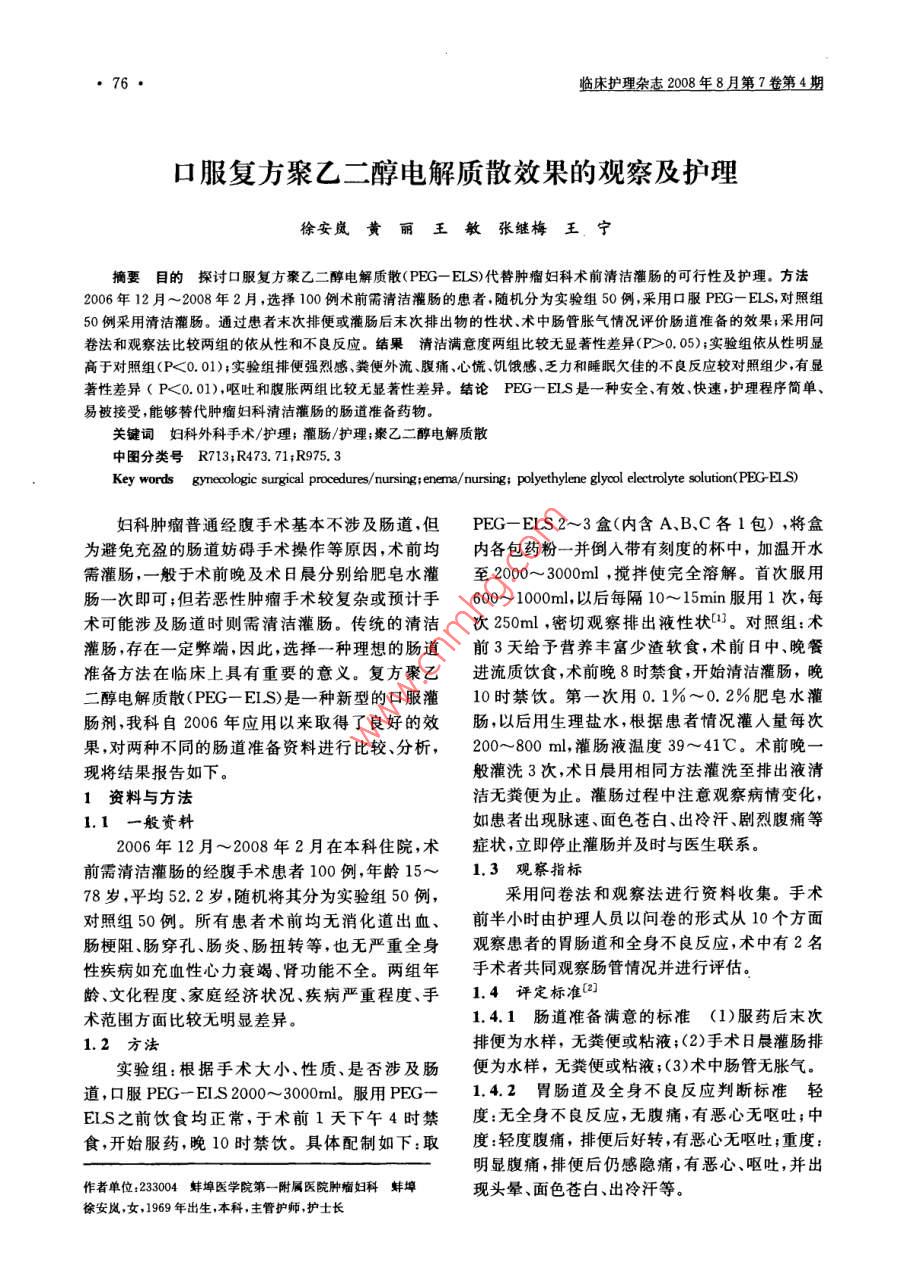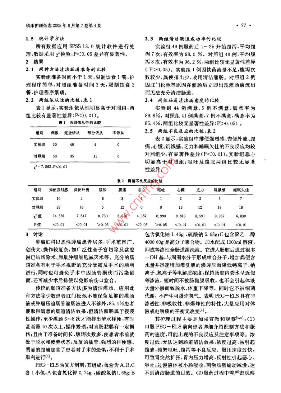 臨床護(hù)理雜志2008年8月第7卷第4期口服復(fù)方聚乙二醇電解質(zhì)散效果的觀察及護(hù)理徐安崴黃麗王敏張繼梅王寧摘要目的探討口服復(fù)方聚乙二醇電解質(zhì)散(PEG一ELS)代替腫瘤婦科術(shù)前清潔灌腸的可行性及護(hù)理。方法2006年12月~2008年2月,選擇100例術(shù)前需清潔灌腸的患者隨機(jī)分為實(shí)驗(yàn)組50例,采用口服PEG-ELS,對(duì)照組50例采用清潔灌腸。通過(guò)患者末次排便或灌腸后末次排出物的性狀、術(shù)中腸管脹氣情況評(píng)價(jià)腸道準(zhǔn)備的效果;采用問(wèn)卷法和觀察法比較兩組的依從性和不良反應(yīng)。結(jié)果清潔滿意度兩組比較無(wú)顯著性差異(P>0,05);實(shí)驗(yàn)組依從性明顯高于對(duì)照組(P<0.01);實(shí)驗(yàn)組排便強(qiáng)烈感、糞便外流、腹痛、心慌、饑餓感、乏力和睡眠欠佳的不良反應(yīng)較對(duì)照組少,有顯著性差異(P<0.01),嘔吐和腹脹兩組比較無(wú)顯著性差異。結(jié)論P(yáng)EG一ELS是一種安全、有效、快速,護(hù)理程序簡(jiǎn)單易被接受,能夠替代腫瘤婦科淸潔藿腸的腸道準(zhǔn)備藥物。關(guān)鍵詞婦科外科手術(shù)/護(hù)理;灌腸/護(hù)理;聚乙二醇電解質(zhì)散中圖分類(lèi)號(hào)R713;R473.71;R975.3Key words gynecologic surgical procedures/ nursing; enema/nursing: polyethylene glycol electrolyte solution(PEG-ELS)婦科腫瘤普通經(jīng)腹手術(shù)基本不涉及腸道,但 PEG-ELS2~3盒(內(nèi)含AB、C各1包),將盒為避免充盈的腸道妨礙手術(shù)操作等原因,術(shù)前均內(nèi)各包藥粉一并倒入帶有刻度的杯中,加溫開(kāi)水需灌腸,一般于術(shù)前晚及術(shù)日晨分別給肥皂水灌至2000~3000ml,攪拌使完全溶解。首次服用腸一次即可;但若惡性腫瘤手術(shù)較復(fù)雜或預(yù)計(jì)手600~1000ml,以后每隔10~15min服用1次,每術(shù)可能涉及腸道時(shí)則需清潔灌腸。傳統(tǒng)的清潔次250ml,密切觀察排出液性狀口3。對(duì)照組:術(shù)灌腸,存在一定弊端,因此,選擇一種理想的腸道前3天給予營(yíng)養(yǎng)豐富少渣軟食,術(shù)前日中晚餐準(zhǔn)備方法在臨床上具有重要的意義。復(fù)方聚乙進(jìn)流質(zhì)飲食,術(shù)前晚8時(shí)禁食,開(kāi)始清潔灌腸,晚醇電解質(zhì)散(PEG一EIS)是一種新型的口服灌10時(shí)禁飲。第一次用0.1%~0.2%肥皂水灌腸劑,我科自2006年應(yīng)用以來(lái)取得了良好的效腸,以后用生理鹽水,根據(jù)患者情況灌人量每次果,對(duì)兩種不同的腸道準(zhǔn)備資料進(jìn)行比較、分析,200~800ml,灌腸液溫度39~4l℃。術(shù)前晚現(xiàn)將結(jié)果報(bào)告如下。般灌洗3次,術(shù)日晨用相同方法灌洗至排出液清1資料與方法潔無(wú)糞便為止。灌腸過(guò)程中注意觀察病情變化,1.1一般資料如患者出現(xiàn)脈速、面色蒼白、出冷汗、劇烈腹痛等2006年12月~2008年2月在本科住院,術(shù)癥狀,立即停止灌腸并及時(shí)與醫(yī)生聯(lián)系。前需清潔灌腸的經(jīng)腹手術(shù)患者100例,年齡15~1.3觀察指標(biāo)78歲,平均52.2歲,隨機(jī)將其分為實(shí)驗(yàn)組50例,采用問(wèn)卷法和觀察法進(jìn)行資料收集。手術(shù)對(duì)照組50例。所有患者術(shù)前均無(wú)消化道出血、前半小時(shí)由護(hù)理人員以問(wèn)卷的形式從10個(gè)方面腸梗阻、腸穿孔、腸炎、腸扭轉(zhuǎn)等,也無(wú)嚴(yán)重全身觀察患者的胃腸道和全身不良反應(yīng),術(shù)中有2名性疾病如充血性心力衰竭、腎功能不全。兩組年手術(shù)者共同觀察腸管情況并進(jìn)行評(píng)估齡、文化程度、家庭經(jīng)濟(jì)狀況、疾病嚴(yán)重程度、手1,4評(píng)定標(biāo)準(zhǔn)術(shù)范圍方面比較無(wú)明顯差異。1.4.1腸道準(zhǔn)備滿意的標(biāo)準(zhǔn)(1)服藥后末次1.2方法排便為水樣,無(wú)糞便或粘液;(2)手術(shù)日晨灌腸排實(shí)驗(yàn)組:根據(jù)手術(shù)大小、性質(zhì)、是否涉及腸便為水樣,無(wú)糞便或粘液;(3)術(shù)中腸管無(wú)脹氣道,口服PEG一EIS2000~3000m。服用PEG-1.4.2胃腸道及全身不良反應(yīng)判斷標(biāo)準(zhǔn)輕ELS之前飲食均正常,于術(shù)前1天下午4時(shí)禁度:無(wú)全身不良反應(yīng),無(wú)腹痛,有惡心無(wú)嘔吐;中食,開(kāi)始服藥,晚10時(shí)禁飲。具體配制如下:取度:輕度腹痛,排便后好轉(zhuǎn),有惡心無(wú)嘔吐;重度明顯腹痛,排便后仍感隱痛,有惡心、嘔吐,并出作者單位:233004蚌埠醫(yī)學(xué)院第一附屬醫(yī)院腫瘤婦科蚌埠現(xiàn)頭暈、面色蒼白、出冷汗等徐安嵐,女,1969年出生,本科,主管護(hù)師護(hù)士長(zhǎng)臨床護(hù)理雜志2008年8月第?卷第4期771.5統(tǒng)計(jì)學(xué)方法2.3兩組清潔腸道成功率的比較所有數(shù)據(jù)應(yīng)用SPSS13.0統(tǒng)計(jì)軟件進(jìn)行處實(shí)驗(yàn)組49例服藥后1~2h開(kāi)始腹瀉,平均腹理數(shù)據(jù)采用x檢驗(yàn)P<0.05差異有顯著性瀉7次,有效率為98.0%。對(duì)照組48例,平均腹2結(jié)果瀉8次,有效率為96.2%兩組比較無(wú)顯著性差異2.1兩種方法清潔腸道準(zhǔn)備的比較(P>0.05)。實(shí)驗(yàn)組1例因飲藥液量不足,腹瀉次實(shí)驗(yàn)組準(zhǔn)備時(shí)間小于1天,限制飲食1餐,護(hù)數(shù)較少,糞便排出少,改用清潔灌腸。對(duì)照組2例理程序簡(jiǎn)單,對(duì)照組準(zhǔn)備時(shí)間3天,限制飲食2因肛門(mén)松弛等原因在灌腸后立即出現(xiàn)灌腸液流出餐,護(hù)理程序繁