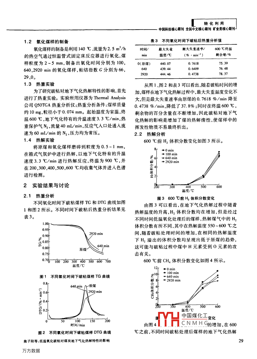 特化利用低溫氧化破粘對(duì)煤炭地下氣化熱解特性的影響焦子陽(yáng),劉麗麗,李冬陽(yáng),梁杰(中國(guó)礦業(yè)大學(xué)(北京)化學(xué)與環(huán)境工程學(xué)院,北京100083)摘要:粘結(jié)性煙煤在地下氣化過(guò)程中容易造成通道堵塞,氣流分布不均勻進(jìn)而導(dǎo)致地下氣化過(guò)程環(huán)境的惡化,使氣化反應(yīng)停止。粘結(jié)特性在熱解過(guò)程中表現(xiàn)得尤為突出,研究了低溫氧化破粘的方法對(duì)地下氣化熱解特性的影響。結(jié)果表明隨著氧化時(shí)間的增加,最大失重速率降低,煤氣中H2,CH4體積分?jǐn)?shù)以及熱值在部分熱解溫度區(qū)間均低于原煤,從而增加了煤炭地下氣化熱解惰性關(guān)鍵詞:煤炭地下氣化;低溫氧化;破粘;熱解中圖分類(lèi)號(hào):TD841;TQ546文獻(xiàn)標(biāo)識(shí)碼:A文章編號(hào):1006-6772(2011)05-0028-03無(wú)論是煤的地面氣化還是地下氣化,熱解過(guò)程煙煤軟化熔融析出膠質(zhì)體,隨著反應(yīng)溫度的提高在地面氣化固定床中還是在地下氣化過(guò)程中,煤的開(kāi)始析出可燃性氣體如H2,CH4,在450℃時(shí)焦油的熱解對(duì)產(chǎn)品氣的組成有很大影響。氣化反應(yīng)開(kāi)析出量最大,同時(shí)有烴類(lèi)氣體析出,550℃左右形始,即煤燃燒之前,首先是煤層受到熱產(chǎn)品氣的干成半焦,550℃以后半焦開(kāi)始收縮形成焦,干餾區(qū)的餾釋放出來(lái)的氣體隨氣流移動(dòng)到出氣口。煤層在熱分解產(chǎn)物對(duì)煤炭地下氣化過(guò)程中產(chǎn)品氣質(zhì)量的經(jīng)過(guò)煤的燃燒后進(jìn)入還原區(qū),由于還原區(qū)發(fā)生的是提高非常重要。對(duì)于煙煤破粘處理后的熱解行為吸熱反應(yīng),所以隨著反應(yīng)的進(jìn)行,后面的煤層溫度研究較少,筆者以地下氣化的熱解升溫速度研究了逐漸降低,最后干餾區(qū)的溫度約為200~600℃12),低溫氧化破粘對(duì)地下氣化熱解反應(yīng)的影響。該區(qū)域中煤層被干餾,并釋放出CH4等可燃?xì)怏w由于氣流的移動(dòng)方向與火焰的擴(kuò)展方向一致,干餾實(shí)驗(yàn)部分反應(yīng)得以持續(xù)進(jìn)行。同地面氣化的干餾過(guò)程一樣,1.1煤樣煙煤的地下氣化干餾過(guò)程發(fā)生在300℃以上,首先采用的煤樣是雞西煙煤,煤樣分析見(jiàn)表1和表2。表1工業(yè)分析和元素分析工業(yè)分析元素分析w(Hd)o(O)o(Sdat)1.2926.8021.0152.1984.935.367.501.370.84表2奧亞膨脹度和粘結(jié)指數(shù)軟化溫度t1℃開(kāi)始膨脹溫度l2/℃固化溫度b3/℃最大收縮度a%最大膨脹度b/%粘結(jié)指數(shù)G373418ha中國(guó)煤化工CNMHG收稿日期2011-05-12責(zé)任編輯:孫淑君作者簡(jiǎn)介:焦子陽(yáng)(1985-),男,山西忻州人,中國(guó)礦業(yè)大學(xué)(北京)化學(xué)工藝專(zhuān)業(yè)2008級(jí)在讀碩士研究生研究方向?yàn)闈崈裘杭夹g(shù)?!稘崈裘杭夹g(shù)》201年第17卷第5期轉(zhuǎn)化利用中國(guó)科技核心期刊全國(guó)中文核心期刊礦業(yè)類(lèi)核心期刊1.2氧化煤樣的制備表3不同氧化時(shí)間下破粘后熱重分析值氧化煤樣的制備是利用140℃、流量為25m3/h時(shí)間/最大失重大失重速/600℃終溫的熱空氣通過(guò)恒溫管式固定床反應(yīng)器進(jìn)行氧化,煤溫度/℃(%·min-1)剩余量/%樣粒度為2~5mm,制備出氧化時(shí)間分別為100,0(原媒)44.070.761875.39640,2920min的氧化煤樣,粘結(jié)指數(shù)G分別為66,439.440.473829,01.3熱重實(shí)驗(yàn)從圖1、圖2和表3可以看出,隨著破粘時(shí)間的增為了研究破粘對(duì)地下氣化熱解特性的影響首先加,煤樣在地下氣化熱解過(guò)程中,最大失重溫度變化不進(jìn)行了熱重實(shí)驗(yàn)。實(shí)驗(yàn)所用儀器為 Thermal Analys大,但是最大失重速率由原煤的0.7618%/min降至公司Q50TGA熱重分析儀;熱重分析條件:煤樣質(zhì)量0.4738%/min,降低了37.8%;同時(shí)在終溫600℃約10mg,粒徑小于0.074mm。起始溫度為室溫終剩余物的百分含量在不斷增加,因此破粘對(duì)地下氣溫600℃,地下氣化特有的升溫速度3.3℃/min,熱化熱解的影響是增加了煤的熱解惰性,使煤樣中的重保護(hù)氣N2,流量40 mL min,反應(yīng)氣人口處通入流揮發(fā)性物質(zhì)不易最終析出。速為60m/min的N2,壓力均為常壓。2.2熱解分析1.4熱解實(shí)驗(yàn)600℃前H2體積分?jǐn)?shù)變化如圖3所示將原煤和氧化煤樣磨碎到粒度為0.5~1mm,+0 min在箱式氣氛爐中進(jìn)行熱解,以地下氣化特有的升溫+100 min速度33℃/min進(jìn)行熱解反應(yīng),終溫為900℃,并-2920 min在200,300,400,500,600℃均收集氣體并進(jìn)入色譜進(jìn)行檢測(cè)。家爾址2實(shí)驗(yàn)結(jié)果與討論溫度/℃2.1熱重分析圖3600℃前H2體積分?jǐn)?shù)變化不同氧化時(shí)間下破粘煤樣TG和DTG曲線如圖由圖3可以看出,在地下氣化熱解過(guò)程中隨著1和圖2所示。不同時(shí)間下破粘后熱重分析結(jié)果見(jiàn)熱解溫度的升高,H2體積分?jǐn)?shù)均在增加但是經(jīng)過(guò)表3。不同時(shí)間低溫氧化處理后的煤樣,熱解煤氣中的H2體積分?jǐn)?shù)有所不同,其中在熱解溫度550~600℃之2920 min間,隨著破粘處理時(shí)間的增加,在相同的熱解溫度下H2溢出的體積分?jǐn)?shù)均呈現(xiàn)出低于原煤的趨勢(shì),640 min原煤這可能與破粘過(guò)程中煤中H元素受到O元素的攻擊有關(guān)0600℃前CH4體積分?jǐn)?shù)變化如圖4所示。溫度/℃4 100 min圖1不同氧化時(shí)間下破粘