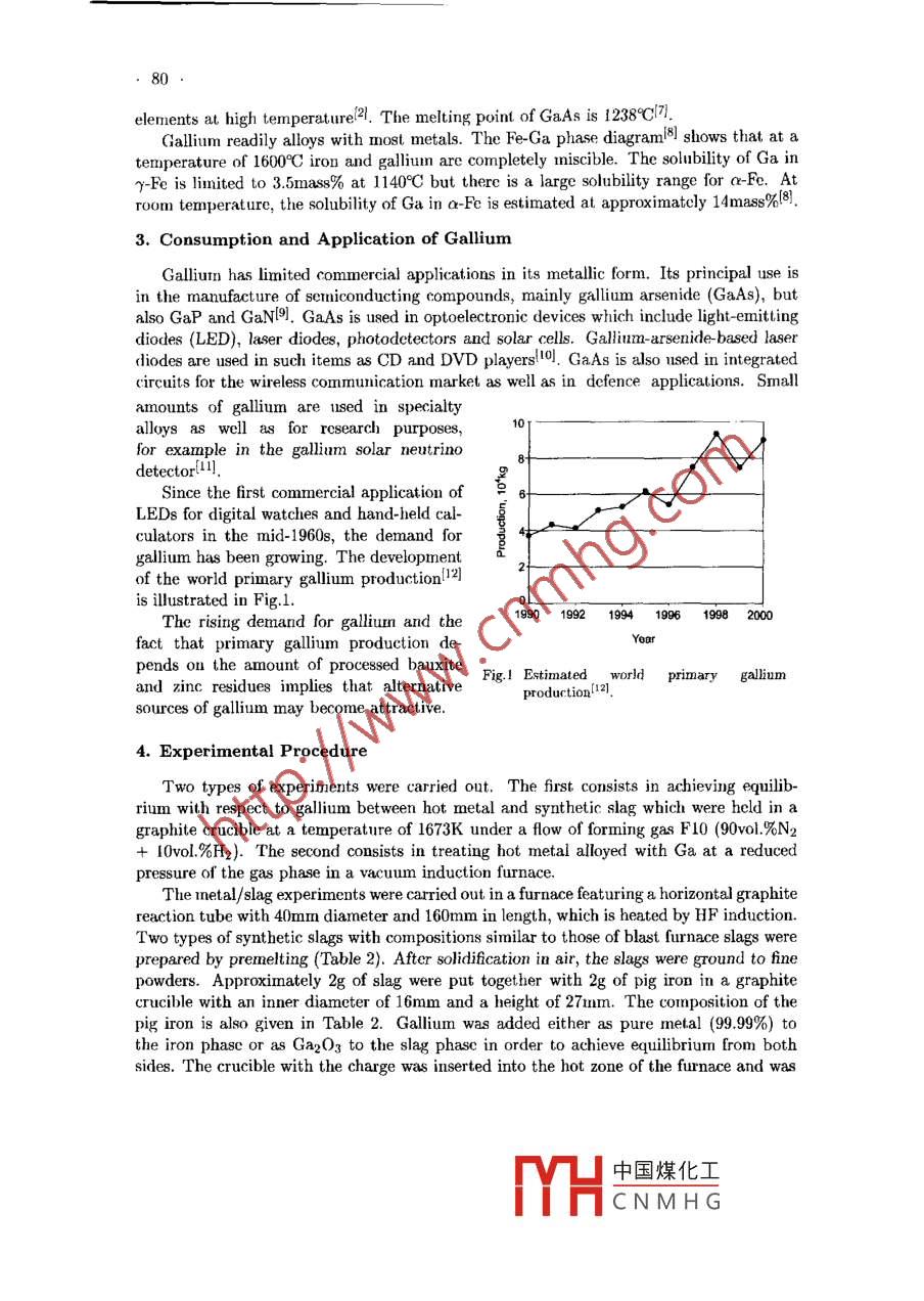 ACTA METALIJURGICA SINICA (ENGLII LETTERS)Vol. 16 No. 2 pp 78-83 April 2003A STUDY ON THE BEHAVIOUR OF GALLIUM IN THEIRONMA KING PROCESSL. Sao), S. Garonin), 0. Ioanov), Y.S. Yusfin2) ard D. Jankse)1) Istitte of Iron and Steel Technology, Freiberg Universty of Mining and Technology, D-09596 Freiberg,Germany2) Moscow State Institute of Steel and Alloys (MISIS), 4 Leninsky Prospekt, 117936 Moscow, RussiaManuscript received 9 May 2002The demand for gallum is increasing but production i8 limited since gallium is ex-tracted only as a by-product of bauxite processing. On the other hand coal, ironmakingcoke and iron ore gangue contain tmaces of galliun. However lttle is known about thebehaviour of gallium in ironmaking. The aim of the study ig to clarify the distributionof gllsum between hot metal, slag and top gas by means of laboratory erperimenls. Itwas found that Ga2O3 is not stable in blast furnace slags and that gllium is relarnedin hot metal. Vacum distillation erperiments with hot metal showed that galliumis not transferred to the gas phase. Data on the input and output of gallium at twoindustrial blast fumaces, as well as chemical analyses of the gallium content of severalcokes are presented, too.KEY WORDSgalium, thermodynamics, irnmaking, blast fumnace, cokeT151. IntroductionGallium is a valuable rare metal which is mainly being used in the production of GaAs.The demand for gallium has been increasing due to the growth of the wireless telecom-munications industry and the development of gallium-based devices for the optoelectronicmarket. In 2000 the world production of refined gallium was estinated to be about 110metric tons, and the price for crude gallium reached $600 per kilogram[4l.Most gallium is produced as a by-product of treating bauxite for aluminium production,and the remainder is obtained from zinc-processing residues. The gallium content of bauxiteis in the range of 0.003 to 0.008mass%l2. Because of this low content it is not economicto mine bauxite for the extraction of gallium alone. The amount of gallium available frombauxite is thus limited by the amount of aluminium oxide that is produced.Hence, it is necessary to search for alternative sources of gallium in order to satisfythe growing demand for this metal. It was reportedl3] that coal ash contains 0.01 to0.1mass% Ga and that during coal gasification gallimn is concentrated into the fty ash.Also it is known that sormne minerals which are present in the iron ore gangue as well asin coke ash can feature relatively high gallium contents(國, e.g. nepheline KNa3[AISiO4]4max.0.064mass% Ga), germanite Cug(Ge,Fe)(S,As)4 (max. 1.8mass% Ga), sphaleriteZnS (max. 0.018mnass% Ga) and wurtzite β ZnS (max. 0.040mass% Ga). Since ironmakingblast furnaces turn over largc amounts of iron-bearing materials and coke it is of interestwhether gallium can be extracted as a by-product of the ironmaking process. However,little is known about the behaviour of gallium in the blast furnace. Yusfin!4i and co-workers中國煤化工MYHCNMHG79determined the gllium input and output at two Russian blast furnace shops (Table 1).The industrial data show that almnost all of the gallium introduced into the blast furnaceis dissolved in hot metal, and only traces of galliuim are found in slag and dust. It shouldbe noted. too, that the glliumn content of blast furnace sludge is relatively high (Table 1).Table 1 Measured input and output of gallium in g/t material and g/t hot metal(HM), respectively, at blast furnaces in Russial4IronmakingInputOutputplantCokeSinterPelletsHot MetalSlag DustSludgeSeverstal5-10 70- 100 5- 7(*)60- 110 Max.2 Traces 150 - 250(ing/t HM) 2-5 60 - 1202- 360- 110 Traces Traces 1.5 - 3.0Tulachermet 30- 40 20 - 40 5- 10(**) 30- 80 Max.3 Traces Max.200(in g/t HM) 15-25 25- 50 .2- 530 - 80 Traces TracesMax.2Note: (*) 一Kostamuscba pellets; (**)一: Lebedinski pellets.One can expect that Ga and Al in the blast furnace behave in a similar way since theseelements are vertical neighbours in the IIA group of the Periodic Table. However theindustrial data in Table 1 show the opposite because it is well known that most aluminiumintroduced into the blast furnace is found as Al2O3 in the slag. Therefore the aim ofthe present study is to clarify the distribution of gallium between the products of theironmaking process: hot metal, slag and top gas, by means of laboratory experimentscarried out under defined conditions. Chemical analysis of various types of coke werecarried out, too, in order to check whether the gallium content varies strongly dependingon the coke.2. Physico-chemical Behaviour of Gallium at Elevated TemperaturesSome physical and thermal properties[5,6] of gallium are as follows: atormic number 31問,atomic weight 69.7235, melting point (m.p.) 29.76C51, boiling point (b.p.) 2204C5, den-sity: sol. at 29.69C 5.904g.cm - -3[5] and liq. at 29.89C 6.095g.cm -3[5, viscosity 1.94mPa.sl6]at m.p, 1.266mPasl5 at 200°C and 0.578mPa.sl5 at 11009C, enthalpy of fusion (at m.p.)80.2J.g -3[5, heat capacity (at 25C) 25.86J mol 1.K - 1例), thermal conductivity (at 27C)0.406W.cmn-1.K-16. Gallium is one of the few metals which can be liquid near roomtemperature and features the longest liquid range of any element. The vapour pressures ofgallium and several other metals as a function of temperature can be seen in Ref.[6]. .In its corpounds, the valency of gallium is usually 3. The monovalent state is unstable,although the monovalent gallium compounds Ga2O and GaCl can be isolated2. Liquidgallium oxidises rapidly and forms a protective layer of oxide. The oxygen compounds ofgallium resemnble those of aluninium in that there are bigh and low temperature formsof Ga2O3 and two hydroxides, Ga(OH)3 and GaO.0H. The melting point of Ga2O3 is1800°C171. It is evident from Ref.[7] that Ga2O3 is less stable than Al2O3 but more stablethan the oxides of other group IIA elements. Data in Ref.[7] also shows that Ga2O3 isreduced by carbon at temperatures higher than 