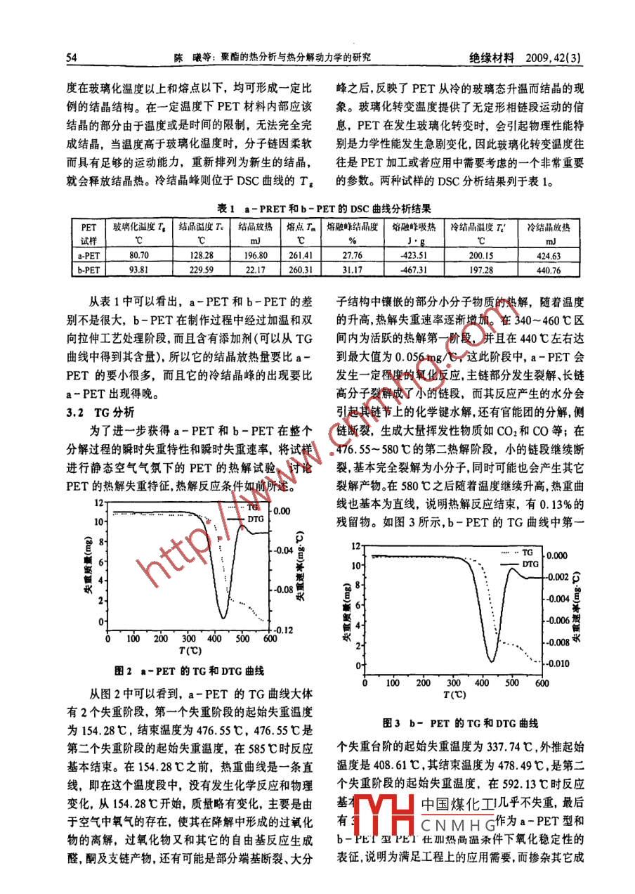 陳曦等:聚酯的熱分析與熱分解動力學的研究絕綠材料200,42(3聚酯的熱分析與熱分解動力學的研究陳曦,于欽學,任文娥,龍虹毓(西安交通大學電力設備電氣絕緣國家重點實驗室,西安710049)摘要:基于熱分析動力學理論,在單一升溫速率下采用差示掃描量熱法(DS)和熱重分析(TG)對兩種PET(a-PET和b-PET〕試樣在空氣中的熱解過程進行研究。通過考察DSC曲線得到兩種PET的玻璃化轉變溫度(T熔點(T。)、結晶溫度(T)和結晶度等得到結果:a-PET和b-PET的玻璃化轉變溫度分別為80.70℃和93.81℃,熔點分別為26141℃和260.31℃,結晶溫度分別為12828℃和229.59℃,結晶度分別為27.76%和31.17%。通過 Freeman-Carroll方法計算不同試樣各階段熱解反應的活化能、反應級數(shù)和指前因子。結果表明:PET有兩個主要的熱解階段,第一階段在340~45℃溫度區(qū)間中,a-PET的活化能、反應級數(shù)和指前因子分別為141.00k·mol和0.65、4.97E+9min';b-PET的活化能、反應級數(shù)和指前因子分別為167.128kJ/mol、0.39和433+1lmin';第二階段在515-561℃溫度區(qū)間內(nèi),a-PET的活化能反應級數(shù)和指前因子分別為10648kJ/mo、0.66和22E+6min-;b-PET的活化能、反應級數(shù)和指前因子分別為12304k/mo,0.70和1.05E+7minb關鍵詞:聚酯;熱分解; TG: DSC中圖分類號:TM2013;TM2014文獻標志碼A文章編號:1009-9239(200903-052-05Thermal Analysis and Thermal DecompositionKinetics of PolyesterCHEN Xi, YU Qin-xue, REN Wen-e, LONG Hong-yuState Key Laboratory of Electrical Insulation and Power equipment;Xi an Jiaotong University, Xi'an 710049, China)Abstract: Based on thermal analysis kinetics, differential scanning calorimetry (dSC)and thermo-gravimetric analysis(TGA)were employed to evaluate the thermal decomposition behaviors of twotypes of polyester(PET, a-PET and b-PET), in air atmosphere at a single heating rate of 10cmin.The glass transition temperature(T,), melting point temperature(T), crystal temperature(TO, crystallinity and some other parameters were obtained through DSC curves. The results areshown as follows: The t of a-pet and b-pet is 80 70c and 93 81respectively; the T. is261.41t and 26031t, respectively; T is 128 28c and 229 59C, respectively; and the crys.tallinity is 27. 76% and 31. 17%, respectively. moreover, the kinetic parameters like activationenergy, reactive index and pre-exponential factor were calculated and analyzed with Freeman-carrollmethod in every decomposition stage, respectively. The conclusions can be deduced that there aretwo main decomposition stages in different temperature sectors of thermal decomposition. The ac-tivation energy, reactive index and pre-exponential factor of a-PET are respectively 141. 00 kJ/mol0. 65 and 4.97E+9 min"; and those of b-PET are 167. 13 k /mol, 0. 39, 4. 33E+ ll min"individuallyduring the first stage (340-445 t)of thermal decomposition. In the second stage(515-561C)ofthermal decomposition, the activation energy, reactive index and pre-exponential factor of a-Petare 106. 48 kJ/mol 0.66 and 2. 2E+ 6 min", respectively; and those of b-PET are 123.04 kJ/mol0. 70, 1.05E+ 7 min"individually.Key words: polyester(PET); thermal decomposition:scanning calorimetry ( DSC)THCN MHG收稿日期:2008-11-17作者簡介:陳曦(1983-),女陜西西安人,博士生,主要從事絕綠材料檢測分析和空間電荷測量技術的研究,(電子信箱) xichen@mail. xjtu. edu.cne絕綠材料2009.42(3)陳曦等:聚酯的熱分析與熱分解動力學的研究1前言℃升至600℃,靜態(tài)空氣氣氛。陶瓷坩堝:70l熱分析是在程序控制溫度的條件下,測量物質(zhì)的物理性質(zhì)與溫度關系的一種技術。常用的熱分析3結果與分析技術,包括熱重(TG)、差示掃描量熱法(DSC)差3,1DSC分析熱分析(DTA)和熱機械分析(TMA),在熱分析中圖1為a-PET和b-PET的DSC圖譜。應用廣泛的有TG和DSC,前者是在程序控制溫度下,測量物質(zhì)的質(zhì)量與溫度關系的一種技術,后者b-PEr則是在程序控制溫度下測量輸入到試樣和參比物的能量差與溫度(或時間)關系的一種技術。熱分析動力學是用熱分析技術研究物質(zhì)的物理變化和化剖0學反應,借助一定的數(shù)學處理方法,獲得相應的反應動力學參數(shù)和反應機理函數(shù)-3。通過這種方法可以為物質(zhì)的熱降解、熱老化等熱性能提供有用的50100-15020參考數(shù)據(jù),廣泛應用在高分子材料的熱穩(wěn)定性研究T(℃)和壽命評估,具有理論和工程應用價值。聚對苯二甲酸乙二醇酯(聚酯,PET),它在較寬的溫度范圍圖1-PET和b-PET的DSC圖譜內(nèi)可以保持良好的物理性能、吸濕性能小、電絕緣如圖1所示,從a-PET試樣的DSC曲線可性能好等優(yōu)點,在生活和工程中應用十分廣泛N但知,在加溫過程中最先出現(xiàn)玻璃化轉變溫度T(80是在高溫環(huán)境中容易發(fā)生降解反應,導致材料本身℃),繼續(xù)升溫達冷結晶峰T!128℃),熔融峰T的絕緣性能下降。陳玉君等利用熱重-紅外光諧(260℃),熔體從290℃開始降溫,210℃開始結晶聯(lián)用的分析方法研究了PET的高溫穩(wěn)定性,王巍1放熱放熱達結晶峰T(200℃),在170℃以下沒用DSC方法研究了PET的熱性能, B Saha等m在有劇烈的反應。同理分析b-PET試樣。由DsC曲非等溫和等溫分解動力學研究中利用非模型動力線可知:學分析PET的動力學參數(shù),但對PET比較系統(tǒng)的a-PET的過熱程度熱分析和熱動力學研究目前比較少。本文通過對兩T過熱=110℃-80℃=30℃種不同厚度的PET試樣的TG曲線和DSC曲線的-PET的過冷程度研究分析,得出兩種試樣的失重、熱解特性和各個T過冷=260℃-200℃=60℃熱轉變溫度,并且通過 Freeman- carrol法得到試b-PET的過熱程度樣的活化能,對