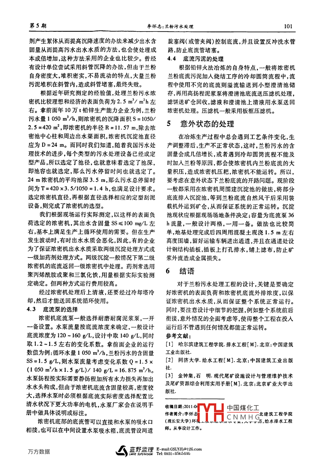 第33卷第5期甘肅冶金Vol.33 No.52011年10月CANSU METALLURCYOct. ,2011文章編號:1672-4461 (2011 )5-0099-03蘭粉污水處理李懷志(西北礦冶研究院,甘肅白銀730900)摘要:提高鉛鋅金屬 ISP冶煉工藝產(chǎn)生的蘭粉污水的處理效果,對于保障鉛鋅冶煉企業(yè)正常生產(chǎn)的連續(xù)性,提高生產(chǎn)作業(yè)率以及提高鉛鋅冶煉企業(yè)水循環(huán)利用率,節(jié)能減排,提高金屬回收率,從而提高鉛鋅冶煉企業(yè)經(jīng)濟效益,保護環(huán)境都具有非常重要的意義。本文通過對生產(chǎn)實踐中蘭粉污水處理過程中經(jīng)驗的總結(jié),概括出蘭粉污水處理的一套方法,以期和同行共同探討學(xué)習(xí),做好蘭粉污水處理工作。關(guān)鍵詞:蘭粉污水處理;濃密機;表面負荷;底流處理中圖分類號:X757文獻標識碼:BOn Blue Powder Sewage TreatmentLI Huai-zhi(Northwet Research Institute of Mining & Metalurgy , Baiyin 730900 ,China)Abstract: Improving sewage treatment of blue powder in ISP smeling process for lead and zinc enerprises is of sgnificanceto safeguard the continuity of lead and zine smelting operation, increase the rate of production and to improve the water ci-culating uilization , energy conservation and emission reduction, improve metal recovery , thereby enhance the economic ef-iciency of lead and zine smelting enterprises , and protect the environment. This article, through summary of experience inthe practice of blue powder sewage treatment process , summarizes a set of methods for blue powder treatment.Key Words: blue powder sewage treatment; thickener; suface load; underflow processing應(yīng)的進程,我們給鼓風爐鼓入由熱風爐工序加熱產(chǎn)引言生的900 C左右高溫高壓空氣,從而達到保持爐溫,在鉛鋅有色金屬密閉鼓風爐火法冶煉工藝(簡熔化和還原金屬目的。與此同時,鼓風爐內(nèi)產(chǎn)生大稱ISP工藝)的熔煉收塵洗滌系統(tǒng)中產(chǎn)生的污水,行量的煙氣隨著煙道排出。這些煙氣中含有大量的業(yè)上習(xí)慣稱之為蘭粉污水。蘭粉就是含有大量鉛鋅CO氣體和鉛鋅氧化物粉塵,排人空氣會污染環(huán)境,氧化物的粉塵,一般含鉛約35%左右,含鋅約25%同時浪費能源和鉛鋅資源。于是我們讓這些煙氣依左右,由于蘭粉污泥在風干或半風干后略顯-種特次通過洗滌塔、洗滌機和喘球塔進行收塵洗滌,洗滌殊的淺藍色故習(xí)慣上稱之為蘭粉,而含有蘭粉的污塔、洗滌機和喘球塔內(nèi)布有大量噴頭噴水,煙氣中的水稱為蘭粉污水。大量粉塵通過和噴頭噴出水滴的充分接觸被洗滌下來,隨水排出。而洗凈的煙氣我們稱之為貧煤氣,成2蘭 粉污水的產(chǎn)生過程為熱風爐加熱壓縮空氣的燃料,從而達到能源的循蘭粉污水是密閉鼓風爐火法冶煉鉛鋅工藝過程.環(huán)利用。而排出的污水便是我們下一步將要處理的產(chǎn)生的。我們知道密閉鼓風爐冶煉鉛鋅工藝的生產(chǎn)蘭粉污水。過程,就是將大量經(jīng)過燒結(jié)脫硫工序生產(chǎn)的高溫鉛3蘭粉污水處理的目的鋅礦燒結(jié)塊和提前預(yù)熱燃燒的焦炭按-定比例混合中國煤化工加人密閉鼓風爐進行氧化還原反應(yīng)以提煉金屬鉛鋅蘭粉污水MHCNMHG.的過程。為了使妓風爐內(nèi)爐料充分燃燒,保持鼓風(1)回收污水中時月們亞偶。爐內(nèi)溫度,保證生產(chǎn)的正常連續(xù)進行和加速還原反(2)將污水處理到能夠循環(huán)使用的程度從而重復(fù)厶藍野監(jiān)理eialgLyL.omi SrimsawTel 0831- 8506546100甘肅冶金第33卷利用,達到節(jié)約新水,減少水資源浪費和保護自然水用污水泵輸送至濃密機。體環(huán)境免受重金屬污染的目的。水封槽中保持- -定水位, 將洗滌設(shè)備排水管道這兩點都能為企業(yè)帶來可觀的經(jīng)濟效益,同時出口封在水中,以防止煤氣泄漏發(fā)生事故。一般水保護環(huán)境,帶來巨大的社會效益。封高度0.8~1.0 m左右,或根據(jù)煙道煙氣壓力計算我們拿-一個年產(chǎn)10萬t鉛鋅生產(chǎn)能力的企業(yè)值再加0.4 m左右安全高度求得。來做例子來看看它到底能給企業(yè)帶來多大的效益。蘭粉有一個顯著的特點,就是密度大,顆粒直徑--個年產(chǎn)10萬t鉛鋅生產(chǎn)能力的企業(yè),蘭粉污大,沉降速度快。一般粒徑0.05 ~0.2 mm顆粒占水的循環(huán)量大約為850 m'/h,加上其它收塵系統(tǒng)總量 85% ~90% ,其中又有占總量1% ~2%蘭粉顆(如燒結(jié)文丘里收塵等)產(chǎn)生的蘭粉污水,循環(huán)量大.粒,粒徑在0.5~3mm,沉淀速度特別快,沉淀物壓約在1 000~1 100 m'/h。- -般情況下,蘭粉污水的實度非常高,有時甚至堵塞或於塞水泵、管道或處理含固量ss大約在1.5 g/L左右,根據(jù)我們前面提到構(gòu)筑物。 所以,要在水封槽和水泵吸水槽上加攪拌蘭粉的鉛鋅金屬含量,我們可以算出鼓風爐生產(chǎn)一機進行攪拌,防止其在水封槽和水泵吸水槽沉淀發(fā)天產(chǎn)生的蘭粉所含的金屬量如下:生於塞。攪拌機選擇立式寬漿攪拌機,每隔2 m配蘭粉量M=1 050 m'/hx24 h/dx1.5 g/L=37置1臺,轉(zhuǎn)速60 pm,電機必須是防護等級IP54以800 kg/d上電機,以防止高溫污水產(chǎn)生的水蒸氣損壞電機,高鉛含量M =37 800 kg/d x35% =13 230 kg/d原地方還要考慮選擇高原防電暈電機。鋅含量M2 =37 800 kg/d x25% =9 450 kg/d .水泵一般選擇耐磨耐腐砂漿污水泵,一般-開回收金屬效益1 3230 kg/dx 12元/kg +9450一備配置,電機配置要求同攪拌機配置要求,寒冷地kg/d x 14元/kg =291 060元/d方要考慮水泵防凍。水泵吸水槽體積要滿足水泵5每天處理減排水量Q=1