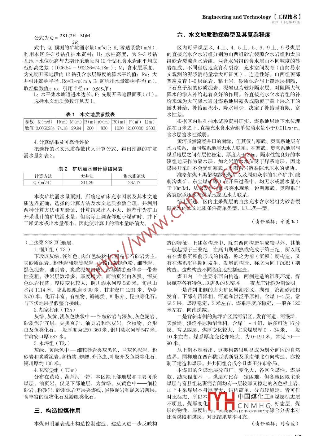 Engineering and Technology [工程技術(shù)]2013.7下總第431期黃隴煤田的構(gòu)造控煤作用張珩(內(nèi)蒙古煤田地質(zhì)局472隊,內(nèi)蒙古通遼028000 )摘要:黃隴煤田位于陜甘寧盆地的南緣。陜甘寧盆地為一中生代大型內(nèi)陸拗陷盆地,呈南北向的長方形輪廊,四周常有斷裂分布。筆者比較系統(tǒng)地總結(jié)了陜甘寧盆地黃隴煤田地層發(fā)育和構(gòu)造特征、區(qū)域構(gòu)造發(fā)展概況,闡明了構(gòu)造控煤的作用機(jī)理。關(guān)鍵詞:黃隴煤田;地層;構(gòu)造控煤中圖分類號: TU746文獻(xiàn)標(biāo)志碼: A文章編號: 1000-8772 (2013) 19-0228-02黃隴煤田中晚三疊世和中侏羅世為盆地發(fā)展階段。中晚了其他構(gòu)造的發(fā)生和發(fā)展,也控制了沉積建造。次級東西向三疊世呈現(xiàn)北高南低的古構(gòu)造面貌,構(gòu)成--隆、-坡、--降、構(gòu)造在煤田中部明顯。-拗極不對稱的西南翼陡、東北翼緩、北西向延展的大型箕2.祁、呂、賀蘭弧形褶帶狀拗陷的構(gòu)造格架??v向上由早中侏羅世及中侏羅世二個旋由一系列平行斜列走向北北東一北東向的褶皺和少量斷回組成,旋回的相序大致相同,均由低彎度河一高彎度河一裂組成,略呈向南東凸出的弧形特征。褶皺由南往北,隨地湖泊(或小型高彎度河)沉積。三疊紀(jì)末印支運(yùn)動使盆地西層由老到新,表現(xiàn)出規(guī)模由大到小、由緊密到寬緩,由密到南部急劇上升,致使延長組地層遭受強(qiáng)烈剝蝕,又造成早侏疏的特征。南緣均由延長組組成較緊密的不對稱褶皺,長度羅世、早中侏羅世早期古河流自西向東的主流向,湖盆中心達(dá)數(shù)十公里,兩翼傾角在10度以上,盆內(nèi)由侏羅系組成的次在東部的特征。早期富縣組的沉積,起了填平補(bǔ)齊作用。致級隱伏構(gòu)造,多為寬緩狀。斷裂較小,主要分布在東南緣延使延安組沉積時地形變緩,廣泛發(fā)育河流、沼澤、湖泊沉積物,長組中,為規(guī)模較大的北東向逆沖斷裂。盆地內(nèi)數(shù)量稀少、并沉積了廣泛分布、蘊(yùn)藏量豐富的煤炭資源。規(guī)模很小,由早中侏羅世中期開始,受早期燕山運(yùn)動序幕的影響,3. 隴西系帚狀構(gòu)造致使盆地內(nèi)部沉降幅度不一-,西緣南北--帶為沉降中心,沉在煤田西部隴縣和千陽- -帶展布 該體系的第二二旋回層,由降幅度大,沉積厚度亦大,東部延安地區(qū)為沉積中心,湖相四條斜列帚狀弧形斷裂帶組成,多為壓扭性,呈N60-70W,發(fā)育,沉積厚度相對較小。早中侏羅世末盆地又---度升起,長度達(dá)30- -50公里,在斷裂帶之間分布著同向的中、新生代凹造成短暫剝蝕。中侏羅世早期沉積范圍擴(kuò)大,出現(xiàn)直羅組超陷,凹陷內(nèi)發(fā)育次- -級寬緩狀褶鈹和斷裂。甘肅華亭- -- 安口覆現(xiàn)象,中侏羅世后期,盆地收縮。中侏羅世末燕山運(yùn)動強(qiáng)烈,一帶受毗鄰的山字型的脊 柱影響,使該旋褶帶不能呈簡單園滑盆地整體上升,造成與上復(fù)白堊系地層的不整合或平行不整弧形, 而呈反"S' 形的彎曲。有二條主千斷裂從東西二側(cè)控制合關(guān)系,盆地南緣安定組被剝蝕至盡或隆起未接受沉積。晚華亭礦區(qū),斷裂均由西南向東北逆復(fù),長度達(dá)18-- -42 公里,侏羅世僅在西部千陽芬芳河、草碧河沿斷裂帶- -側(cè)發(fā)育一套斷距達(dá)200-2so米。其間發(fā)育三條次-級反“S" 形斷裂和同向巨厚的沖積扇沉積。早白堅世在西緣仍存在較大幅度的沉降,的背、向斜,背斜二翼東陡西緩,向斜則西陡東緩。晚期盆地大部份隆起。至晚白堊世晚期,燕山運(yùn)動使盆地全4.新華夏構(gòu)造面隆起??傊?,燕山運(yùn)動控制著盆地發(fā)展,演變和衰亡。又煤田處在新華夏第三沉降帶范圍內(nèi),由於該體系發(fā)生時由于盆地內(nèi)差異升降,引起沉積厚度、巖相和沉積環(huán)境的不一代較新,以橫跨,利用,改造等形式復(fù)合,迭加在其他構(gòu)造體系上,不易觀察。煤田東北端店頭礦區(qū)隱伏褶皺多呈反"S"一、構(gòu)造概況,弧形特點(diǎn)。同時褶皺軸部均有起伏,相鄰軸上高低點(diǎn)相連,得出N20。~25。E展布的特點(diǎn)。此外該區(qū)直羅組底界等高陜甘寧盆地位于祁、呂、賀蘭山字型構(gòu)造體系的東部盾地,線呈明顯北北東走向的單斜展布,這些特點(diǎn)均系受新華夏構(gòu)盾地內(nèi)部尚有新華夏第三沉降帶疊加。南北與秦嶺、陰山巨造影響所致。型緯向構(gòu)造體系相接。盆地處在--個構(gòu)造穩(wěn)定單元上,內(nèi)部地層極為平緩,僅四周斷裂發(fā)育。黃隴煤田位于該構(gòu)造弧形二、地層褶帶的東翼內(nèi)側(cè),陜甘寧盆地的東南緣,西與隴西系帚狀構(gòu)造反接,東北端有新華夏構(gòu)造橫跨與迭加。內(nèi)部有東西向構(gòu)黃隴煤田出露地層有三疊系上統(tǒng)延長群,侏羅系、自堊系,造貫穿,與山字型弧呈斜接關(guān)系。東西向構(gòu)造生成早、延續(xù)長、第三系和第四系。西南邊沿有元、古生界地層。分布廣,影響深,成為煤田的基礎(chǔ)構(gòu)造。以三疊系.上統(tǒng)延長群( T3yc)為例,該組廣泛分布于1.東西向構(gòu)造煤田南沿和西北部。為黃隴煤田的基底,- - 般厚1119-1692主要由東西向褶皺組成,伴以逆沖斷裂。褶皺表現(xiàn)出背米,西北緣華亭-帶可達(dá)3240米。從下往上分為銅川組(斜顯著,呈箱狀、梳狀和寬緩狀,向斜不明顯,多呈寬緩狀。T3t,),胡家村紐(T3h
