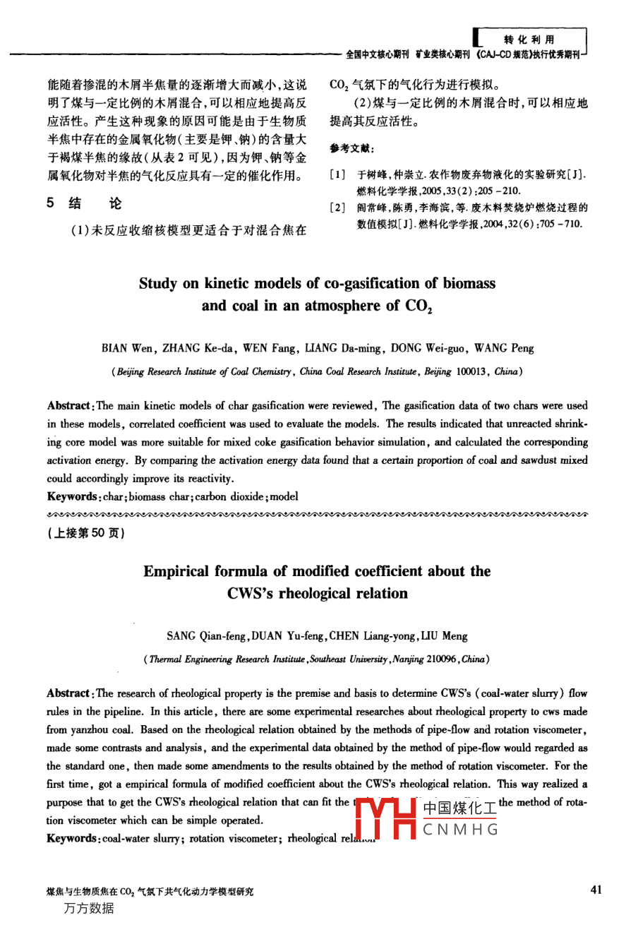 轉(zhuǎn)化利用基于旋轉(zhuǎn)粘度計(jì)法的水煤漿流變關(guān)系修正桑錢鋒,段鈺鋒,陳良勇,劉猛(東南大學(xué)熱能工程研究所,江蘇南京210096)摘要:對(duì)兗州煤水煤漿進(jìn)行流變特性試驗(yàn)研究,將管流法、旋轉(zhuǎn)粘度計(jì)法得出的流變關(guān)系進(jìn)行比對(duì)和分析。以測(cè)量結(jié)果更適合工程運(yùn)用的管流法試驗(yàn)數(shù)據(jù)為基準(zhǔn),對(duì)旋轉(zhuǎn)粘度計(jì)法所得的結(jié)果進(jìn)行修正,首次得出基于旋轉(zhuǎn)粘度計(jì)法的水煤漿流變關(guān)系的修正系數(shù)經(jīng)驗(yàn)公式,較妤的達(dá)到運(yùn)用操作簡(jiǎn)單的旋轉(zhuǎn)粘度計(jì)法得到適合工程運(yùn)用的水煤漿流變關(guān)系的目的。關(guān)鍵詞:水煤漿;旋轉(zhuǎn)粘度計(jì)法;流變關(guān)系中圖分類號(hào):TQ534.4文獻(xiàn)標(biāo)識(shí)碼:A文章編號(hào):10066772(2009)040048水煤漿作為一種成分復(fù)雜的懸浮體系,其流變切應(yīng)力r和剪切速率y特性的影響因素非常廣泛1-3:①煤種的理化特性;(1)②固相的容積份額;③固體顆粒大小及分布;④添加劑的種類和用量;⑤懸浮液的pH值;⑥溫度。從(2)目前的研究看,對(duì)影響水煤漿流變特性因素的系統(tǒng)n(1-B")化和理論化的研究還比較少。工程實(shí)際中,大多通式中L—旋轉(zhuǎn)筒體高度;過試驗(yàn)方法研究水煤漿的流變特性,主要是研究水R—旋轉(zhuǎn)內(nèi)筒體半徑;煤漿的剪切應(yīng)力與剪切應(yīng)變速率之間關(guān)系的規(guī)律。B—旋轉(zhuǎn)內(nèi)筒體與外筒體半徑之比;對(duì)兗州煤水煤漿進(jìn)行流變特性試驗(yàn)研究,在試n=2驗(yàn)結(jié)果基礎(chǔ)上以測(cè)量結(jié)果更適合工程運(yùn)用的管流1.2旋轉(zhuǎn)粘度計(jì)法測(cè)量結(jié)果法試驗(yàn)數(shù)據(jù)為基準(zhǔn),對(duì)旋轉(zhuǎn)粘度計(jì)法所得結(jié)果進(jìn)行表1為用旋轉(zhuǎn)粘度計(jì)測(cè)得的兗州煤水煤漿的流修正得出基于旋轉(zhuǎn)粘度計(jì)法的水煤漿流變關(guān)系的變關(guān)系。修正系數(shù)經(jīng)驗(yàn)公式,為工程運(yùn)用提供依據(jù)。2管流法測(cè)水煤漿的流變特性1旋轉(zhuǎn)粘度計(jì)法測(cè)水煤漿的流變特性2.1管流法測(cè)量原理1.1旋轉(zhuǎn)粘度計(jì)法測(cè)量原理管流法是研究水煤漿流變特性的一種非常有旋轉(zhuǎn)粘度計(jì)法是利用雙筒體的旋轉(zhuǎn)效應(yīng),直接效的試驗(yàn)手段。其主要原理是:保持水煤漿在管道測(cè)量轉(zhuǎn)速、扭距等參數(shù),然后根據(jù)所得參數(shù)通過一內(nèi)的恒定剪切流動(dòng)測(cè)量水煤漿流經(jīng)直管段上壓差定的換算關(guān)系獲得水煤漿剪切速率與剪切應(yīng)力之Δ和流量Q,通過換算關(guān)系,確定水煤漿剪切速率間的關(guān)系。運(yùn)用同軸旋轉(zhuǎn)粘度計(jì),通過測(cè)量可扭距與剪切應(yīng)力之間的關(guān)系。壁面上的剪切應(yīng)力T和T和轉(zhuǎn)速o根據(jù)下列關(guān)系式可得出圓筒壁面的剪剪切中國煤化工CNMHG收稿日期:2009-03-13基金項(xiàng)目:國家重點(diǎn)基礎(chǔ)研究發(fā)展計(jì)劃(973)資助項(xiàng)目(2004B2701)作者簡(jiǎn)介;桑錢鋒(1984-),男,江蘇南通人,碩士研究生《潔凈煤技術(shù)》2009年第15卷第4期轉(zhuǎn)化利全國中文核心期刊礦業(yè)類核心期刊《cAcD規(guī)范》執(zhí)行優(yōu)秀期刊表1旋轉(zhuǎn)粘度計(jì)法所得水煤漿的流變關(guān)系質(zhì)量濃度剪切速率y壁面切應(yīng)力r/Pa質(zhì)量濃度653%3.640000800R11.92剪切速*Y/(s)15.711.95圖1水煤漿真實(shí)流變曲線25.7質(zhì)量濃度67.1%67.1%38.3149.43·D=25mm18.6328.62剪切速率y/(s)68.2%00800000070.54圖2水煤漿真實(shí)流變曲線92.46114.87質(zhì)量濃度68.2%T=pR(3)品25B D=Q/3n+1(4)▲D=50mm式中R—管道直徑;L—試驗(yàn)管段長度;剪切速率Y/(s)Q。—試驗(yàn)管段內(nèi)無滑移條件下水煤漿流圖3水煤漿真實(shí)流變曲線DYdIf(T)drindn/4,其中,3基旋轉(zhuǎn)粘度計(jì)法的水煤漿流變關(guān)系修正3.1對(duì)旋轉(zhuǎn)粘度計(jì)法所測(cè)流變關(guān)系修正的意義VTR旋轉(zhuǎn)粘度計(jì)使用的試樣少,溫度控制簡(jiǎn)單易高濃度水煤漿在管內(nèi)流動(dòng)時(shí)存在滑移現(xiàn)象需行,粘度可直接讀出,是實(shí)驗(yàn)室分析牛頓流體和非要對(duì)滑移進(jìn)行修正。質(zhì)量濃度為6.1%和牛頓流體的常用儀器。但是,旋轉(zhuǎn)粘度計(jì)在分析非68.2%的兗州煤水煤漿在管內(nèi)流動(dòng)存在滑移現(xiàn)象,牛頓流體時(shí),所測(cè)量的數(shù)據(jù)往往會(huì)有一定的誤差。必須進(jìn)行滑移修正之后,才能得到其真實(shí)的流變候克鵬”等人的研究證實(shí)旋轉(zhuǎn)粘度計(jì)對(duì)于測(cè)量非模型。牛頓流體不精確。筆者用旋轉(zhuǎn)粘度計(jì)所測(cè)流變關(guān)22管流法測(cè)量結(jié)果系與管流法所得結(jié)果有較大差別,在表2中給出比各濃度下兗州煤水煤漿的真實(shí)流變關(guān)系如圖較。工程上一般認(rèn)為用管流法試驗(yàn)所得數(shù)據(jù)比較圖3所示。接近工程實(shí)際,具有很高的工程利用價(jià)值。但是,用廣義賓漢體模型進(jìn)行擬合,可得兗州煤水煤相對(duì)于旋轉(zhuǎn)浹而言管流法所需試驗(yàn)臺(tái)龐漿的流變關(guān)系式為大,試中國煤化工不易控制。對(duì)于濃度653%:r=4041+0.336y1水煤對(duì)CNMHG變?nèi)f化