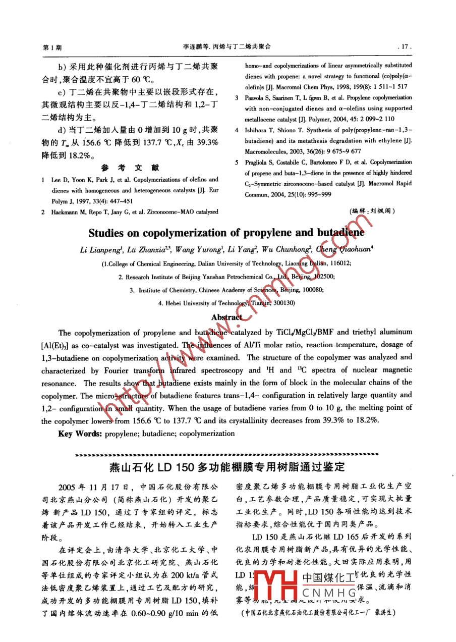 研究與開發(fā)合成樹脂及塑料,2006,23(1):14CHINA SYNTHETIC RESIN AND PLASTICS丙烯與丁二烯共聚合李連鵬1呂占霞23王玉榮1李楊2吳春紅2程巧煥←(1.大連理工大學(xué)化工學(xué)院,遼寧大連,116012;2.中國(guó)石油化工股份有限公司北京燕山分公司研究院,北京,1025003.中國(guó)科學(xué)院化學(xué)研究所,北京,100080;4.河北工業(yè)大學(xué),天津,30013摘要:采用TCl/MgCl芴二醚/AlIE)催化體系進(jìn)行丙烯與丁二烯的共聚合,考察了n(AIya(T)聚合溫度丁二烯的用量等聚合工藝條件對(duì)共聚反應(yīng)活性的影響,通過(guò)傅里葉變換紅外光譜、核磁共振氫譜和核磁共振碳譜對(duì)共聚物的結(jié)構(gòu)進(jìn)行了分析和表征。結(jié)果表明,丁二烯在共聚物中主要以嵌段形式存在,丁二烯的微觀結(jié)構(gòu)主要以反-14結(jié)構(gòu)和1,2-結(jié)構(gòu)為主。當(dāng)丁二烯用量從0增加到10g時(shí),共聚物的熔點(diǎn)從1566℃降低到137.7℃,結(jié)晶度由393%降低到182%關(guān)鍵詞:丙烯丁二烯共聚合中圖分類號(hào):TQ325.14文獻(xiàn)標(biāo)識(shí)碼:B文章編號(hào):1002-13962006)01-001404聚丙烯(PP)價(jià)格低、綜合性能好,因此得到了 TTiCLMgCI/BMF,其中w(Ti)為3.57%],中國(guó)科學(xué)極為迅速的發(fā)展。然而,PP是一種典型的非極性院化學(xué)研究所提供。聚合物,它的染色性、黏結(jié)性、抗靜電性、親水性以12儀器與設(shè)備及與其他極性聚合物、無(wú)機(jī)填料的相容性差,這限1L不銹鋼聚合釜,北京化工研究院生產(chǎn);IB制了P應(yīng)用范圍的進(jìn)一步擴(kuò)大,因此,有必要對(duì)801型超級(jí)恒溫器,遼陽(yáng)恒溫儀器廠生產(chǎn); SuperPP改性,賦予其高、新性能(1220750型手套箱及其凈化系統(tǒng),米開羅那(中通過(guò)丙烯與二烯烴反應(yīng),在PP分子鏈中引入國(guó))有限公司生產(chǎn); Nicolet-560型傅里葉變換紅雙鍵,然后再接枝生成功能化PP,是對(duì)PP改性的外光譜儀,美國(guó) Nicolet公司生產(chǎn); Avance-400型種有效方法。由于共聚合生成共聚物的微觀結(jié)核磁儀,瑞士 Bruker公司生產(chǎn);MDSC2910型差構(gòu)對(duì)接枝有很大的影響,因此,此方法的關(guān)鍵在于示掃描量熱儀,美國(guó)杜邦公司生產(chǎn)。共聚合步驟。目前,在丙烯與二烯烴方面研究較多1.3實(shí)驗(yàn)步驟的是丙烯與非共軛二烯烴的共聚合習(xí),對(duì)于丙烯首先在手套箱中將固體催化劑配制成己烷的與共軛二烯烴(主要是丁二烯和異戊二烯)的研究漿液。共聚合在1L不銹鋼聚合釜中進(jìn)行,反應(yīng)前很少。用真空抽排、高純度氮?dú)庵脫Q反應(yīng)釜3次,然后加本工作采用 TiCl/MgCly芴二醚(BMF)Al(E)3人溶劑己烷,在氮?dú)獾谋Wo(hù)下依次加入助催化劑催化體系,考察了丙烯與丁二烯共聚合過(guò)程中,反主催化劑,再通入丁二烯和丙烯,升溫,反應(yīng)過(guò)程應(yīng)工藝條件[如n(ADya(Ti),聚合溫度,丁二烯的用中用丙烯維持反應(yīng)壓力,反應(yīng)1h后,用酸化乙醇量]對(duì)反應(yīng)活性的影響,并且對(duì)共聚物的結(jié)構(gòu)進(jìn)終止反應(yīng)。產(chǎn)物用乙醇洗滌3次,過(guò)濾,在60℃行了分析和表真空干燥箱中干燥4h。14共聚物的分析與表征1實(shí)驗(yàn)部分傅里葉變換紅外光譜(FTIR)分析:將試樣掃原料丙烯和丁二烯,均為聚合級(jí);正已烷,使用中國(guó)煤化平明:2005-11-25。前經(jīng)5A分子篩干燥,通髙純氮脫氧處理。均為理工大學(xué)化工學(xué)院中國(guó)石化北京燕化石油化工股份有限公司生產(chǎn)CNMH從事烯烴共聚合以Al(Et)3,工業(yè)級(jí),配成1.0moL的己烷溶液,原北及功能化聚烯烴的研究。聯(lián)系電話:13843243163;E-mail京燕化高新技術(shù)股份有限公司生產(chǎn)。主催化劑第1期李連鵬等.丙烯與丁二烯共聚合描32次,選取分辨率為4cm-1,將共聚物粉末與方面,不利于絡(luò)合物的形成以及單體的吸附溴化鉀研勻、壓片測(cè)試。另一方面,溫度較高使活性中心的不可逆失活加共聚物微觀結(jié)構(gòu)測(cè)試:采用核磁共振氫譜快,導(dǎo)致了反應(yīng)活性的降低。除此之外,當(dāng)聚合溫(H-NMR)和核磁共振碳譜(HC-NMR),先用氘代度達(dá)到70℃時(shí),所得產(chǎn)物在己烷溶劑中能夠溶鄰二氯苯將共聚物溶解,配成濃度為20mgmL的脹,溶脹物包纏了部分催化劑,使暴露在外的活性溶液,于120℃測(cè)試。中心數(shù)目減少。因此,共聚合溫度應(yīng)控制在60℃熔點(diǎn)(T)和結(jié)晶溫度(T)測(cè)試:在氮?dú)獗Wo(hù)以內(nèi)。下,升溫速率和降溫速率均為10℃/min062結(jié)果和討論21聚合工藝條件對(duì)反應(yīng)活性的影響042.1.1 n(Al)n(ti)由圖1可以看出,隨著n(A)n(T)的增加反應(yīng)活性逐漸增大,在n(A)n(T)為90左右達(dá)到最大,然后隨著n(Al)/n(T)的增大而逐漸下聚合溫度/℃降。這是由于烷基鋁除了清除體系中的微量雜質(zhì)(如H4O,O2等)外,還主要與T作用生成活性中圖2聚合溫度對(duì)反應(yīng)活性的影響心。當(dāng)加入少量的A(Et3時(shí),體系中的雜質(zhì)會(huì)消Fig. 2 Influence of copolymerization temperature onreaction activty耗掉部分A(EU),從而使與主催化劑絡(luò)合形成活注:TCl4濃度為245×10·molL;助催化劑為Al(E);性中心引發(fā)單體聚合的A(Et)3不足,導(dǎo)致反應(yīng)活聚合壓力為04MPa;n(ADy(為100。性較低;隨著n(A)n(T)的增大,T“被還原為213丁二烯用量T的數(shù)量增多,活性中心的數(shù)量增加,反應(yīng)