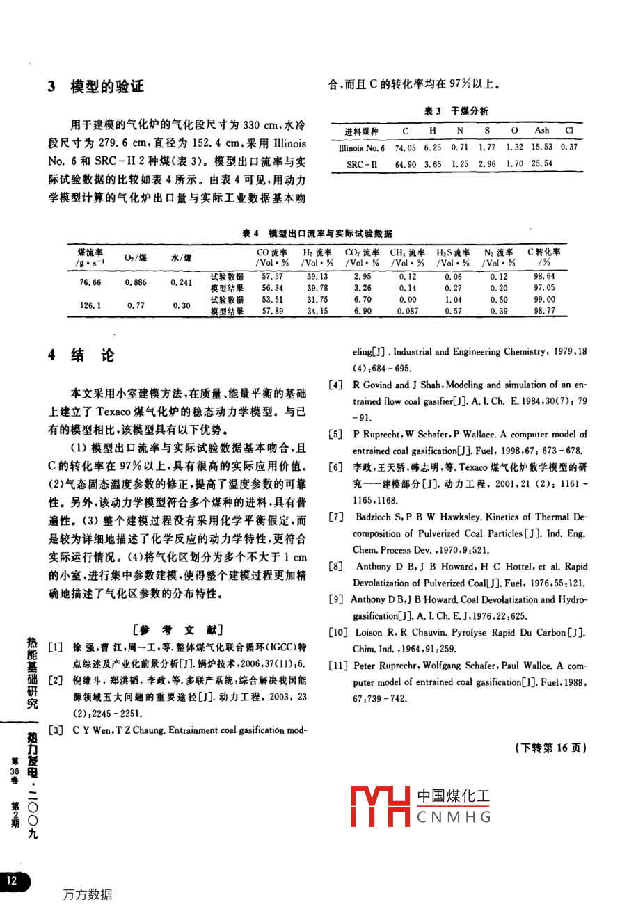 噴流床煤氣化爐的建模劉志賓',趙文杰',唐昕”,焦力興',康會(huì)峰31.華北電力大學(xué)控制科學(xué)與工程學(xué)院,河北保定0710032.河南省電力公司,河南鄭州4500523.蘭州交通大學(xué)機(jī)電技術(shù)研究所,甘肅蘭州730070[摘要]采用小室建模法建 立了噴流床(Texaco)煤氣化爐的穩(wěn)態(tài)數(shù)學(xué)模型,即在化學(xué)反應(yīng)的動(dòng)力學(xué)特性以及物質(zhì)的質(zhì)量平衡、能量平衡的基礎(chǔ)上對每個(gè)小室進(jìn)行建模。模型考慮了氣固流動(dòng)過程及包括催化水煤氣反應(yīng)、煤焦與O2 .CO2、H2、H2O等化學(xué)反應(yīng)過程。該模型仿真結(jié)果與多個(gè)煤種的氣化試驗(yàn)數(shù)據(jù)相吻合。[關(guān)鍵詞]噴流床;煤氣化爐;高溫分解;燃燒;數(shù)學(xué)模型[中圖分類號] TK229. 8[文獻(xiàn)標(biāo)識碼] A[文章編號] 1002 - 3364(2009)02 - 0009 - 04Texaco煤氣化爐的數(shù)學(xué)模型主要有熱力學(xué)和動(dòng)力學(xué)2種[1~5]。本文針對典型的煤氣化爐[0],在充分I 裂解和揮發(fā)燃燒區(qū)考慮爐內(nèi)氣化進(jìn)程及化學(xué)反應(yīng)的基礎(chǔ)上,對煤氣化爐煤焦燃燒區(qū)進(jìn)行了分區(qū)處理,建立了動(dòng)力學(xué)模型,并對煤氣化爐出口煤氣成分與實(shí)際運(yùn)行數(shù)據(jù)進(jìn)行了比較,結(jié)果表明該氣化區(qū)模型是有效的。→合成氣1 Texaco 煤氣化爐冷卻室Texaco煤氣化爐可分為氣化段和煤氣冷卻段兩查熱部分(圖1)。本文不考慮煤氣冷卻段,只對氣化段進(jìn)月圈1 Texaco 煤氣化爐內(nèi)分區(qū)行建模。煤的氣化過程可分為高溫裂解和揮發(fā)分燃礎(chǔ)燒、煤焦燃燒、氣化3個(gè)階段"。生反應(yīng),產(chǎn)生大量的熱。1970 年Bazioch 和Hawks-研l(wèi)ey.1976年Anthony等[7~幻] ,均研究過煤的高溫裂解究1.1高溫裂解和揮發(fā)分燃燒速率,1964年Loison和Chauvinl101通過試驗(yàn)對揮發(fā)分在Texaco煤氣化爐中,煤、水和氧氣同時(shí)從爐頂中各組分的最終產(chǎn)量進(jìn)行了研究并指出:H,的產(chǎn)量不力部進(jìn)入,由于氣化爐入口溫度高達(dá)2000 C左右,因此隨煤種的變化而變化,且CO/ CO2和H2O/ CO2的比備δ煤的揮發(fā)分迅速析出,揮發(fā)分中的可燃?xì)怏w與氧氣發(fā)值相對固定[2]。從而根據(jù)元素平衡即可獲得揮發(fā)分中中國煤化工收稿日期:作者簡介:劉志賓(1980-),男 ,河北保定人,華北電力大學(xué)控制科學(xué)與工程學(xué)院碩士w九生,wIb心越讓明m用讓心程控制2008 - 09 -08TYHCNMHG,中的應(yīng)用。九E- mail; siluhuayu315404@ 126. com各組分的含量。煤焦燃燒區(qū)以及氣化區(qū)分成若干小室,每個(gè)小室看作-一個(gè)獨(dú)立的參數(shù)單元。1.2 煤焦燃燒建模的假設(shè)條件:(1)氣相在第一個(gè)區(qū)視為全混在煤焦燃燒區(qū),剩余的(2與焦碳反應(yīng)的同時(shí)CO2流,以后視為平推流。氣相和固相完全混合,固體在整和H2O與焦碳反應(yīng),生成的CO和H2又迅速與()2反個(gè)氣化爐內(nèi)視為均勻平推流,不考慮徑向溫度、濃度等應(yīng)。在(r存在的環(huán)境下,可燃性氣體與Or完全反參數(shù)差異和物質(zhì)交換;(2)不考慮反應(yīng)過程中氣化爐內(nèi)應(yīng),即氣相中已無可燃性氣體川。該區(qū)域發(fā)生的反應(yīng)的壓力變化,認(rèn)為氣化區(qū)域固體顆粒表面溫度和氣化為:溫度不同;(3)氣化爐內(nèi)氣體近似為理想氣體狀態(tài),可C.H,O,NsSA+(--+號-e)02→2(1-二)●遵循理想氣體狀態(tài)方程;(4)固體顆粒為粒徑相同的球形。水煤漿在水分蒸發(fā)和揮發(fā)分釋放后,煤顆粒不aC0+(2- 1)aCO, +(號-e)H20+結(jié)團(tuán),且相互獨(dú)立;(5)建立的模型為穩(wěn)態(tài)模型。eH2S+ δN; + Ash(1)2.1焦碳?xì)怏w反應(yīng)速率C.HpO,NsSA + (a- Y)H2O→aC0+由于Texaco煤氣化爐內(nèi)溫度很高,反應(yīng)速度很(a-r+號- e)H; +eH2S+ δN2 +Ash (2)快,所有異相反應(yīng)均可看作是氣相在焦碳顆粒表面發(fā)生的表面反應(yīng)。由于噴流床氣化爐中焦碳顆粒所占體C.HO,NSA + acCO2 + 2aC0+并H20+積很小(<1%).且停留時(shí)間一般在5~8 s,因此煤粉顆粒碰撞概率很小,可認(rèn)為顆粒表面因反應(yīng)形成的灰(-r+上-E)H2 +eH2S+ jN2 +Ash (3)層始終保留而不會(huì)脫落。所以,對氣-固之間的異相反H2 + 1/2O2→H2O(4)應(yīng)采用未反應(yīng)核收縮模型,焦碳顆??偟姆磻?yīng)速度由CO+ 1/202→CO2(5)化學(xué)反應(yīng)速率、灰層擴(kuò)散速率和氣膜擴(kuò)散速率共同決定:1.3氣化燃燒氣體進(jìn)入氣化區(qū),此時(shí)氧氣已耗盡,發(fā)生水煤mo=[品+康+志($-1)]"(p,一p門)(9)氣反應(yīng),煤焦與H2生成CH,并伴有甲烷蒸汽重整反式中:Y=r./R=[(1-x)/(1-f)]"s (其中f是熱應(yīng)。因此,除了式(2)和式(3)的反應(yīng)外,氣化階段還發(fā)解剛結(jié)束時(shí)干煤中無灰成分的轉(zhuǎn)化率;x是熱解結(jié)柬生了以下3個(gè)反應(yīng):后任意時(shí)刻干煤中無灰成分的轉(zhuǎn)化率);k為氣體擴(kuò)C.H,O,NsS.A+ (2a+Y+e-號)H2→aCH,+散到焦炭表面的速率常數(shù),g/(cm2●s);k, 為碳核表面的化學(xué)反應(yīng)速率常數(shù),g/(cm?●s);kamh= kau(e*°5)yH2O +eH2S+ jN: + Ash .(6)是氣體通過灰層擴(kuò)散到未反應(yīng)核表面的速率常數(shù),g/熱C0+ H2O≈CO2 + H2(7)(cm2●s);e為灰層的空隙率,該模型中取ε=0.75;p;基CH, + H:OC0+ 3H2(8)為氣體組分分壓力;p,-pi為考慮可逆反應(yīng)的有效分離開氣化爐的氣體以CO、H2、CO2為主(假設