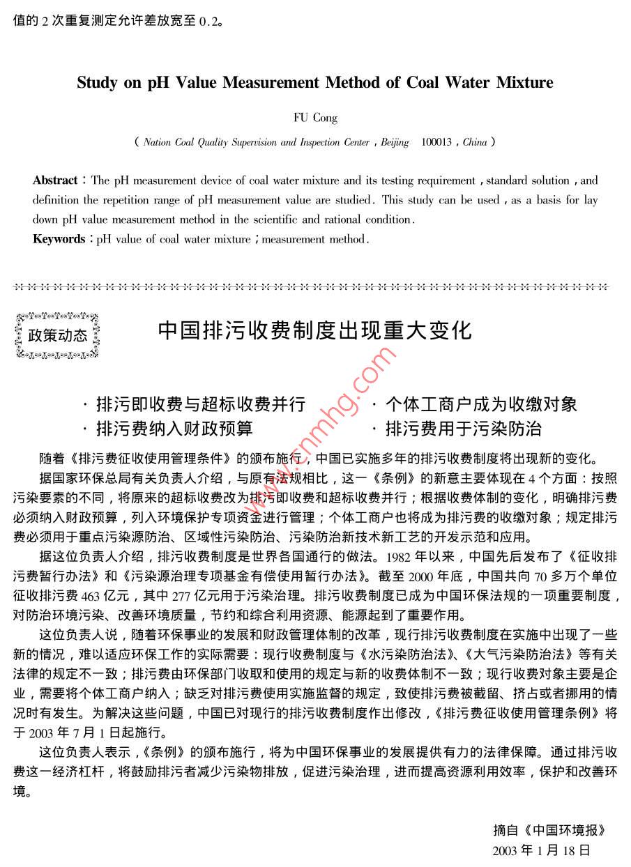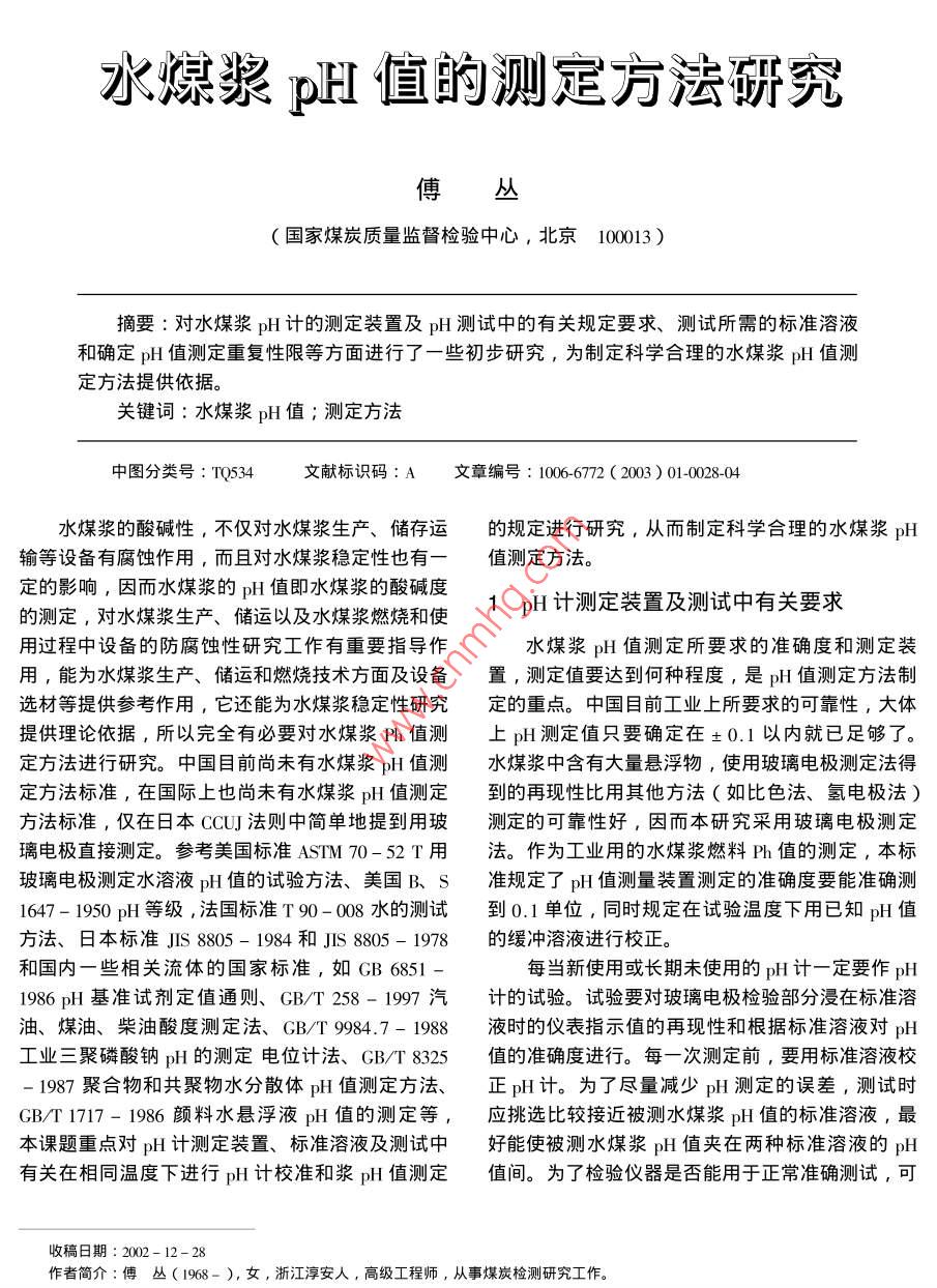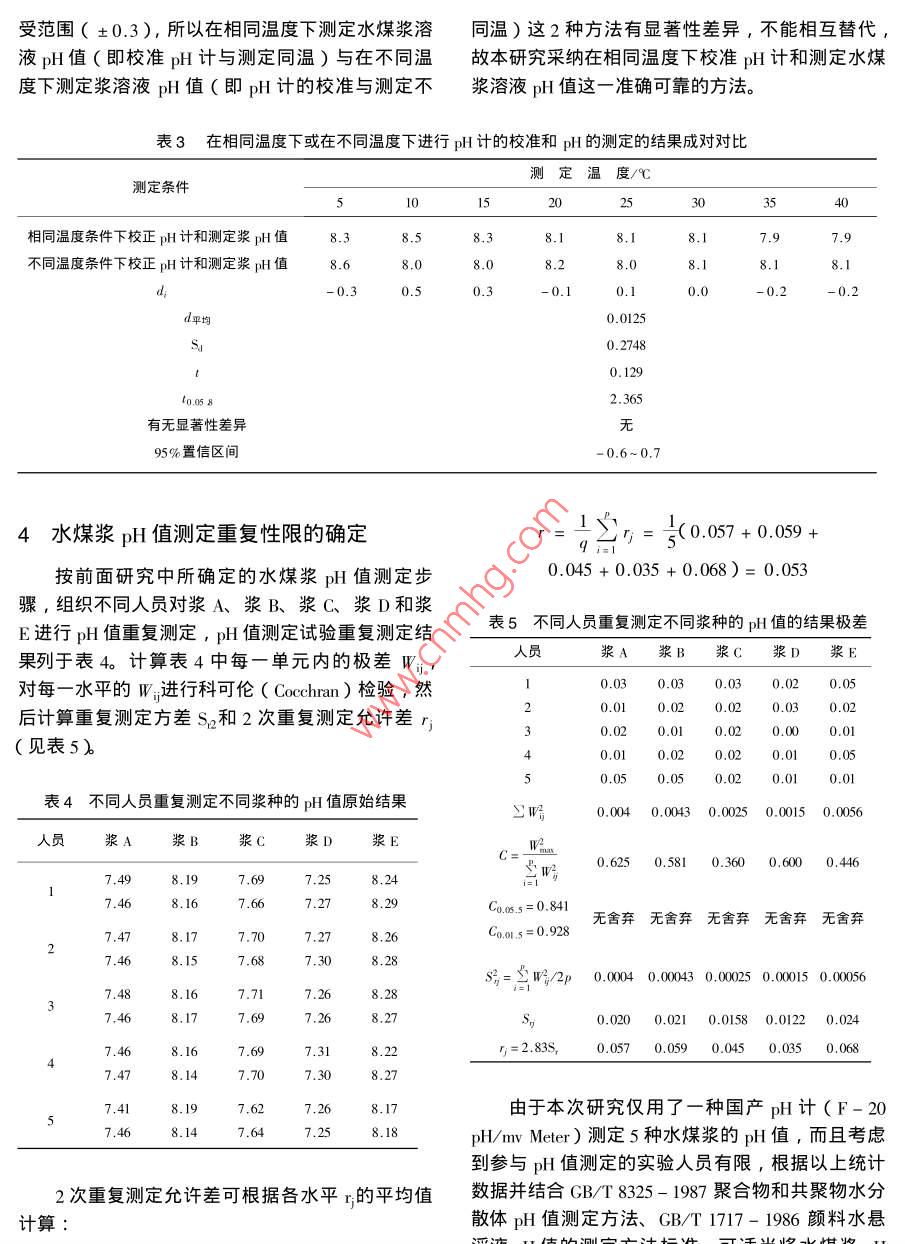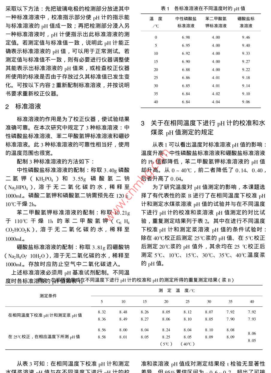 水煤漿pH值的測定方法研究傅國家煤炭質(zhì)量監(jiān)督檢驗中心,北京100013)摘要∶對水煤漿pH計的測定裝置及p測試中的有關(guān)規(guī)定要求、測試所需的標準溶液和確定pH值測定重復性限等方面進行了一些初步研究,為制定科學合理的水煤漿p值測定方法提供依據(jù)。關(guān)鍵詞:水煤漿pH值;測定方法中圖分類號:TQ534文獻標識碼:A文章編號:1006772(200)01-028-04水煤漿的酸堿性,不僅對水煤漿生產(chǎn)、儲存運的規(guī)定進行研究,從而制定科學合理的水煤漿pH輸?shù)仍O(shè)備有腐蝕作用,而且對水煤漿穩(wěn)定性也有一值測定方法。定的影響,因而水煤漿的pH值即水煤漿的酸堿度的測定,對水煤漿生產(chǎn)、儲運以及水煤漿燃燒和使1pH計測定裝置及測試中有關(guān)要求用過程中設(shè)備的防腐蝕性研究工作有重要指導作水煤漿pH值測定所要求的準確度和測定裝用,能為水煤漿生產(chǎn)、儲運和燃燒技術(shù)方面及設(shè)備置,測定值要達到何種程度,是pH值測定方法制選材等提供參考作用,它還能為水煤漿穩(wěn)定性研究定的重點。中國目前工業(yè)上所要求的可靠性,大體提供理論依據(jù),所以完全有必要對水煤漿P值測上pH測定值只要確定在±0.1以內(nèi)就已足夠了定方法進行研究。中國目前尚未有水煤漿pH值測水煤漿中含有大量懸浮物,使用玻璃電極測定法得定方法標準,在囯際上也尚未有水煤漿pH值測定到的再現(xiàn)性比用其他方法(如比色法、氫電極法)方法標準,僅在日本CCUJ法則中簡單地提到用玻測定的可靠性好,因而本研究采用玻璃電極測定璃電極直接測定。參考美國標準ASIM70-52T用法。作為工業(yè)用的水煤漿燃料Ph值的測定,本標玻璃電極測定水溶液pH值的試驗方法、美國B、S準規(guī)定了pH值測量裝置測定的準確度要能準確測1647-1950pH等級,法國標準T90-008水的測試到0.1單位,同時規(guī)定在試驗溫度下用已知pH值方法、日本標準JS8805-1984和JS8805-1978的緩沖溶液進行校正。和國內(nèi)一些相關(guān)流體的國家標準,如GB6851-每當新使用或長期未使用的p計一定要作pH1986H基準試劑定值通則、GBT258-1997汽計的試驗。試驗要對玻璃電極檢驗部分浸在標準溶油、煤油、柴油酸度測定法、GBT∞984.7-1988液時的儀表指示值的再現(xiàn)性和根據(jù)標準溶液對pHl工業(yè)三聚磷酸鈉p的測定電位計法、GB/T8325值的準確度進行。每一次測定前,要用標準溶液校1987聚合物和共聚物水分散體p值測定方法、正pH計。為了盡量減少pH測定的誤差,測試時GBT?1717-1986顏料水懸浮液pH值的測定等,應(yīng)挑選比較接近被測水煤漿p偵的標準溶液,最本課題重點對pH計測定裝置、標準溶液及測試中好能使被測水煤漿pH值夾在兩種標準溶液的pH有關(guān)在相同溫度下進行pH計校準和漿pH值測定值間。為了檢驗儀器是否能用于正常準確測試,可收稿日期:2002-12作者簡介∶傅叢(1968-),女,浙江淳安人,高級工程師,從事煤炭檢測研究工作。采取以下方法:先把玻璃電極的檢測部分放進其中表1各標準溶液在不同溫度時的pH值種標準溶液中,校準指示部分使pH計的指示能中性磷酸鹽苯二甲酸氫硼酸鹽標與標準溶液的pH值成一致;再把檢測部分浸入另標準溶液鉀標準溶液準溶液種標準溶液時,pH計便指示出此標準溶液的測定值。若測定值與標準值一致,說明此pH計能正確表示標準溶液的pH值,可以用于正常測試。若測定值與標準值不一致,則有必要進行儀器調(diào)整使其能表示出標準溶液的pH值來,或檢查校正儀器所使用的標液是否由于存放過久其標準值已發(fā)生變05050506.956.8818化??砂匆韵聝?nèi)容2重新配制標準溶液,并按說明05069,14書要求重新校正儀器。9,106.842標準溶液標準溶液的作用是為了校正儀器,使試驗結(jié)果準確可靠。在本次研究中規(guī)定了3種標準溶液:中3關(guān)于在相同溫度下進行PH計的校準和水性磷酸鹽標準溶液、苯二甲酸氬鉀標準溶液和硼砂煤漿pH值測定的規(guī)定標準溶液。此3種標準溶液的可靠性相當好,使用從表1可以看出溫度對標準溶液pH值的影響的溫度范圍也很寬溫度升高,中性磷酸鹽標準溶液和硼酸鹽標準溶液配制3種標準溶液的方法如下的Ph值都降低,苯二甲酸氫鉀標準溶液的pH值中性磷酸鹽標準溶液的配制∶稱取3.40g磷酸卻升高。從0~40℃,前二者降低了0.14、0.40二氫鉀(KH2PO4)和3.55磷酸氫二鈉后者升高了0.04Na2HPO4),溶于無二氧化碳的水,稀釋至為了研究溫度對pH值測定的影響,本課題選00nul。磷酸二氫鉀和磷酸氬二鈉需預先在120±擇了有代表性的漿B進行了在相同溫度下校準pl10℃干燥2h計和測定水煤漿溶液pH值的試驗并與在不同溫度苯二甲酸氫鉀標準溶液的配制:稱取10.,21g下進行pH計的校準和漿溶液pH值測定的對比試于10℃千燥Ih的苯二甲酸氫鉀(C6H驗,重復測定結(jié)果列于表2。其中在進行不同溫度O2HCO2K),溶于無二氧化碳的水,稀釋至下校準pH計和測定漿溶液pl值的條件試驗時10ml。除在40℃校正后測定25℃漿的pH值、在5℃校正硼酸鹽標準溶液的配制:稱取3.81g四硼酸鈉后測定20℃漿的p值外,其余均在25℃校正后(Na2BO;10H2O),溶于無二氧化碳的水,稀釋至測定5℃、10℃、15℃、30℃、35℃、40℃溫度漿1000m存放時應(yīng)防止空氣中二氧化碳進入的pH值。上述標準溶液必須用pH基準試劑配制。不同溫度時各標準溶鞭的榫襞不同溫度下進行計的校準和p的測定所得的重復測定結(j