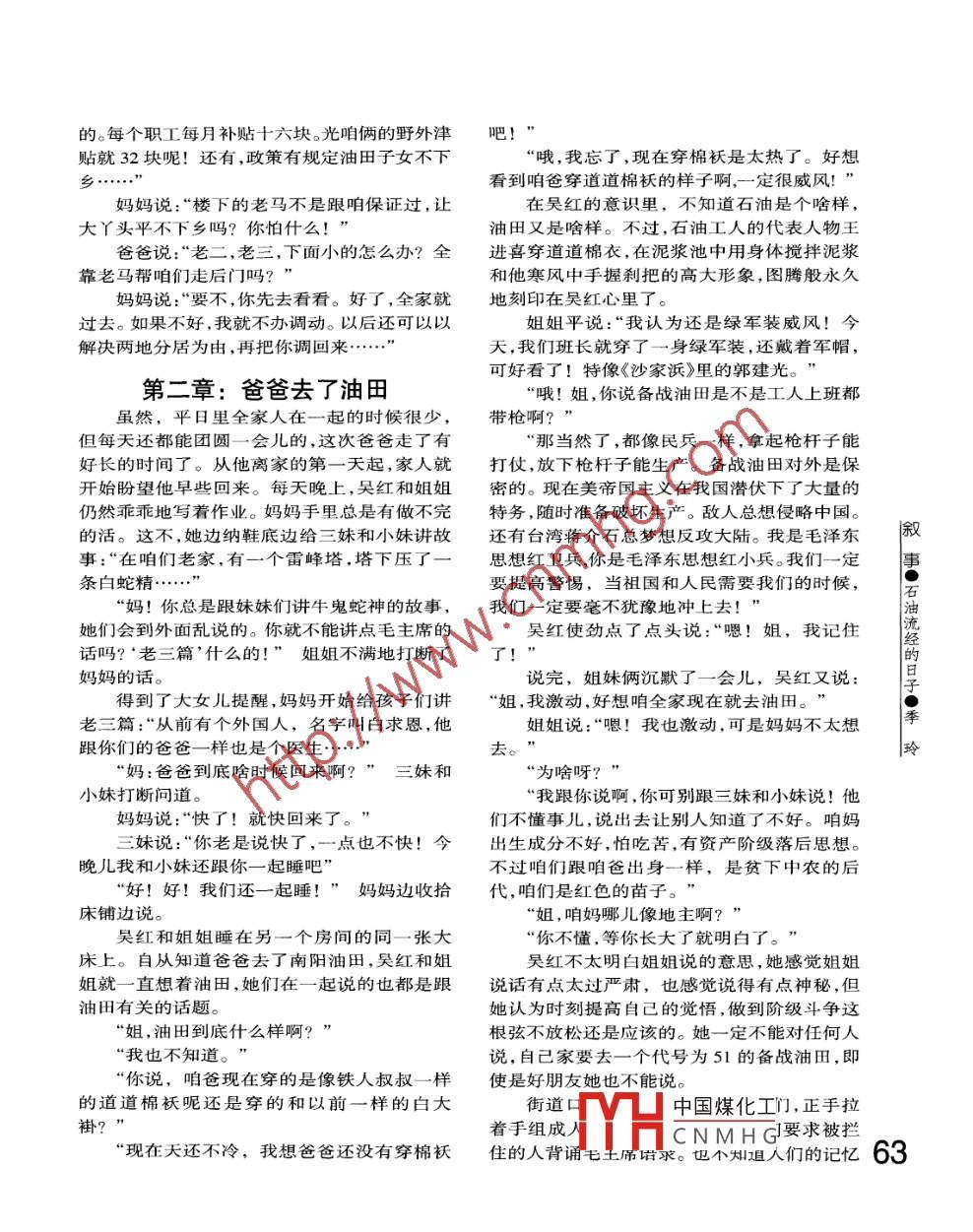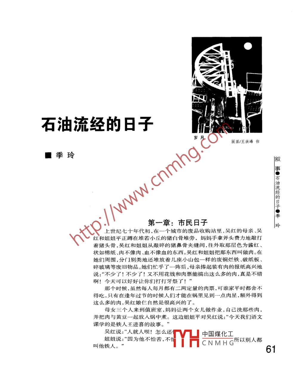 0石油流經(jīng)的日子歲月版畫/王洪峰作11季玲事石經(jīng)的第一章:市民日子玲上世紀(jì)七十年代初,在一個(gè)城市的廢品收購(gòu)站里,吳紅的母親、吳紅和姐姐平正蹲在堆若小丘的豬白骨堆旁,媽媽手拿斧頭費(fèi)力地敲打著豬頭骨,吳紅和姐姐從敲碎的豬鼻骨夾縫間,往外取那層色為醬紅、狀如棉紙、肉不像肉、血不像血的東西。吳紅和姐姐把那東西叫做肉。在她們周圍.分門別類地還堆放著幾座小山包一樣的廢銅爛鐵、破紙板、碎玻璃等廢舊物品。她們忙乎了一陣后,母親捧起裝有肉的報(bào)紙高興地說:“不少了!不少了!又不用花錢和肉票能搞出這么多的肉,真是不錯(cuò)啊!今天可以好好讓你們打打牙祭了!”那個(gè)時(shí)候,雖然每人每月都有二兩定量的肉票,可誰家平時(shí)都舍不得吃,只有在逢年過節(jié)的時(shí)候人們才能在鍋里見到一點(diǎn)肉星,額外得到這么多的肉,吳紅娘仨自然是很高興的了。母女三個(gè)人來到值班室,媽媽讓兩個(gè)女兒做作業(yè).自己洗那些肉,并把肉與黃豆-起放人鍋中煮。這邊姐姐平對(duì)吳紅說:“今天我們語文課學(xué)的是鐵人王進(jìn)喜的故事?!眳羌t說:“人就人唄!怎么還中國(guó)煤化工姐姐說:“因?yàn)樗慌驴?不YHCN MH G所以別人都叫他鐵人?!?1吳紅似懂非懂地“哦”了- -聲。里舉的是三角小紅旗,他們隊(duì)員手里舉的是各姐姐又說:“大冬天,鐵人跳進(jìn)泥漿池,用身色彩旗,嘴里喊著:“毛主席萬歲,萬歲,萬萬歲!體攪拌泥漿,他都不怕冷!”為人民服務(wù)....”姐姐并不明白身體攪拌泥漿是怎么回事,其它單位的方隊(duì)有的舉著紅旗,有的踩著不過她知道那是工作需要。吳紅是什么都不懂,高蹺,場(chǎng)面喧嘩,熱鬧。吳紅和伙伴們跟著游行但她知道冬天在泥漿池里會(huì)感覺很冷。的隊(duì)伍。沿途有些宣傳牌,宣傳的內(nèi)容與現(xiàn)在的姐姐又說:“你看到大街上十字路口的大標(biāo)城市廣告相比要簡(jiǎn)單得多,大多是毛主席舉手語牌了嗎?上面不是寫著工業(yè)學(xué)大慶,農(nóng)業(yè)學(xué)大檢閱紅衛(wèi)兵、打倒走資派的廣告牌。在鐵人王進(jìn)寨嗎?大慶就是鐵人王進(jìn)喜工作的地方,大慶是喜的廣告牌子前,吳紅停了下來,她指著廣告牌個(gè)油田。跟小朋友說:“我姐姐這兩天學(xué)的語文課就是講吳紅說:“哦!那牌上穿道道棉襖,戴棉帽,鐵人王進(jìn)喜的。”走了不多遠(yuǎn)的路吳紅和小朋友手里抓著鐵棍的叔叔是不是王鐵人叔叔呀?!眰兙屠哿?她們返回家屬院,在小巷的深處分散姐姐說:“就是他,那是他手握剎把,正在鉆而去。井呢!鐵人叔叔說了,要把中國(guó)貧油的帽子扔到晚_上,吳紅和姐姐平在寫作業(yè),媽媽坐在床太平洋去,決不讓帝國(guó)主義看我們的笑話?!鄙峡椕?三妹、四妹就圍在媽媽身邊。爸爸回吳紅說:“哦,鐵人叔叔好偉大啊!來了,他人剛進(jìn)門,三妹、四妹就吵著讓他抱,吳“當(dāng)然偉大啦!你沒聽說過么?石油工人一紅和姐姐也跑過來撲在爸爸身上。敘|聲吼,地球也要抖三抖呢....媽媽催促道:“快收拾你們的書本,早點(diǎn)睡!事這時(shí),媽媽掀開鍋蓋,一股香味飄了過來,明天還要_上學(xué)呢!”吳紅和姐姐齊聲說道:“好香啊!媽,肉是不是煮吳紅和姐姐收拾好文具,拿著書包來到另好了?”倆姐妹跑到煤爐子邊上,對(duì)著鍋嘰嘰喳外的房間,爸爸背著三妹抱著四妹也跟了過來。經(jīng)流喳,指指點(diǎn)點(diǎn)。他把兩個(gè)小丫頭放到了大床上,回到媽媽身邊,的媽媽邊攔著姐妹倆邊笑著說:“別燙著你對(duì)媽媽說:“你在找什么?我有話跟你說?!眰儯琘頭家家,怎么這么嘴饞!”吳紅用手捏了媽媽邊下床找鞋邊說:“等一下!我去看一- -粒豆子快速放到嘴里叫:“好燙!嗯!真下孩子們?!奔鞠闼嫘Φ卣f:“我剛數(shù)過了,四個(gè)一個(gè)不玲|在物質(zhì)貧乏的年代,大人們見到好吃的都饞得要命更何況是孩子呢!媽媽笑著白了他--眼“去你的!數(shù)小豬呢?媽媽找來紙張疊成兩個(gè)三角狀紙包,把鍋看一下我心里踏實(shí)。”睡在床上,她對(duì)他說:“今里的豆兒和肉放在三角包里。姐妹倆也好像感天我去水產(chǎn)公司,你的戰(zhàn)友小趙把沒頭沒尾的覺東西放進(jìn)三角包里吃起來更香,她們很愿意魚段,按低等價(jià)論堆全賣給我了,別人都有意見把吃肉、豆的時(shí)間盡量拉長(zhǎng)。了,想分--點(diǎn)都沒分到,那可全是沒頭、尾的肉城市里很多單位都在搞串聯(lián)游行。今天,吳段啊!紅爸媽的單位,被安排到同一天游行。搞游行爸爸對(duì)媽媽說:“我有個(gè)重要的事跟你商學(xué)校放假一天。吳紅約上同家屬院的小伙伴:張量。國(guó)家在南陽地區(qū)發(fā)現(xiàn)了石油,那里要建設(shè)一玲,于英,美琦一起去看游行。個(gè)備戰(zhàn)油田。代號(hào)51。51油田需要一批又紅又游行隊(duì)伍里,收購(gòu)站的方隊(duì)隊(duì)員統(tǒng)- - 著藍(lán)專的人員,我和張醫(yī)生都報(bào)了名?!毖b。吳紅的媽媽穿著藍(lán)裝,翻著潔白的領(lǐng)子,在媽媽態(tài)度堅(jiān)決地說:“不行!你沒聽說嗎?石昊紅和小伙伴的眼里,吳紅的媽媽漂亮極了。藍(lán)油上的生活條件是很差的。為什么工業(yè)學(xué)大慶?色方隊(duì)舉著毛主席語錄,整齊地喊著口號(hào):“人為什么全國(guó)人民學(xué)鐵人?那是因?yàn)樘嗔?常人民公社萬歲!總路線萬歲!大躍