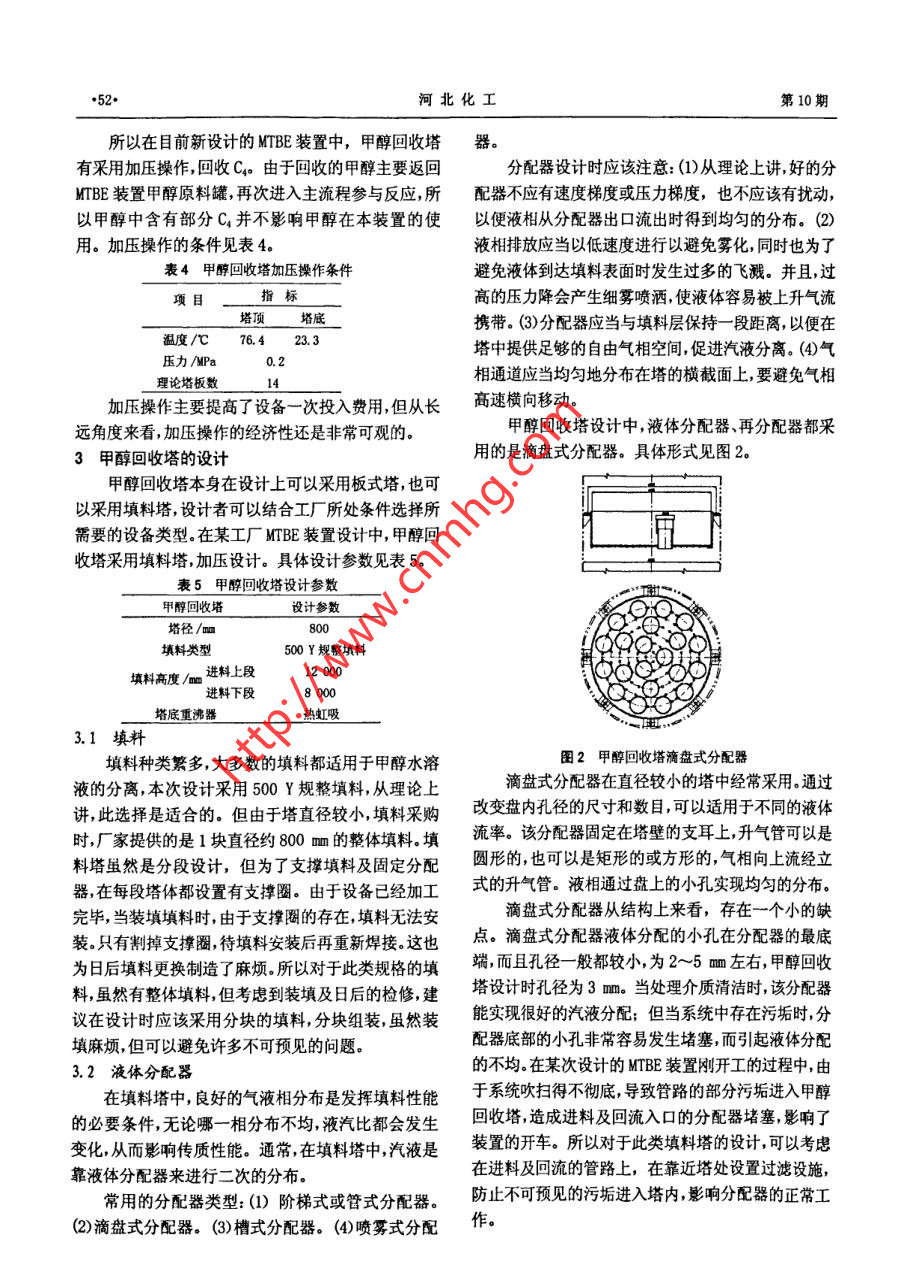 第32卷第10期VoL32 Na 102009年10月河北化工Oct. 2009甲醇回收塔設(shè)計(jì)優(yōu)化張沖(中石油東北煉化工程有限公司葫蘆島設(shè)計(jì)院,遼寧葫蘆 島125001)[摘要]對(duì)甲醇水溶液的分離操作條件進(jìn)行了對(duì)比,對(duì)于MTBE裝置甲醇回收塔,采用加壓分離甲醇水溶液。有利于回收進(jìn)料中的C,輕組分。另外,對(duì)甲醇回收塔設(shè)計(jì)中比較常見(jiàn)的問(wèn)題,如填料選擇、液體分配器的設(shè)計(jì)及塔底重沸器的選型,根據(jù)設(shè)計(jì)實(shí)踐進(jìn)行了分析,并提出了良好的設(shè)計(jì)建議。[關(guān)鍵詞]甲醇回收;加壓;液體分配器;重沸器[中圖分類(lèi)號(hào)] TQ 205[文獻(xiàn)標(biāo)識(shí)碼] B[文章編號(hào)] 1003-5095 (00)10-0051-03甲醇與水的分離,通常采用分餾的方法。在甲基的分離有可能采用其他方案。如MTBE裝置,進(jìn)入甲醇叔丁基醚OITBED裝置中,過(guò)量甲醇與異丁烯反應(yīng)生成回收塔的原料內(nèi)含有3%左右的C,組分,具體組成見(jiàn)MTBE,剩余的甲醇,通過(guò)水洗的方式從未反應(yīng)C4中分表2。離出來(lái),為了降低成本,通常這部分甲醇都要求回收,表2 MTBE 裝置甲醇回收塔原料組成循環(huán)使用。指標(biāo)組分產(chǎn)量/kg+h-T 含量(wt)店1甲醇回收流程異丁烷2.011 0. 119甲醇水分離是最基本的二元分離過(guò)程,采用常規(guī)丁烯-17.5260.445分離方式即可以實(shí)現(xiàn),MTBE裝置中,甲醇回收示意流正丁烷.0.748 0. 044程見(jiàn)圖1.順丁J烯5.620.332B-一些反丁烯.8.9460.53甲醇166. 8759.881 497. 50588. 65合計(jì)1 689.231100鴨雅溫度/C40壓力/MPa0.6密度/kg*cm3944. 982心如果采用常壓操作條件,則塔頂每小時(shí)約有圖1 甲醇水分離示意流程50 kg的放空,放空的組分-般都進(jìn)入了裝置的火炬2操作條件系統(tǒng)白白燒掉,對(duì)于年產(chǎn)4萬(wàn)t的MTBE裝置,每年大2.1 常規(guī)操作條件約達(dá)到420 t左右C.損失掉,按3 000元/t估算, .甲醇水溶液的分離比較容易,采用常規(guī)分餾方損失大約達(dá)到126萬(wàn)元。MTBB裝置甲醇回收塔放空案,在常壓下即可實(shí)現(xiàn),甲醇水分離常規(guī)操作條件見(jiàn)組分的組成見(jiàn)表3。表1。表3甲醇回收塔放空組分的組成表1甲醇水溶液分離操作條件_組分產(chǎn)量Akg-h+7 含量()萬(wàn)項(xiàng)塔項(xiàng)塔底1.61 .丁烯-1 5.4010.862. 0104.1正丁烷0.550.1順丁烯3.496.9理論塔板數(shù)12反丁烯5.9511.82.2加壓分離33.066.0對(duì)于某些化工裝置考慮到其他因素,甲醇水溶液[收稿日期]200904-24[作者簡(jiǎn)介]張沖(1972-),女,工程師,從事工藝設(shè)計(jì)工作。壓幼MPe_0.●52●河北化工第10期所以在目前新設(shè)計(jì)的MTBE裝置中,甲醇回收塔器。有采用加壓操作,回收C。由于回收的甲醇主要返回分配器設(shè)計(jì)時(shí)應(yīng)該注意: (1)從理論上講,好的分MTBE裝置甲醇原料罐,再次進(jìn)入主流程參與反應(yīng),所配器不應(yīng)有速度梯度或壓力梯度,也不應(yīng)該有擾動(dòng),以甲醇中含有部分Cs并不影響甲醇在本裝置的使以便液相從分配器出口流出時(shí)得到均勻的分布。(2)用。加壓操作的條件見(jiàn)表4。液相排放應(yīng)當(dāng)以低速度進(jìn)行以避免霧化,同時(shí)也為了表4甲醇回收塔加壓操作條件避免液體到達(dá)填料表面時(shí)發(fā)生過(guò)多的飛濺。并且,過(guò)項(xiàng)目指標(biāo)高的壓力降會(huì)產(chǎn)生細(xì)霧噴灑,使液體容易被上升氣流塔頂塔底攜帶。(3)分配器應(yīng)當(dāng)與填料層保持-段距離,以便在溫度/C76.4 23.3塔中提供足夠的自由氣相空間,促進(jìn)汽液分離。(4)氣壓力/MPa0.2相通道應(yīng)當(dāng)均勻地分布在塔的橫截面上,要避免氣相理論塔板數(shù)加壓操作主要提高了設(shè)備一次投入費(fèi)用,但從長(zhǎng)高速橫向移動(dòng)。遠(yuǎn)角度來(lái)看,加壓操作的經(jīng)濟(jì)性還是非常可觀的。甲醇回收塔設(shè)計(jì)中,液體分配器、再分配器都采用的是滴盤(pán)式分配器。具體形式見(jiàn)圖2。3甲醇回收塔的設(shè)計(jì)甲醇回收塔本身在設(shè)計(jì)上可以采用板式塔,也可以采用填料塔,設(shè)計(jì)者可以結(jié)合工廠所處條件選擇所需要的設(shè)備類(lèi)型。在某工廠MTBE裝置設(shè)計(jì)中,甲醇回收塔采用填料塔,加壓設(shè)計(jì)。具體設(shè)計(jì)參數(shù)見(jiàn)表5。表5甲醇回收塔設(shè)計(jì)參數(shù)甲醇回收塔設(shè)計(jì)參數(shù)塔徑/m800填料類(lèi)型500 Y規(guī)整填料填料高度/m進(jìn)料上段12 000進(jìn)料下段8 000塔底重沸器熱虹吸3.1填料填料種類(lèi)繁多,大多數(shù)的填料都適用于甲醇水溶圖2甲醇回收塔滴 盤(pán)式分配器液的分離,本次設(shè)計(jì)采用500 Y規(guī)整填料,從理論上滴盤(pán)式分配器在直徑較小的塔中經(jīng)常采用。通過(guò)講,此選擇是適合的。但由于塔直徑較小,填料采購(gòu)改變盤(pán)內(nèi)孔徑的尺寸和數(shù)目,可以適用于不同的液體時(shí),廠家提供的是1塊直徑約8000 m的整體填料。填流率。該分配器固定在塔壁的支耳上,升氣管可以是料塔雖然是分段設(shè)計(jì),但為了支撐填料及固定分配圓形的,也可以是矩形的或方形的,氣相向上流經(jīng)立器,在每段塔體都設(shè)置有支撐圈。由于設(shè)備已經(jīng)加工式的升氣管。液相通過(guò)盤(pán)上的小孔實(shí)現(xiàn)均勻的分布。完畢,當(dāng)裝填