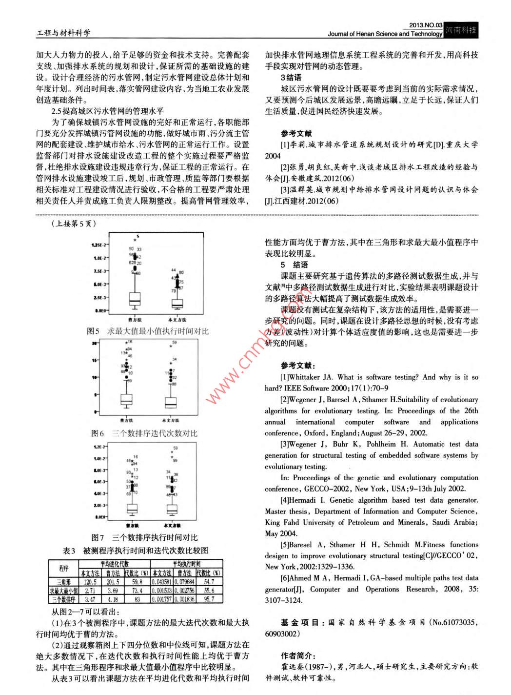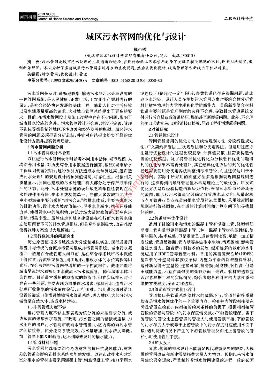 河南科技I2013.NO.03工程與材料科學(xué)Joumal of Henan Science and Technology城區(qū)污水管網(wǎng)的優(yōu)化與設(shè)計錢小稀(武漢市政工程設(shè)計研究院有限責(zé)任公司,湖北武漢 430015)摘要:污水管網(wǎng)是城市污水處理的主要通道和途徑, 在設(shè)計和施工污水管網(wǎng)時除了要滿足相關(guān)規(guī)范的同時,還要因地制宜,做到科學(xué)經(jīng)濟。本文分析了當(dāng)前城區(qū)污水管網(wǎng)系統(tǒng)存在的主要問題,然后從優(yōu)化設(shè)計,提高管理等方面提出了相應(yīng)對策。關(guān)鍵詞:污水管網(wǎng);優(yōu)化設(shè)計;管理中圖分類號:TU992文獻(xiàn)標(biāo)識碼:A文章編號 : 1003- 5168(2013)06- 0050-02污水管網(wǎng)是及時、通暢地收集、輸送污水到污水處理設(shè)施的泥連接,但是超過一定年限后,多數(shù)管道已存在滲漏問題,造成一種管網(wǎng)系統(tǒng), 是人民健康,正常生活,工農(nóng)業(yè)生產(chǎn)順利進(jìn)行的地下水污染。設(shè)計人員在規(guī)劃污水管網(wǎng)方案時要綜合性分析管保證,是社會經(jīng)濟快速發(fā)展的基礎(chǔ)工程。隨著人們對生活環(huán)境材的材料物理的力學(xué)性質(zhì)和化學(xué)防腐能力。目前新型復(fù)合材料以及生活質(zhì)量更高的追求,這對城市管網(wǎng)系統(tǒng)提出了更高的要管道主要問題是管環(huán)剛度的選擇不合理,導(dǎo)致排水管道系統(tǒng)交求。目前,在污水管網(wǎng)設(shè)計及施工過程中存在不少問題,影響了付運行后容易造成管道擠壓塌陷甚至斷裂等問題。此外,不合理城市排水設(shè)施的完善。污水管網(wǎng)設(shè)計不合理,建設(shè)不完善.管理的接口形式容易出現(xiàn)管道接口松脫,導(dǎo)致工程排污泄露等問題。不到位等都是制約城區(qū)環(huán)境改善和經(jīng)濟發(fā)展的瓶頸。城區(qū)污水2對策研究管網(wǎng)的問題必須得到分析總結(jié),并針對癥結(jié)提出切實可靠的優(yōu)2.1管徑優(yōu)化設(shè)計化設(shè)計方案并提高管理質(zhì)量。管網(wǎng)管徑常用的優(yōu)化方法有線性規(guī)劃方法、分段線性規(guī)劃1污水管網(wǎng)問題分析法、廣義簡約梯度法、二次規(guī)劃法和分支定界法。但是用這些方1.1污水管網(wǎng)設(shè)計不合理法進(jìn)行優(yōu)化設(shè)計的過程比較復(fù)雜,計算值發(fā)散,且需要構(gòu)造恰以往進(jìn)行污水管網(wǎng)設(shè)計時參考不同用水指標(biāo),城市規(guī)模.人當(dāng)?shù)膬?yōu)化模型。除了將管徑優(yōu)化轉(zhuǎn)化為分段管長優(yōu)化問題得均綜合用水量,對歷史綜合用水?dāng)?shù)據(jù)進(jìn)行推算,按照《城市給水到的優(yōu)化結(jié)果不需再處理外,其它經(jīng)典優(yōu)化方法得到的優(yōu)化管工程規(guī)劃規(guī)范》執(zhí)行,這種預(yù)測方法造成水量預(yù)測過高,進(jìn)而造徑還需要使用分支定界法圓整到標(biāo)準(zhǔn)管徑,而且這僅適用于小.成污水處理廠的規(guī)劃設(shè)計的預(yù)測值偏高,可靠性差。根據(jù)相關(guān)型管網(wǎng)。實際中所采用的圓整方法多是根據(jù)就近圓整規(guī)則進(jìn)質(zhì)量顯示.我國已建成的污水處理廠有大部分處于停產(chǎn)或半停行的,這樣得到的最終管徑值不再是理論上的最優(yōu)值。啟發(fā)式產(chǎn)的狀態(tài)。此外,污水處理系統(tǒng)的設(shè)計缺乏科學(xué)性還表現(xiàn)在污優(yōu)化方法是以經(jīng)驗構(gòu)造的算法為依托.根據(jù)污水管道經(jīng)濟流速水處理作用有限,排水系統(tǒng)功能單- - 。當(dāng)前大多數(shù)城市尤其是的范圍.地形和污水管道定線確定各管段水流動向.從最起端中小型城鎮(zhèn)主要仍采用‘雨污合流"的排水體系,主要考慮雨水節(jié)點開始進(jìn)行節(jié)點流量向排水管段的流量累加,采用就近圓整的排泄功能.設(shè)計水力坡度值偏小,早季水量減少,攜帶運移能規(guī)則進(jìn)行管徑圓整,在合適的計算時間和計算空間下能尋找最力差,使得污水中的沉積物、建筑垃圾大量淤塞管道,影響內(nèi)澇好的解。排除,污染多發(fā)。雖然住房和城鄉(xiāng)建設(shè)部在推行雨水和污水獨2.2管道材料優(yōu)化設(shè)計立使用兩套不同的排水管道排放,但是牽涉范圍極大,改造難度適用于排除雨水和污水的混凝土管有混凝土管,輕型鋼筋使得這種方案難以大規(guī)模推廣?;炷凉芎椭匦弯摻罨炷凉苋N。混凝土管材抗壓性強、使1.2現(xiàn)行截流井的問題突出用年限久技術(shù)成熟.但是重量重.運輸費用較高、承插口加工精歷史原因使很多老城改造為分流制難以實施,現(xiàn)行通常用度較低.管道易滲漏,管內(nèi)壁容易滋生水生物,清理困難.影響管截流井與傳統(tǒng)的合流排污管網(wǎng)組成排污管網(wǎng)系統(tǒng)。城市污水截道過水能力。隨著新材料技術(shù)的發(fā)展.越來越多的城市排水系流井--.般建在合流管道人河口前,是在綜合考慮城市污水截流統(tǒng)應(yīng)用了HDPE管等新型材料。常用的高密度聚乙烯(HDPE)干管位置.合流管渠位置、周圍地形、排放水體的水位高程等因塑料管的外壁是環(huán)狀波紋結(jié)構(gòu),內(nèi)壁為平滑的新型塑料管材。素后,在合流制排污管網(wǎng)中增加的一個控流部件。截流井能將這種新型管材重量輕、連接可靠、抗磨損耐腐蝕、韌性高,但是城市早流污水和初期