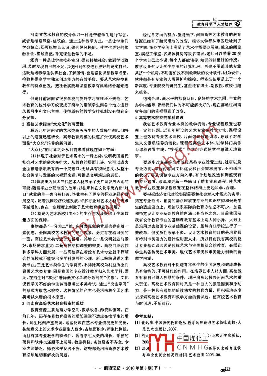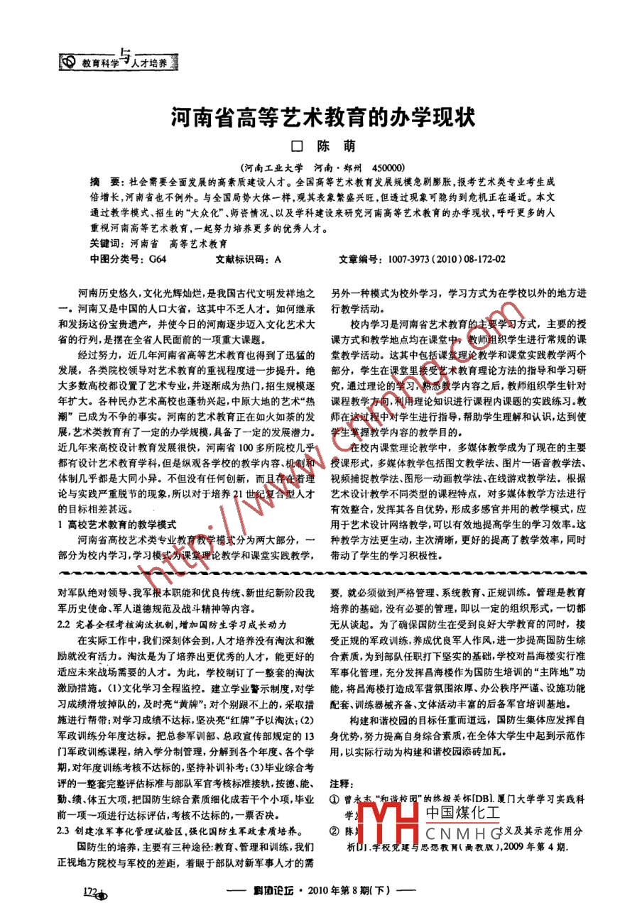 回教育科學與人大才培養(yǎng)了河南省高等藝術(shù)教育的辦學現(xiàn)狀D.陳甫(河南工業(yè)大學河南.鄭州 4500000商要:社會需要全面發(fā)展的高素質(zhì)建設(shè)人才。全國高等藝術(shù)教育發(fā)展規(guī)模急劇膨脹,報考藝術(shù)類專業(yè)考生成倍增長,河南省也不例外。與全國局勢大體一樣,觀其表象繁盛興旺,但透過現(xiàn)象可隱約到危機正在逼近。本文通過教學模式、招生的“大眾化”.師資情況、以及學科建設(shè)來研究河南高等藝術(shù)教育的辦學現(xiàn)狀,呼吁更多的人重視河南高等藝術(shù)教育,一起努力培養(yǎng)更多的優(yōu)秀人才。關(guān)鍵詞:河南省高等藝術(shù)教育中圖分類號: C64文獻標識碼: A文章編號: 1007-3973 (2010)08-172-02河南歷史悠久,文化光輝燦爛,是我國古代文明發(fā)祥地之另外- -種模式為校外學習,學習方式為在學校以外的地方進一.河南又是中國的人口大省,這其中不乏人才。如何繼承 行教學活動。和發(fā)揚這份寶貴遺產(chǎn),并使今日的河南逐步邁入文化藝術(shù)大校內(nèi)學習是河南省藝術(shù)教育的主要學習方式,主要的授省的行列,是擺在全省人民面前的-項重大課題。課方式和教學地點均在課堂中,教師組織學生進行常規(guī)的課經(jīng)過努力,近幾年河南省高等藝術(shù)教育也得到了迅猛的堂教學活動。 這其中包括課堂理論教學和課堂實踐教學兩個發(fā)展,各類院校領(lǐng)導(dǎo)對藝術(shù)教育的重視程度進-一步提升。絕部分,學生在課堂里接受藝術(shù)教育理論方法的指導(dǎo)和學習研大多數(shù)高校都設(shè)置了藝術(shù)專業(yè),并逐漸成為熱門,招生規(guī)模逐究, 通過理論的學習,熟悉教學內(nèi)容之后,教師組織學生針對年擴大。各種民辦藝術(shù)高校也蓬勃興起,中原大地的藝術(shù)“熱課程 教學方向,利用理論知識進行課程內(nèi)課題的實踐練習。教潮”已成為不爭的事實。河南的藝術(shù)教育正在如火如茶的發(fā)師在這過程中對學 生進行指導(dǎo),幫助學生理解和認識,達到使展,藝術(shù)類教育有了一-定的辦學規(guī)模,具備了 - -定的發(fā)展?jié)摿ΑW生掌握 教學內(nèi)容的教學目的。近幾年來高校設(shè)計教育發(fā)展很快,河南省100多所院校幾乎在校內(nèi)課堂理論教學中,多媒體教學成為了現(xiàn)在的主要都有設(shè)計藝術(shù)教育學科,但是縱觀各學校的教學內(nèi)容、機制和授課形式, 多媒體教學包括圖文教學法、圖片一語音教學法、體制幾乎都是大同小異。不但沒有任何創(chuàng)新,而且存在著理視頻捕 捉教學法、圖形-動畫教學法、在線游戲教學法。根據(jù)論與實踐嚴重脫節(jié)的現(xiàn)象,所以對于培養(yǎng)21世紀復(fù)合型人才藝術(shù) 設(shè)計教學不同類型的課程特點,對多媒體教學方法進行的目標相差甚遠。有效整合,發(fā)揮其各自優(yōu)勢,形成多感官并用的教學模式,應(yīng)1高校藝術(shù)教育 的教學模式用于藝術(shù)設(shè)計網(wǎng)絡(luò)教學,可以有效地提高學生的學習效率.這河南省高校藝術(shù)類專業(yè)教育教學模式分為兩大部分,-種教學方法更生動, 主次清晰,更好的提高了教學效率,同時部分為校內(nèi)學習,學習模式為課堂理論教學和課堂實踐教學,帶動 了學生的學習積極性。對軍隊絕對領(lǐng)導(dǎo)、我軍根本職能和優(yōu)良傳統(tǒng)、新世紀新階段我要, 就必須做到嚴格管理、系統(tǒng)教育、正規(guī)訓(xùn)練。管理是教育軍歷史使命、軍人道德規(guī)范及戰(zhàn)斗精神等內(nèi)容。培養(yǎng)的基礎(chǔ),沒有必要的管理,即以- -定的組織形式, - -切都2.2完善全程考核淘汰機制,增加國防生學習成長動力無從談起。為了確保國防生在受到良好大學教育的同時,接在實際工作中,我們深刻體會到,人才培養(yǎng)沒有淘汰和激受 正規(guī)的軍政訓(xùn)練,養(yǎng)成優(yōu)良軍人作風,進-步提高國防生綜勵就沒有活力。淘汰是為了培養(yǎng)出更優(yōu)秀的人才,能更好的合素質(zhì), 為到部隊任職打下堅實的基礎(chǔ),學校對昌海樓實行準適應(yīng)未來戰(zhàn)場需要的人才。為此,學校制訂了一整套的淘汰軍事化 管理,充分發(fā)揮昌海樓作為國防生培訓(xùn)的“主陣地”功激勵措施。(1)文化學習全程監(jiān)控。建立學業(yè)警示制度,對學能, 將昌海樓打造成軍營氛圍濃厚、辦公秩序嚴謹、設(shè)施功能習成績滑坡掉隊的,及時亮“黃牌”;對個別跟不上的,采取措配套、 訓(xùn)練器械齊備、文體活動豐富的后備軍官培訓(xùn)基地。施進行幫帶;對學習成績不達標,堅決亮“紅牌”予以淘汰: (2)構(gòu)建和諧校園的目標任重而道遠,國防生集體應(yīng)發(fā)揮自軍政訓(xùn)練分年度達標。把總參軍訓(xùn)部、總政宣傳部規(guī)定的13身優(yōu)勢, 努力提高自身綜合素質(zhì),在全體大學生中起到示范作門軍政訓(xùn)練課程,納入學分制管理,分解到各個年度、各個學用, 以實際行動為構(gòu)建和諧校園添磚加瓦。期,對年度訓(xùn)練考核不達標的,堅持補訓(xùn)補考: (3)畢業(yè)綜合考評的一整套完整評估標準與部隊軍官考核標準接軌,按德、能、注釋:勤、績、體五大項,把國防生綜合素質(zhì)細化成若干個小項,畢業(yè)① 曾永杰“和諧校園”的終極關(guān)懷[DB].廈門大學學習實踐科前一項一項進行達標評估,考