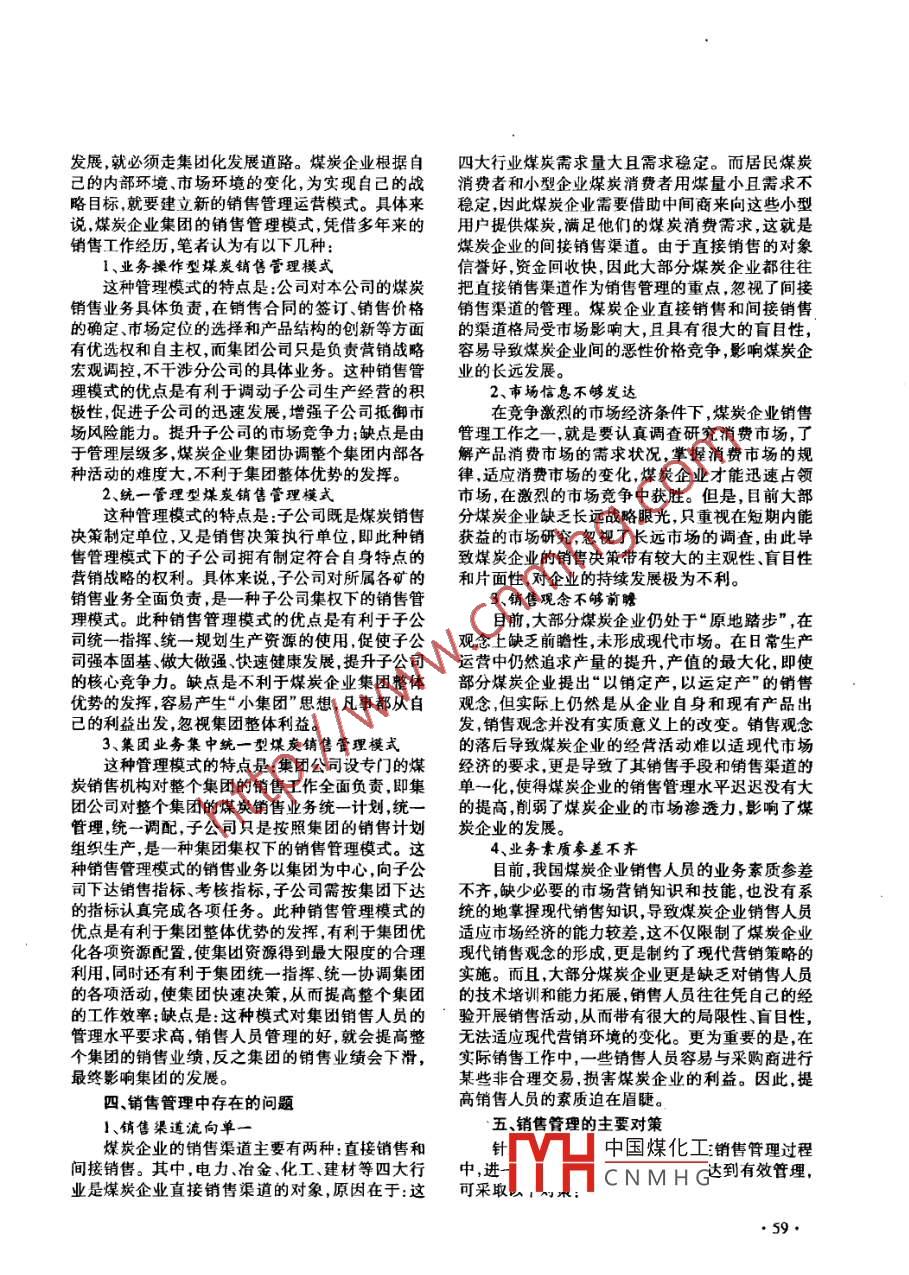 試析煤炭銷售管理劉金生(神華包頭礦業(yè)公司運(yùn)銷處,內(nèi)蒙古包頭014100)離要:市場經(jīng)濟(jì)快速發(fā)展,煤炭企業(yè)的銷售管理,在整個煤炭企業(yè)中起著.龍頭的引領(lǐng)作用,銷售管理越來越重要龍頭活了,全盤皆勝。人們通常認(rèn)為銷售管理是企業(yè)的生命線。煤炭企業(yè)要重新審視銷售管理,探討煤炭企業(yè)銷售管理的有效性,采取有效措施,提升銷售管理水平,從而推進(jìn)煤炭企業(yè)銷售管理市場化,進(jìn)一步提高煤炭企業(yè)的競爭力。關(guān)鍵詞:煤炭銷售;有效管理dol:10. 3969/j. ssn.1008 -0155. 2012.05.028中國分類號:F274文章編號:1008 -0155(2012)05 -0058 -03當(dāng)前,隨著市場經(jīng)濟(jì)快速發(fā)展,煤炭企業(yè)需要重力問題,特別是協(xié)調(diào)好與鐵路方面的關(guān)系至關(guān)重新審視銷售管理,探討煤炭企業(yè)銷售管理的有效性,要,它是解決銷售工作中。只有弄清楚這些問題,采取有效措施,提升銷售管理水平,從而推進(jìn)煤炭企才能夠制定出切實而有效的銷售策略和計劃。否業(yè)銷售管理市場化,進(jìn)-步提高煤炭企業(yè)的競爭力。則,銷售計劃難以實現(xiàn),銷售策略是失敗的,銷售管一、銷售管理的含義理是無效的。銷售管理是直接實現(xiàn)銷售收人的過程。具有2.銷售組織結(jié)構(gòu)及人員培訓(xùn).銷售部門根據(jù)本企業(yè)銷售結(jié)構(gòu)、產(chǎn)品流向等因狹義和廣義之分。狹義的銷售管理專指以銷售人員( sales force)素,確定銷售組織架構(gòu),安排銷售部門的人員數(shù)量,為中心的管理。廣義的銷售管理是對所有銷售活做好銷售人員的招聘,業(yè)務(wù)培訓(xùn),以及銷售經(jīng)費的動的綜合管理。銷售管理是為了實現(xiàn)各種組織目預(yù)算和銷售風(fēng)險的評估、管控。在銷售計劃的制訂和落實的過程中,如何組織標(biāo),創(chuàng)造、建立和保持與目標(biāo)市場之間的有益交換銷售部門,如何劃分銷售區(qū)域,如何組建銷售隊伍和聯(lián)系而設(shè)計的方案的分析、計劃、執(zhí)行和控制。和安排銷售人員的工作任務(wù)是- -項非常重要的工通過計劃、執(zhí)行及控制企業(yè)的銷售活動,以達(dá)到企業(yè)的銷售目標(biāo)。也就是實現(xiàn)經(jīng)營成本最佳化,經(jīng)濟(jì)作。銷售部門要根據(jù)銷售任務(wù),銷售區(qū)域分布,銷效益最大化,社會效益最優(yōu)化。售流量的大小,設(shè)置銷售機(jī)構(gòu)的情況,銷售人員的二、銷售管理的內(nèi)容總體素質(zhì)業(yè)務(wù)水平等因素進(jìn)行分析評估,以便落銷售管理的內(nèi)容主要包括:制訂銷售計劃、銷實銷售任務(wù)。另外,根據(jù)業(yè)務(wù)需要,采取形式多樣售策略、銷售組織、人員培訓(xùn),銷售指標(biāo),計劃落的方法,對銷售人員進(jìn)行培訓(xùn),培訓(xùn)內(nèi)容包括經(jīng)濟(jì)學(xué)、市場營銷、執(zhí)行力、營銷禮儀服務(wù)、心理學(xué)等。實、業(yè)績評估等。3.銷售管理考核1、銷售計劃和策略企業(yè)在確定了銷售計劃策略之后,銷售部門據(jù)沒有規(guī)矩就不成方圓。-個企業(yè)要發(fā)展,而且此制定具體的實施銷售計劃方案,努力執(zhí)行企業(yè)的要更大的發(fā)展,就必須有相應(yīng)的制度來約束規(guī)范員銷售任務(wù),盡力達(dá)到企業(yè)的銷售目標(biāo)。銷售部門首工的行為,管理企業(yè)。銷售管理也不例外,通過制先必須清楚地了解和掌握本企業(yè)的經(jīng)營目標(biāo)、產(chǎn)品定高效、系統(tǒng)、完善的相關(guān)的制度,依靠銷售管理者質(zhì)量,其次必須掌握市場銷售動態(tài)、用戶需求等信去實施,來保證銷售任務(wù)的完成。銷售管理的最終息,第三要對市場的經(jīng)營環(huán)境,行業(yè)的競爭趨勢有目的,是為了打開市場銷路,擴(kuò)大市場占有,推銷出一個清晰的認(rèn)知。第四對本企業(yè)資源狀況,做到胸售產(chǎn)品及維持與客戶的關(guān)系,從而完成企業(yè)銷售任中有數(shù)。第五,要解決好運(yùn)力協(xié)調(diào)問題,煤炭企業(yè)務(wù),為企業(yè)創(chuàng)造最佳最大的利潤。的銷售與其他行業(yè)的銷售有所不同,要確保多拉快中國煤化工運(yùn),積極減少庫存,保障正常生產(chǎn),就必須解決好運(yùn)YHCNMHG競爭中謀求長遠(yuǎn).收稿日期:2011-12-19●58●發(fā)展,就必須走集團(tuán)化發(fā)展道路。煤炭企業(yè)根據(jù)自四大行業(yè)煤炭需求量大且需求穩(wěn)定。而居民煤炭己的內(nèi)部環(huán)境、市場環(huán)境的變化,為實現(xiàn)自己的戰(zhàn)消費者和小型企業(yè)煤炭消費者用煤量小且需求不略目標(biāo),就要建立新的銷售管理運(yùn)營模式。具體來穩(wěn)定,因此煤炭企業(yè)需要借助中間商來向這些小型說,煤炭企業(yè)集團(tuán)的銷售管理模式,憑借多年來的用戶提供煤炭,滿足他們的煤炭消費需求,這就是銷售工作經(jīng)歷,筆者認(rèn)為有以下幾種:煤炭企業(yè)的間接銷售渠道。由于直接銷售的對象1、業(yè)務(wù)操作型謀炭銷售管理模式信譽(yù)好,資金回收快,因此大部分煤炭企業(yè)都往往這種管理模式的特點是:公司對本公司的煤炭把直接銷售渠道作為銷售管理的重點,忽視了間接銷售業(yè)務(wù)具體負(fù)責(zé),在銷售合同的簽訂、銷售價格銷售渠道的管理。煤炭企業(yè)直接銷售和間接銷售
