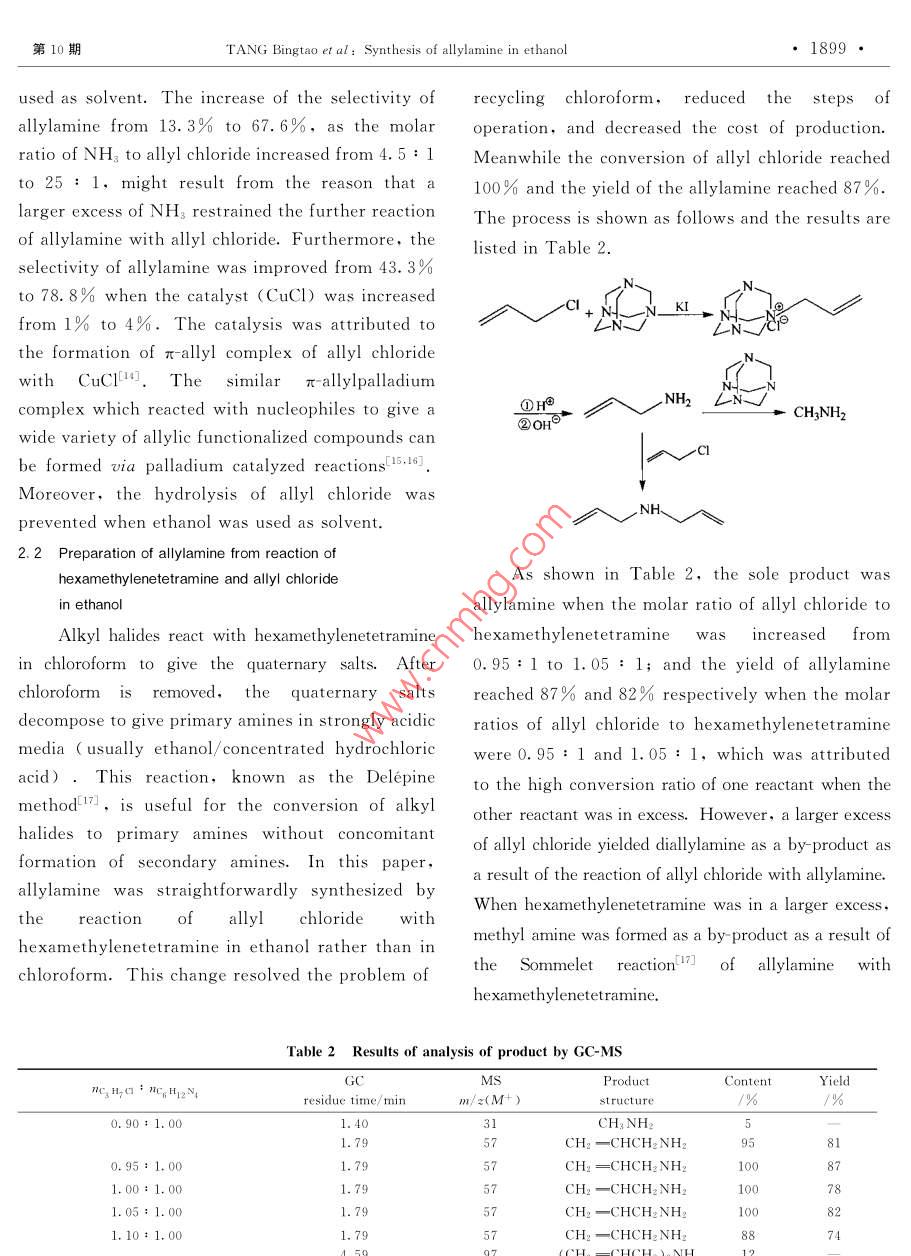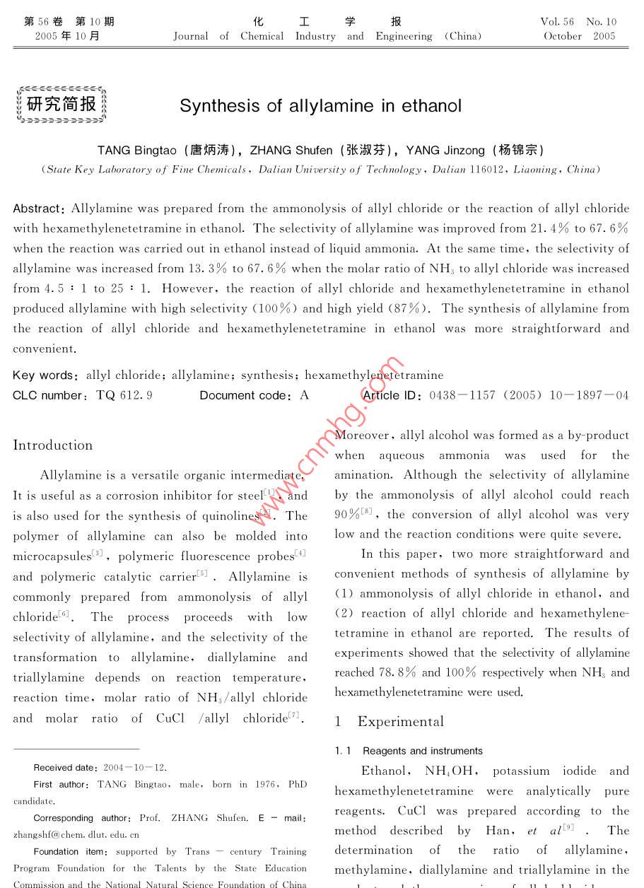 第56卷第10期化工學(xué)報(bào) Vol. 56 No. 102005年10月 Journal of Chemical Industry and Engineering (China) October 2005研究簡(jiǎn)報(bào) Synthesis of allylamine in ethanol222222 TANG Bingtao(唐炳濤), ZHANG Shufen(張淑芬, YANG Jinzong(楊錦宗) (State Key Laboratory of Fine Chemicals, Dalian University of Technology, Dalian 116012, Liaoning, China) Abstract: Allylamine was prepared from the ammonolysis of allyl chloride or the reaction of allyl chloride with hexamethylenetetramine in ethanol. The selectivity of allylamine was improved from 21. 4% to 67.6% when the reaction was carried out in ethanol instead of liquid ammonia. At the same time, the selectivity of allylamine was increased from 13. 3% to 67.6% when the molar ratio of NH, to allyl chloride was increased from 4.5: 1 to 25: 1. However, the reaction of allyl chloride and hexamethylenetetramine in ethanol produced allylamine with high selectivity(100%) and high yield(87%). The synthesis of allylamine from the reaction of allyl chloride and hexamethylenetetramine in ethanol was more straightforward and convenient. Key words: allyl chloride; allylamine; synthesis; hexamethylenetetramine CLC number: TQ 612.9 Document code: A Article ID:0438-1157(2005)10-1897-04 Introduction Moreover, allyl alcohol was formed as a by-product when aqueous ammonia was used for the Allylamine is a versatile organic intermediate. amination. Although the selectivity of allylamine It is useful as a corrosion inhibitor for steel11, and by the ammonolysis of allyl alcohol could reach is also used for the synthesis of quinolines[]. The 90%[8], the conversion of allyl alcohol was very polymer of allylamine can also be molded into low and the reaction conditions were quite severe. microcapsules3], polymeric fluorescence probes4] In this paper, two more straightforward and and polymeric catalytic carrier5. Allylamine is convenient methods of synthesis of allylamine by commonly prepared from ammonolysis of allyl (1) ammonolysis of allyl chloride in ethanol, and chloride6]. The process proceeds with low (2) reaction of allyl chloride and hexamethylene- selectivity of allylamine, and the selectivity of the tetramine in ethanol are reported. The results of transformation to allylamine, diallylamine and experiments showed that the selectivity of allylamine triallylamine depends on reaction temperature, reached 78. 8% and 100% respectively when NH3 and reaction time, molar ratio of NH3 /allyl chloride hexamethylenetetramine were used. and molar ratio of CuCl /allyl chloride. 1 Experimental 1. 1 Reagents and instruments Received date: 2004-10-12. Ethanol, NH. OH, potassium iodide and First author: TANG Bingtao, male, born in 1976, PhD hexamethylenetetramine were analytically pure candidate Corresponding author: Prof. ZHANG Shufen.- mail: reagents. CuCl was prepared according to the zhangshf@chem.dlut.edu.cn method described by Han, et al.The Foundation item: supported by Trans century Training determination of the ratio of allylamine, Program Foundation for the Talents by the State Education methylamine, diallylamine and triallylamine in the Commission and the National Natural Science Foundation of China11111111898·化工學(xué)報(bào)第56卷 1.2 Ammonolysis of allyl chloride in ethanol GC-MS showed that the product was pure The ethanol solution saturated with NH: allylamine (M+=57).(11.6%,mass,20c)o,CuCl(34mg,0.36 2 Results and discussion mmol) and allyl chloride (0. 7 g, 12 mmol) was added into a stainless steel autoclave reactor 2. 1 Ammonolysis of allyl chloride in ethanol equipped with a magnetic stirrer, and the reactor The reaction of allyl chloride(ac)and was kept at the designated temperature, under the ammonia proceeded in series, and the product was pressure of 0.6 MPa. After 8 h, the reactor was a mixture of monoallylamine (MAA),diallylamine allowed to cool down to room temperature and the (DAA)and triallylamine (TAA). When NH,OH pressure was released slowly. Analysis of the was used, allyl alcohol was formed as a by- product by GC-MS showed that the conversion of product. The process of the reaction is shown as allyl chloride was 100%, and the selectivity of the follows and the results are listed in Table 1. products was as follows: allylamine (M*=57) CH2 -CHCH2+ NH: CH2 -CHCH: NH2 +HCI67.6%, diallylamine(m+=97)24.2% and CH2=chch2n2+ch2=CCH2Cl→ triallylamine (M*=137)8.2%. (CH2 -CHCH: )2NH+HCI 1.3 Preparation of allylamine from reaction of (CH2-CHCH2 )2NH+CH2-CHCH: Cl allyl chloride and hexamethylenetetramine in ethanol A 500 ml three-necked flask equipped with a The data in Table show that when ethanol mechanical stirrer, a reflux condenser and a was used as solvent, the selectivity of the reaction thermometer was charged with allyl chloride (11.6 to generate allylamine reached 67.6%, whereasg,0.15mol), hexamethylenetetramine(20g, when liquid ammonia was used, the selectivity was 0.14 mol), 0.6 g KI (as catalyst) and 300 ml only 21.4%, which might be caused by the ethanol. The mixture was stirred for 10 at 40 C, following two reasons: (1) the polarity of ethanol then 60 ml conc. hydrochloric acid was was useful for stabilizing the x-allyl complex of added. After another 10 h, the solvents were allyl chloride and CuCl, enhancing the reaction of removed under reduced pressure. Then a solution of allyl compounds with nucleophiles1, 12; ()the 25.3 g sodium hydroxide in 250 ml water was strong exothermic amination reaction could take slowly added to the reaction mixture, and the place in a mild condition where the concentration of fraction (52 60 C) was collected. The fraction the reactants was diluted by adding solvent3). The was dried with anhydrous sodium sulfate to give formation of by-product allyl alcohol was due to the 6. 7 g product (84%). Analysis of the product by hydrolysis of allyl chloride when NH, OH was Table 1 Results of ammonolysis of allyl chloride Composition of product Solvents FINH,AC nCuClnAc Tem. /C Ti