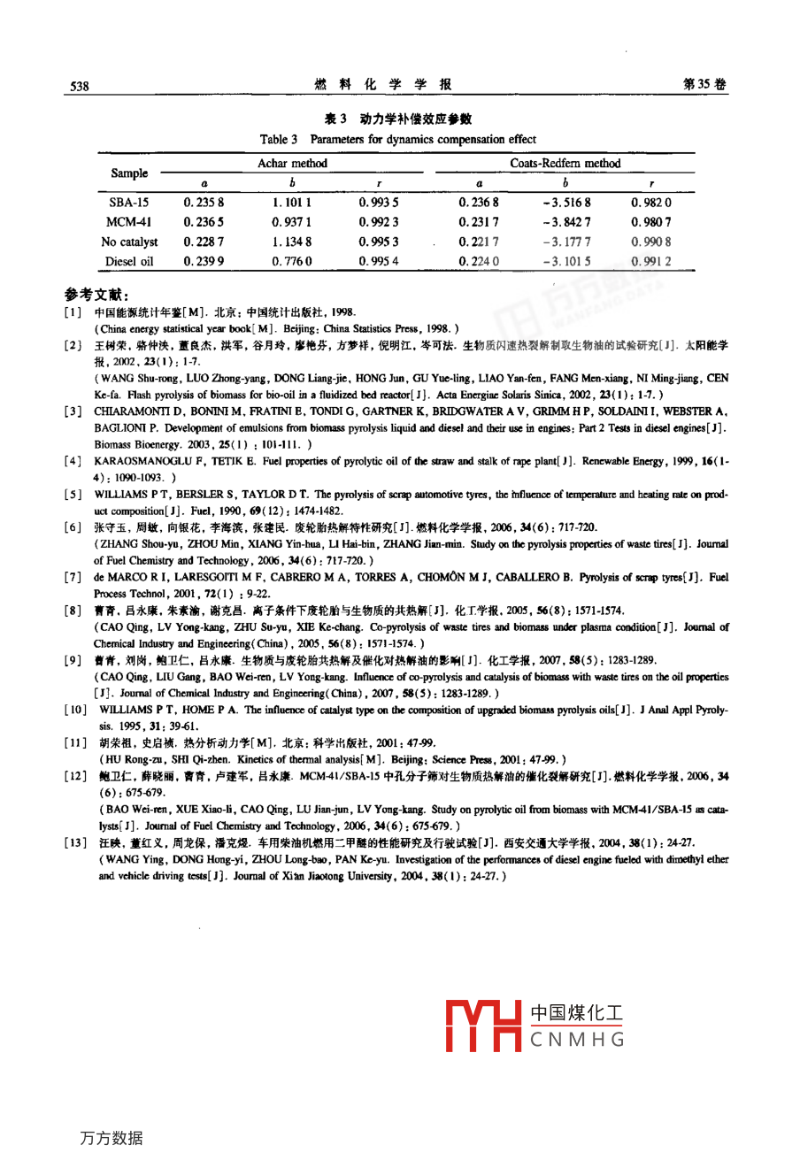 第35卷第5期燃料化學學報Vol 35 No. 32007年10月Journal of Fuel Chemistry and technologoct.2007文章編號:02532409(2007)05053405生物質(zhì)與廢輪胎共熱解催化熱解油蒸發(fā)過程及其動力學研究靳利娥,劉崗',鮑衛(wèi)仁,曹青2(1太原理工大學煤科學與技術(shù)教育部山西省重點實驗室,山西太原030024;2,太原理工大學化工學院,山西太原03004)摘要:采用熱重微商( TG-DTG)法考察生物質(zhì)稻殼與廢輪胎共熱解經(jīng)催化與非催化熱解油的熱失重行為,并同0柴油的熱失重行為進行了比較;同時采用 Acher微分法和 Coats- Redfern積分法對熱解油熱失重蒸發(fā)過程的蒸發(fā)熱進行了計算,并結(jié)合Satava i和 Bagchi法確定了熱失重蒸發(fā)過程的機理函數(shù),建立了0柴油和在催化與非催化條件下得到的熱解油蒸發(fā)過程的動力學方程,得出了在催化與非催化條件下熱解油熱失重過程的機理函數(shù)其動力學方程為da/dr=Aew(1-a)2;而0柴油的熱失重蒸發(fā)過程動力學方程為da/d=1.5Ae-△wm(1-a)23[1-(1-a)]1。蒸發(fā)熱的順序由大到小依次為,柴油>非催化熱解油>SBA-15熱解油>MCM41熱解油。結(jié)果表明,通過建立的模型函數(shù)得到的蒸發(fā)熱與實驗值非常接近。催化劑SBA15和MCM4l的存在對降低高沸點餾分的物質(zhì)具有一定作用,而SBA15催化作用強于MCM41。關(guān)鍵詞:生物質(zhì);廢輪胎;共熱解;催化;熱重分析;熱解油中圖分類號:TK6文獻標識碼;AThermal behavior and dynamics of biomass and waste tyre co-pyrolysis oilJIN Li-e, LIU Gang, BAO Wei-ren, CAO Qing(1. Key Laboratory of Coal Science and Technology, Ministry of Education and Shanxi Province, Taiyuan University of TechnologyTaiyuan 030024, China; 2. Chemical Engineering College, Taiyuan University of Technology, Taiyuan 030024, China)Abstract: Thermal behaviors of commercial diesel oil 0 and pyrolysis oil obtained from co-pyrolysis of biomassand waste tyre blend with or without catalysts )were investigated by thermogravimetric analysis(TG-DTG)Through linear regression, the results illustrated that for pyrolysis oils the thermal kinetic follows the formuladadt=Ae"/R(1-a)and for diesel oil it follows the formula da/dt=1.5Ae-Avk(1-a)[1-(1a)]-. The evaporation heats calculated were 37. 46 k]mol"for SBA-catalyzed pyrolysis oil, 30.60 w.molfor MCM-4l-catalyzed pyrolysis oil, 41.27 k.- for pyrolysis oil without using any catalyst, and 55 50 k. molfor diesel oil 0; these values were close to those reported in the literature. The existence of SBA-15 and MCM41 as catalysts in the pyrolysis can reduce high frof the resultant pyrolysis oil SBA-15 performed betterthan MCM-4l in reducing high fractionsKey words: biomass; waste tyre; co-pyrolysis; catalysis; thermal analysis; pyrolytic oil能源的安全供應對保證社會的穩(wěn)定和經(jīng)濟的可響生物油作為燃料油的推廣1,。單獨熱解廢輪持續(xù)發(fā)展具有重要作用。然而,由于人類對能源的胎存在熱解液體中多環(huán)芳烴的含量較高,重質(zhì)餾分大量消耗和化石燃料資源的日趨減少,尋找可替代和輕質(zhì)餾分的比例偏高等問題。由于生物質(zhì)是能源的研究工作顯得非常迫切。生物質(zhì)和廢輪胎均含氧量較高的一類物質(zhì),廢輪胎是含碳量較高的屬于來源十分豐富的可再生資源。尤其是生物質(zhì),類物質(zhì)°,如將其共熱解利用生物質(zhì)在熱解過程植物每年通過太陽能光合作用生成的生物質(zhì)能總量中產(chǎn)生的大量含氧自由基組分,破壞熱解過程中所約為2200億t,相當于2.88×101k左右是目前不希望存在的某些組分,從而使某些化合物的生成全球總能耗的10倍,并具有CO2接近零排放的受到抑制以提高熱解液體作為燃料的品質(zhì)。其中,優(yōu)勢2。廢輪胎是現(xiàn)代經(jīng)濟發(fā)展過程中另一類可蒸發(fā)熱是衡量燃料品質(zhì)的一個重要指標,但因組成再生的廢棄資源。盡管眾多學者和企業(yè)對廢輪胎采復雜的特點實驗上測定比較困難。為此本研究通用了不同的方式進行過探索和利用但終因各種缺過對生物質(zhì)和廢輪胎混合物共熱解采用熱重分析陷難以形成規(guī)模進行利用。單獨熱解生物質(zhì)得到從微觀的角度研究兩者共熱解在催化與未催化條件的生物油含氧量較高熱值較低、腐蝕性大,從而影下得到執(zhí)解沖的蒸發(fā)執(zhí)同業(yè)O柴油進行了比中國煤化工收稿日期:20001-23;修回日期:20070408CNMHG基金項目:國家自然科學基金(50576062);山西省自然科學基金(200601120)。聯(lián)系作者:曹青,Te:03516014476;Emal:qan2000@63.∞o。作者簡介:靳利娥(1964-),女,山西大同人,副教授,博士研究生,化學工程與技術(shù)專業(yè),Eml:lin2003@163.cm。第5期靳利娥等:生物質(zhì)與廢輪胎共熱解催化熱解油蒸發(fā)過程及其動力學研究較建立合適的動力學方程,確定非等溫動力學參 Coats-Redfern積分法方程h&(a),AR數(shù),以揭示共熱解產(chǎn)生的熱解油在催化前后的揮發(fā)△H性能的差異為評價及尋找新的動力燃料提供參考。仝n2對熱重實驗數(shù)據(jù)進行處理。即分別以h如由1實驗部分11實驗材料稻殼取自農(nóng)田廢棄物經(jīng)烘干粉和lnf()對L/T用最小二乘法對熱解油和柴油熱碎過篩(198um-350m)處理備用。廢輪胎由青失重蒸發(fā)過程的數(shù)據(jù)進行線性回歸求得不同機理島綠葉橡膠有限公司提供(-165μm),MCM41、函數(shù)f(a)和g(a)的動力學參數(shù)△H和nA以及SBA-15由長春吉大高科技股份有限公司提供。相關(guān)系數(shù)r。其中f(a)和g(a)為熱失重蒸發(fā)機理12實驗過程及分
