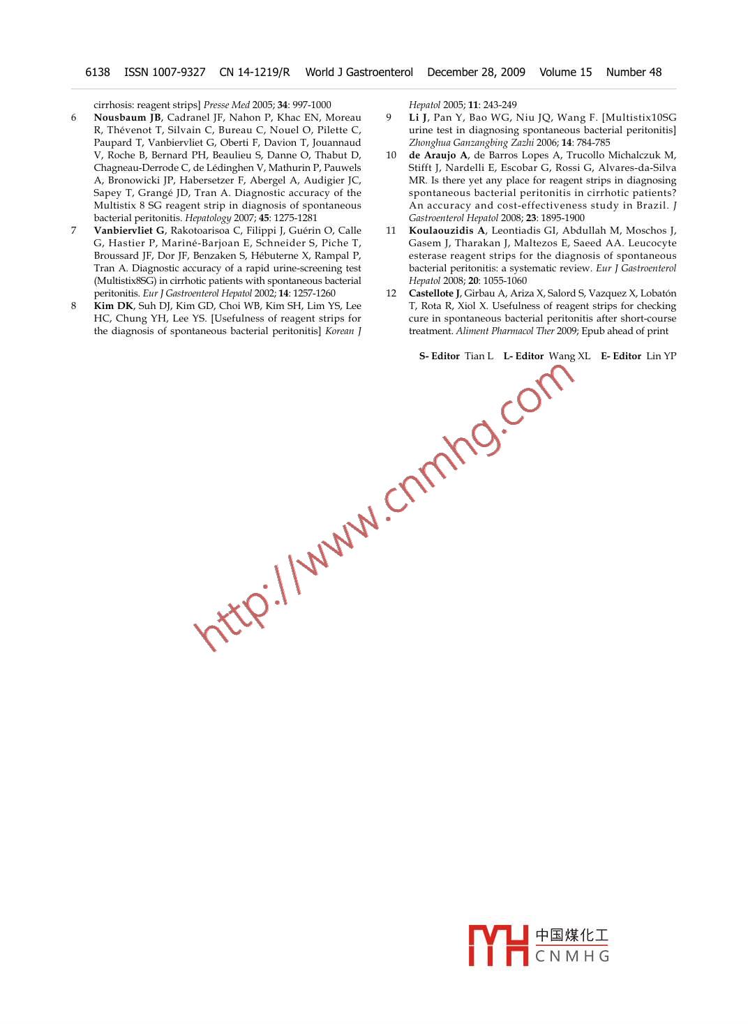 Online Submissions: wjg. wjgnet.comWorld JGastroenterol 2009 December 28; 15(48): 6137-6138wjg@wjgnet.comWorld Jourmal of Gastroenterology ISSN 1007-9327doi:10.3748/ wjg.15.6137◎2009 The W]G Press and Baishideng All rights reserved.LETTERS TO THE EDITORComments on the editorial by Riggio & Ageloni on theascitic fluid analysisAnastasios KoulaouzidisAnastasios Koulaouzidis, Day Case & Endoscopy Unit,I would like to comment on a few points presented inCentre of Liver and Digestive Disorders, Royal Infirmary ofthis editorial. First of all, I would appreciate if the authorsEdinburgh, 51 Little France Crescent, Edinburgh, EH16 4SA,could clarify the statement on the need for collction ofAuthor contributions: Koulaouzidis A reviewed the literature,10 mL ascitic fuid (AF) in ethylenediaminetetraacetic acidanalyzed the data, and wrote the manuscript.(EDTA) containing tube. Universally, most of the EDTACorrespondence to: Anastasios Koulaouzidis, MD, MRCPtubes ("“purple-top or red-top tubes'", used for blood(UK), FEBG, Day Case & Endoscopy Unit, Centre of Liver andcollection) have a maximum capacity of 2.5-3.0 mL. IfDigestive Disorders, Royal Infirmary of Edinburgh, 51 LittleRiggio & Angeloni meant the universal containers, it is myFrance Crescent, Edinburgh, EH16 4SA,understanding that these tubes, except for being sterile,United Kingdom. akoulaouzidis@hotmail.comthey do not contain any anticoagulant. On top of that,Telephone: +44-131-2421603 Fax: +44-131-2421618lovember 13, 2009 Revised: November 27, 2009only 1 mL of fuid is enough for most laboratories to doAccepted: December 4, 2009the differential diagnosis. I disagree with the statementPublished online: December 28, 2009that“following hospitalization of any cirrhotic patientwith newly diagnosed ascites, a diagnostic paracentesisis advised". In fact, all cirrhosis with ascites should havediagnostic paracentesis on hospital admission月AbstractThere are indeed 4 well-disseminated practicalAngeloni et al published a landmark study on the useguidelines and expert's consensus reports, but many otherof Coulter counters in spontaneous bacterial peritonitisnational guidelines have been produced as well".(SBP) diagnosis. Riggio and Angeloni have recentlyRiggio & Angeloni's comprehensive“Table 2”published an editral on the ascitic fluid analysis in should list 90 AF samples and not 47 in the study bydiagnosis and monitoring of SBP. Herein, some pointsWisniewski et al', 2123 samples and not 1041 in the studyof interest are discussed.by Nousbaum et al", and 78 samples and not 72 in thestudy by Vanbiervliet et al', although three studies have⑤2009 The WJG Press and Baishideng. All rights reserved.not been included. In addition, Castellote et al' in arecently published paper argued that the leucocyte reagentKey words: Peritonitis; Reagent; Dipstick; Paracentesis;strips may have a role in repeated paracentesis and henceGuidelines; Ascitesmanagement of SBP.Koulaouzidis A. Comments on the editorial by Riggio &Ageloni on the ascitic fluid analysis. World J GastroenterolREFERENCES2009; 15(48): 6137-6138 Available from: URL: htp://ww.w1 Riggio O, Angeloni S. Ascitic fluid analysis for diagnosiswjgnet.com/ 1007-9327/15/6137.asp DOI: http://dx.doi.and monitoring of spontaneous bacterial peritonitis. World ]org/10.3748/wjg. 15.6137Gastroenterol 2009; 15: 3845-38502 Angeloni s, Nicolini G, Merli M, Nicolao F, Pinto G, AronneT, Attili AF, Riggio O. Validation of automated blood cellcounter for the determination of polymorphonuclear cellcount in the ascitic fluid of cirrhotic patients with or withoutTO THE EDITORspontaneous bacterial peritonitis. Am J Gastroenterol 2003; 98:I read with great interestthe editorial of Riggio &3 Rimola A, Garcia-Tsao G, Navasa M, Piddock LJ,1844-1848Angeloni on“The ascitic fluid analysis for diagnosisPlanas R, Bernard B, Inadomi JM. Diagnosis, treatmentand monitoring of spontaneous bacterial peritonitis"and prophylaxis of spontaneous bacterial peritonitis: aIn 2003, Angeloni et al- published the landmark paper,consensus dcraumant Intgrnatins! Acritae Club. J Hepatolwhich set a new era in the diagnostic algorithm of2000; 32: 142-中國煤化工spontaneous bacterial peritonitis (SBP), allowing manyKoulaouzidisHCNMHG2.1049eous tbacterialperitonitis. n-1049clinicians and laboratory staff to feel secure in switching5 Wisniewski B, Rautou PE, Al Sirafi Y, Lambare-Narcy B, .from polymorphonuclear (PMN) manual count to theDrouhin F, Constantini D, Fischer D, Labayle D, Denis J.automated one.[Diagnosis of spontaneous ascites infection in patients with.www.wjgnet.com6138 ISSN 1007-9327CN 14-1219/R World J Gastroenterol December 28, 2009 Volume 15 Number 48cirrhosis: reagent strips] Presse Med 2005; 34: 997-1000Hepatol 2005; 11: 243-249i Nousbaum JB, Cadranel JF, Nahon P, Khac EN, Moreau9 Li J, Pan Y, Bao WG, Niu JQ, Wang F. [Multistix10SGR, Thevenot T, Silvain C, Bureau C, Nouel O, Pilette Curine test in diagnosing spontaneous bacterial peritonitis]Paupard T, Vanbiervliet G, Oberti F, Davion T, JouannaudZhonghua Ganzangbing Zazhi 2006; 14: 784-785V, Roche B, Bernard PH, Beaulieu S, Danne O, Thabut D,10 de Araujo A, de Barros Lopes A, Trucollo Michalczuk M,Chagneau-Derrode C, de Ledinghen V, Mathurin P, Pauwels .DerrodeC, (Stifft J, Nardelli Bar G, Rossi G, AlvIvares-dada-SilvaA, Bronowicki JP, Habersetzer F, Abergel A, Audigier JC,MR. Is there yet any place for reagent strips in diagnosingSapey T, Grange JD, Tran A. Diagnostic accuracy of the :spontaneous bacterial peritonitis in cirrhotic patients?Multistix 8 SG reagent strip in diagnosis of spontaneousAn accuracy and cost-effectiveness study in Brazil. JGastroenterol Hepatol 2008; 23: 1895-19007 Vanbiervliet G, Rakotoarisoa C, Filippi J, Guerin O, Calle 1:G, Hastier P, Marine- Barjoan E, Schneider S, Piche T,Gasem J, Tharakan J, Maltezos E, Saeed AA. LeucocyteBroussard JF, Dor JF, Benzaken S, Hebuterne X, Rampal P,esterase reagent strips for the diagnosis of spontaneousTran A. Diagn