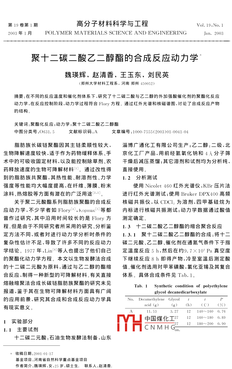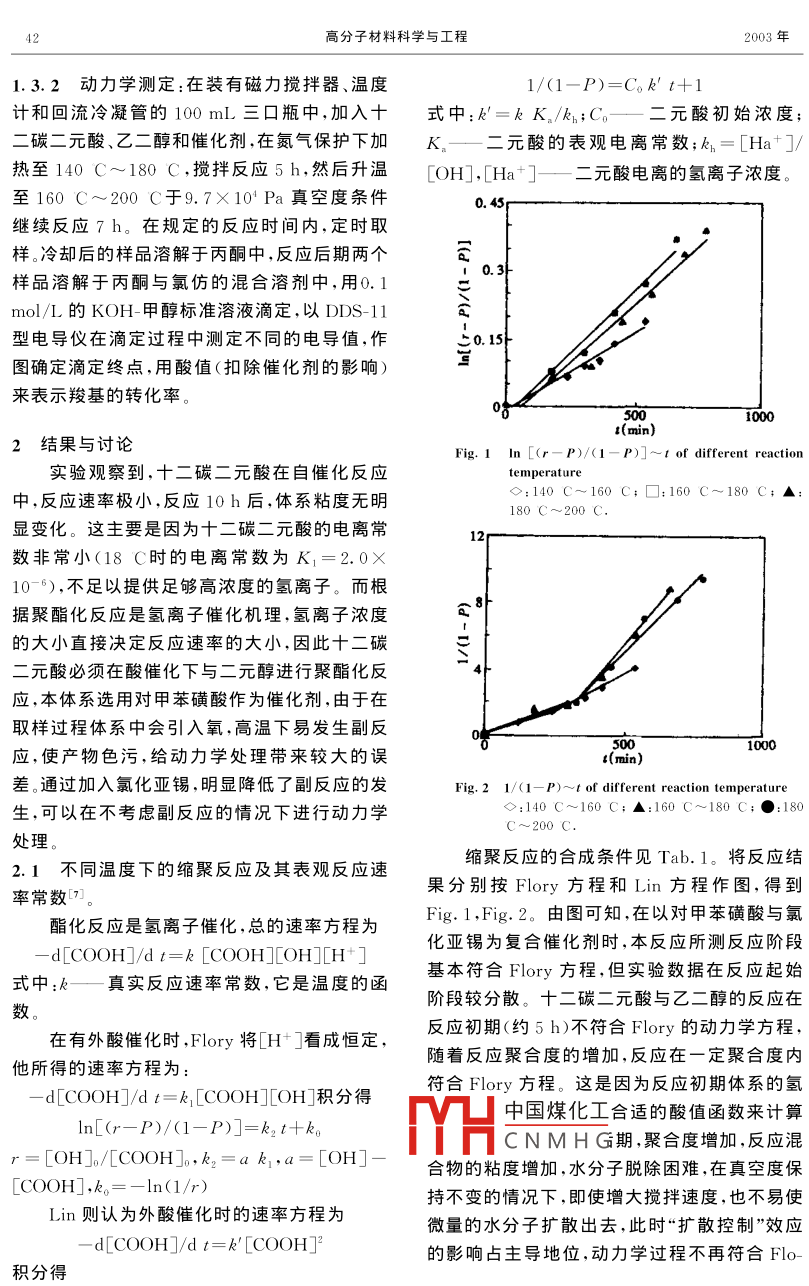 第19卷第1期高分子材料科學(xué)與工程Vol. 19. No. 12003 F1 POL YMER MATERIALS SCIENCE AND ENGINEERINGJan.2003聚十二碳二酸乙二醇酯的合成反應(yīng)動(dòng)力學(xué)魏瑛輝,趙清香,王玉東,劉民英(鄭州大學(xué)材料工程系,河南鄭州450052摘要:在不同的反應(yīng)溫度和催化劑體系下,研究了十二碳二酸與乙二醇的外加強(qiáng)酸催化劑的聚酯化反應(yīng)動(dòng)力學(xué),在反應(yīng)控制階段,動(dòng)力學(xué)過(guò)程符合 Flory方程。通過(guò)紅外光譜和核磁譜圖,討論了合成反應(yīng)產(chǎn)物的結(jié)構(gòu)關(guān)鍵詞:聚酯化反應(yīng);動(dòng)力學(xué);聚十二碳二酸乙二醇酯中圖分類號(hào):O631.5文獻(xiàn)標(biāo)識(shí)碼:A文章編號(hào):1000-7555(2003)01-0041-04脂肪族長(zhǎng)碳鏈聚酯因其主鏈柔順性較大,淄博廣通化工有限公司生產(chǎn);乙二醇:二級(jí),北生物降解速度較快,適于作為藥物緩釋體系、手京化工廠產(chǎn)品,用前經(jīng)氫氧化鈉和4A分子篩術(shù)中的可吸收固定材料,以及能控制除草劑、農(nóng)干燥后減壓蒸餾;其它溶劑和試劑均為分析純藥釋放速度的生物可降解材料。通過(guò)改性得直接使用。到的脂肪族共聚酯,其熱性能、耐溶劑性、力學(xué)1.2分析測(cè)試強(qiáng)度等性能均大幅度提高,在纖維、薄膜、粉末使用 Nicolet460紅外光譜儀,KBr壓片法凃料、熱熔膠等方面有潛在的廣泛用途進(jìn)行紅外光譜測(cè)試;使用 Bruker dpx400高頻關(guān)于聚二元酸酯系列脂肪族聚酯的合成反核磁共振儀,以CDCl3為溶劑,四甲基硅烷為應(yīng)動(dòng)力學(xué),不少學(xué)者如 Flory, Kopia③等都內(nèi)標(biāo)進(jìn)行核磁共振測(cè)試;動(dòng)力學(xué)數(shù)據(jù)通過(guò)酸值曾作過(guò)研究,其中沿用時(shí)間較長(zhǎng)的是 Flory方測(cè)定確定程。但是由于不同研究者所采用的研究、分析鑒1.3十二碳二酸乙二醇酯的縮合聚合反應(yīng)定方法不同,或者對(duì)進(jìn)行動(dòng)力學(xué)分析時(shí)條件的1.3.1聚十二碳二酸乙二醇酯的合成:將十二復(fù)雜性估計(jì)不足,導(dǎo)致了許多不同的反應(yīng)動(dòng)力碳二元酸、乙二醇、催化劑在通氮?dú)鈼l件下于指學(xué)結(jié)論。1977年,Lin6等人也提出了他們自己定溫度反應(yīng)5h,然后在約9.7×104Pa真空度的聚酯化動(dòng)力學(xué)方程。本文以生物發(fā)酵法合成下繼續(xù)反應(yīng)8h即得產(chǎn)物,冷至室溫后測(cè)定酸的十二碳二元酸為原料,通過(guò)與乙二醇的酯縮值。催化劑選用對(duì)甲苯磺酸,氯化亞錫及其復(fù)合合反應(yīng),制得一種新型的可降解材料。有關(guān)直接體系。具體合成條件見(jiàn)Tab.1熔融縮聚法合成長(zhǎng)碳鏈脂肪族聚酯的硏究未見(jiàn)Tab. 1 Synthetic condition of polyethylene報(bào)道,鑒于其在生物可降解材料方面具有廣闊glycol decanedicarboxylate的應(yīng)用前景,研究其合成和合成反應(yīng)動(dòng)力學(xué)具Glycol t有現(xiàn)實(shí)意義acid (g)(g)(h)(C)(%3.2712140~1600.761實(shí)驗(yàn)部分H中國(guó)煤化工212160-1800.8912180~2000.901.1主要試劑CNMHG十二碳二元酸:石油生物發(fā)酵法制備,山東收稿日期:2001-01-17基金項(xiàng)目:河南省自然科學(xué)重點(diǎn)基金項(xiàng)目作者簡(jiǎn)介:魏瑛輝,女,25歲,碩土生.聯(lián)系人:趙清香.高分子材料科學(xué)與工程2003年1.3.2動(dòng)力學(xué)測(cè)定:在裝有磁力攪拌器、溫度1/(1-P)=C。kt+1計(jì)和回流冷凝管的100mL三口瓶中,加入十式中:k′=kK。/k;C—二元酸初始濃度;二碳二元酸、乙二醇和催化劑,在氮?dú)獗Wo(hù)下加K。二元酸的表觀電離常數(shù);k1=[Ha+]/熱至140C~180C,攪拌反應(yīng)5h,然后升溫[OH],[Ha+]二元酸電離的氫離子濃度。至160C~200C于9.7×104Pa真空度條件繼續(xù)反應(yīng)7h。在規(guī)定的反應(yīng)時(shí)間內(nèi),定時(shí)取樣。冷卻后的樣品溶解于丙酮中,反應(yīng)后期兩個(gè)樣品溶解于丙酮與氯仿的混合溶劑中,用0.1mol/L的KOH-甲醇標(biāo)準(zhǔn)溶液滴定,以DDS-11型電導(dǎo)儀在滴定過(guò)程中測(cè)定不同的電導(dǎo)值,作圖確定滴定終點(diǎn),用酸值(扣除催化劑的影響)來(lái)表示羧基的轉(zhuǎn)化率。2結(jié)果與討論Fig. 1 In [(r-P)/(1-P)1-t of different reaction實(shí)驗(yàn)觀察到,十二碳二元酸在自催化反應(yīng)temperature中,反應(yīng)速率極小,反應(yīng)10h后,體系粘度無(wú)明◇:140C-160C;□:160C~180C;▲顯變化。這主要是因?yàn)槭级岬碾婋x常數(shù)非常小(18C時(shí)的電離常數(shù)為K1=2.0×0-6),不足以提供足夠高濃度的氫離子。而根據(jù)聚酯化反應(yīng)是氬離子催化機(jī)理,氬離子濃度的大小直接決定反應(yīng)速率的大小,因此十二碳元酸必須在酸催化下與二元醇進(jìn)行聚酯化反應(yīng),本體系選用對(duì)甲苯磺酸作為催化劑,由于在取樣過(guò)程體系中會(huì)引入氧,高溫下易發(fā)生副反應(yīng),使產(chǎn)物色污,給動(dòng)力學(xué)處理帶來(lái)較大的誤1000差。通過(guò)加入氯化亞錫,明顯降低了副反應(yīng)的發(fā)Fig. 2 1/(1-P)t of different reaction temperature生,可以在不考慮副反應(yīng)的情況下進(jìn)行動(dòng)力學(xué)◇:140C~160C;▲:1處理2.1不同溫度下的縮聚反應(yīng)及其表觀反應(yīng)速縮聚反應(yīng)的合成條件見(jiàn)Tab.1。將反應(yīng)結(jié)率常數(shù)果分別按 Flory方程和Lin方程作圖,得到酯化反應(yīng)是氫離子催化,總的速率