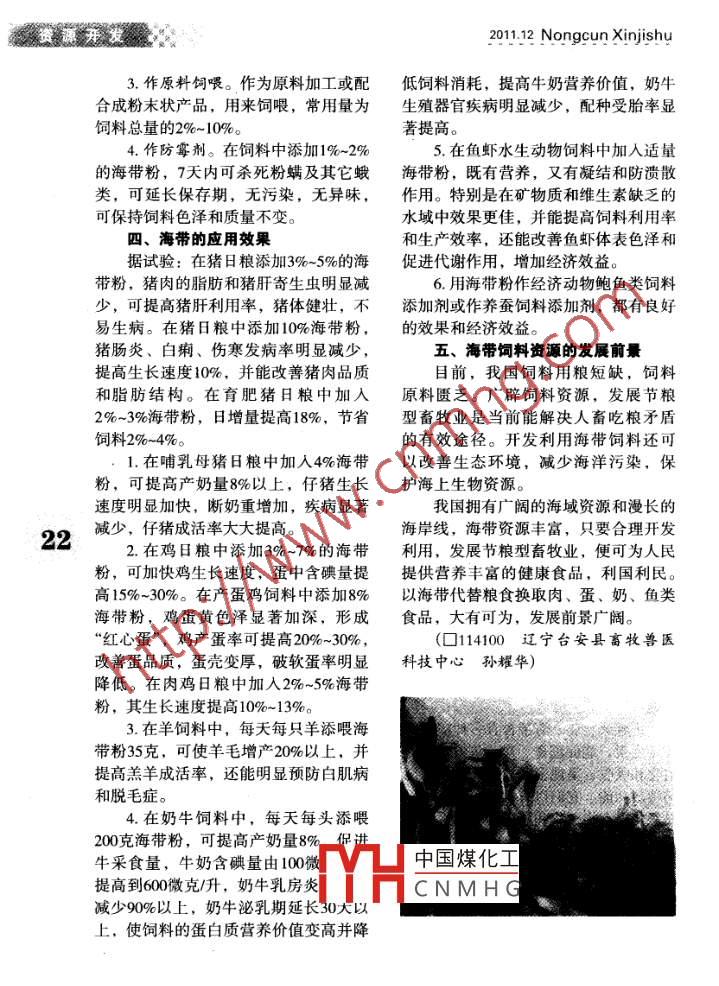Nongcun Xinjishu 2011.12資源開發(fā)大力開發(fā)海帶飼料添加劑海帶是海洋中的自繁植物,能進行3.促進生育功能。海帶含有多種微光合作用,把海洋中的無機質(zhì)轉(zhuǎn)化為有量元素和維生素,特別是碘和維生素E,機質(zhì)。海帶含有豐富的營養(yǎng)成分,是重能提高畜禽的受精率和準胎率。要的飼料資源,國外- -些發(fā)達國家普遍4.提高適應(yīng)能力。海帶含抗應(yīng)激因應(yīng)用海帶作為飼料添加劑。我國年產(chǎn)海子,能提高動物對環(huán)境的適應(yīng)能力。如帶干品30萬~-50萬噸,占有飼用潛力藻提高魚蝦的抗應(yīng)激能力和耐低氧能力。類的50%- -60%,大有開發(fā)利用價值。5.促進代謝作用。海帶含有生物活-、海帶的營養(yǎng)價值性物質(zhì)和促生長因子,有調(diào)節(jié)機體代謝海帶營養(yǎng)價值較高,含粗蛋白質(zhì)和消化吸收作用,促進飼料營養(yǎng)平衡,8%~12%,高的達17%;含無氮有機物提高動物生長和生產(chǎn)性能。30%~60%;多種礦物質(zhì)和微量元素占6.增進色素和改善畜產(chǎn)品品質(zhì)。海20%- -30%;還含有多種維生素及胡蘿卜帶含有較多的色素(如藻黃素、 胡蘿卜21'素等;含有許多能促進動物生長的活性素)、碘、氯、鈉等成分,可以改善肉、物質(zhì)。含鈣量比玉米和麩皮分別高數(shù)蛋、奶的品質(zhì),使畜禽皮膚、肌肉顏色倍,鈣磷比例為4.86 : 1;纖維素比玉鮮艷,營養(yǎng)豐富,味道鮮美,降低薄殼米和麩皮分別高8.8%和26.7%,是畜禽、,. 蛋和血凝蛋的比率,使蛋黃顏色變紅變魚類的優(yōu)質(zhì)飼料添加劑。深,種蛋孵化率提高,蛋黃含碘量提二、海帶飼料添加劑對畜禽魚的高,增加脂肪酸含量,降低蛋中膽固醇功能含量。1.特效功能。海帶含有多種礦物質(zhì)7.防霉作用。海帶含有苯酚類化合和維生素,能促進畜、禽、魚對營養(yǎng)的物和瓊膠褐膠酸物質(zhì),有抑菌和防霉防消化和吸收,呈現(xiàn)多種非營養(yǎng)性添加劑潮作用。的特效功能。它們以有機狀態(tài)存在,不三、海帶飼料添加劑的調(diào)制方法易氧化,動物吸收和利用遠優(yōu)于無機礦1.鮮喂法。即邊采邊喂的方法。將物質(zhì)。中國煤化工王飼料中添加2.防治疾病作用。海帶含有某些免MHCNMHG°這是沿海地疫和抗病物質(zhì),能提高機體免疫功能和抗病能力,并能分泌抗菌和抗病毒物2.干喂法。將鮮海帶曬干、粉碎、質(zhì),故有防治疾病的作用。裝袋,即為成品。.發(fā)發(fā)2011.12 Nongcun Xinjishu3.作原料飼喂。作為原料加工或配低飼料消耗,提高牛奶營養(yǎng)價值,奶牛合成粉末狀產(chǎn)品,用來飼喂,常用量為;生殖器官疾病明顯減少,配種受胎率顯飼料總量的2%~10%。著提高。4.作防霉劑。在飼料中添加1%~2%5.在魚蝦水生動物飼料中加入適量的海帶粉,7天內(nèi)可殺死粉螨及其它蛾海帶粉,既有營養(yǎng),又有凝結(jié)和防潰散類,可延長保存期,無污染,無異味,作用。 特別是在礦物質(zhì)和維生素缺乏的可保持飼料色澤和質(zhì)量不變。水域中效果更佳,并能提高飼料利用率四、海帶的應(yīng)用效果和生產(chǎn)效率,還能改善魚蝦體表色澤和據(jù)試驗:在豬日糧添加3%- -5%的海促進代謝作用,增加經(jīng)濟效益。帶粉,豬肉的脂肪和豬肝寄生蟲明顯減6.用海帶粉作經(jīng)濟動物鮑魚類飼料少,可提高豬肝利用率,豬體健壯,不添加劑或作養(yǎng)蠶飼料添加劑,都有良好易生病。在豬日糧中添加10%海帶粉,的效果和經(jīng)濟效益。豬腸炎、白痢、傷寒發(fā)病率明顯減少,五、海帶飼料資源的發(fā)展前景提高生長速度10%,并能改善豬肉品質(zhì)目前,我國飼料用糧短缺,飼料和脂肪結(jié)構(gòu)。在育肥豬日糧中加入原料匱乏。 廣辟飼料資源,發(fā)展節(jié)糧2% ~3%海帶粉,日增量提高18%,節(jié)省型畜牧業(yè)是當前能解決人畜吃糧矛盾飼料2%~4%。的有效途徑。開發(fā)利用海帶飼料還可1.在哺乳母豬日糧中加人4%海帶以改善生態(tài)環(huán)境,減少海洋污染,保粉,可提高產(chǎn)奶量8%以上,仔豬生長護海上生物資源。速度明顯加快,斷奶重增加,疾病顯著我國擁有廣闊的海域資源和漫長的減少,仔豬成活率大大提高。海岸線,海帶資源豐富,只要合理開發(fā)222.在雞日糧中添加3%~7%的海帶利用,發(fā)展節(jié)糧型畜牧業(yè),便可為人民粉,可加快雞生長速度,蛋中含碘量提提供營養(yǎng)豐富的健康食品,利國利民。高15%~30%。在產(chǎn)蛋雞飼料中添加8%以海帶代替糧食換取肉、蛋.奶、魚類海帶粉,雞蛋黃色澤顯著加深,形成食品,大有可為,發(fā)展前景廣闊?!凹t心蛋”,雞產(chǎn)蛋率可提高20%~30%,(O114100遼寧臺安縣畜牧獸醫(yī)改善蛋品質(zhì),蛋殼變厚,破軟蛋率明顯科技中心孫耀華)降低。在肉雞日糧中加入2%~5%海帶粉,其生長速度提高10%~13%。3.在羊飼料中,每天每只羊添喂海帶粉35克,可使羊毛增產(chǎn)20%以上,并提高羔羊成活率,還能明顯預(yù)防白肌病和脫毛癥。4.在奶牛飼料中,每天每頭添喂.200克海帶粉,可提高產(chǎn)奶量8%侃進牛采食量,牛奶含碘量由100微中國煤化工提高到600微克/升,奶牛乳房炎YHCNMHG減少90%以上,奶牛泌乳期延長30大以上,使飼料的蛋白質(zhì)營養(yǎng)價值變高并降