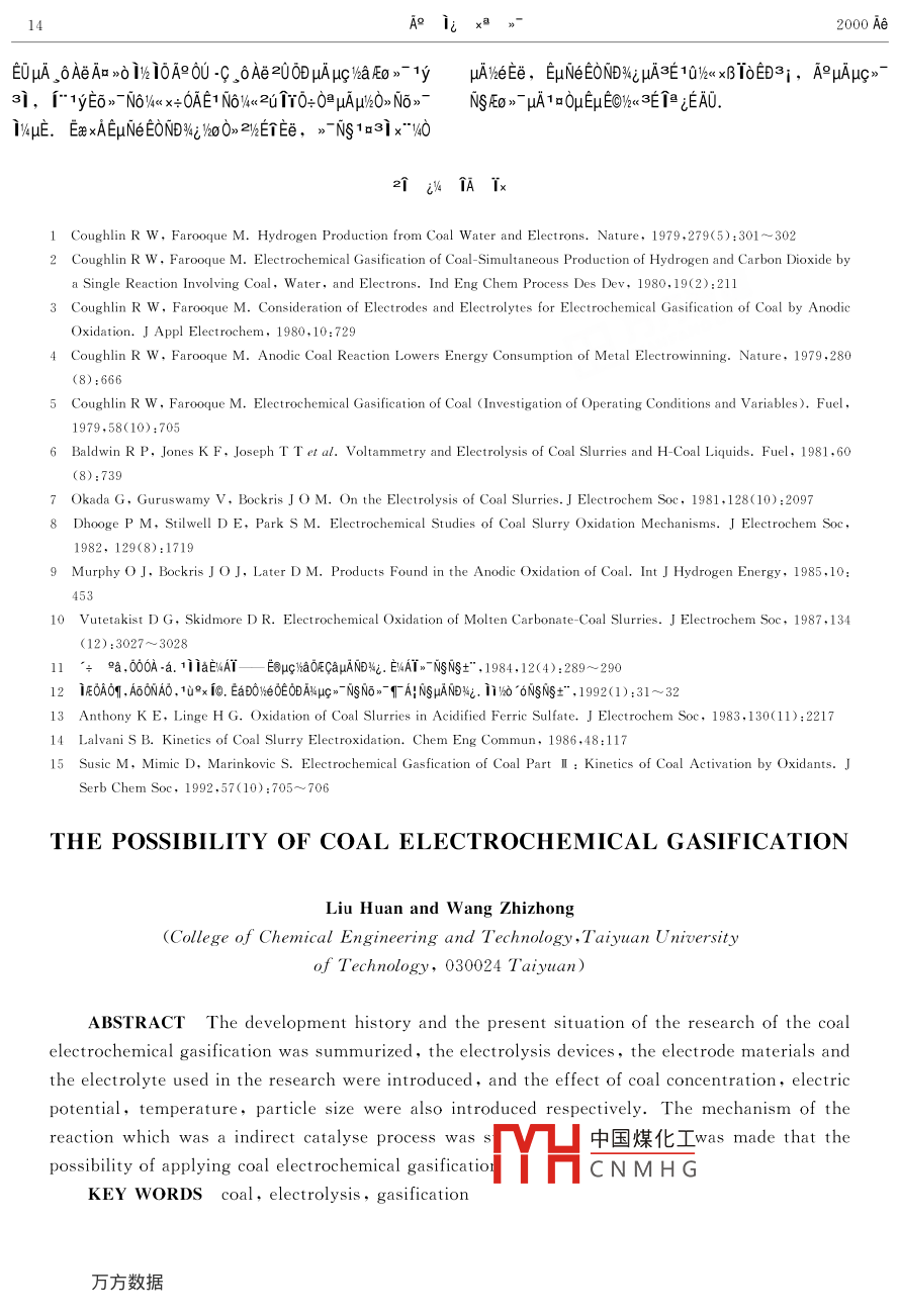 uU23%p4陽(yáng)U2000Ae100ACOAL CONVERSIONOct.2000Apc》NsE0” JA LEAUDO0%400090x0E6 AEA uC”-NsEA-c01AE.w°N%10x,始eE0AE№D%0D2E0AμAμax°0A、uc2AI、μca0E印U09004°A°A、A°dAA£^0B、apcl、IA正,÷1a000E0oAμ》NsE0A0°Ti,2cii0AEAμcNs》μA·0}A,EAE6AE1 a OHEI EHECAoμc-NSE-1a00uAEA0D010‰‘E1a. Eo0Bi4.0Aa°ATQ546Collett e1OACu,Ni, Pb 9I Pt hc4a啊0A9‰ 20 DD14DONC0μA03EalO2° EUAi IpuAFEo la.000A°0U: OE00A10-A0,Qa09lON0pEla2u.3EOμgaNo。μAN4 LA oau0xO±ECx÷l0÷082umμATa A HAEos-, ECA%%a AGOAuA000 134-941080, Eupa -03EaHAEOAE i AU1 ia, 3. -03EaEOAEHA'B2-vA00Aa2·正x÷EA91a0-AT.“AQE0》-·“EA土.1985 Ae lavani比正0NAA1土"E0900eE6060(oUN0x0600A^aeOU|A)·“OEU3E° I AOU NaOH EUO%ODHC7aNaEE,A1y31Ec0。,60EEy31,Be0U,BTA,B0E0c。03Ea、CO29 IEUAi O2,μc00kIH2NTA10D,和0Ee土2AT0DTAA0c,陽(yáng)》022Eu.0a0y° NHc" NSN,x÷1A配》-1y31DDN%D3EIN00μATUE%,2uE·3E±%021a啊0T.N00山 AEC Couglin,01979AeEx"Ta360UEaD0e00oU2l Hl lA E lA 0A]OFEi o la2uFE-HA-12-,%1iE00 OE OD HChaa912-0%0FE Ei FEo la2uFE-, OUNOVA 1aAIOOHA%4 OUAHci066 la, Baec-N×0‰A0 LEaDore0E0ca"yA9≠Aμ NS E0 ECOUHC 1a200啊0 A9 120 DD Hc%a,310D0μAND%Dp.1981 Ae baldwin正ND%AEA0UN6 YElE0N6。-I49IbN6。1%、00 I EU3E QUEadoeu090BDuc”-NsN6。A-0°210D0,la6A9kca/μA°0-y3|,EuμAI0aE2ux÷lb1A°,Eua0BN64x:"0H0÷0 ECA%2a0 Ee EUO。μAFe+NA0·B、μ,±101aA·c019°》FeμA1y31.「-A, Okada020ND%00aDAON UA°[0-EHAEETEo 1Uua. 1982 Ae Dhoohe HE[8301 0A, ="EOT1T0A 12-0 Hc"NS No"muAi%o DD%i, ay1110 AU laA°cNsA0》-N%A6020aETE10μaa,1a°6A-N6E±0 UA9 AEx0中國(guó)煤化工EaμuATE),EA° PHAuc NS FE0 ECO,6 AuchaN6。uAy=1.A°×AD10x0μA±%6EEa°COCNMHG:0 H.SO, VeOEODA°HauChaNo "NDi XIOcECOUVn DO1e0EOD%20 DDHA, 1923 HA CHd. IoJ nU lyly ueAe Sohne ex"TkA91ocaN”A000E00=09%-ycaA0a自們00 aec c8--c1AibpB ph OH uA Aa EE%2 ia uA 2u Ii: 1932 Ae Lunch i 0n D0"4, EIT EaboA12-0HAuc "NS No -ECEUO% ODHAFe+Nox Ae uAA3 DC 1DO u iA, EuaEHA Fe2+OUouN64aET0CAN6》.1987 Ae Vutetakist證N%AEBIA(500 C)IAAHC> NS NO> HA%a'u,CI0AODμ HAOD>u IaU1eEN6》-CO2.BND%0D,1啊0A92-0uc‰a04kcaEμ Caohe caua ly3]0土T,IT“AAPμcaN6-014k0Ga00-AETA49uA101u0D10A ucha 2- HAND4iE021212111, 1982 Ae○9○1[0E0Ns‘÷9aμE0A40EaE0091ae0E,002-locApc‰aOGaμANE4,aOB2 EOAAE IO1UuA0OONA9142A。ckaE》-EμN(yùn)eA≠3iTa0090A,1yaloDooa Eo ia lacaE0, 2ucausA-DS AE Fig 2 The flow diagram of coal electrochemicalTa 100%, Nova FEo iaia co, iEUAi co. 1990 Ae1992 Ae u%x icHE 12 10A OUT DOVe 0E iEaDO%e OEODMagnetic stirring 3HAucaDD 1=4x÷AEND%,i10AEa,8·0{TA爬、0de electrode; 4- Anode eletrode: 5-- Fritted glassG·oH框μA-·¨,Ni0nd2iAE÷00N》10-和0eparator; 6- Thermometer: 7- Thermocouple;8-uAc°1a01,Aμc”N0”AND%E010UENThermostated container: 9- Magnetic stirring heater10- Temperature controlling apparatus: 11- CathodeE01A,AA‘Ec0=090061幣ACa0,「E土 compartment gas outlet;OUNO 4 El HAuv2 CO 2 1 EUAL HA CO. ND%4i lnx+HAOO Haoutlet: 13--Gas detecter: 14- Saturated NaCl water cellOU ucha lu3μANi0n、1a00l≠Ax0A-、caNAuAf°AHNS正E20A0UAμcao。 HAuchaμA°uAμ Cm NS AEO。Ecou±31μca2UuAx° OAOD Ie20、0S30a始eCE正.0Ay、A,ayug‰aUia,xeaEμcaμaμA10uccau041~3,6「Ec,6A6E"Eyμ Cv4 EhAa硎UEe±№°A÷3lFig 3 Cell device and the flow diagramcathode compartment gas outlet; 7Thermostatedcontainer:8 Ions exchange membrane: 9- Temperaturedifference recorderGalvanometer: 13- Voltmeter14-Direct current regulated power suppl0EaD‰eCE0‰oB,20AμAeE°AHSH PO, I CF3SO3 H. H, O, 02 OD OA HCI, Na2:141A°E0xpca2CH COOH,HCOA.1a0AμAμca, De 0a 140E自Fig 1 Coal gasification cellFeSO, mo Fe, (SO,)3 x=IaBm v4A, 02 0D 0 Ee Ce++Working electrode中國(guó)煤化工tlet: 5CNMHGUACHa B OHETuAO1OALETheter: 6- Cathode compartmoA0,土0BEE0AHsO4×6e0、FeSO4oFe27--Cathode: 8-Cathode compartment: 9- Fritted10— Magnetic stirring(SO)3xB》-A土ETE0A.06142E0OAc1、N4k2EoAEN‰02E0AA06‘6q4122AAT(2-lo0Au HADS%A, 00 l OUAoEaODIEf30IE,E°a),N6kO據(jù)2ATA,0202E0 AE HA.ugaA∞x6N6c0D00UCO9CO2AEE,μca20000AA0μA°uc- NS EO> HALEAUD03,:0010000° PHc NS E0s HA0°680800,0e14Fe3++2H, O+CCO,+4H*+AEaEu2uREA9 HAHc> NSA0-y3lEU0個(gè)a1a000E0AO°I,OaAT Fe+2 A No -3EEaEu2uFE ECOi 3EucvaNO°A“AμAA、AAA£"B、μauc、A正.kwμcA1隨μA0-00. AUchaN6yE,6(1)AAEA0°T.O4IBAA∈ESAU,AAB-N6-1y31.00u09010,9A函B”AEcA框00aa. BA9Hc> EL.以AACe4+9V+噸aA10ia.B1BE哐,00N6cA060μ0319,啊N6。印μA0°±a2,lkA10Anthony HE3Ema,AμAμc-NsE0》- EHVAEECOAA"y,·陽(yáng)知APc始N6。E框.4a、6aμcay31.E框6臂“20eEcA°AE土0-0 ECOEOU. BHAA v-A∈ EIPOEAEMAoe lui3uAvA°eAEμFe+0auA-0},uc始a09uAN6ucEDS AE, OFEOV4AEHCNS-0ilyIODHAEU90DEU‰aμAFe3Fe2+uA£EAyA‰6TpA,TANsA9 PiAAE ODiHAOoI1.AaAE6B1‰6×AE百A÷·0;Ec0·0El l=. QUA90ea0四cAuA0Ae,0°xA·0印框.caAN61y310B,AEc001a,A00pc16 DiaqiAAE E E06×0·0印UA,Aμ10A3y090BA, oMoNia lHOD0109A1a,A9N》E框090TpE啊 AHc" NS·020U00a0°A÷10μ0E0u2 OEAL hYμApOE,1 aEi-CAE0,6AeE6(3) Hchauc I>HA0°Ti.wcBμo。NsN,-109aC0,6AucN6-;AOH EUAEOA0000, la, BuchaEtEuOAuc Im iE0i iSusic He100AaoDμc-NsN6。-0。μANDO! EUAE, H uc I 1y, 800ma 0A ODOD u la2a110eD00E E, %oEe Fe2+/Fe+, Ce3+/Ce+Qi V+VS+HEB-u死xB0°m1,2.0 ANDI aNd6Ee-opcN6-10-,10士A÷,A?c”N-y101甲Ey0o° Ii AUALE0AE.AC,2E0AμAμ C>NSNO> Hcl>6%x:(1)A9eN6》-A0‰aA·0},E哐sEya0s°a40U3 V OO IA.0.492s-1(358K).(2)0±E|.A=6N6。0°pAc(4)TA框EA0°T.E.BTAE00。NsN6。A,A‰Bpc。NS·0},·0E哐‰町0±》10-900 )HEUAE,uOE0UE10AAca0 DAhAL0E,pc0±:16。AN6。AAN6。E,印Ey0k7.52EOAμ IA IAEI40U100C×10-s-1.(3)A0eN6k80¥E土uA0±N6》-.0,6"Ea,N0AAA0020610u.N%A÷,B09A9A‘EEc0×·AA。,80·c-0A90DTBμAuc。NsD0. %l BHAvAE印 UAE &E"UVo Hc -NSN6y30 DAte ucy90¥5Ac”-N-1 aOHEuE@ HAiEAUD0v4, AEiA oeuc'ao%%c Ae uAAcEcOE1y31,'0n0 0i iO4 UAE.AμAμc-NS0》-pAx‘iOND%1ax÷0N-EcUE了EeAE,010μA1y31±0E06uAf02±EIGa,0B101a4Apc-NsE0xA·}>uA00y1°Ee±,2AT°ka110200AE62aAU,ON%-33±,AE201a0u·A6eE9A6E0NeμA1.ApAc00 Coughlin i Farooque xi TEia30A@usm NS >"NS E0 D"aiEcOUHcHAx-OATA, A%o DDayouAB0-